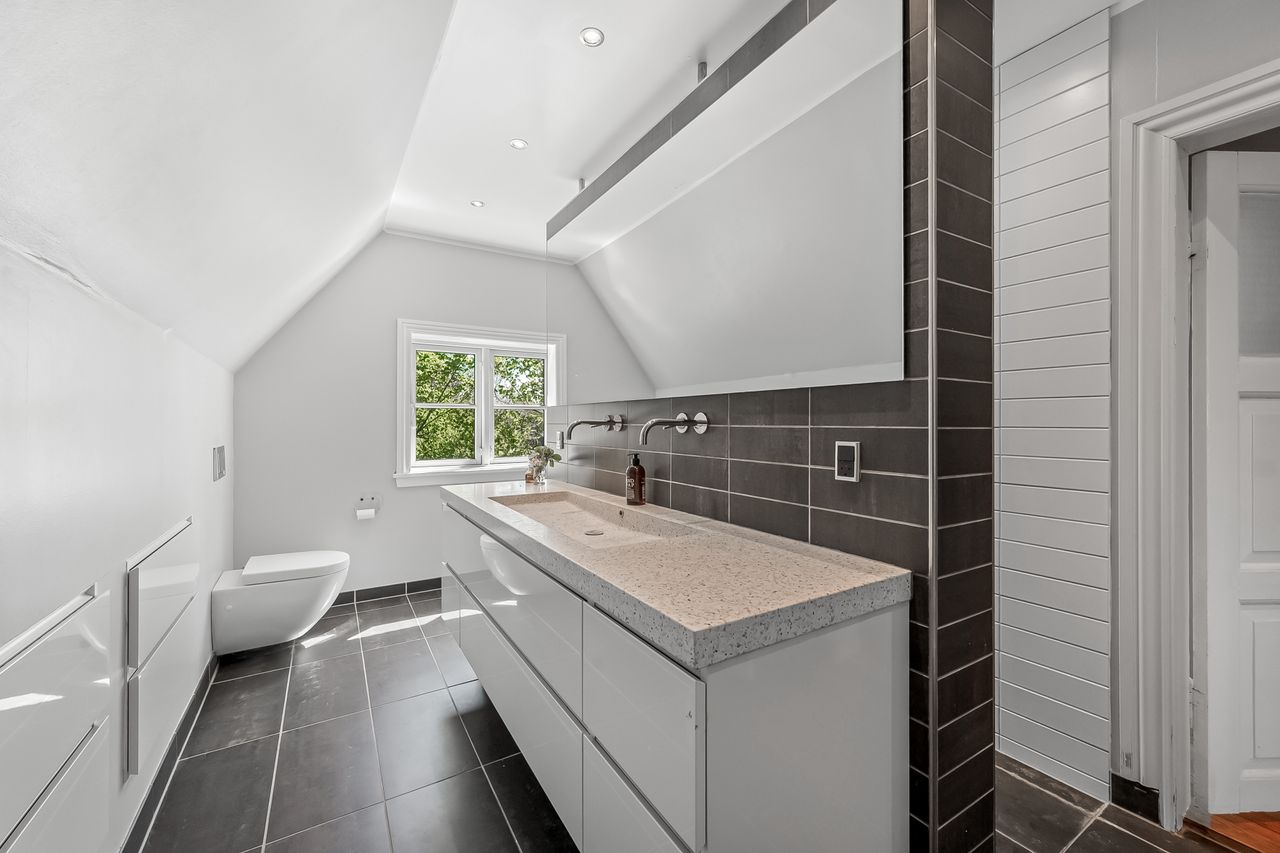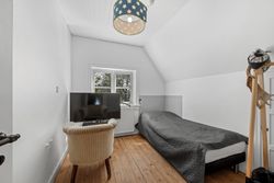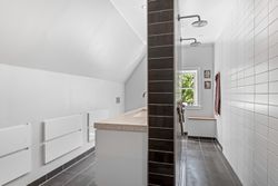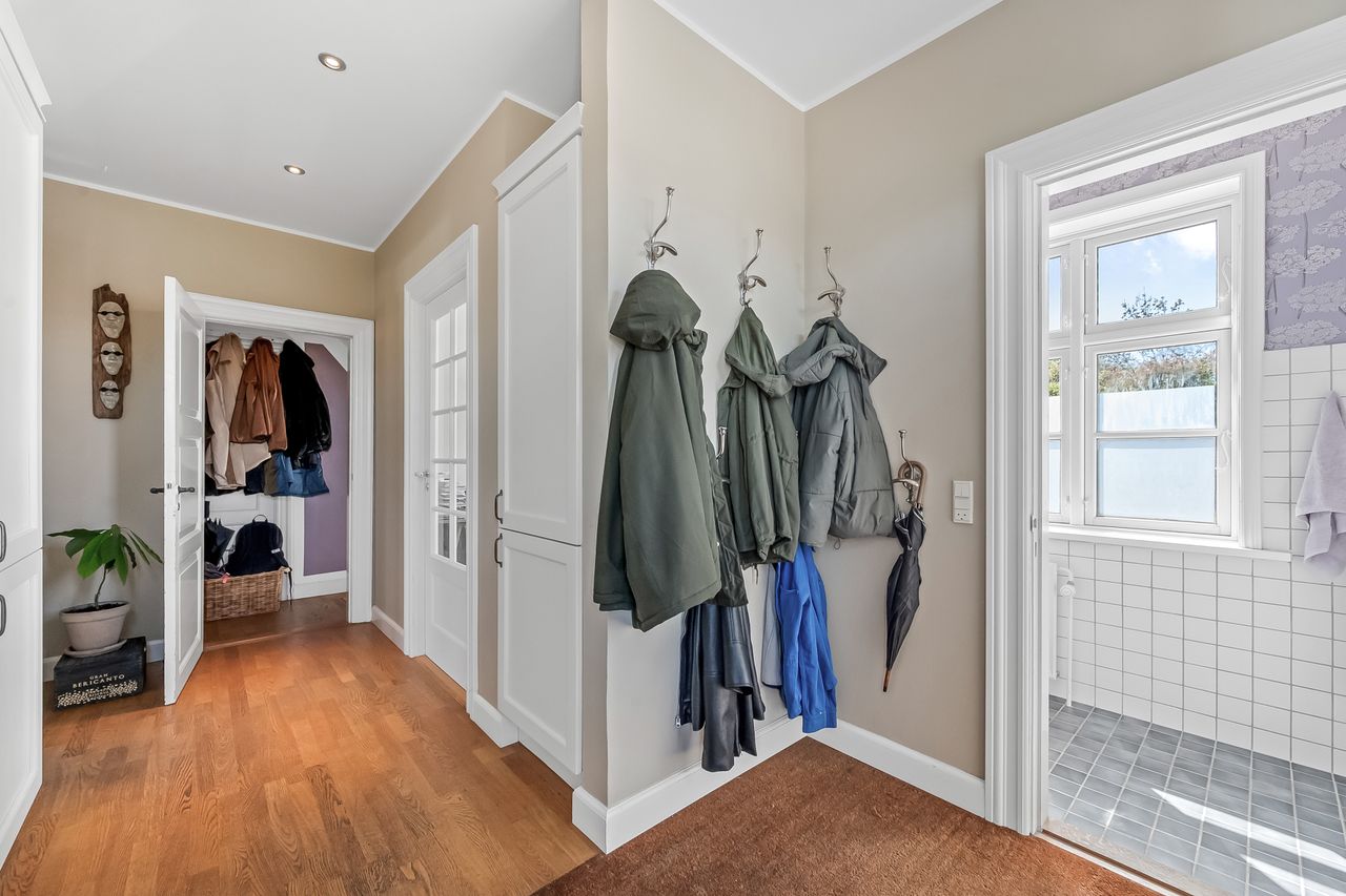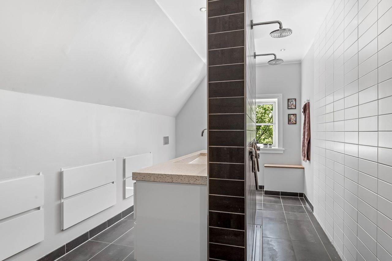 En smuk trappe fører til husets tagetage, der byder på en repos, der giver adgang til husets tre børneværelse samt det store og meget smukke soveværelse med walk-in closet samt adgang til et skønt badeværelse med sindrigt konstrueret bruseniche med hele to brusere.