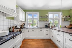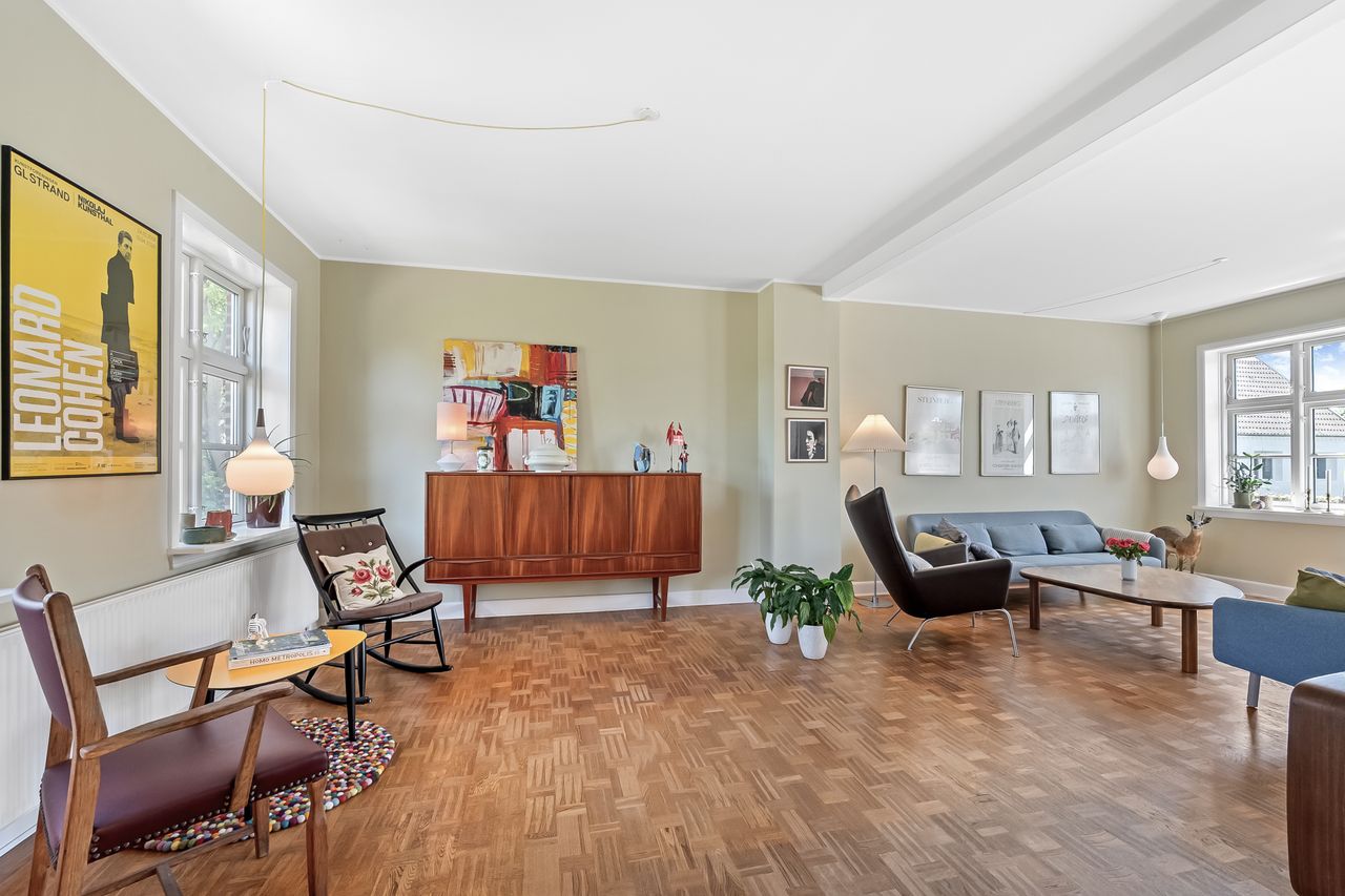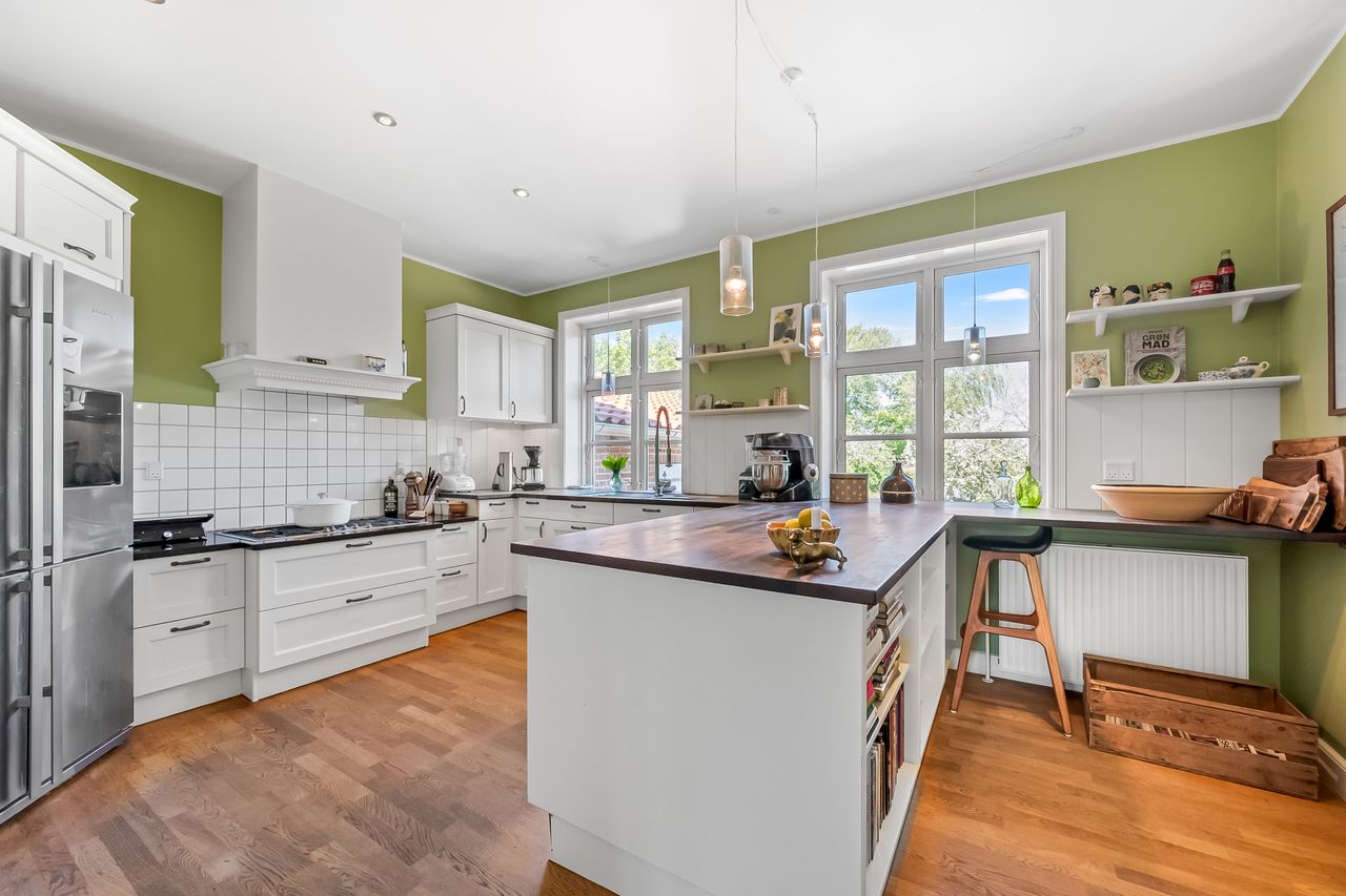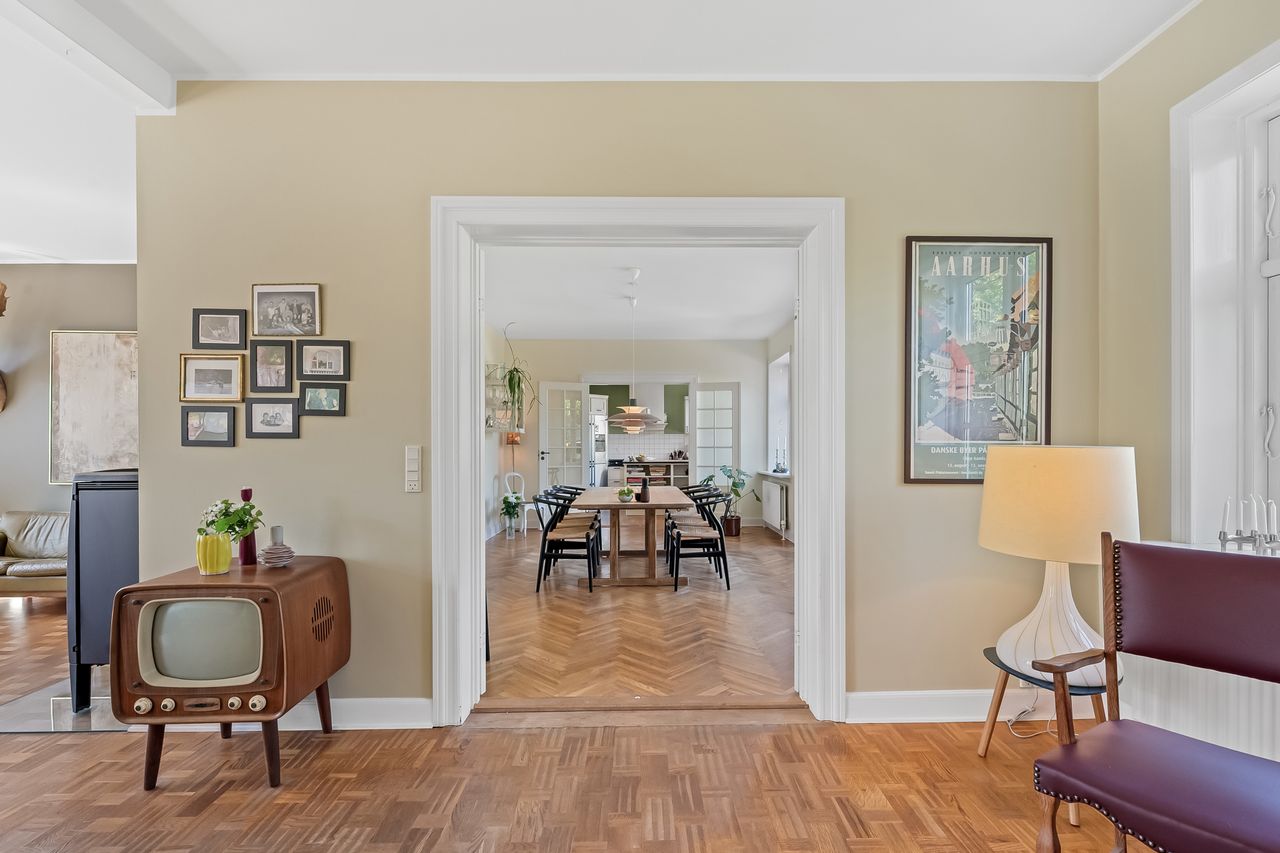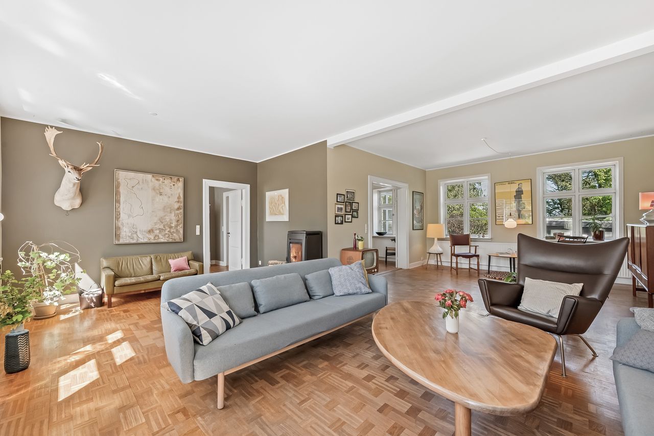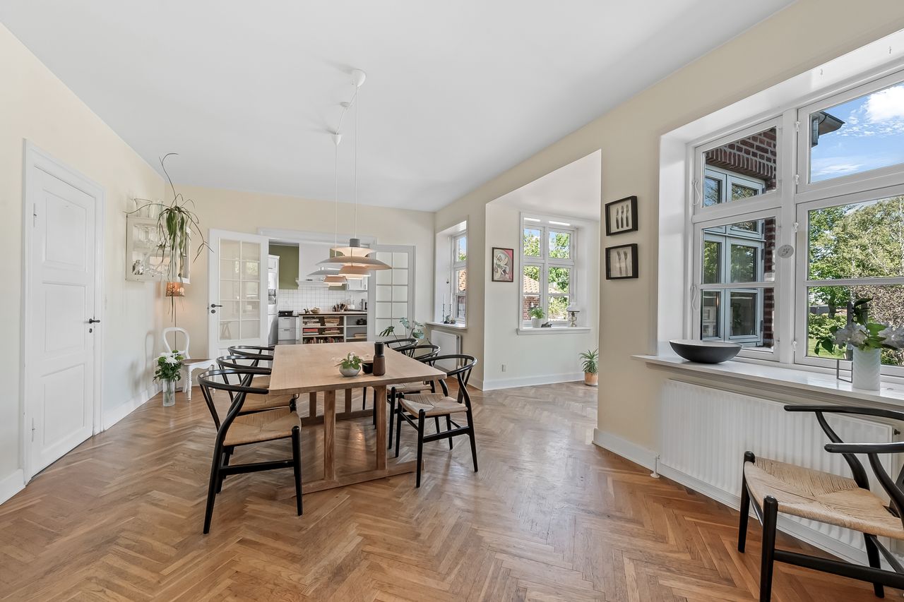 Ejendommen har tidligere tjent som lægebolig, men anvendes i dag udelukkende som privat bolig. I ejendommens stueplan er der entré, gæstetoilet samt kontor. Stort og dejligt køkken. Skønt alrum med smuk glaskarnap mod haven. Dejlig opholdsstue med brændeovn.
