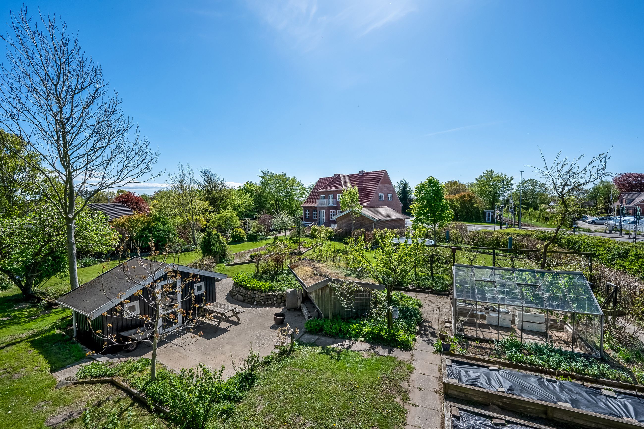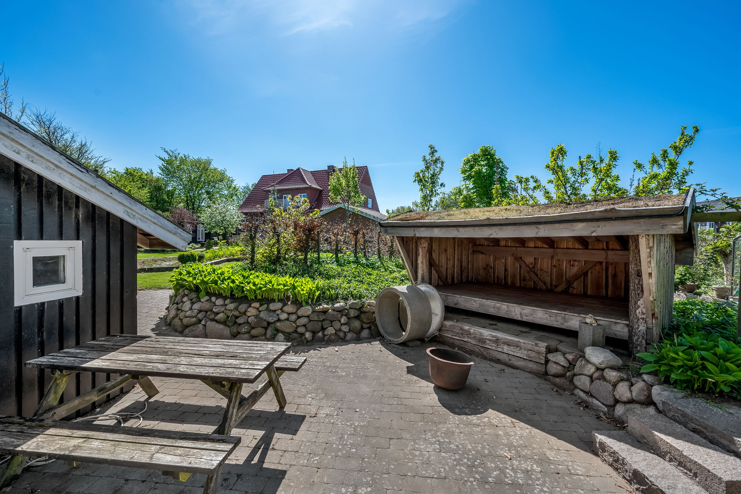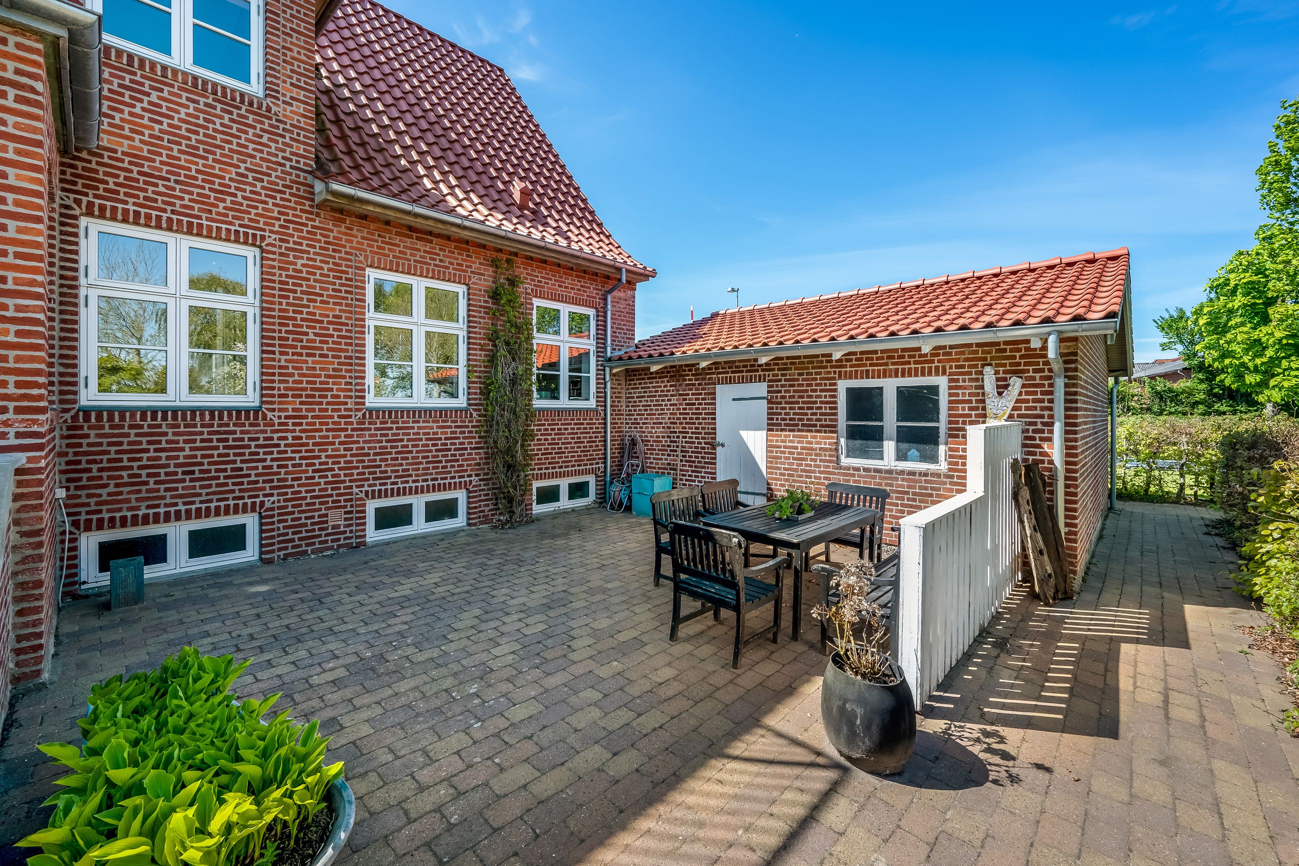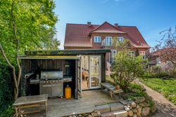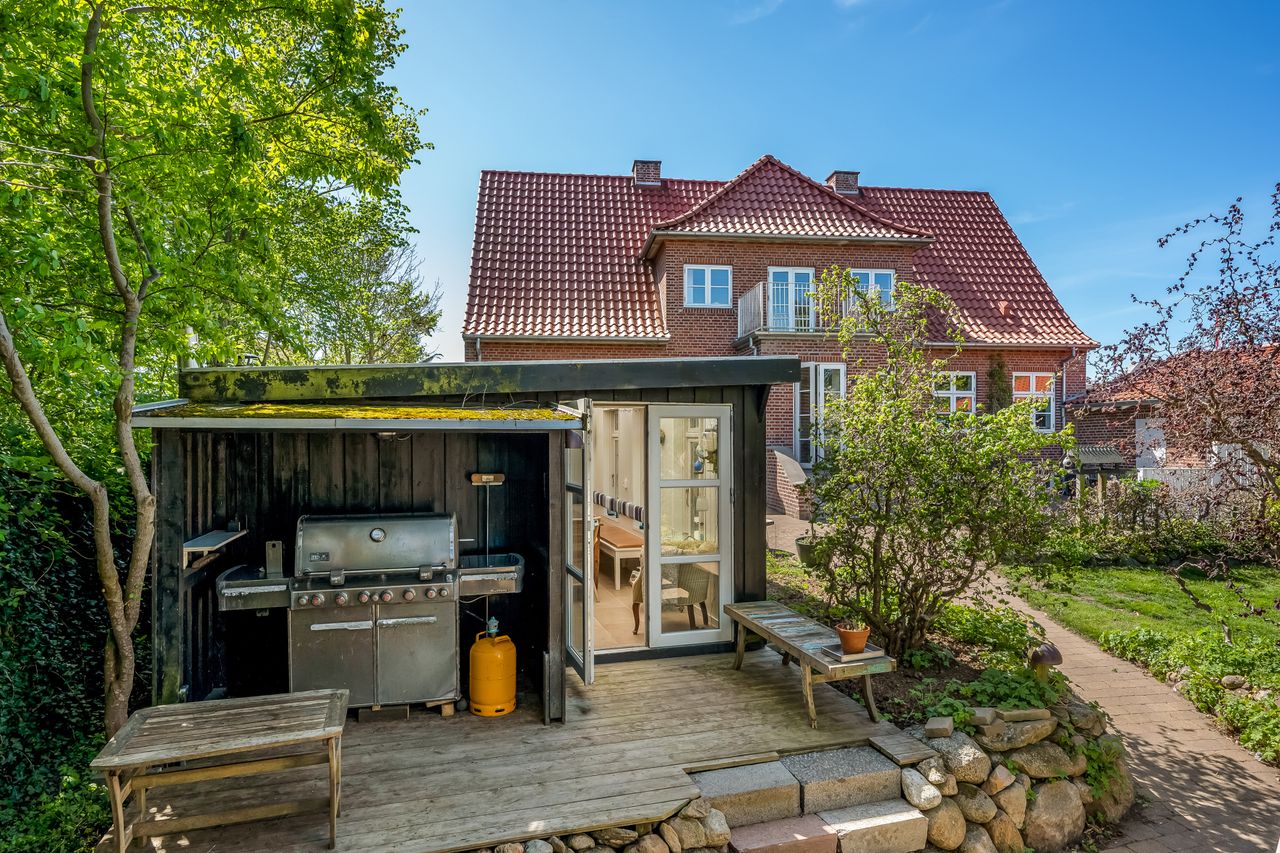Stor lukket garage, som er opført i samme stil som huset. Bag de to bygninger er der en stor, dejlig baghave med et flot og meget anvendeligt gæstehus med udekøkken med videre.