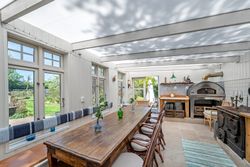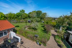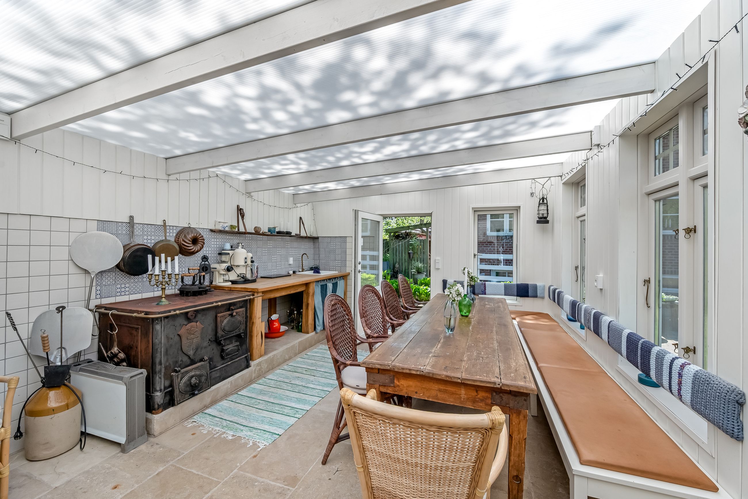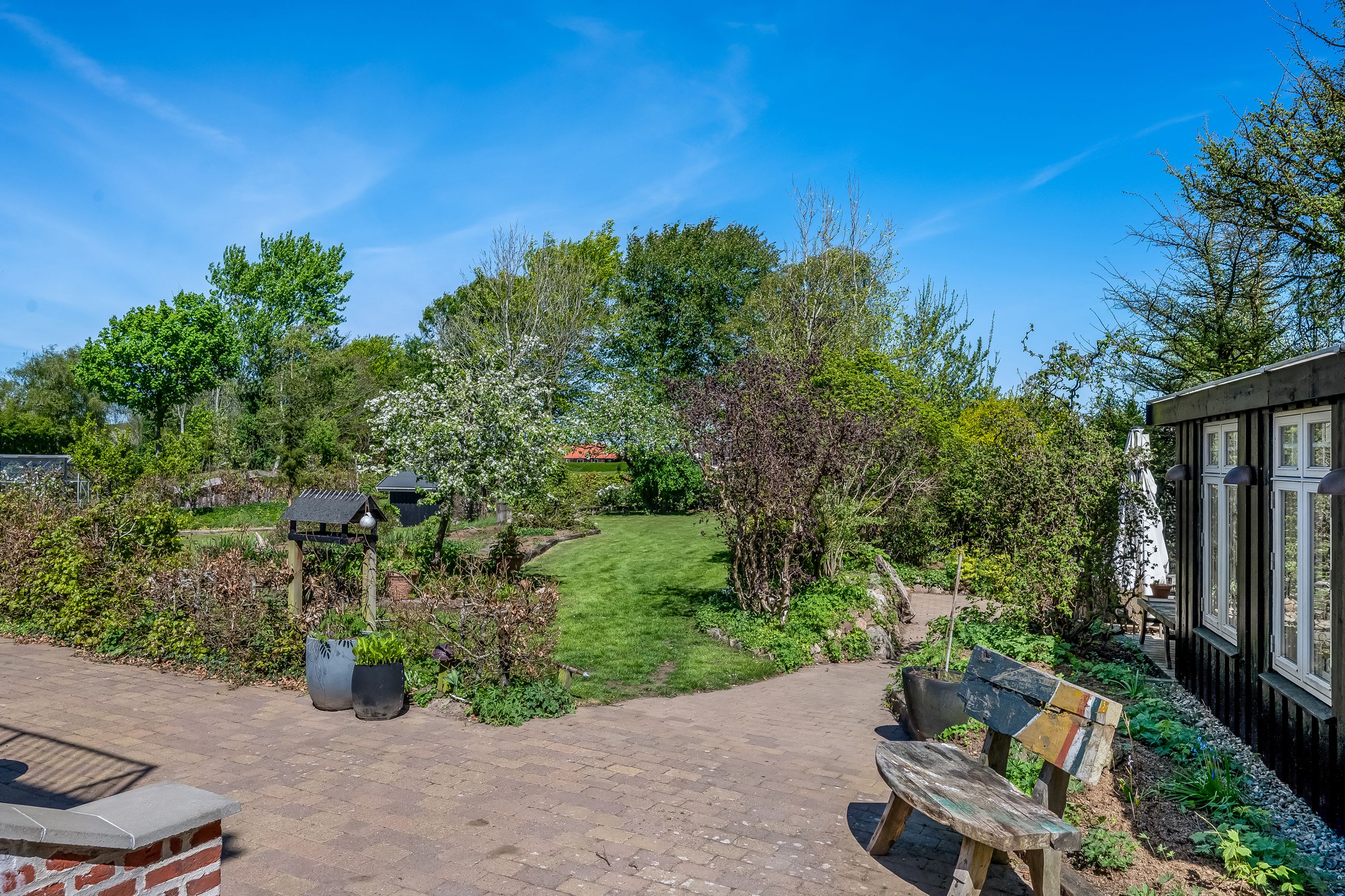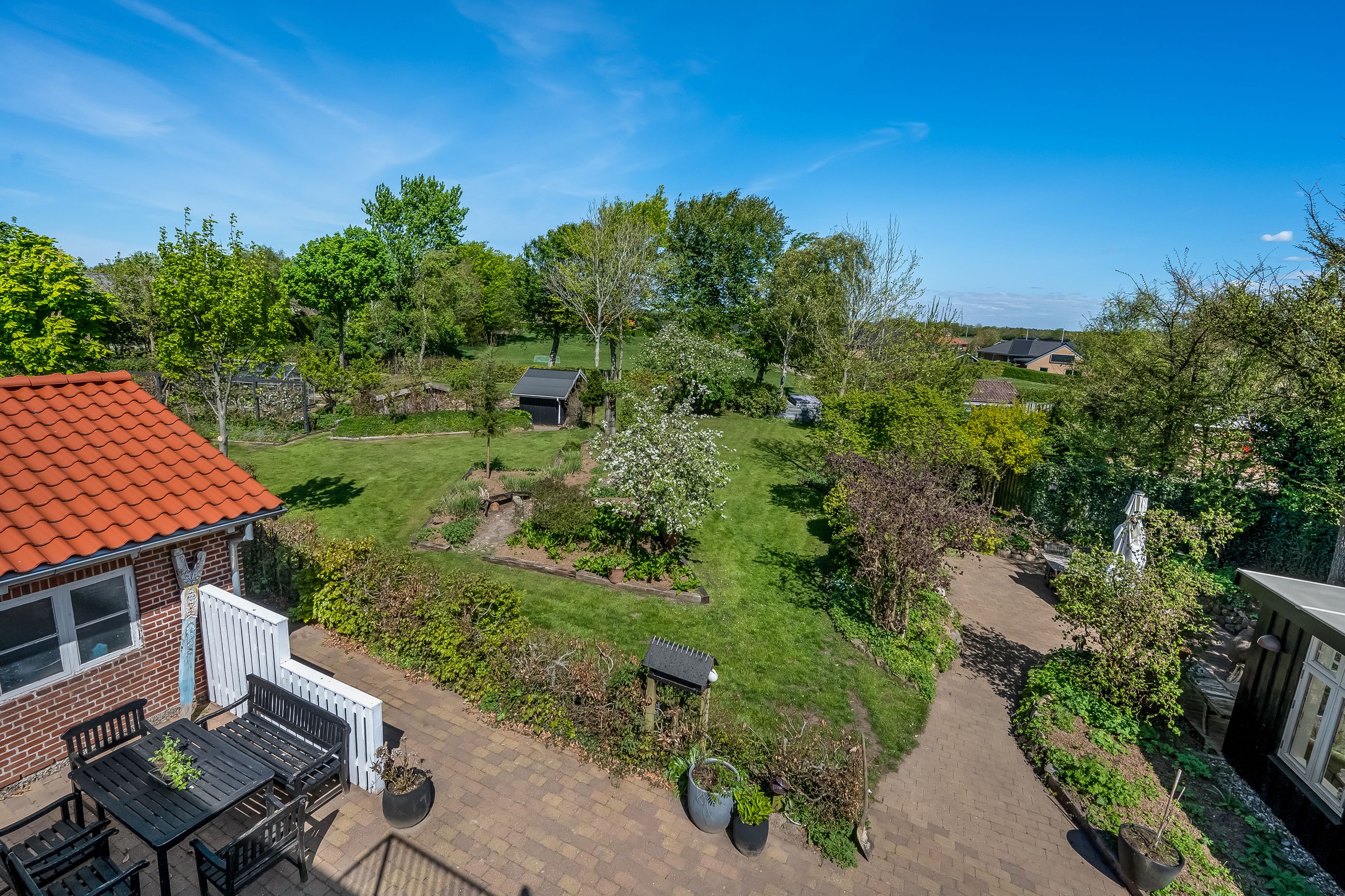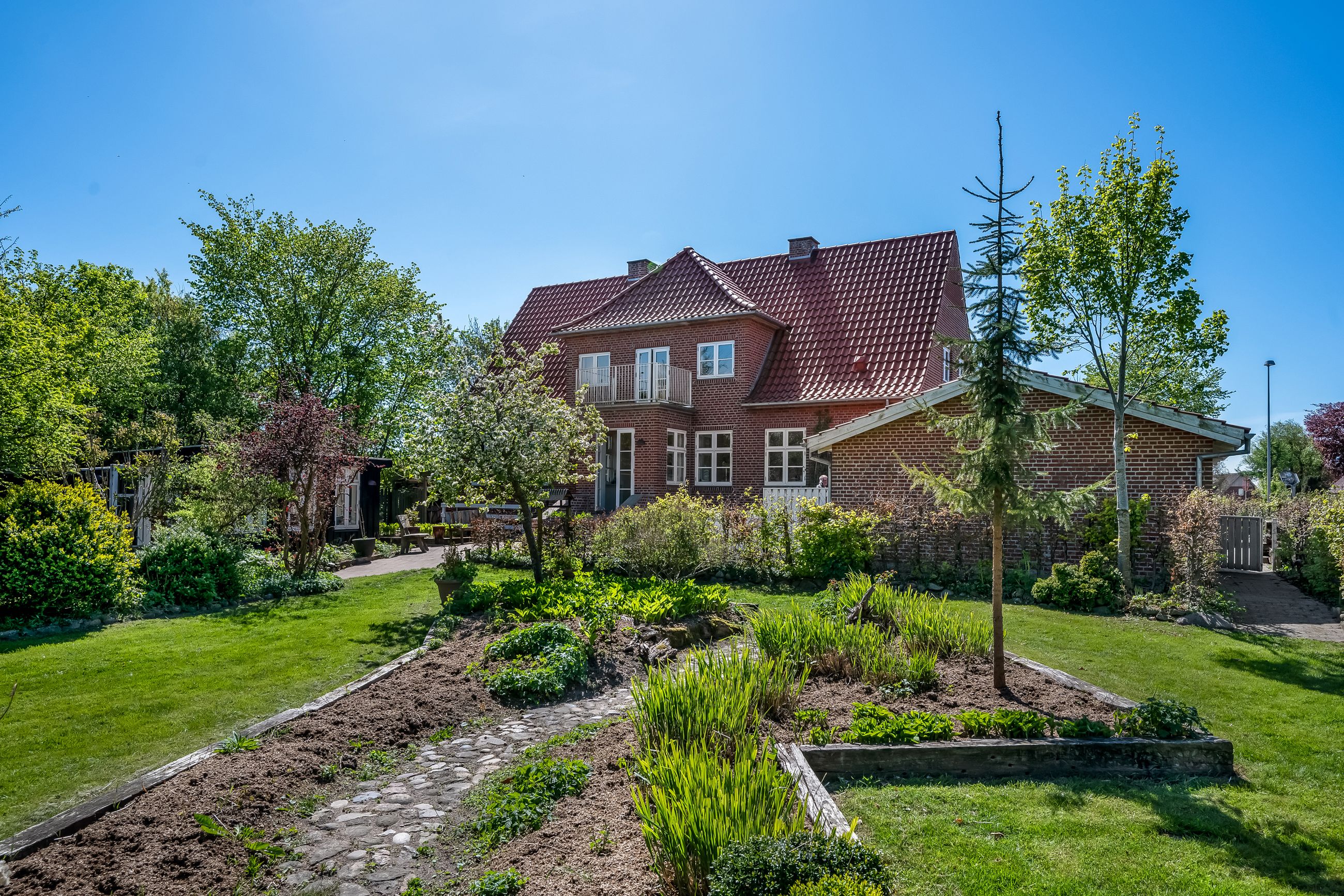 Stor lukket garage, som er opført i samme stil som huset. Bag de to bygninger er der en stor, dejlig baghave med et flot og meget anvendeligt gæstehus med udekøkken med videre.