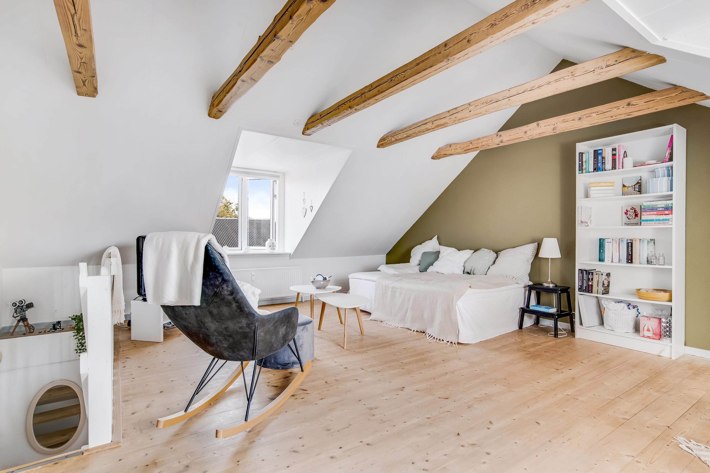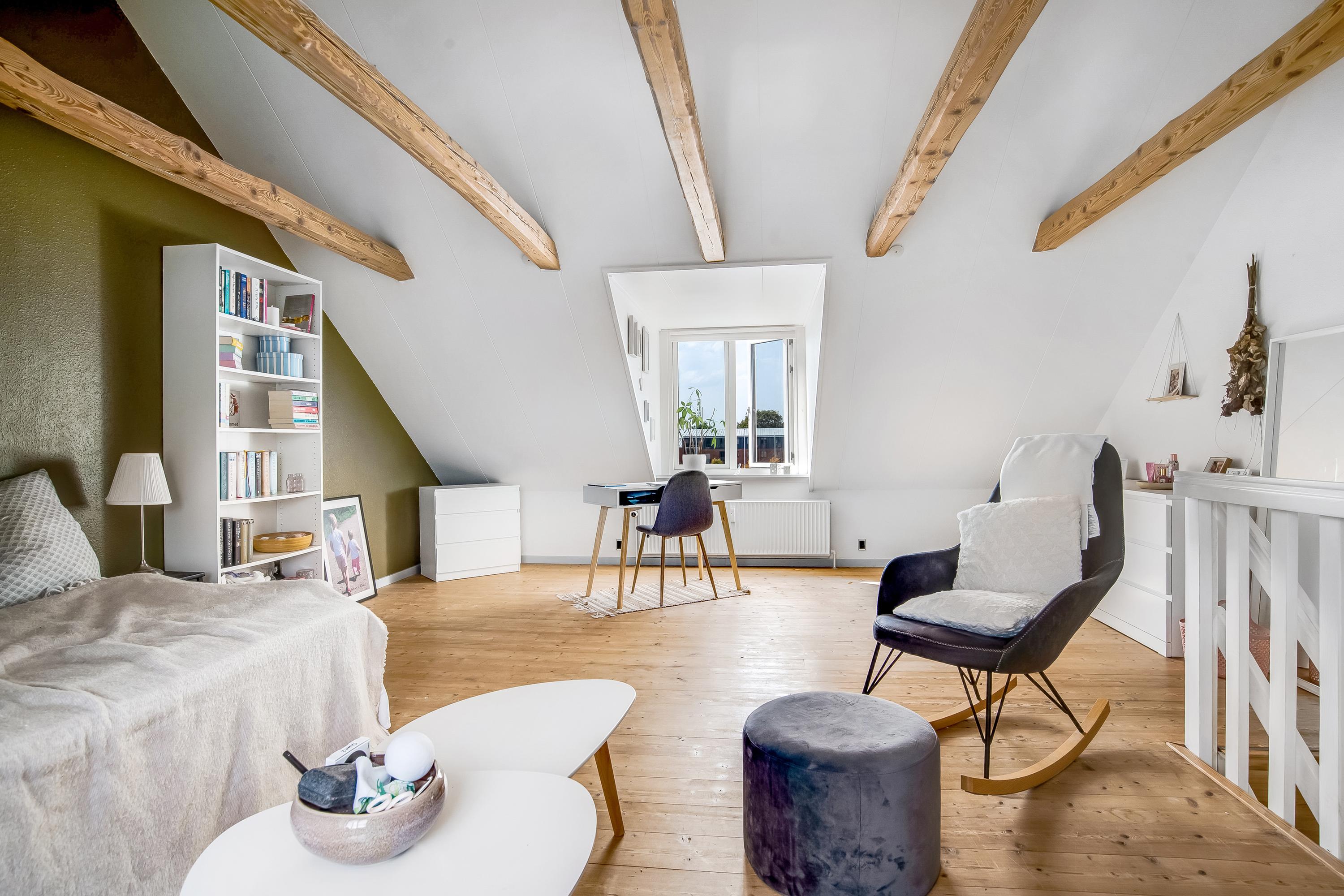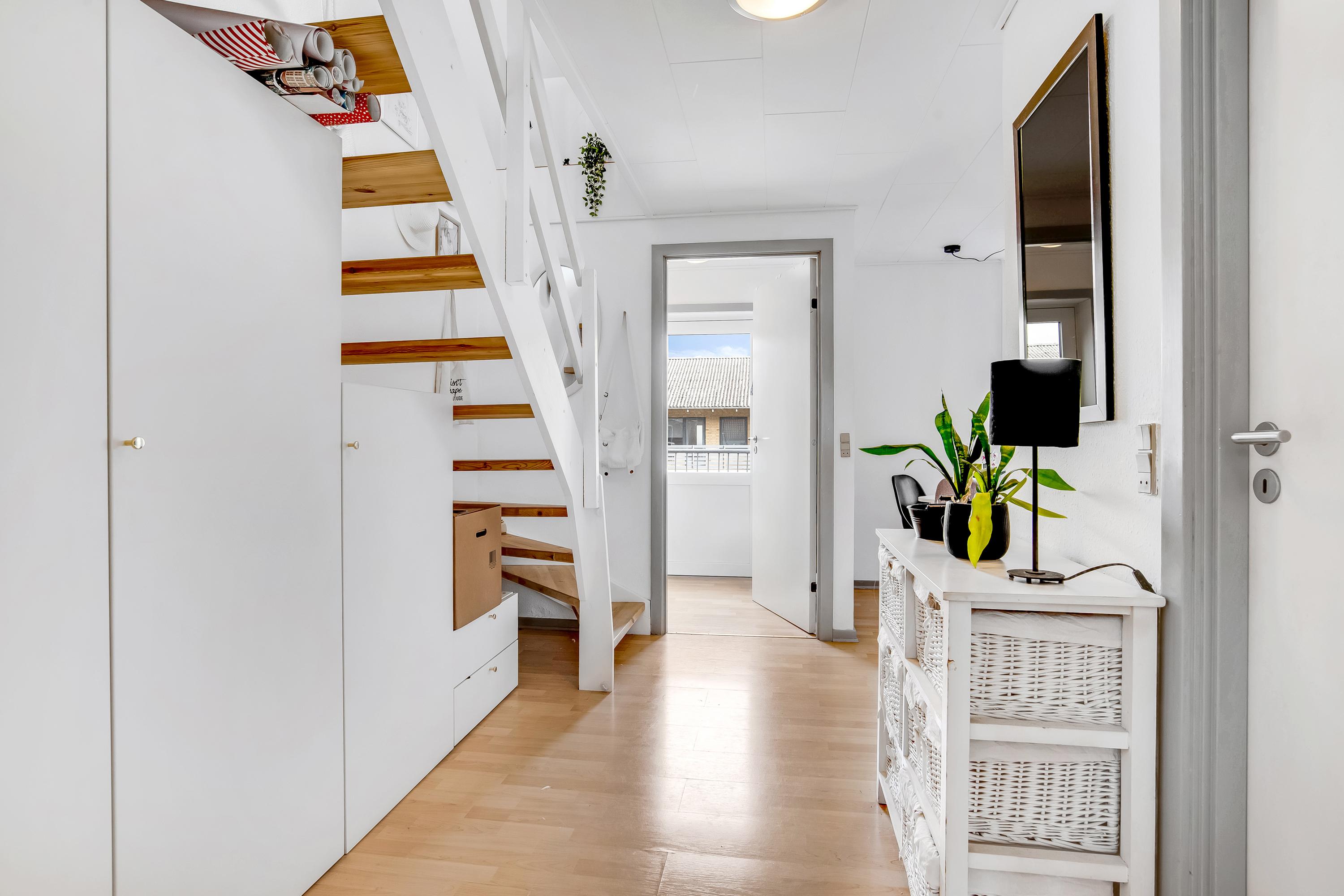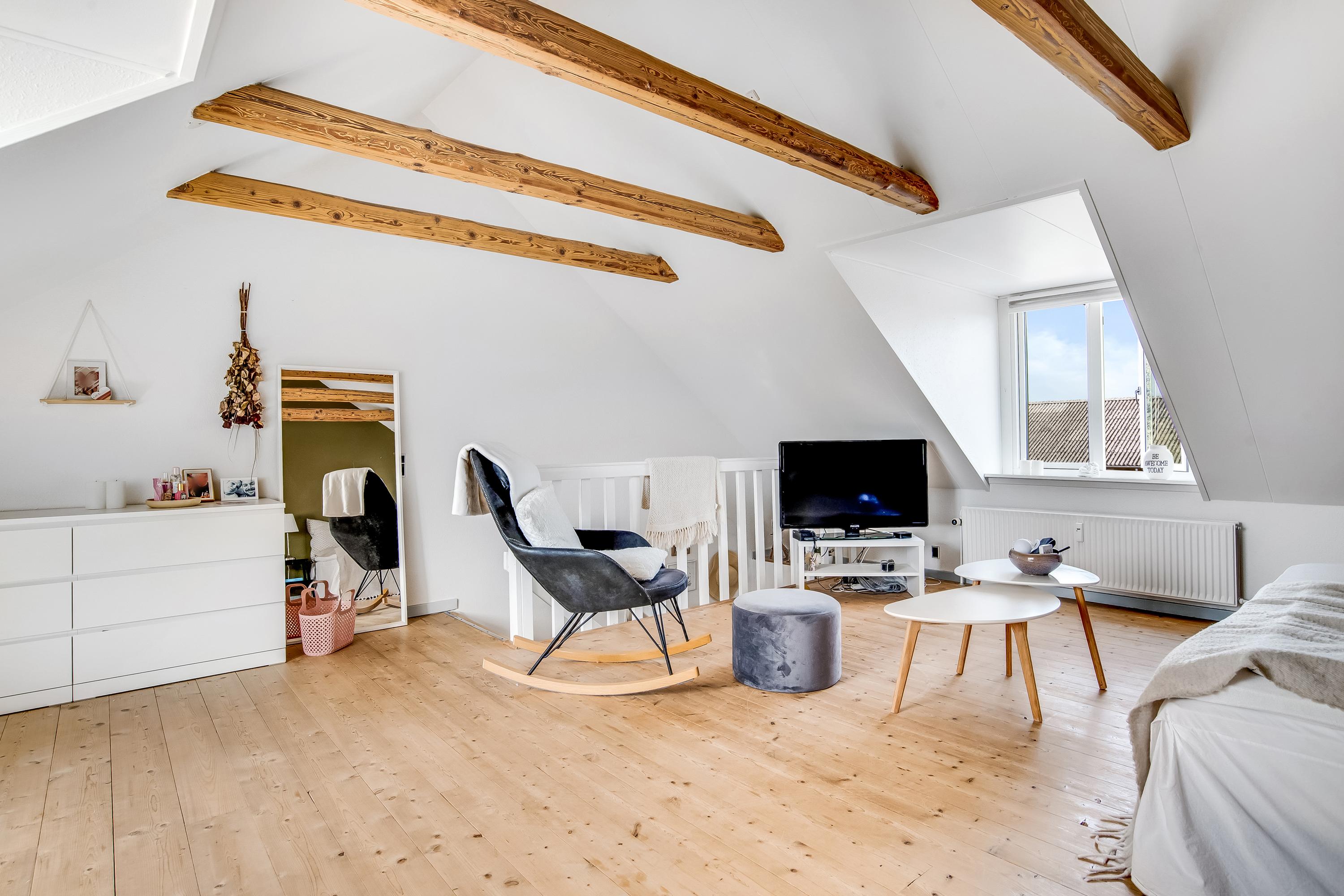 Lejligheden er indrettet med entre, lys og åben fordelergang med trappe til 1. sal, 2 gode soverum, pænt lyst køkken med spiseplads samt lyst badeværelse med brus. 1. sal er indrettet med rigtig flot og charmerende stue med