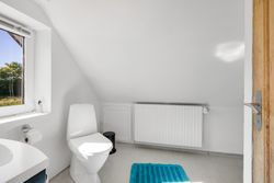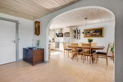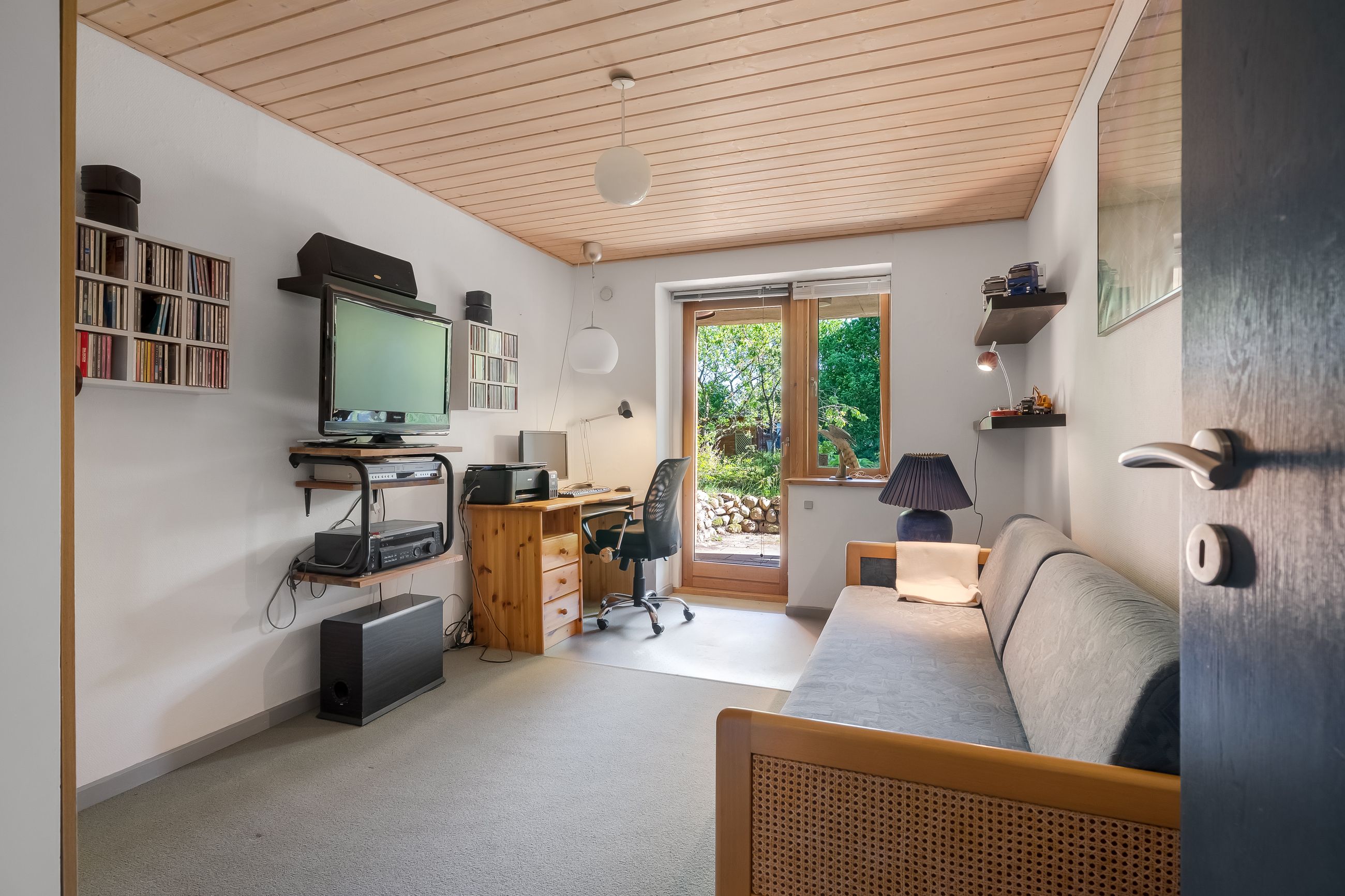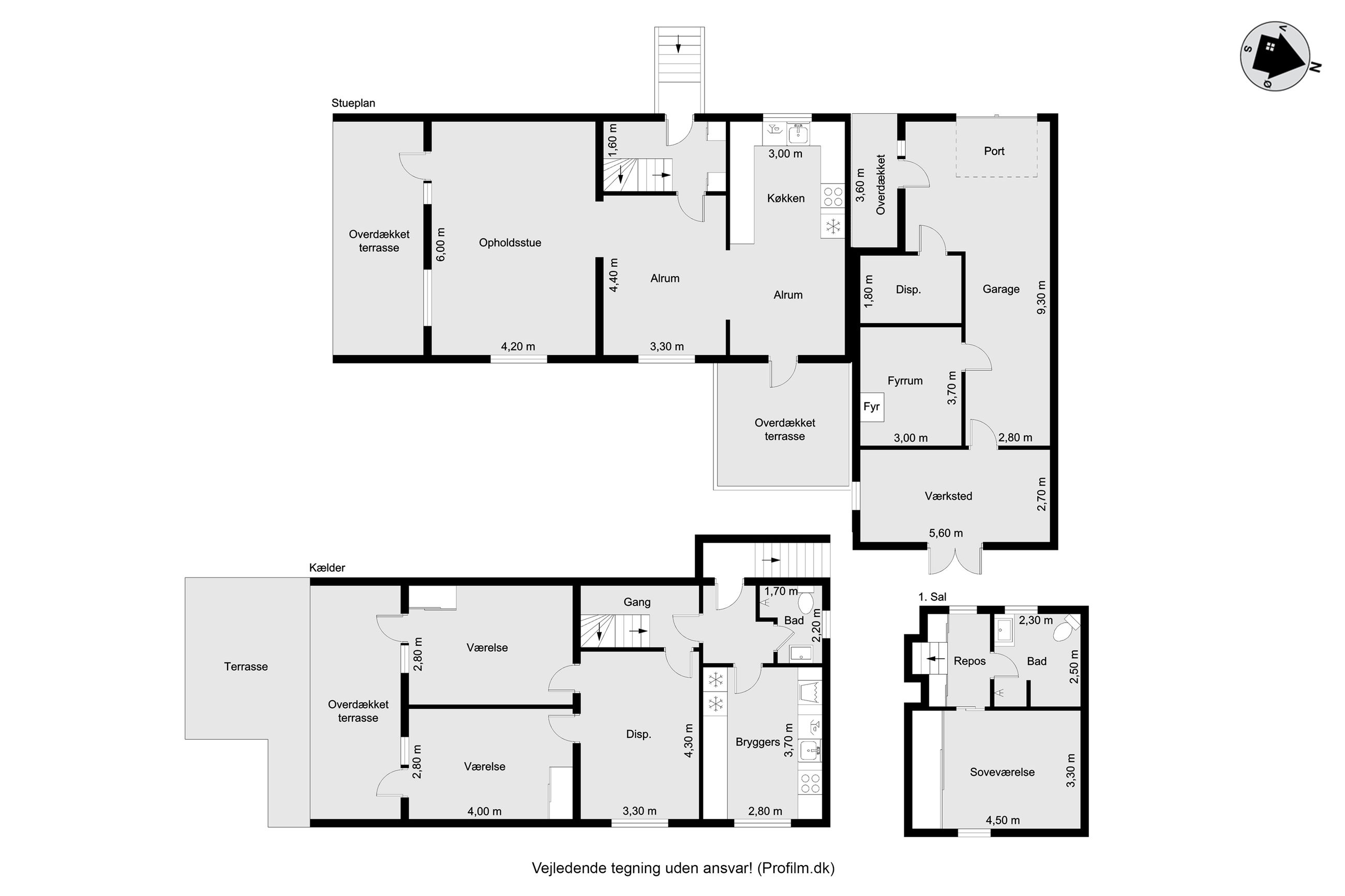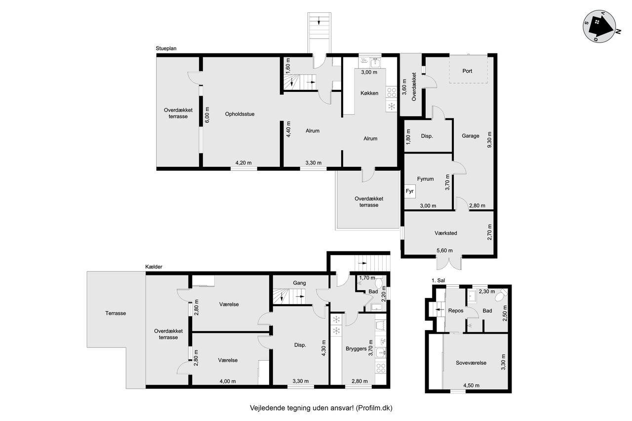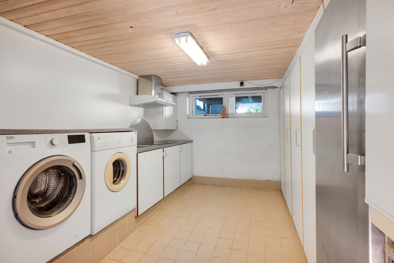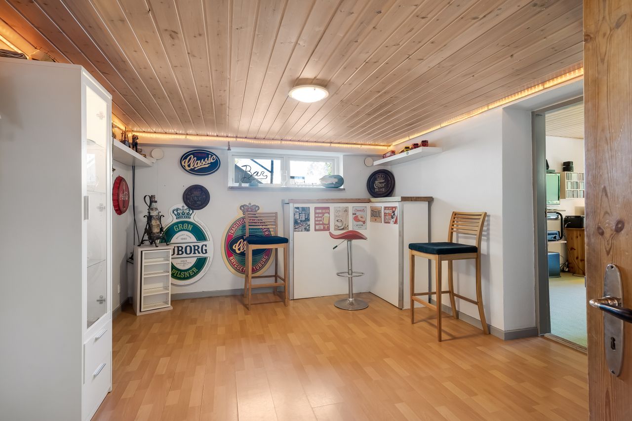 På første sal venter et stort soveværelse samt badeværelse og repos. Kælderen rummer endnu mere plads med to store værelser (godkendt som boligareal) begge med adgang til endnu en overdækket terrasse, badeværelse, bryggers og disponibelt rum/multirum.