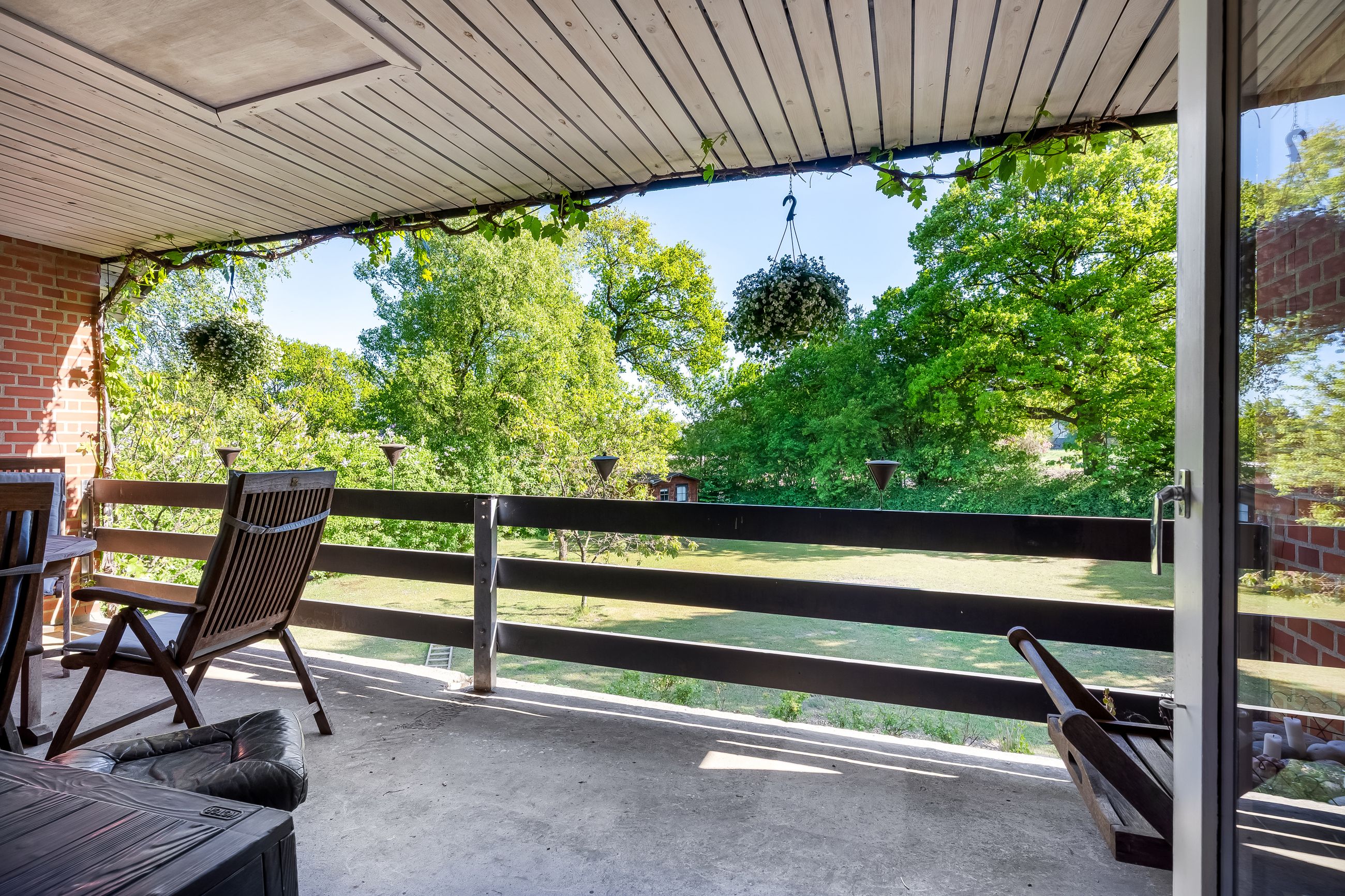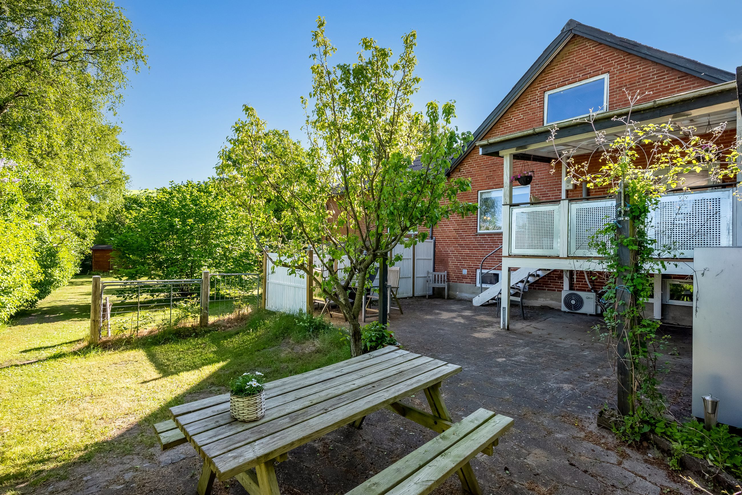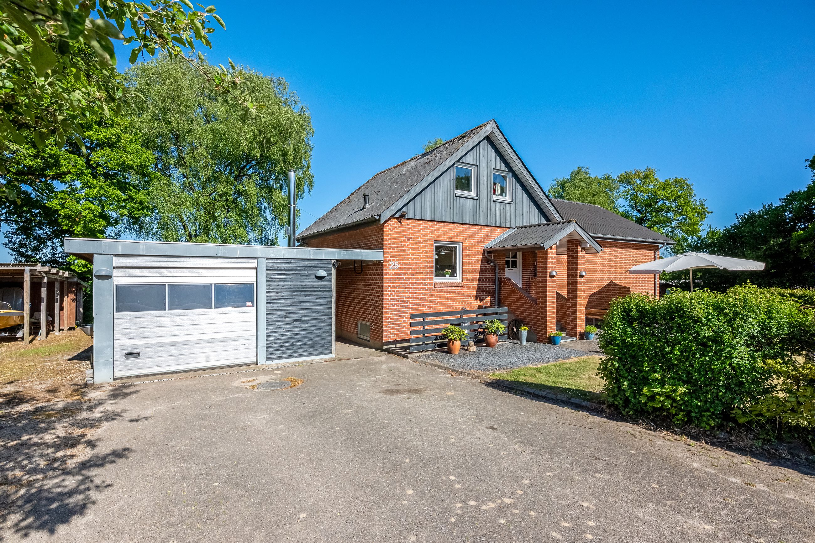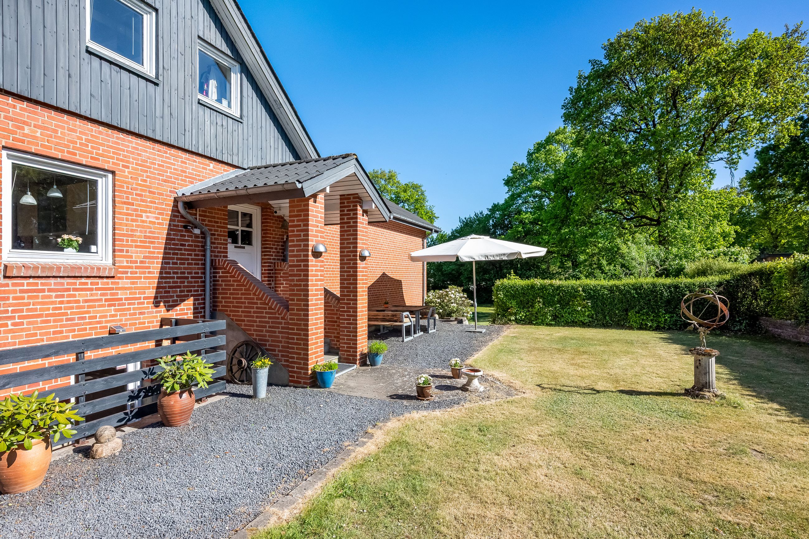 Villaen er omkranset af en stor hyggelig have, hvor du kan nyde de naturskønne omgivelser fra flere gode terrasser og hyggekroge. Her er plads til både afslapning og leg for hele familien. Ejendommen har også en stor garage og et godt værksted, perfekt til hobbyprojekter eller opbevaring.