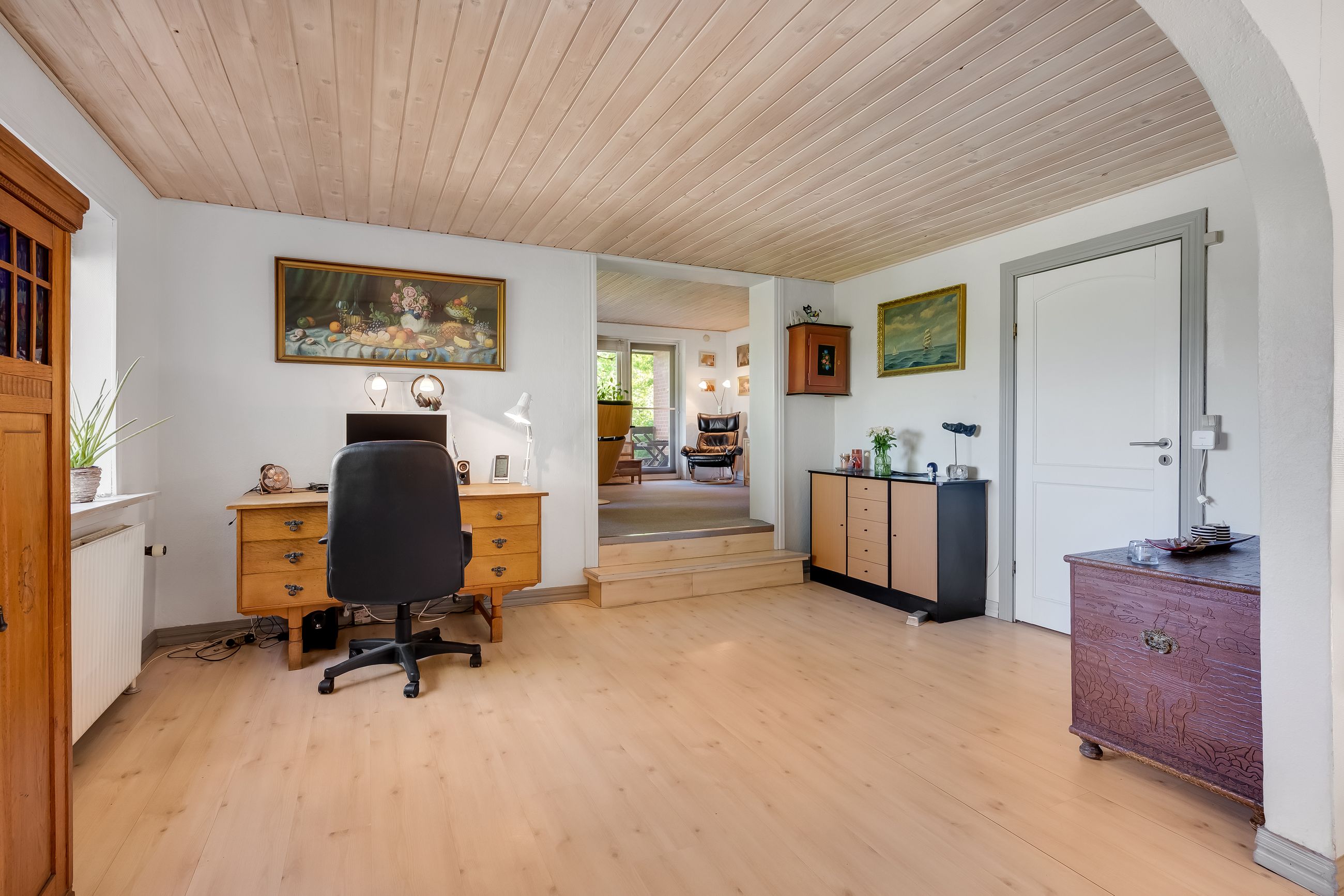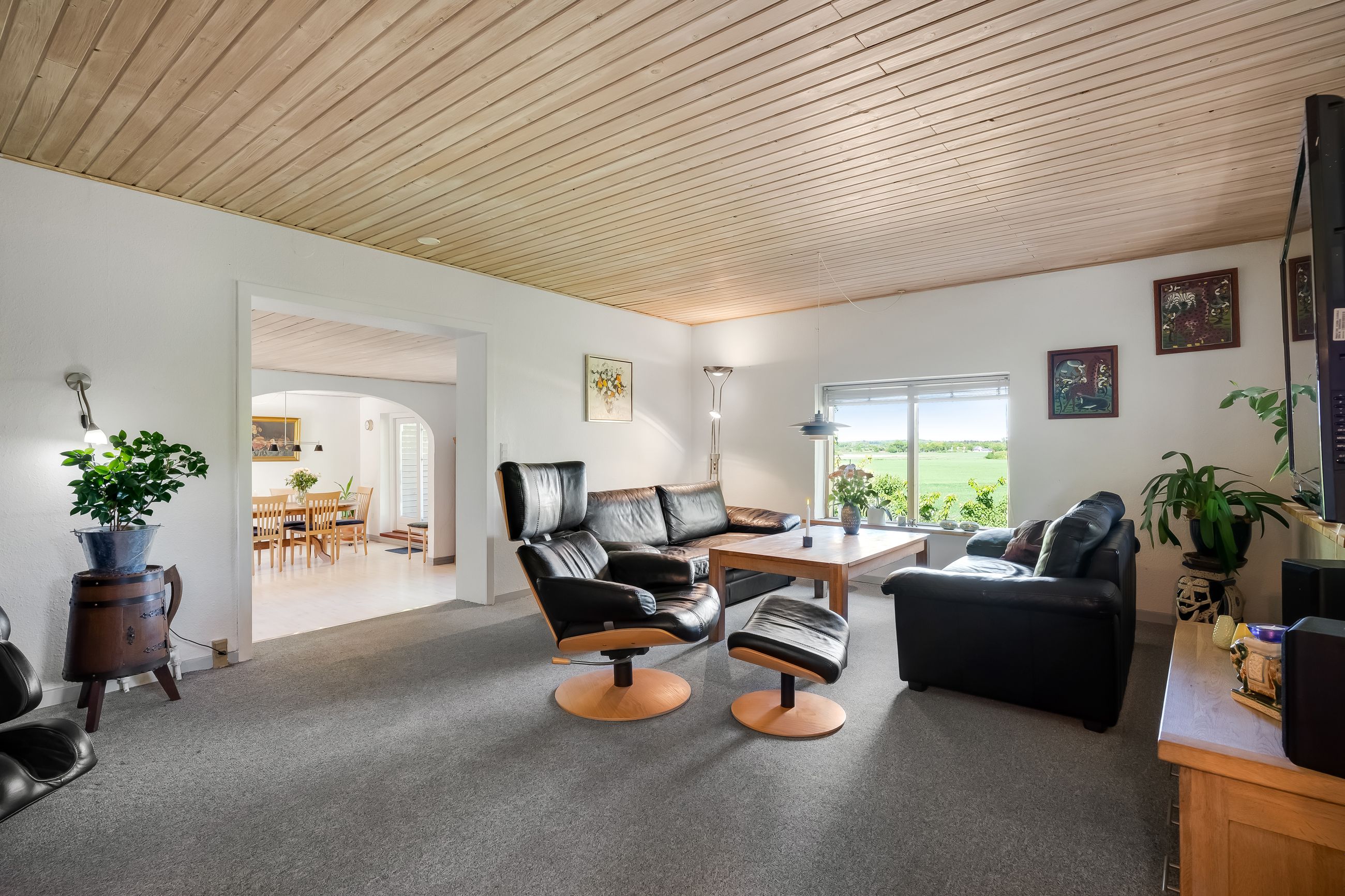 Indvendigt finder du en rummelig bolig med mange muligheder. Stueplan byder på en indbydende entre, der leder videre til en forstue/alrum samt et køkken/alrum med adgang til en overdækket terrasse – ideel til udendørs spisning med udsigt over de åbne vidder. Opholdsstuen har adgang til bred svalegang/terrasse, hvilket giver et dejligt lysindfald.