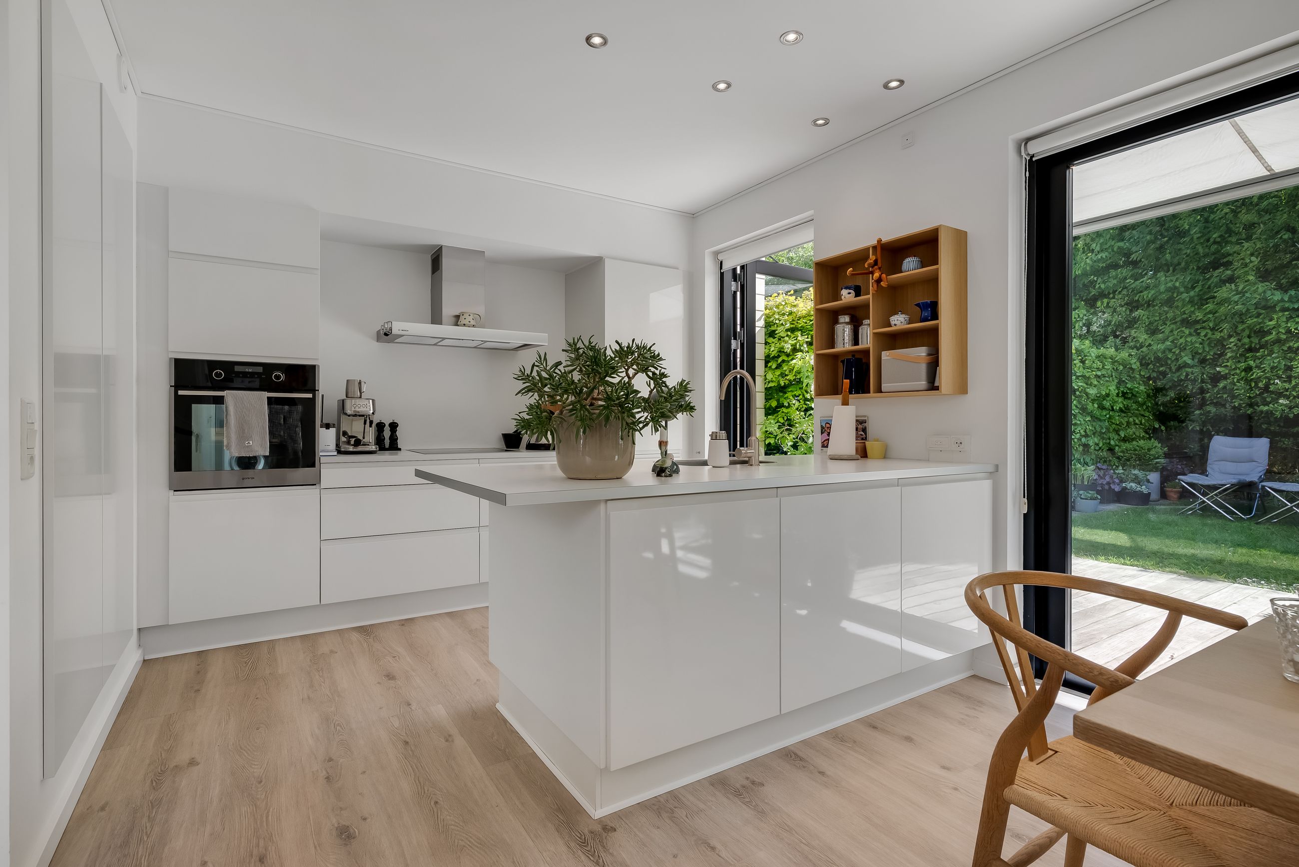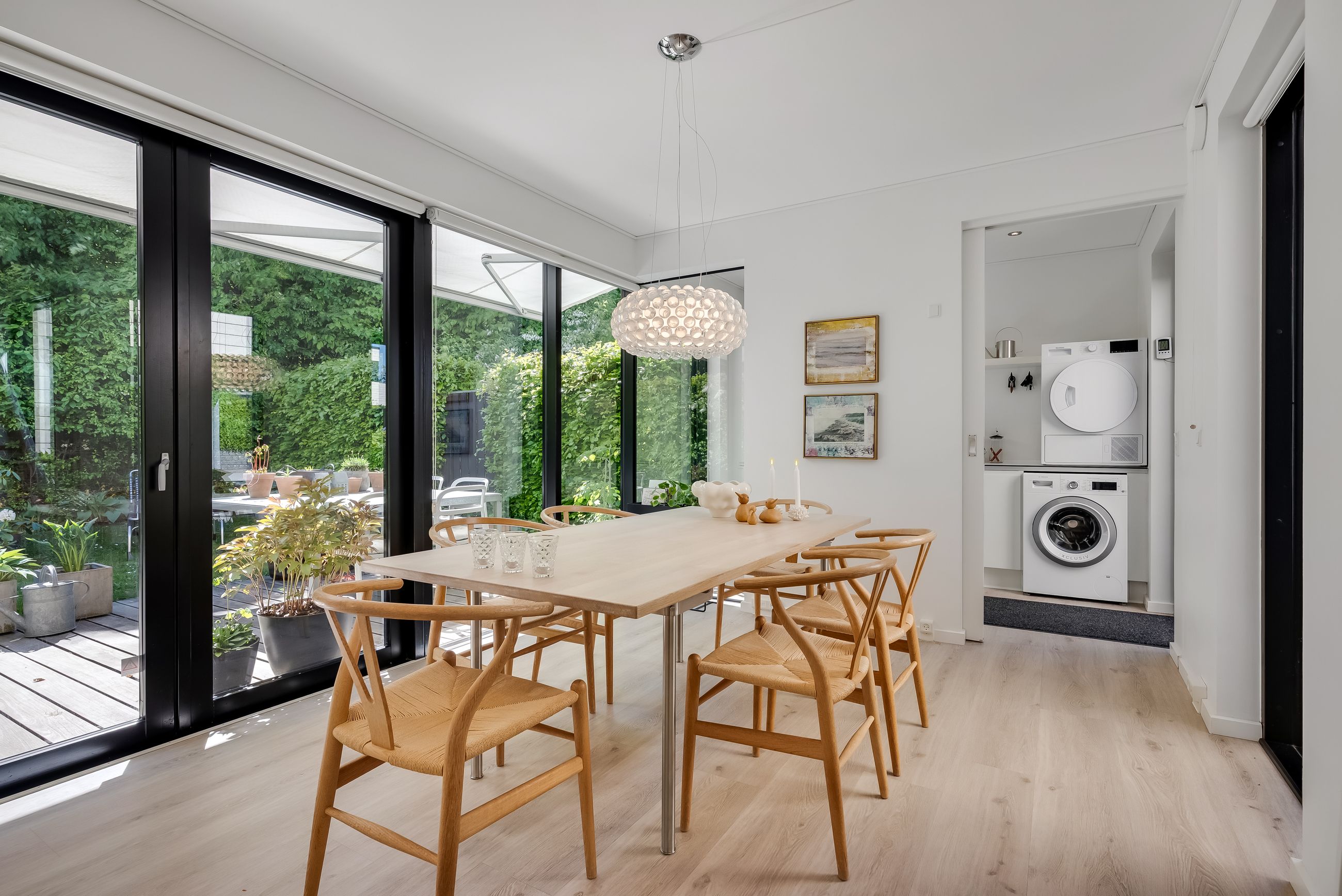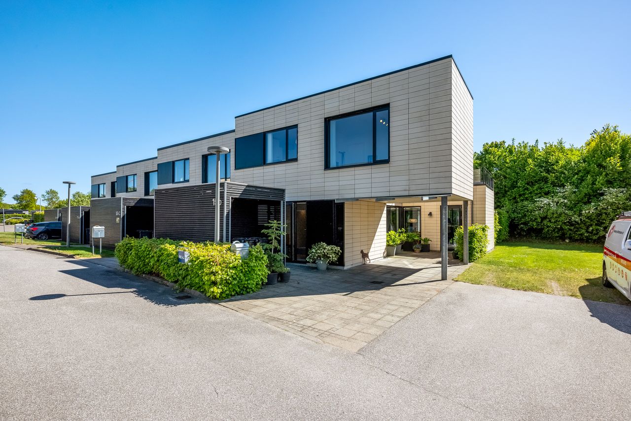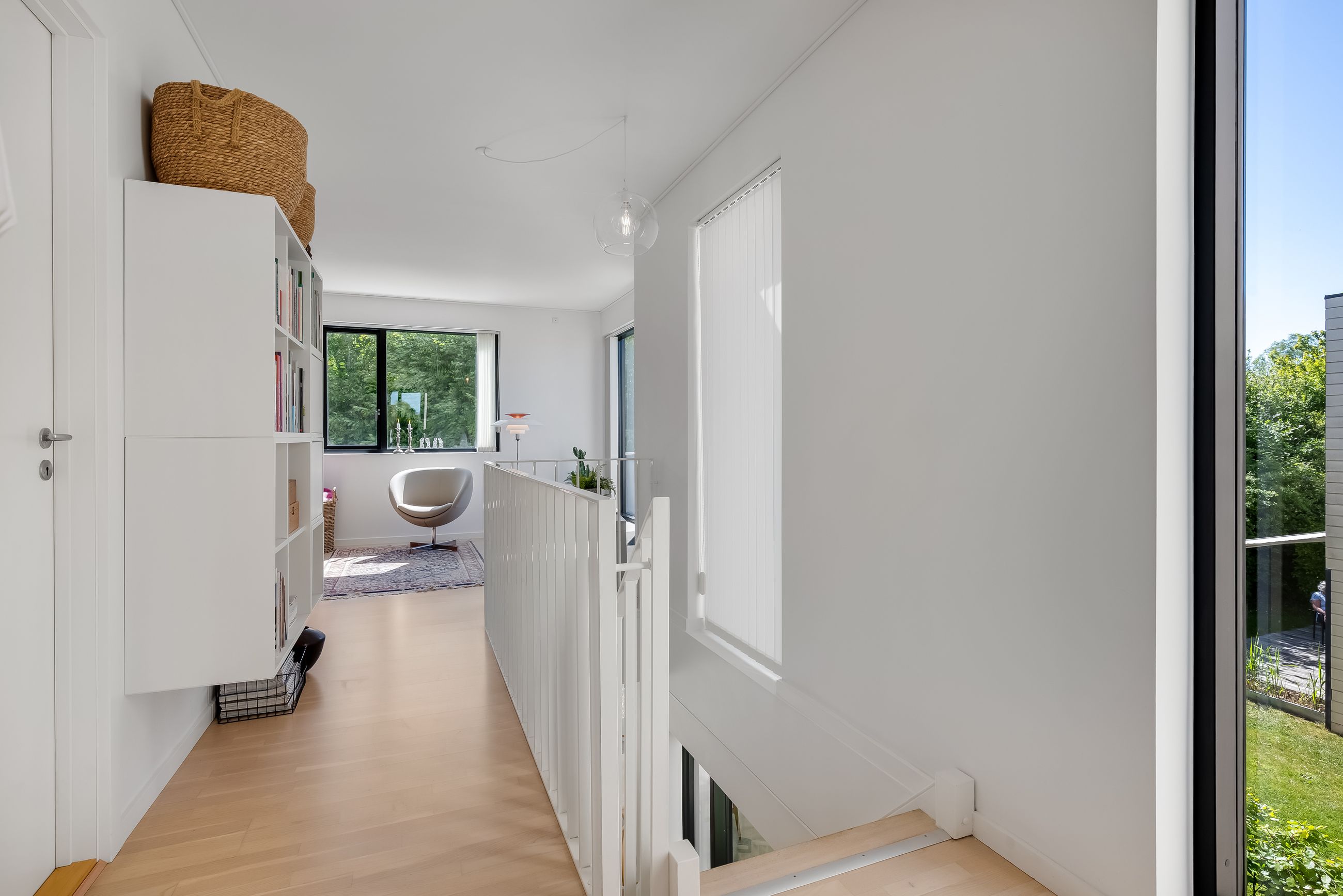 Med en moderne planløsning får du masser af naturligt lysindfald gennem de store vinduespartier, mens den syd- og vestvendte terrasse samt haven tilbyder fantastiske muligheder for at nyde solen hele dagen. Boligen strækker sig over 140 kvadratmeter fordelt på to fulde etager. Hertil kommer et praktisk depotrum samt et integreret vognly, der gør hverdagen nemmere.