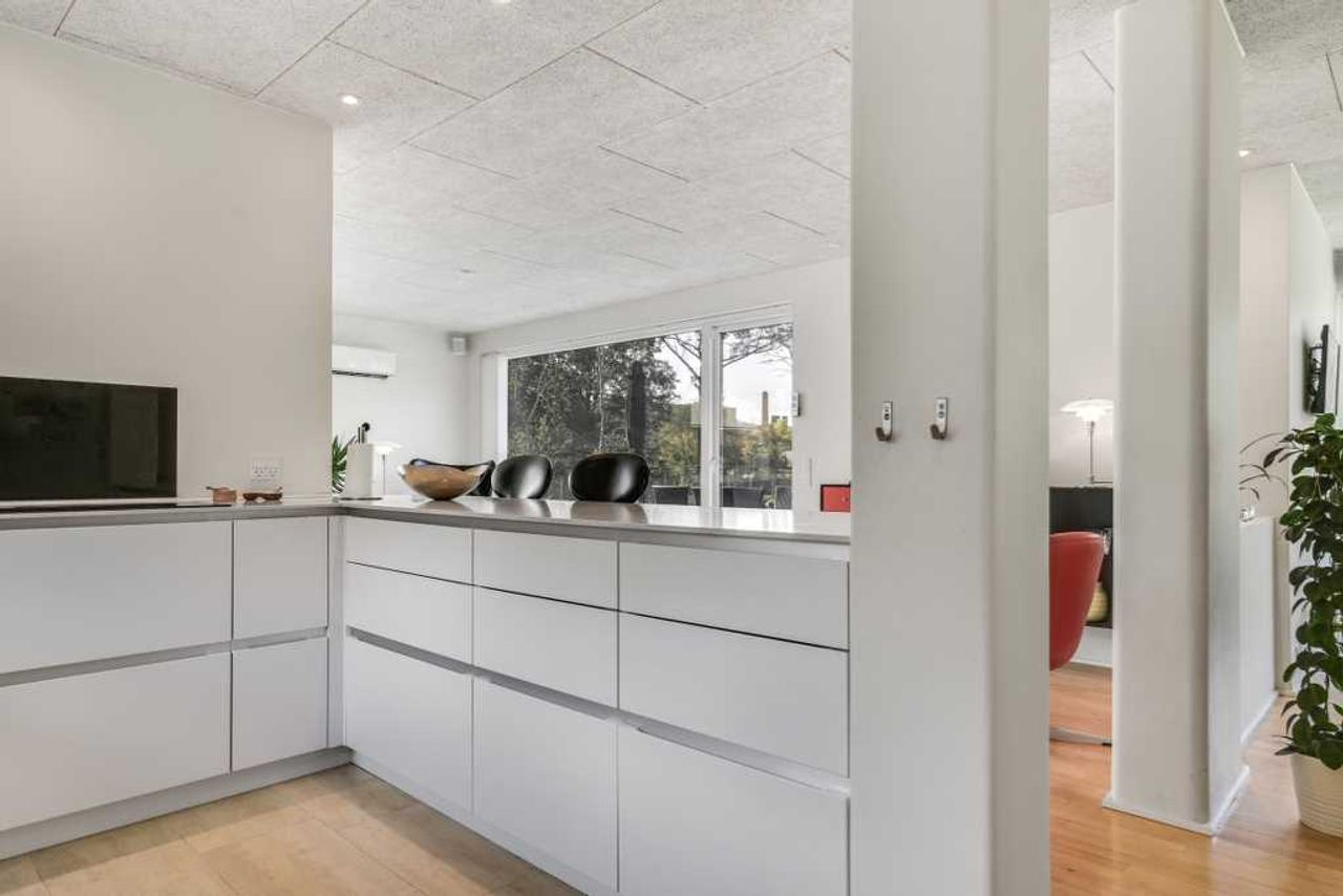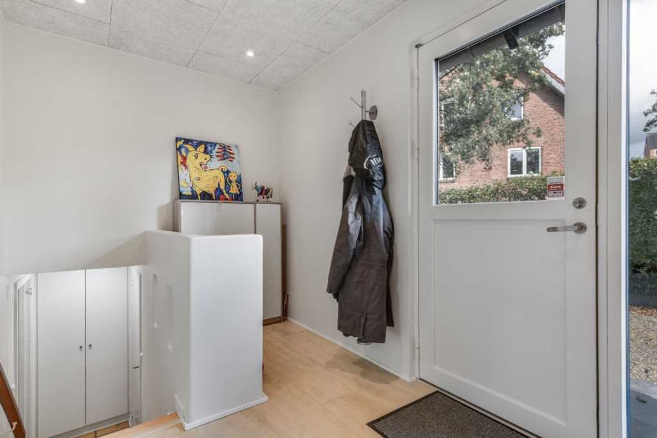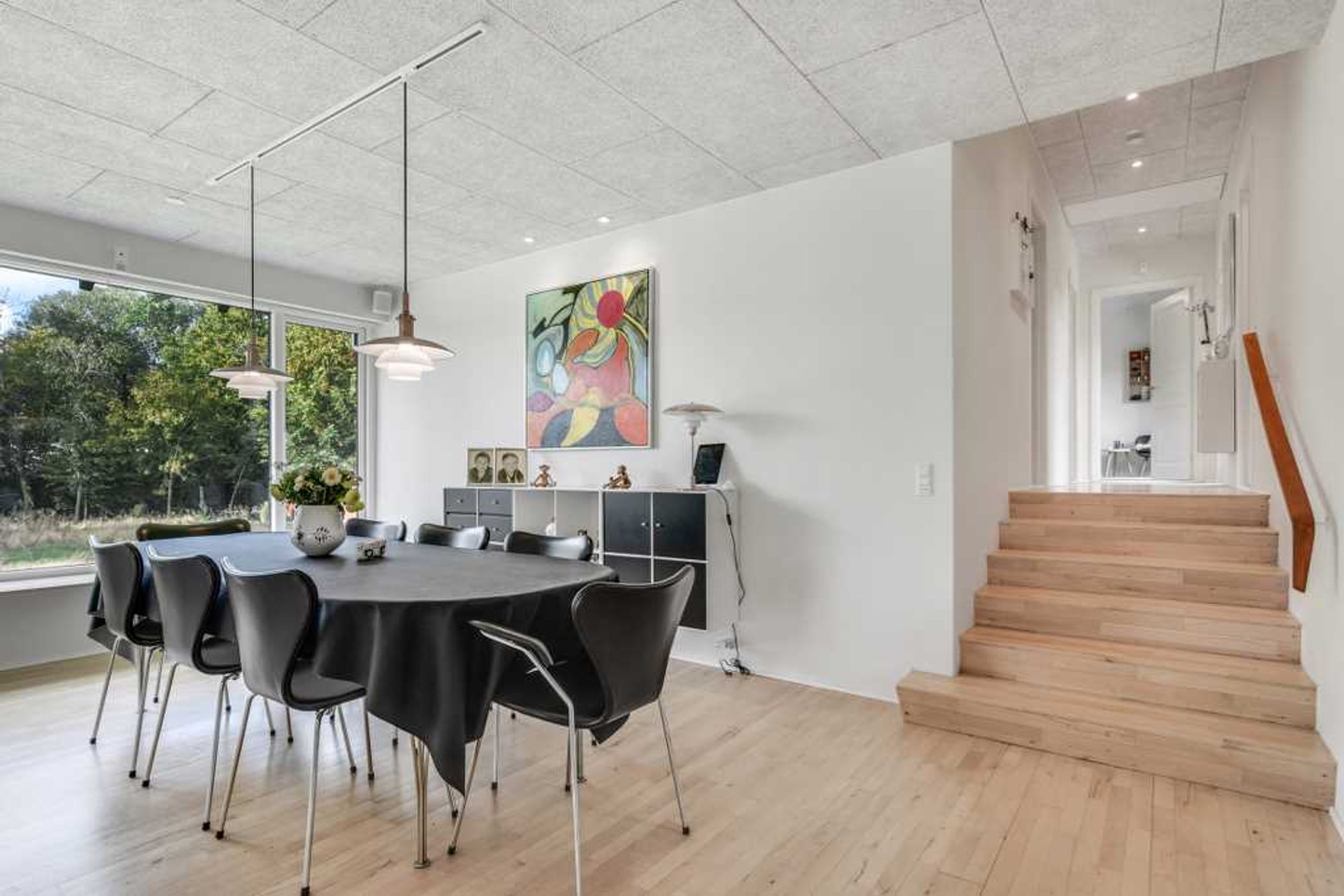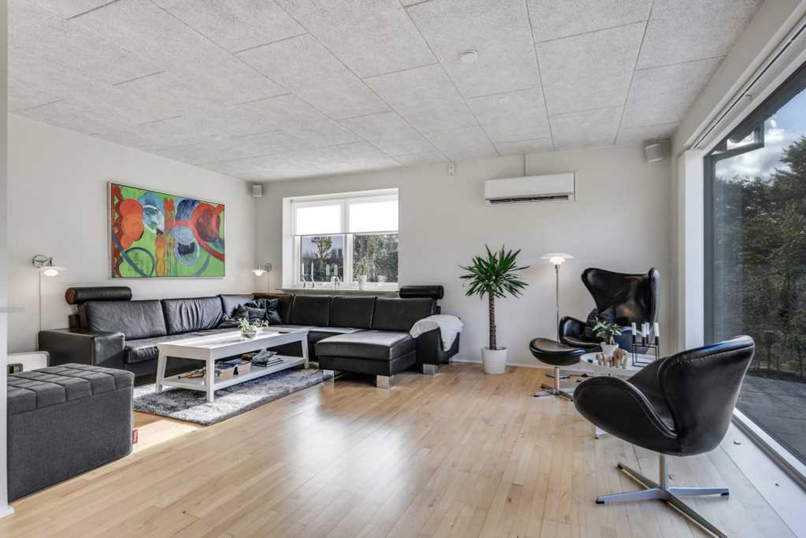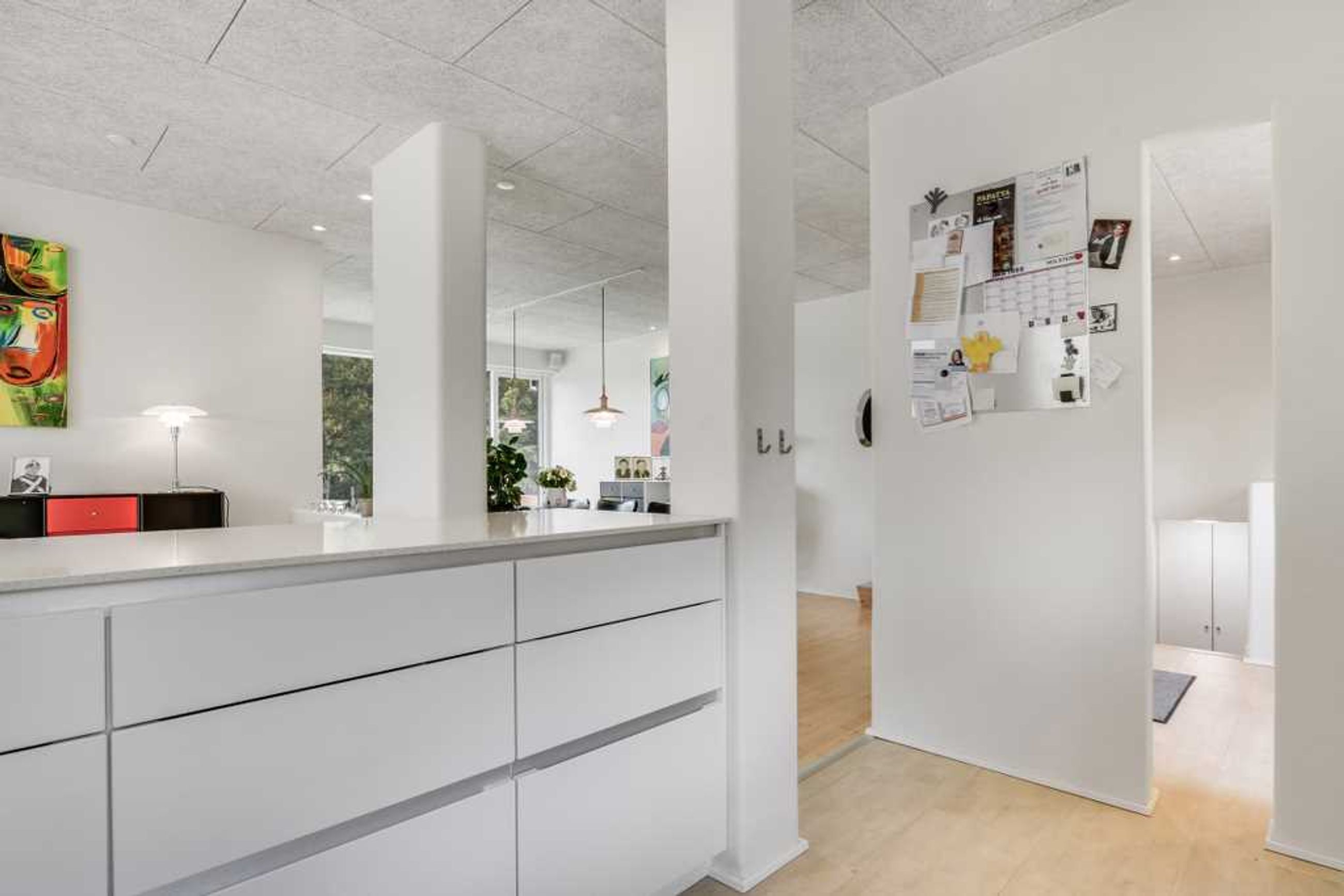 Boligens indretning byder på spændende detaljer som niveauforskelle og halvmure, der skaber naturlige opdelinger mellem rummene og samtidig understøtter et moderne og åbent boligmiljø. Hjerterummet er det indbydende køkken/alrum med store vinduespartier og et skønt lysindfald. I forlængelse heraf ligger opholdsstuen med udgang til en vestvendt fliseterrasse.