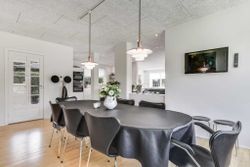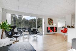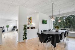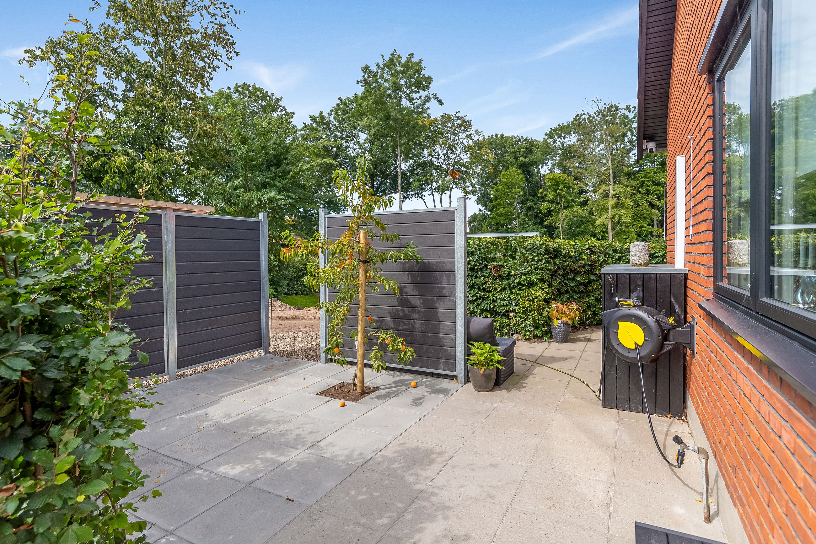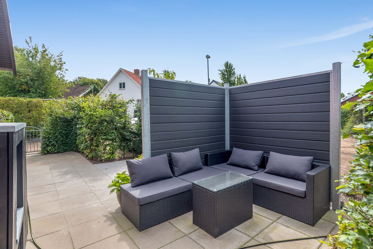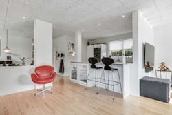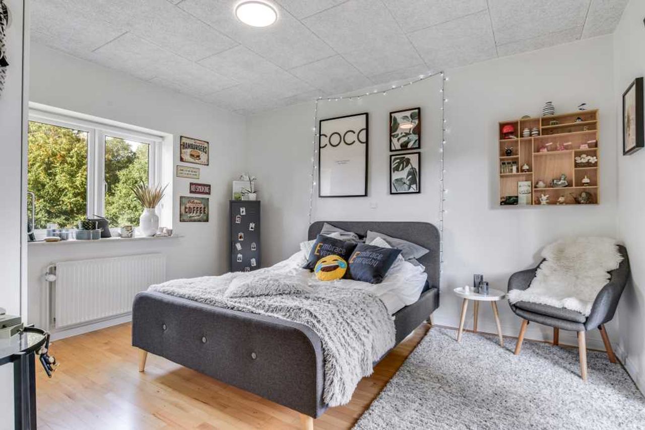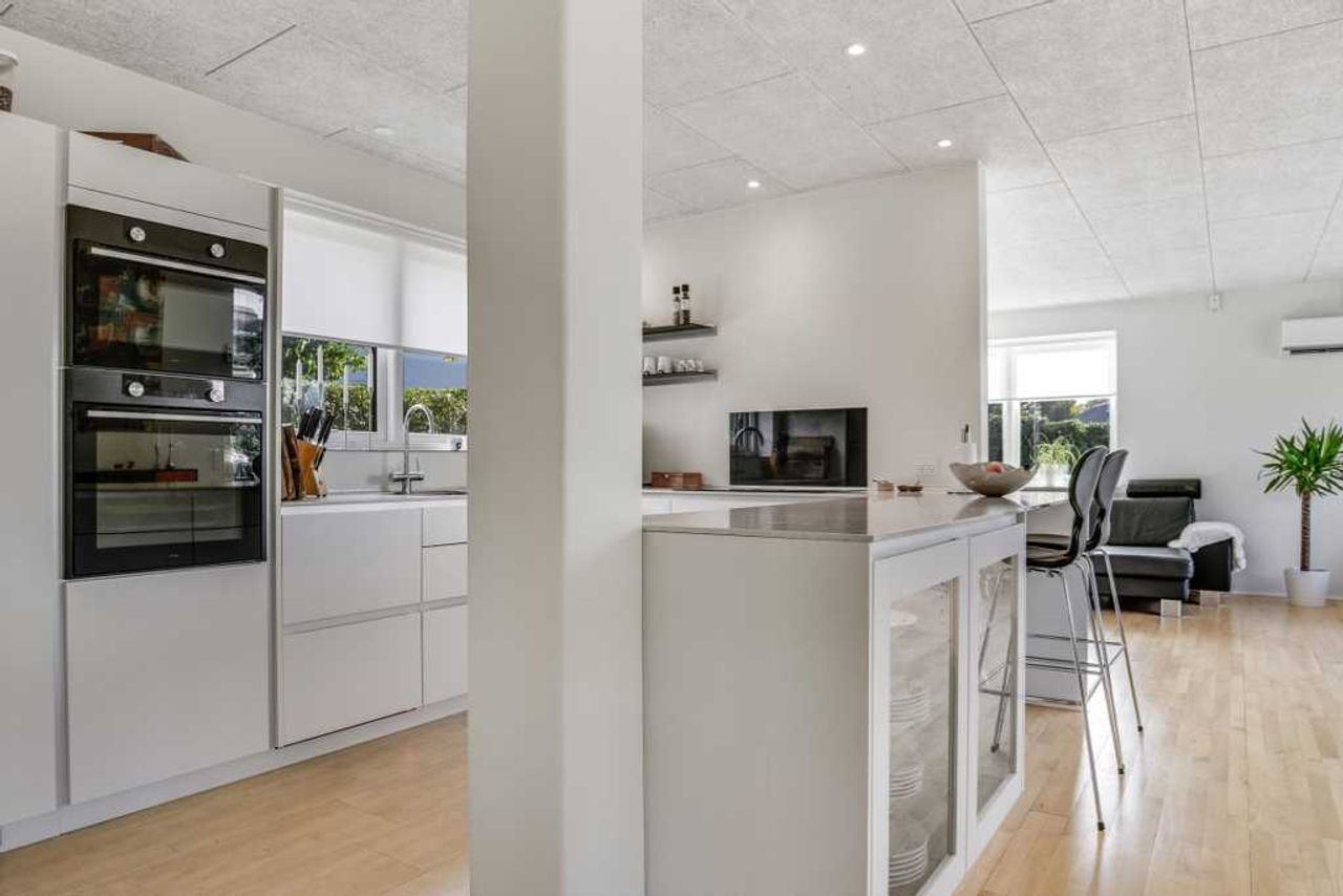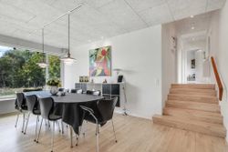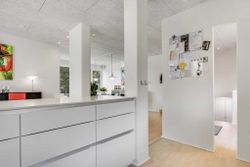 Boligens indretning byder på spændende detaljer som niveauforskelle og halvmure, der skaber naturlige opdelinger mellem rummene og samtidig understøtter et moderne og åbent boligmiljø. Hjerterummet er det indbydende køkken/alrum med store vinduespartier og et skønt lysindfald. I forlængelse heraf ligger opholdsstuen med udgang til en vestvendt fliseterrasse.