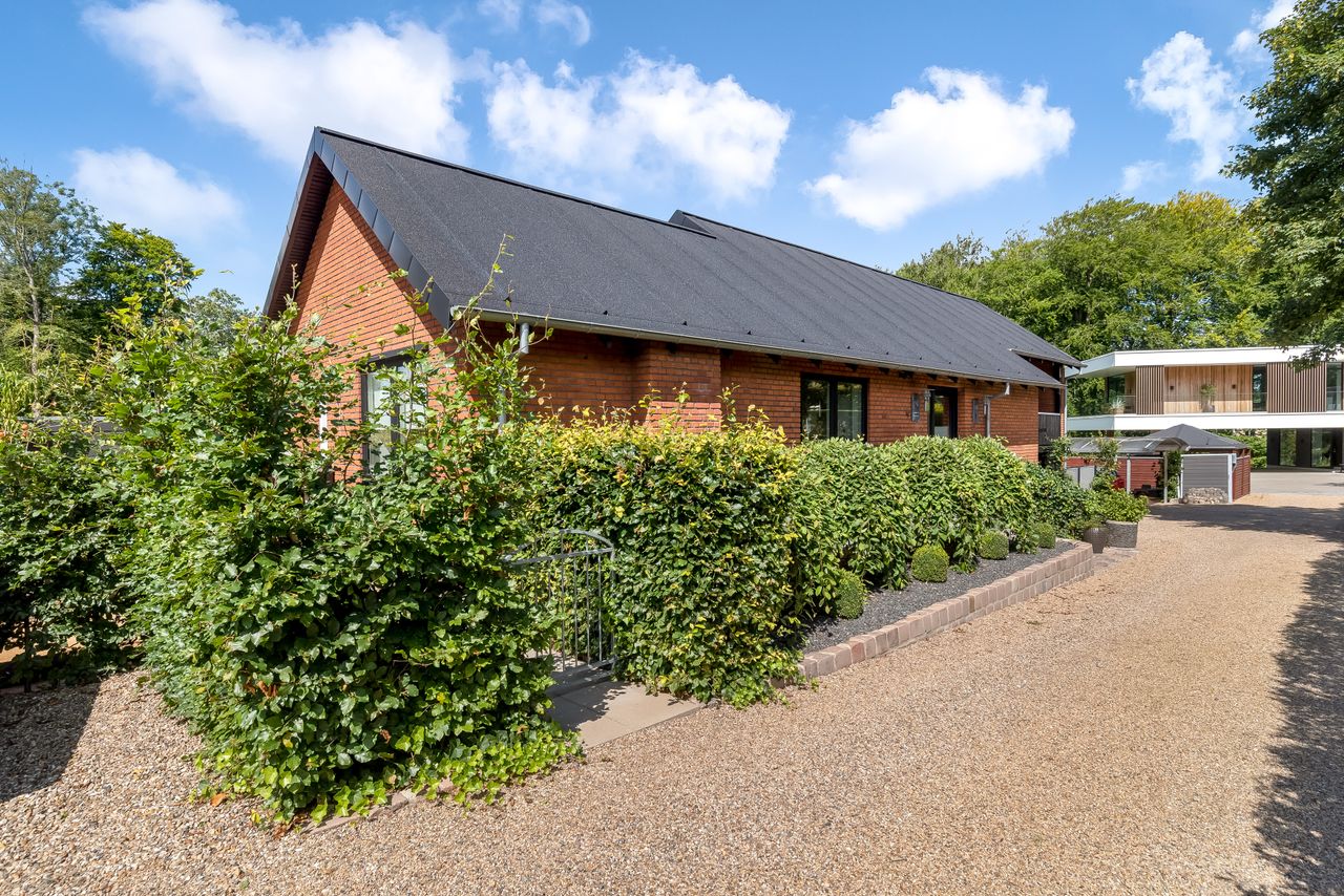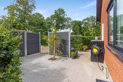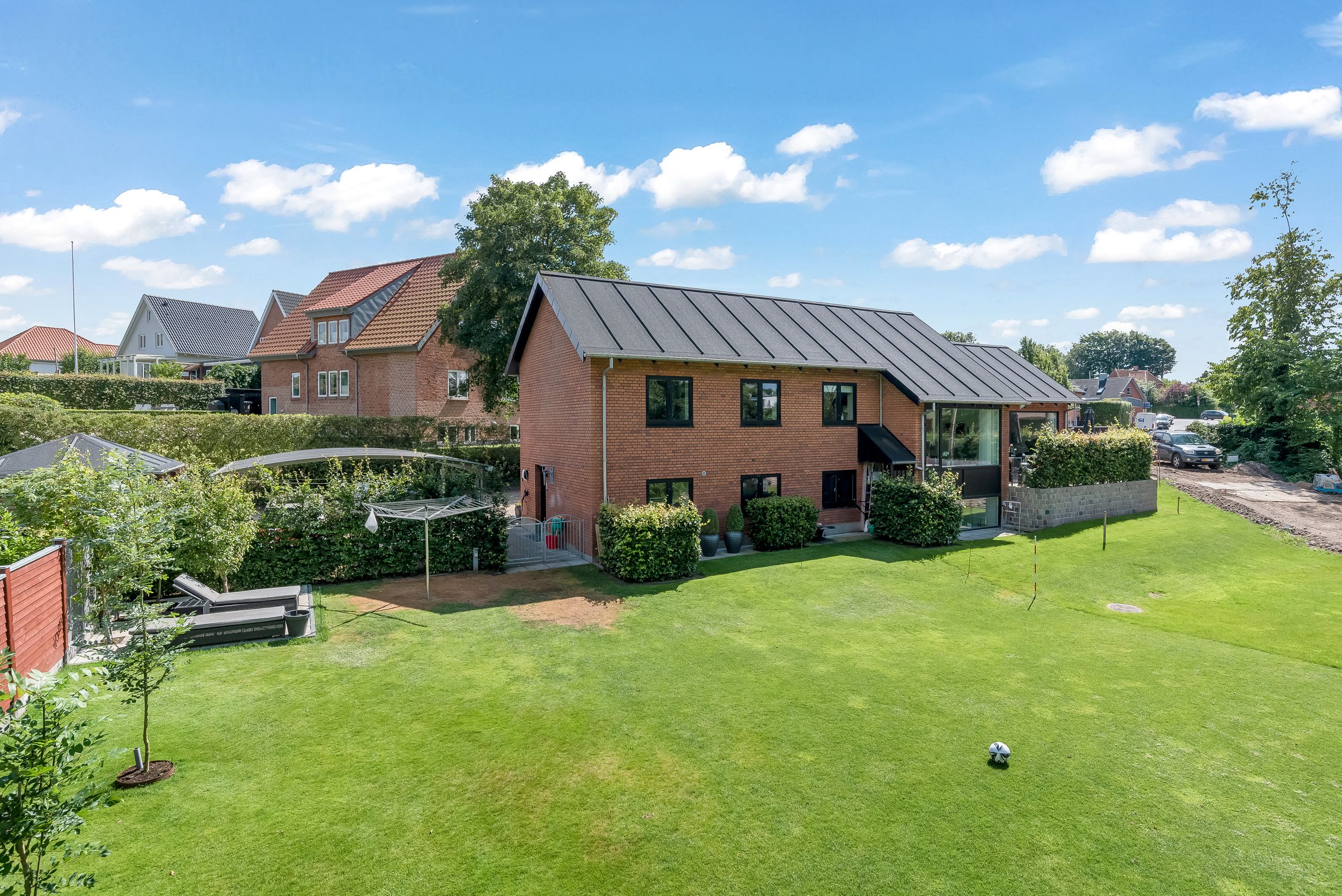 Villaen fremstår med et elegant arkitektonisk udtryk i form af røde murstensfacader, sort tagpap med listedækning og moderne træ-/aluvinduer. Indenfor videreføres det stilrene udtryk med blandt andet troldtektlofter, der sikrer en behagelig akustik, et grebsfrit og tidløst køkken samt rustikke teglklinker i den højloftede kælder, der delvist er godkendt til beboelse.