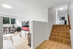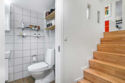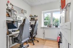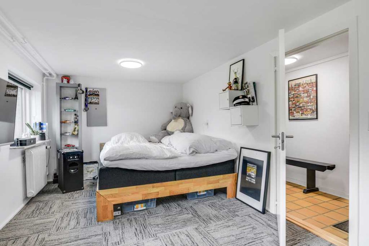 Stueplanet rummer desuden tre værelser – hvoraf det ene har direkte udgang til en sydvendt svalegang og dermed egner sig ideelt som soveværelse. Herudover findes et badeværelse med bruseniche og en rummelig entré med trappe til den højloftede kælder, som delvist er godkendt til beboelse.