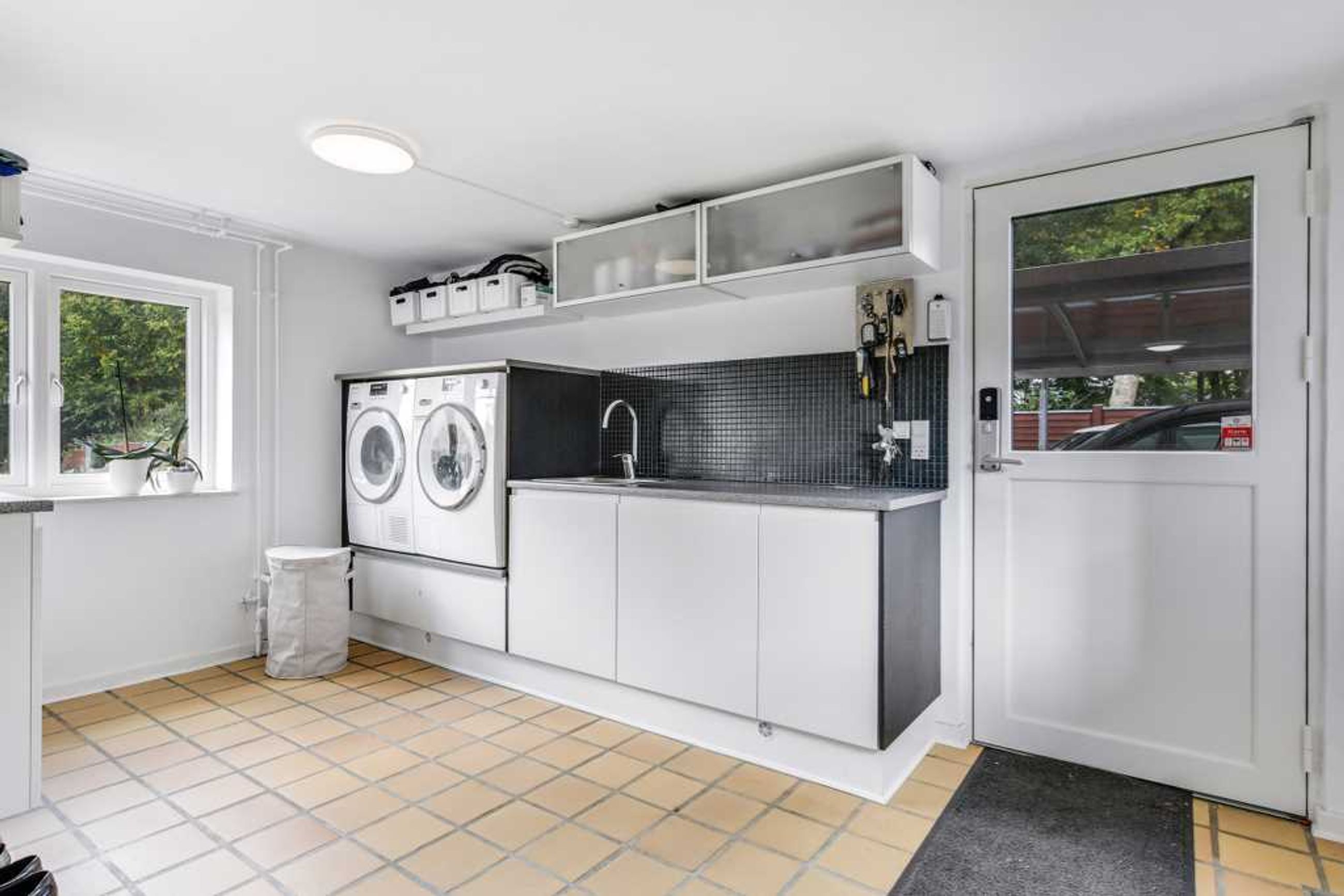 Kælderen ligger i niveau med terrænet og er indrettet med et lyst gangareal og et åbent disponibelt rum. Dertil kommer fire gode disponible rum, hvoraf tre er sammenhængende, et stort værelse, separat toilet og baderum, viktualierum samt et bryggers med direkte adgang til den galvaniserede dobbeltcarport.
