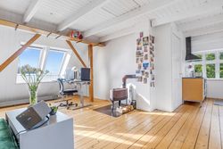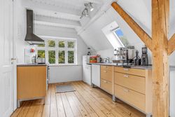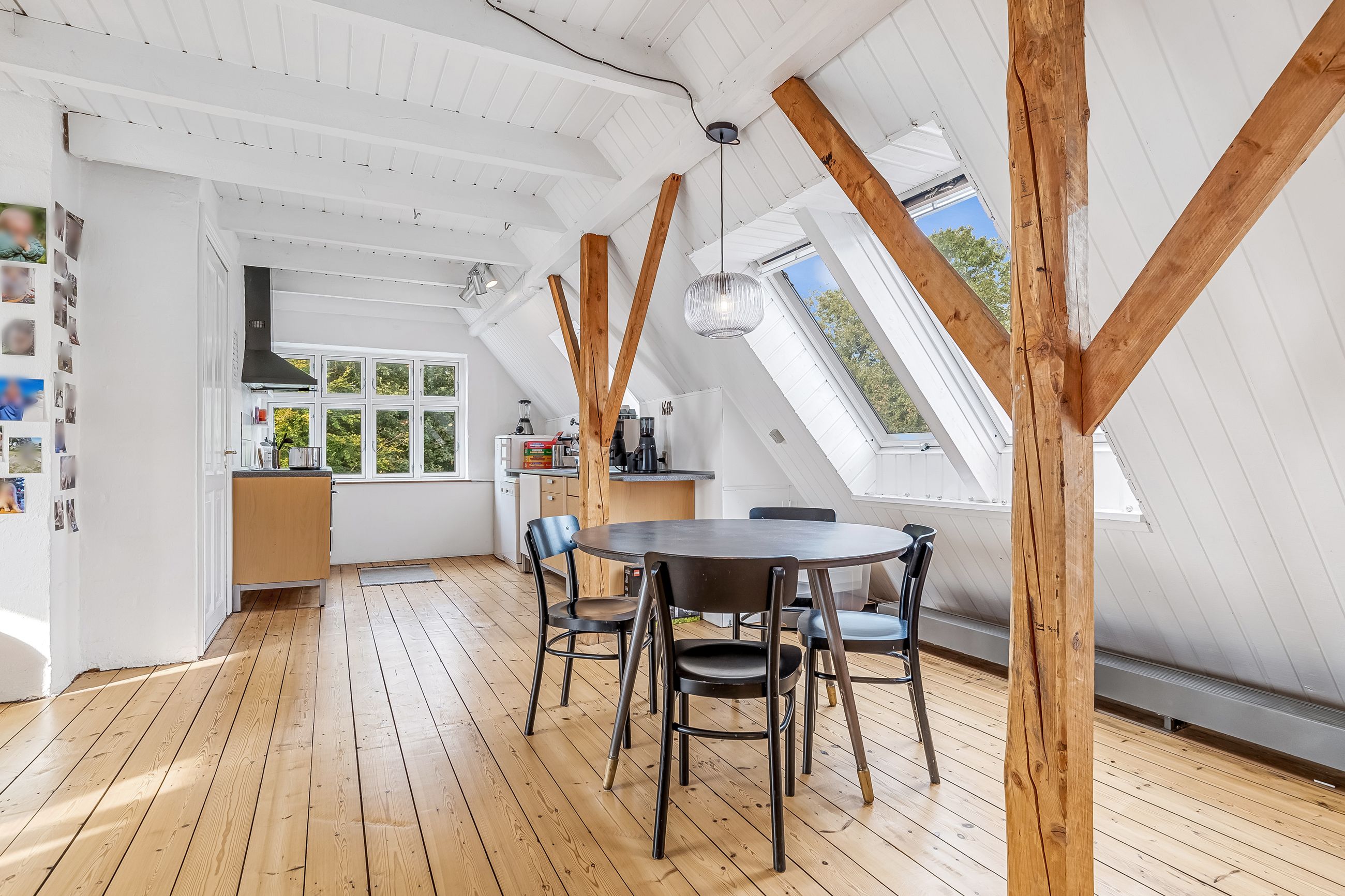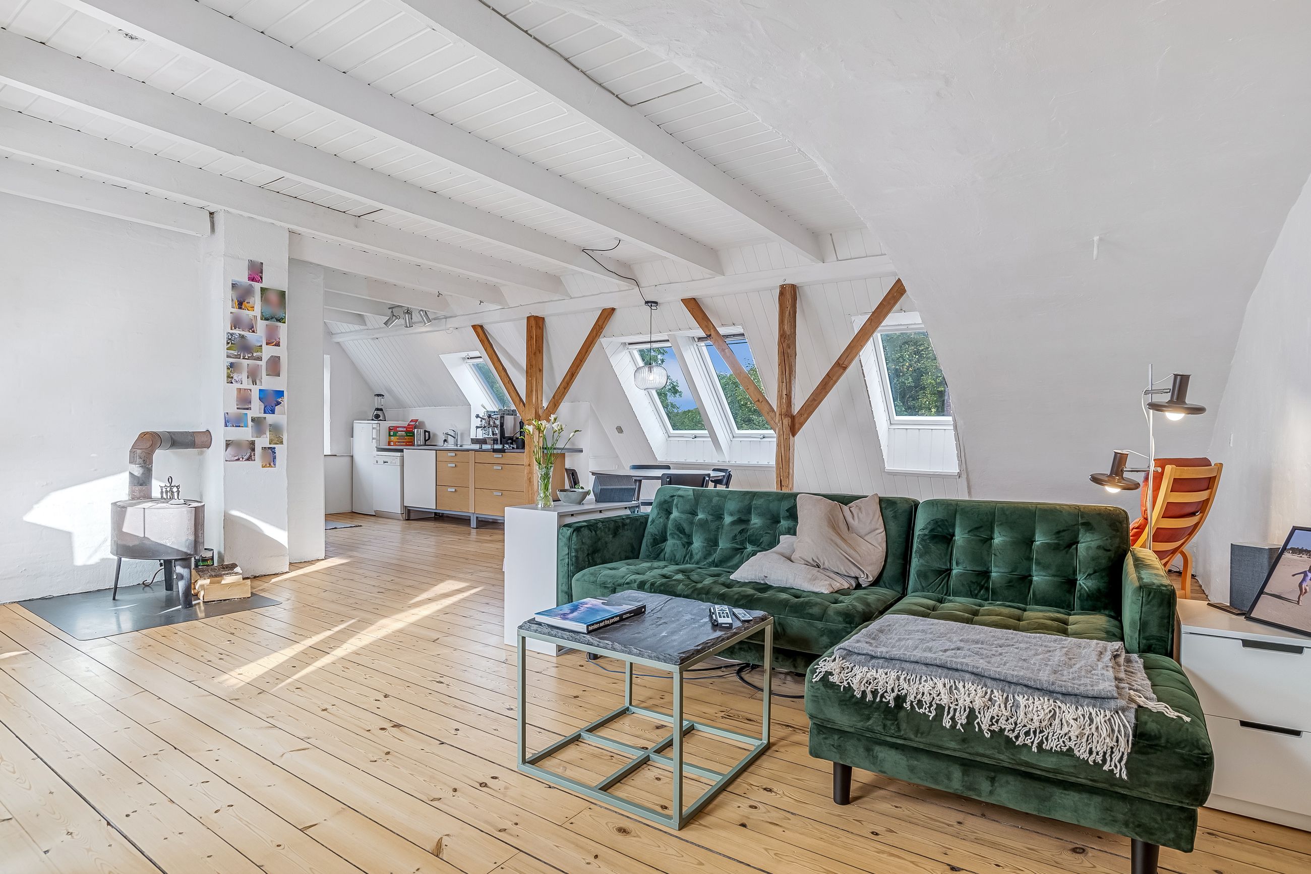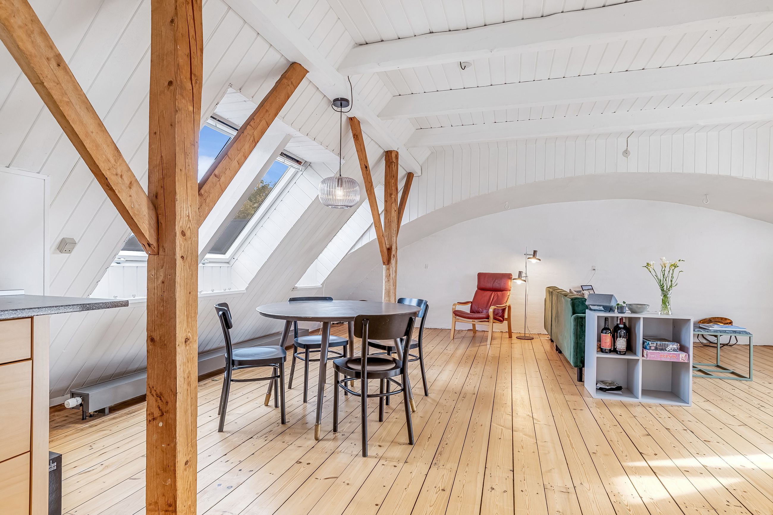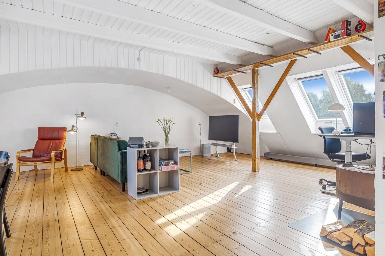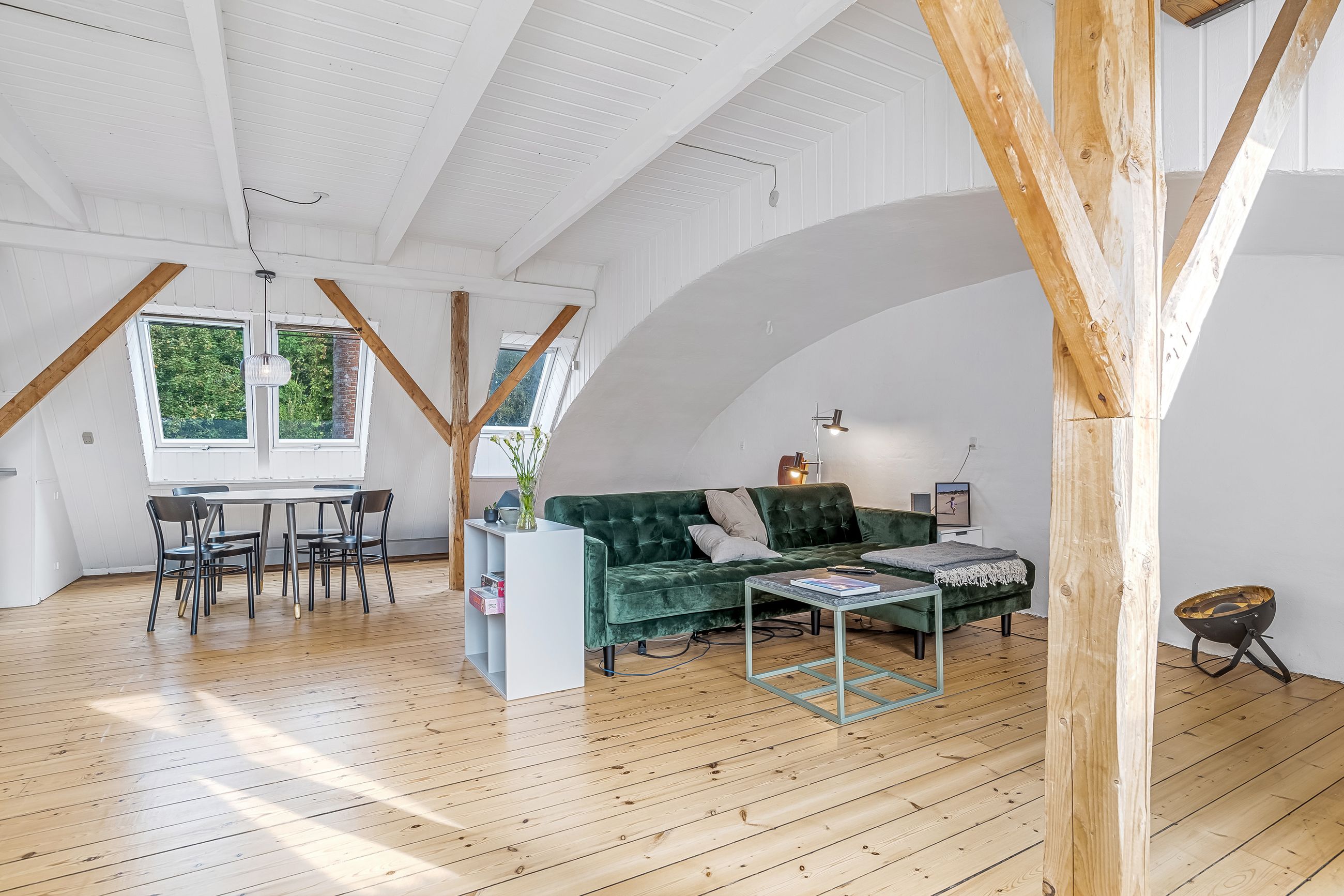 Ovenpå møder man et stort køkken i sammenhæng med den store stue med synlige spær. Her er også en hvælving fra bygningens tid som mejeri, som giver lejligheden et unikt præg. Der er spændende lysindfald fra tagvinduerne i begge sider, som gør rummet meget lyst.