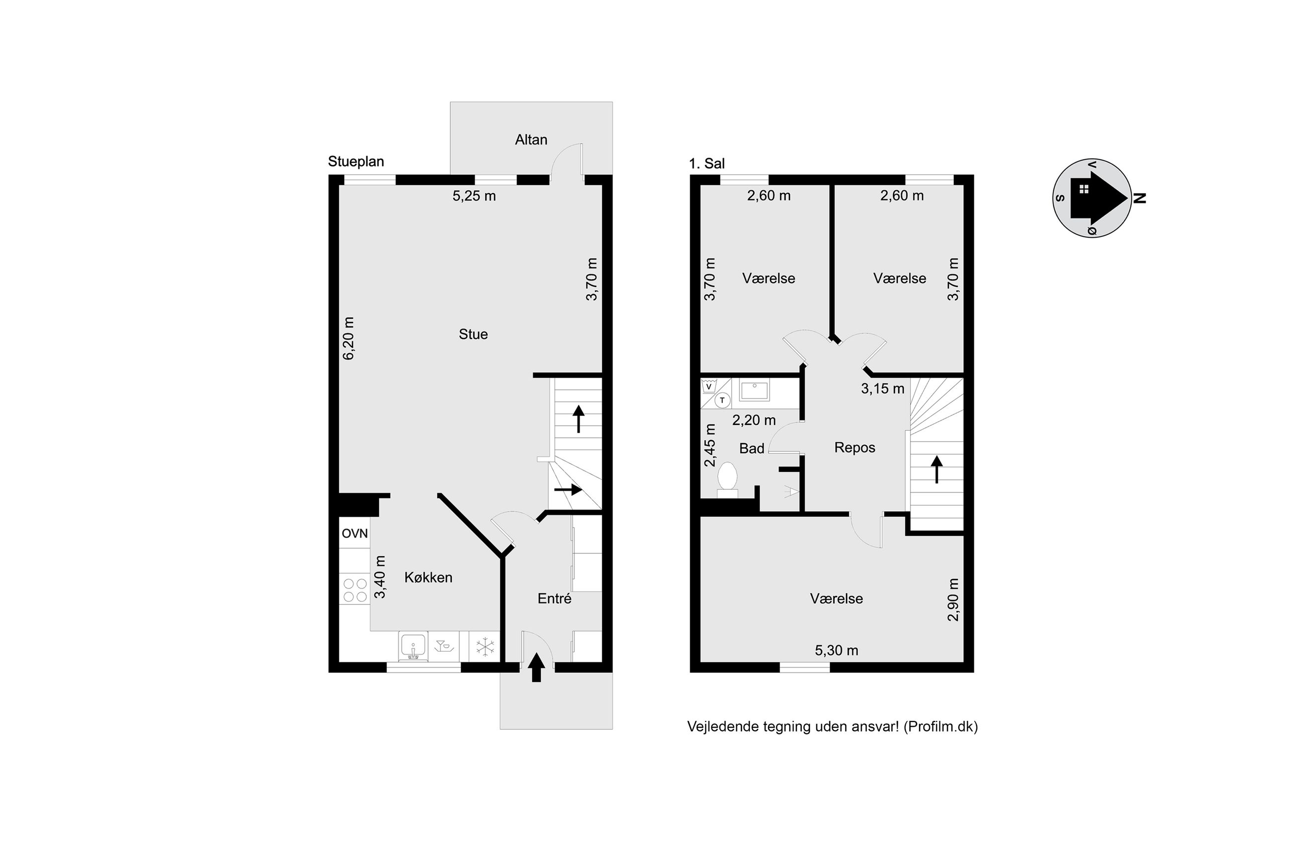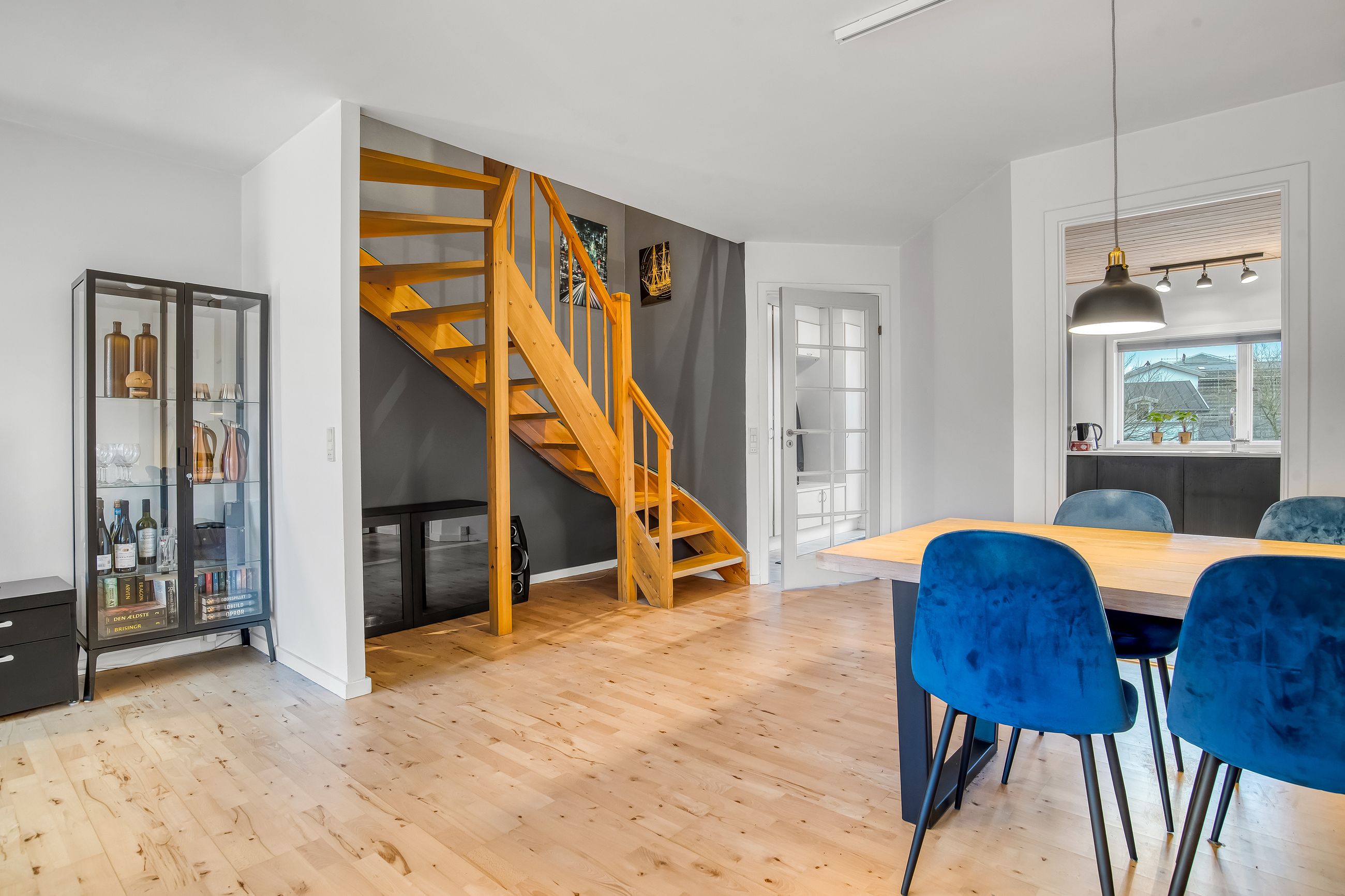 spisestue med udgang til vestvendt altan samt trappe til 1. sal. På 1. salen findes et stort repos, 3 gode værelser - alle