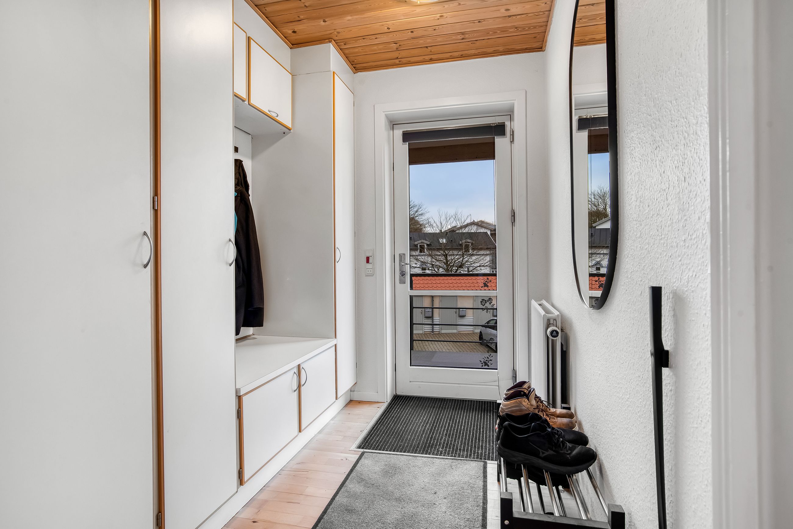 Andelsboligen byder på en entré med skabsplads, et funktionelt køkken i åben forbindelse med lys opholds- og