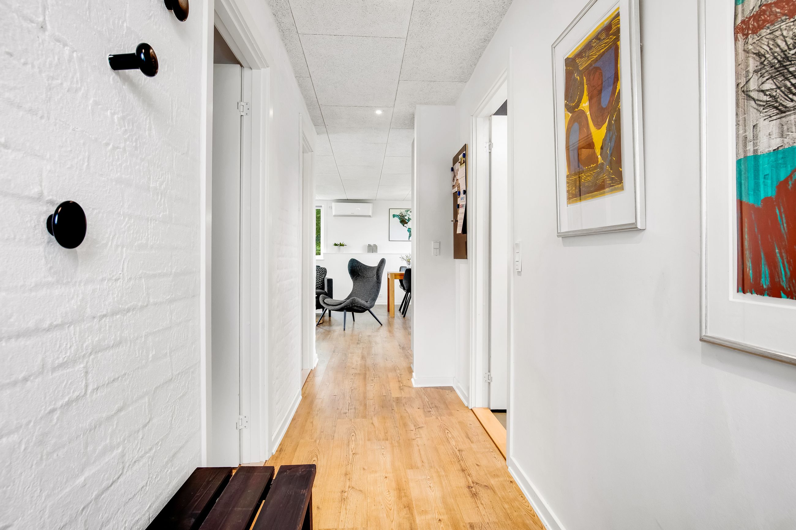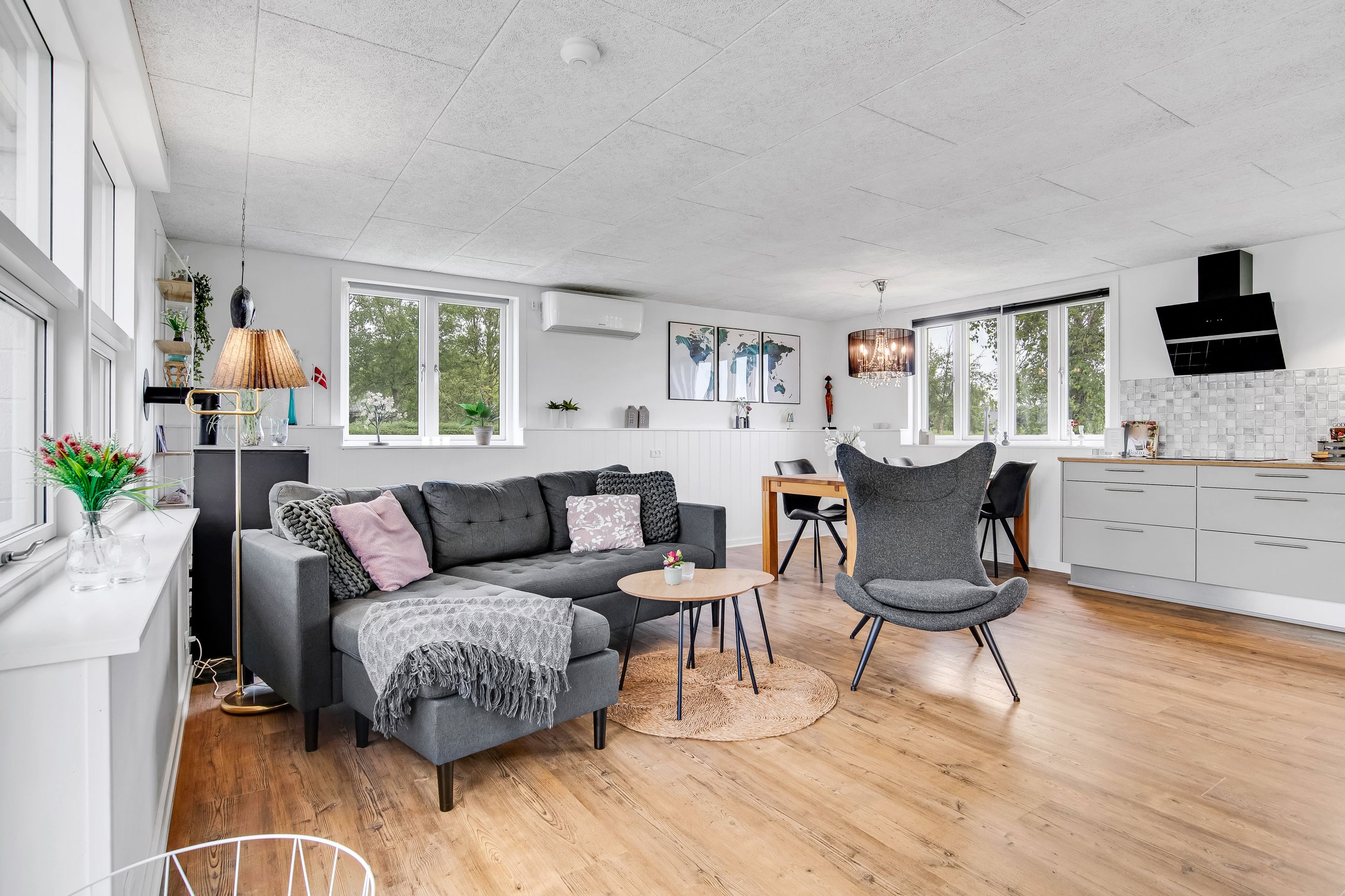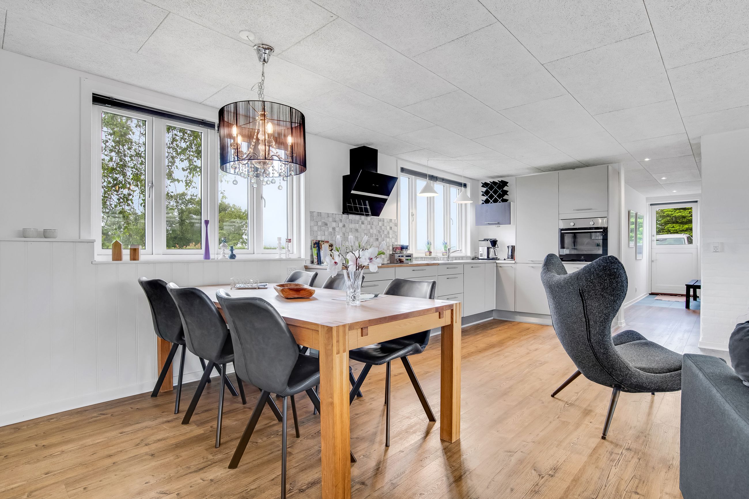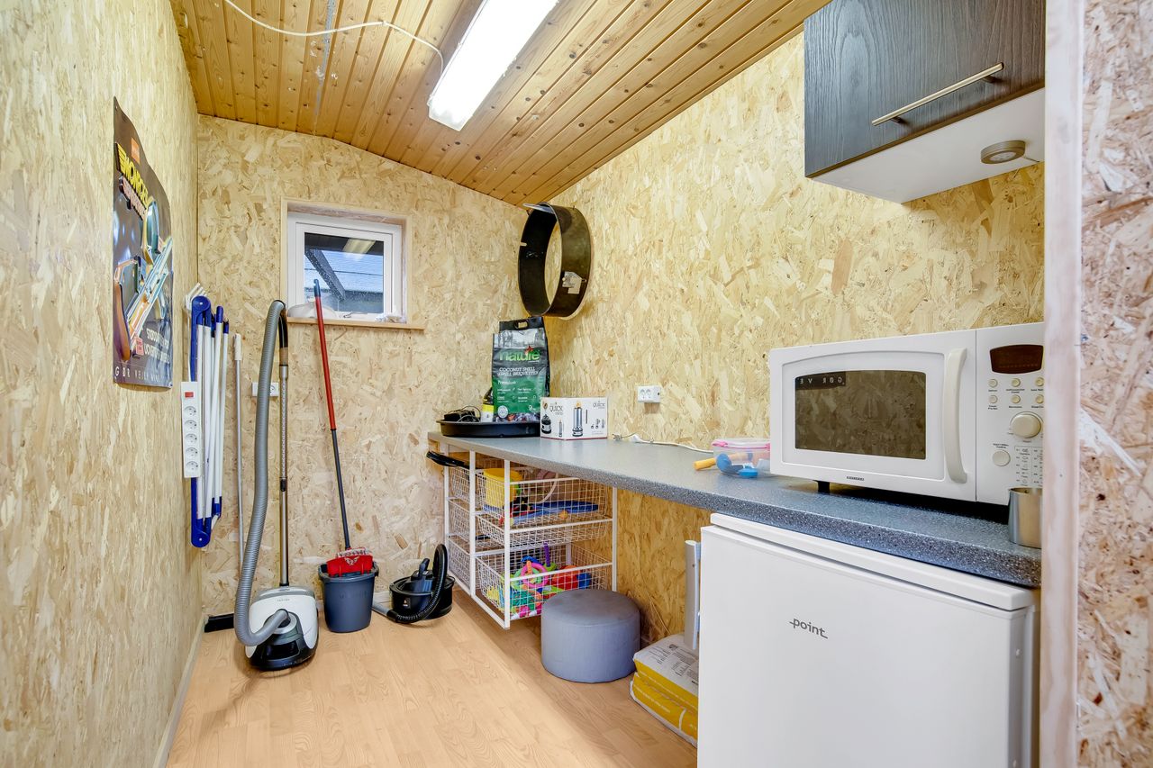 Indretningen er praktisk med entré og fordelingsgang til to hyggelige soveværelser og badeværelse. Det store opholdsrum, hvor stue og køkken/alrum går i ét, er husets naturlige samlingspunkt. Her strømmer lyset ind fra flere sider, og brændeovnen fuldender hyggen på kølige aftener. Derudover er der to disponible rum med adgang udefra, som giver ekstra fleksibilitet.