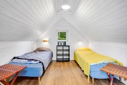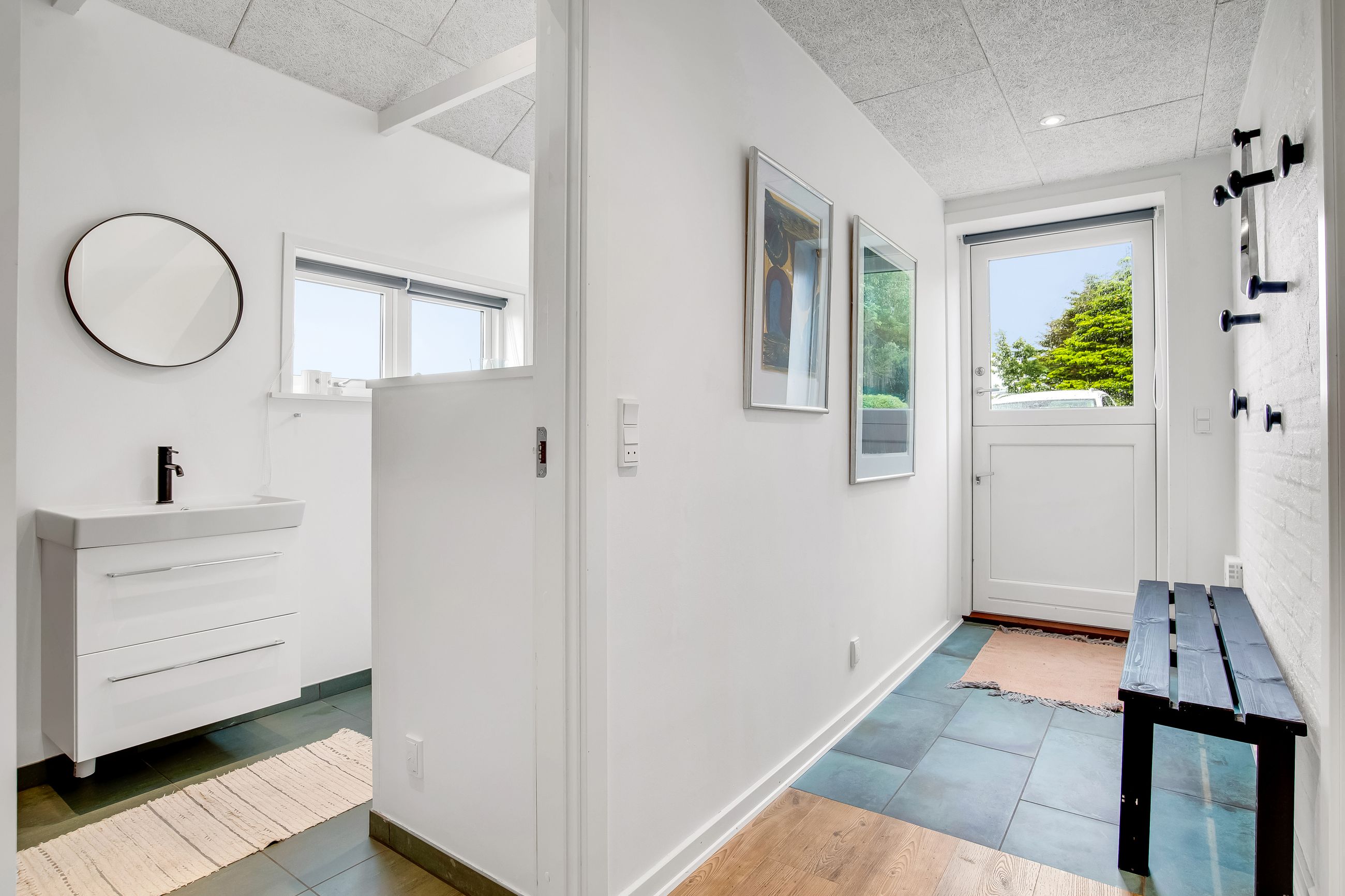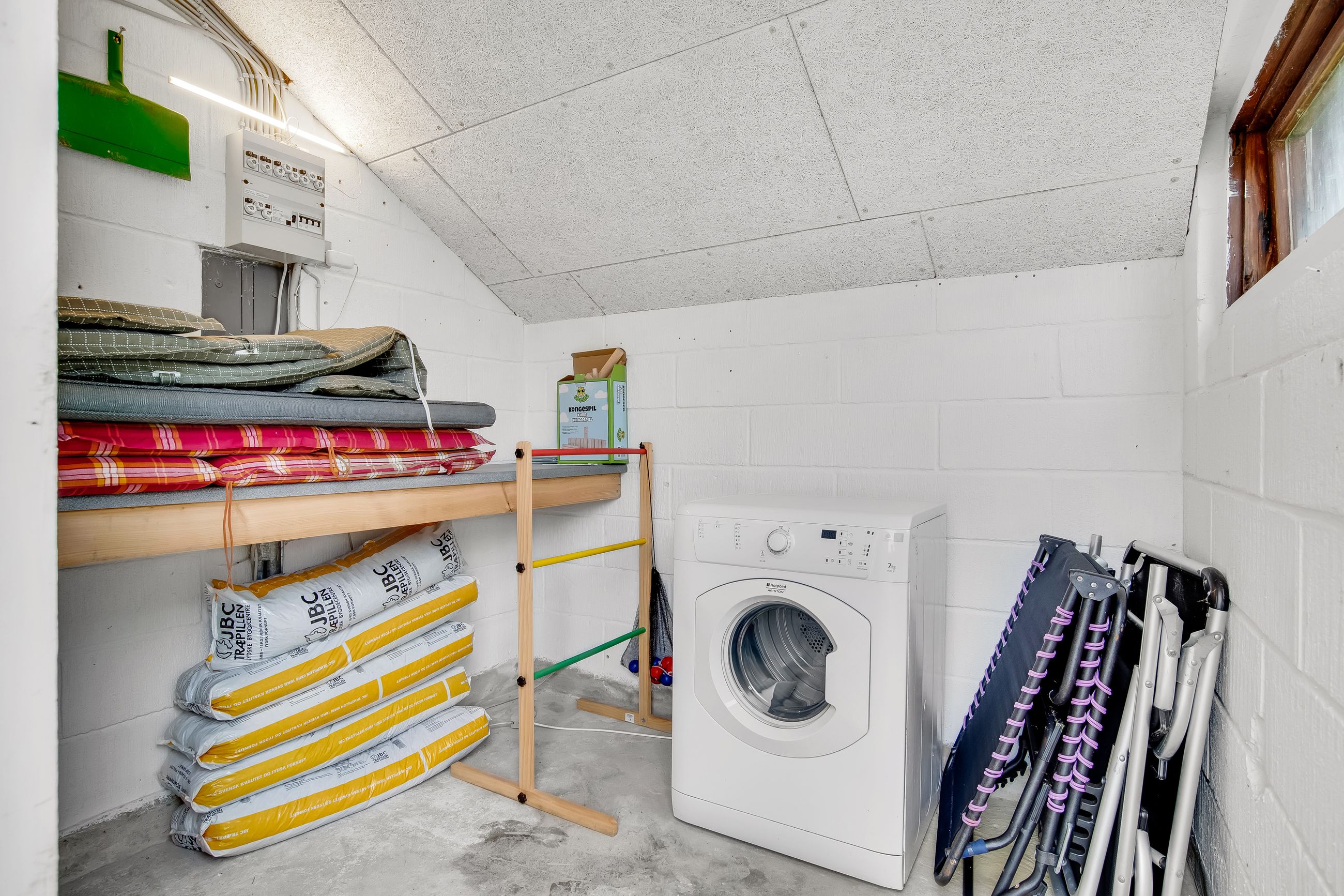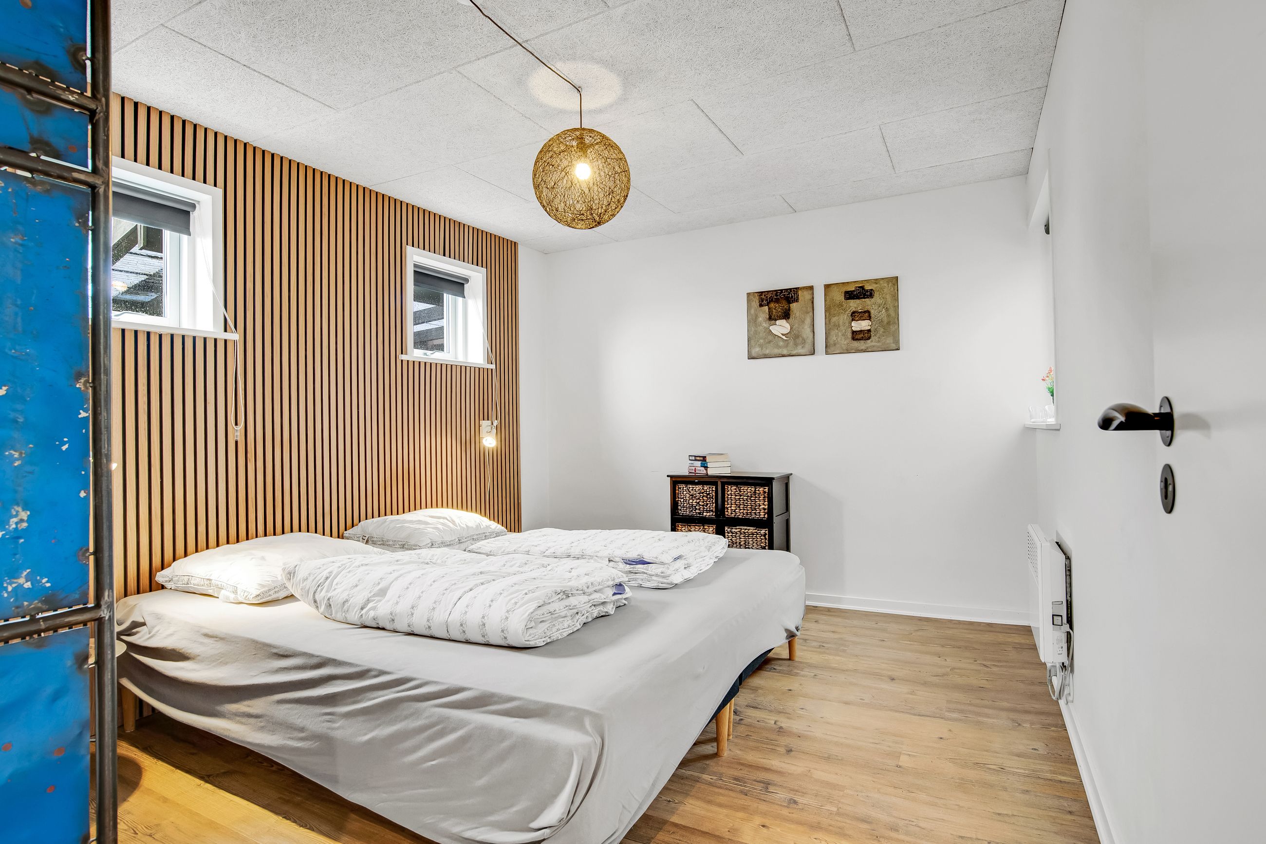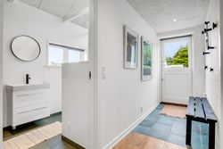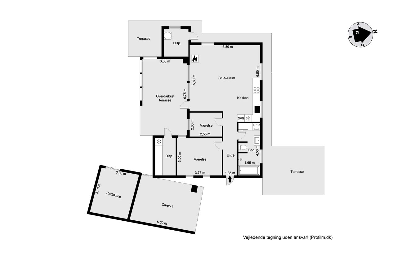 Indretningen er praktisk med entré og fordelingsgang til to hyggelige soveværelser og badeværelse. Det store opholdsrum, hvor stue og køkken/alrum går i ét, er husets naturlige samlingspunkt. Her strømmer lyset ind fra flere sider, og brændeovnen fuldender hyggen på kølige aftener. Derudover er der to disponible rum med adgang udefra, som giver ekstra fleksibilitet.