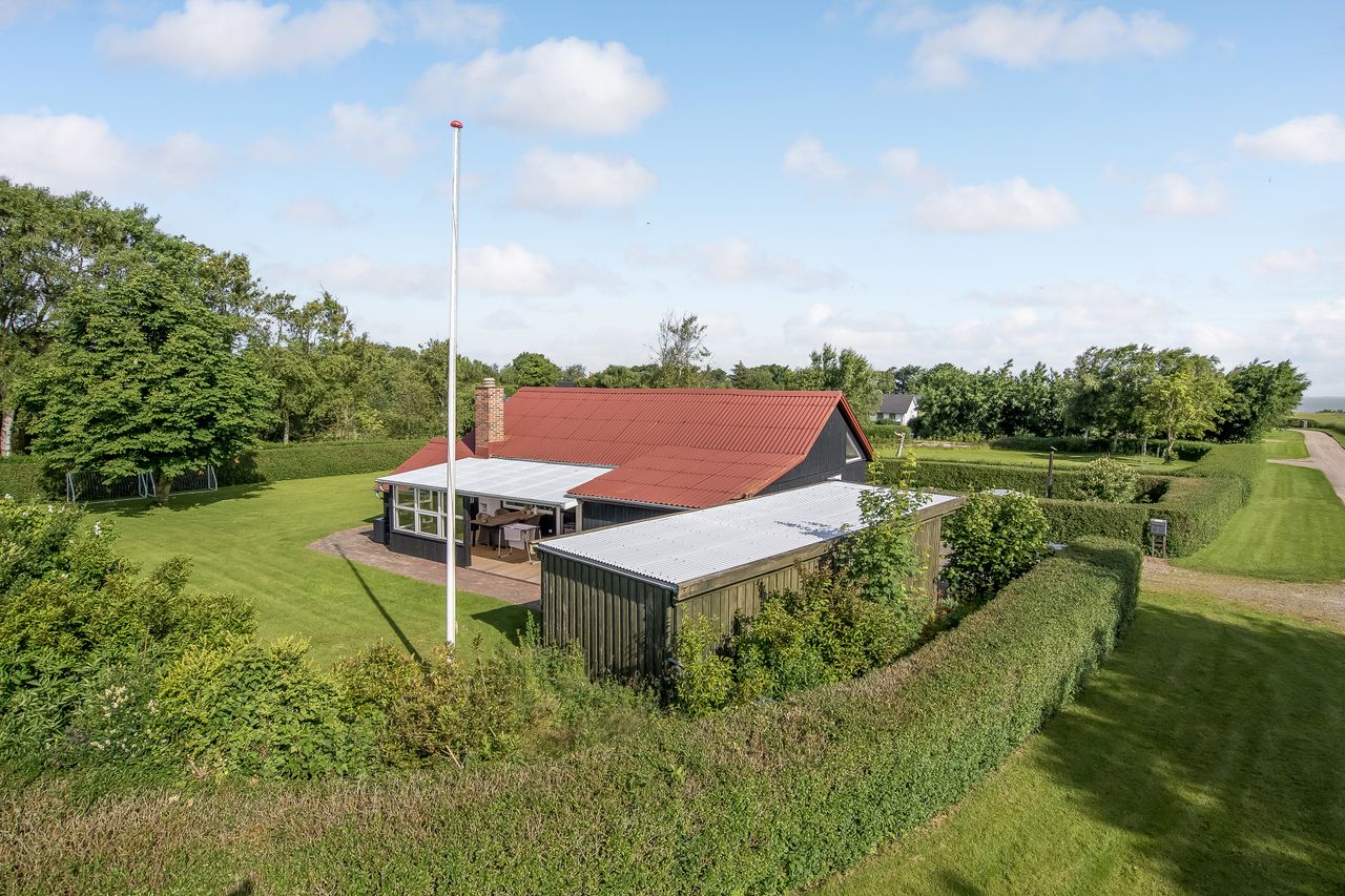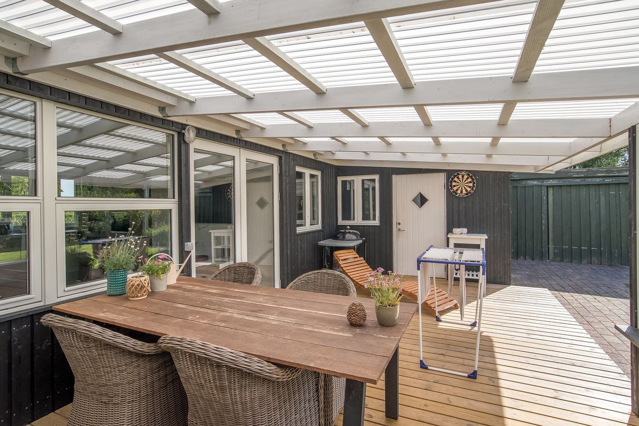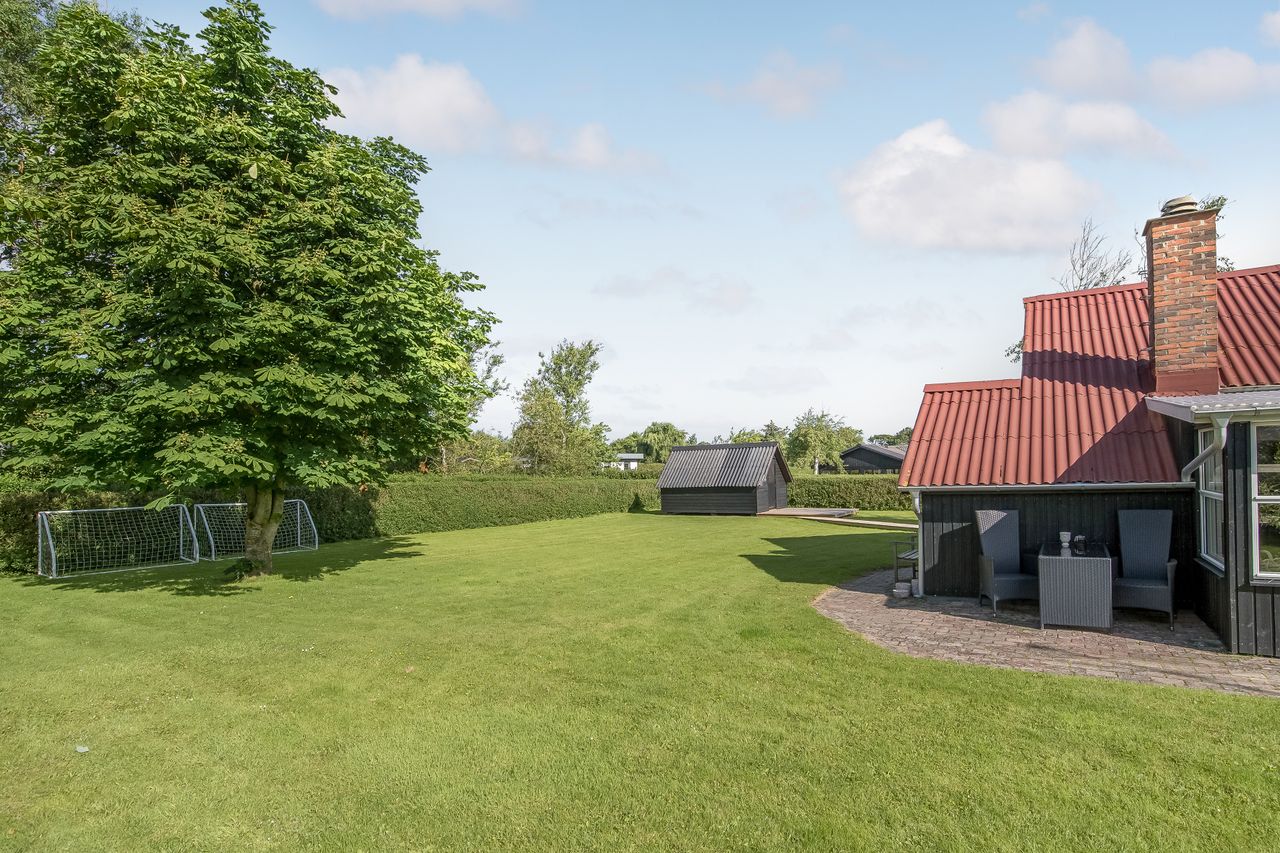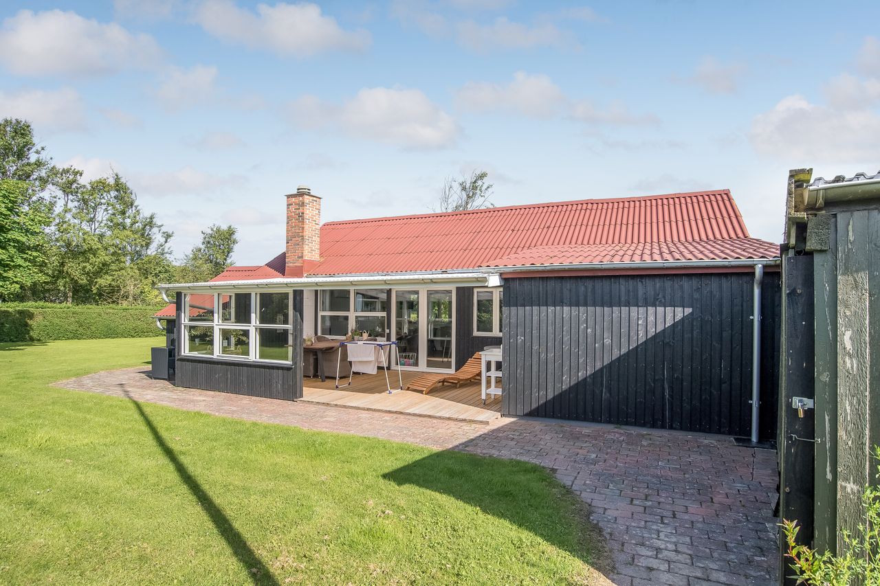 Udenfor er der masser af plads til at nyde ferien i fulde drag. Den sydvestvendte terrasse er delvist overdækket og har direkte udgang fra stuen – perfekt til lange sommeraftener. På nordsiden af huset finder I endnu en rummelig terrasse. Haven er enkel og velplejet, og den store grund inviterer til leg, afslapning og udeliv.