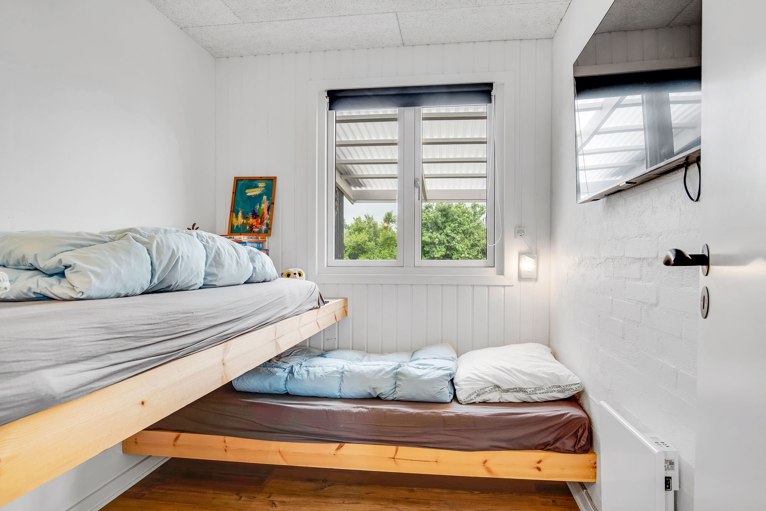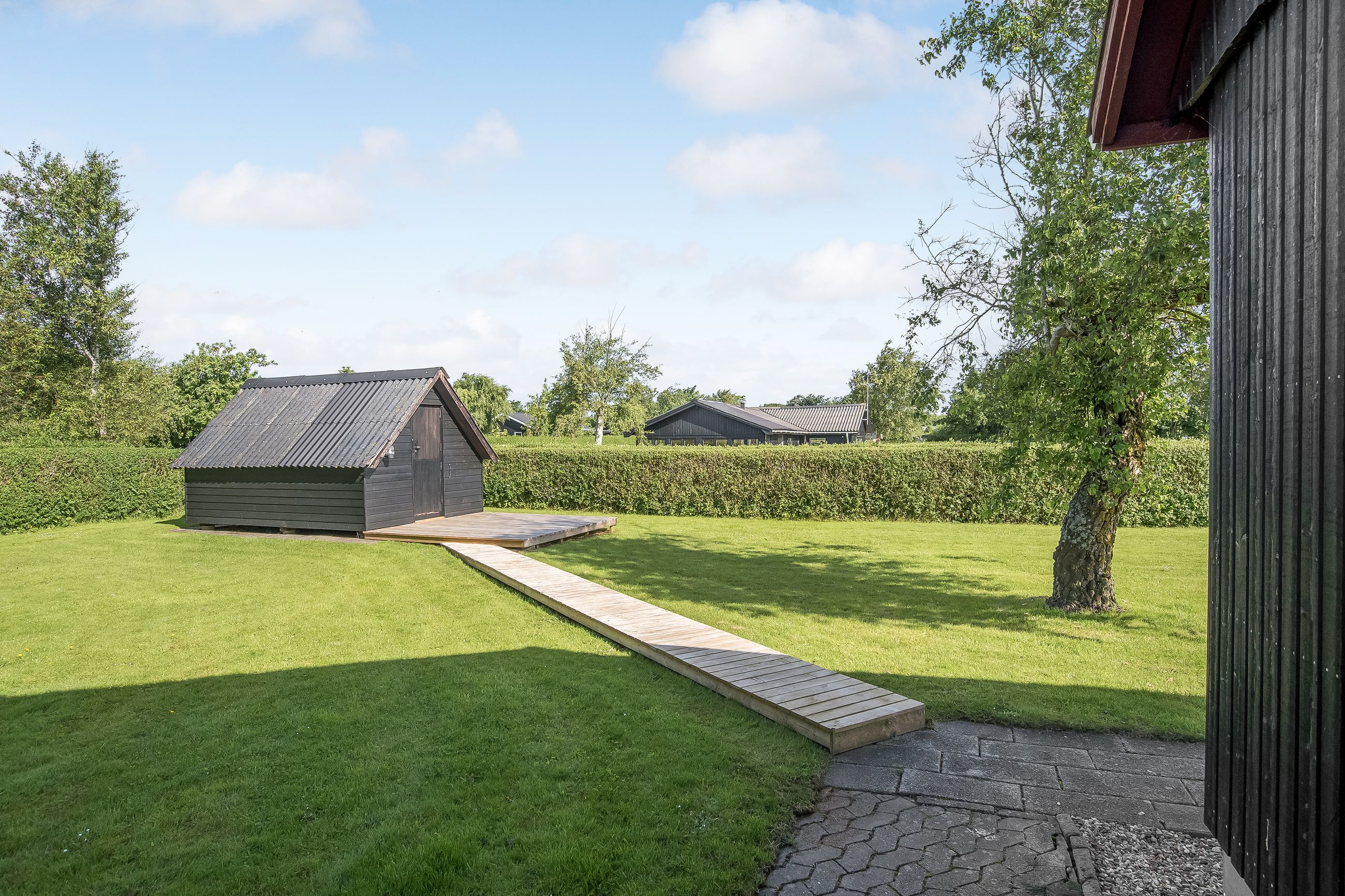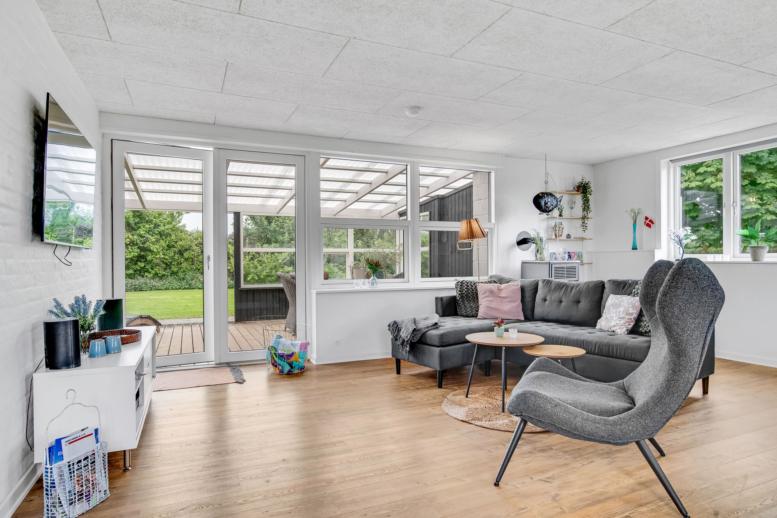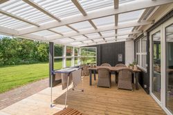 Udenfor er der masser af plads til at nyde ferien i fulde drag. Den sydvestvendte terrasse er delvist overdækket og har direkte udgang fra stuen – perfekt til lange sommeraftener. På nordsiden af huset finder I endnu en rummelig terrasse. Haven er enkel og velplejet, og den store grund inviterer til leg, afslapning og udeliv.