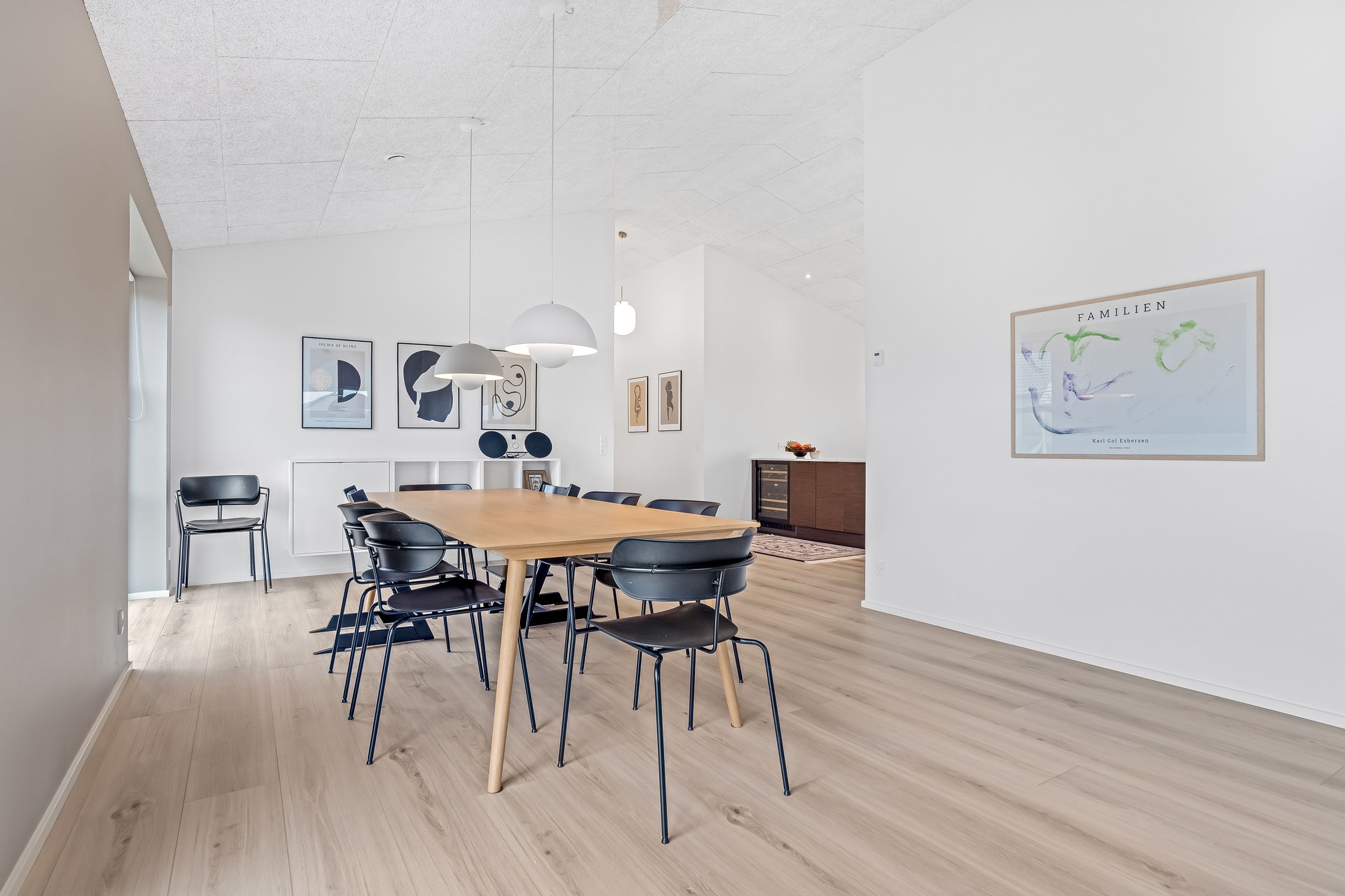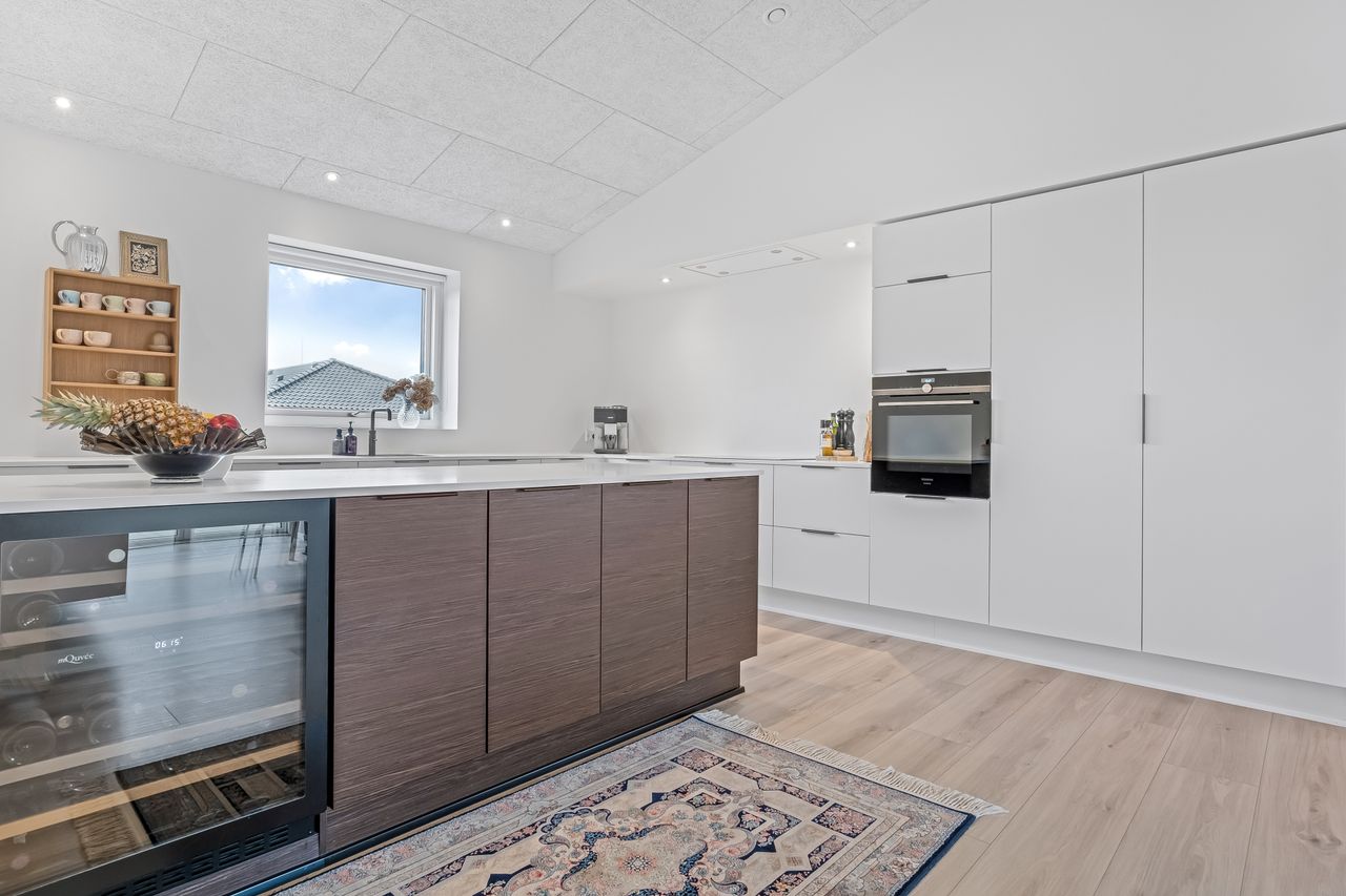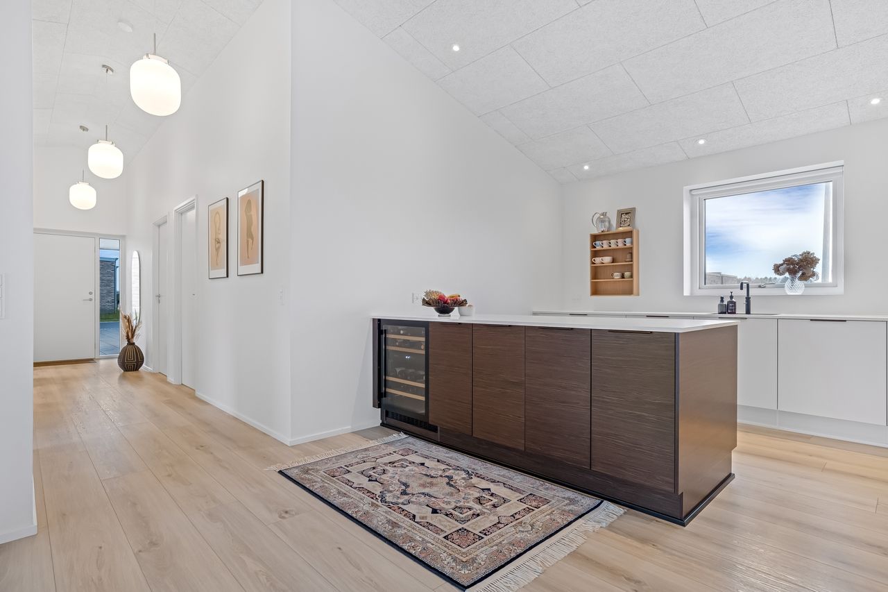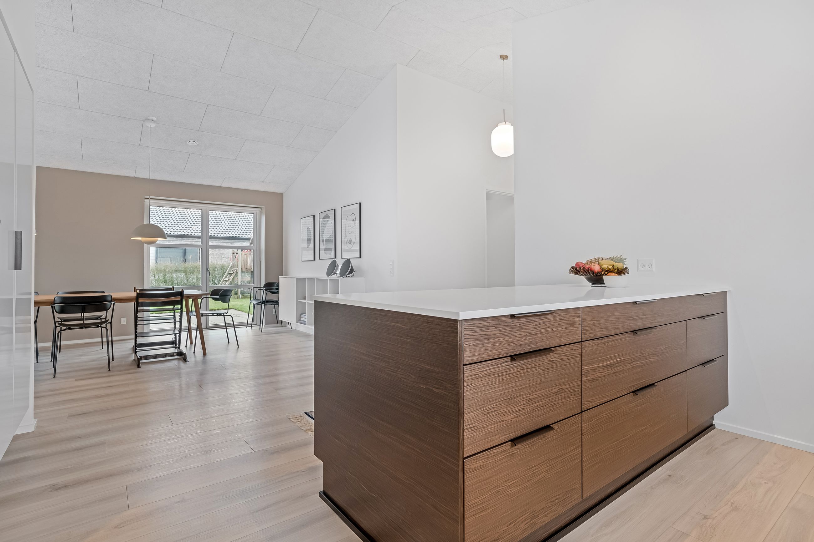 Boligens hjerte er placeret i køkken/alrummet, som udfolder sig i et godt lysindfald og loft til kip. Køkkenet, som er fra HTH, er bl.a. indrettet med stor ø, som fungerer som den naturlige opdeling mellem køkken og alrum. Alrummet fortsætter i direkte forlængelse til stuen, og der er derfor tale om en rigtig "samtalebolig" med rig mulighed for større selskaber.
