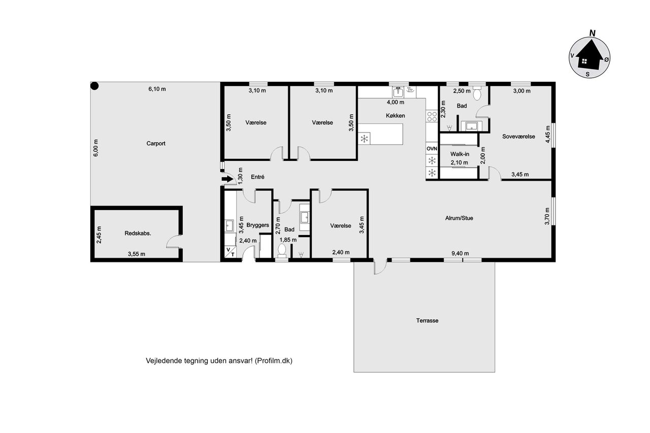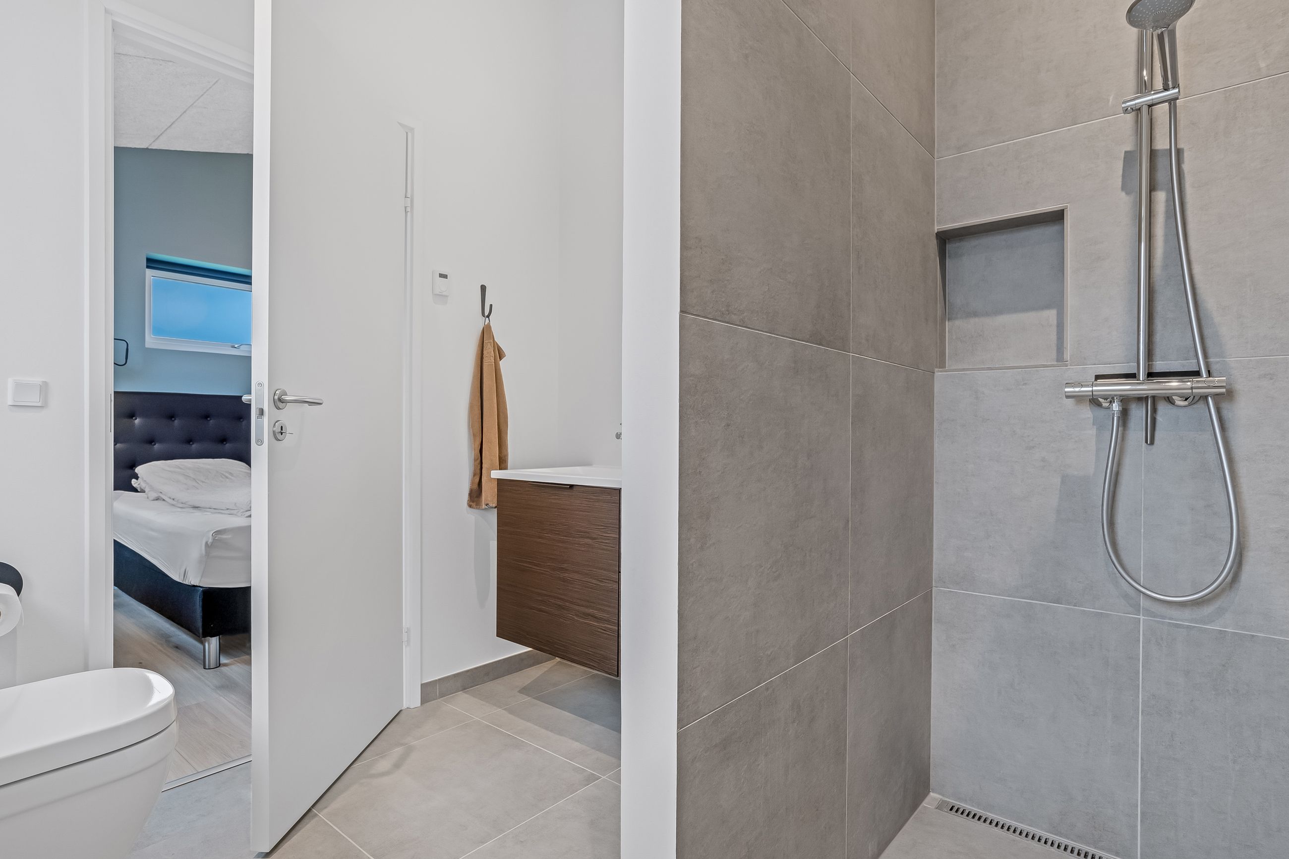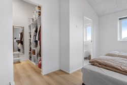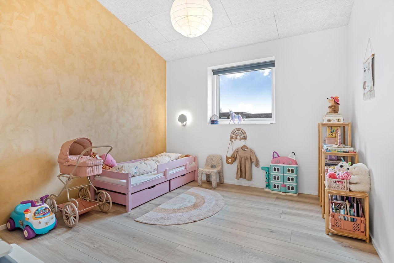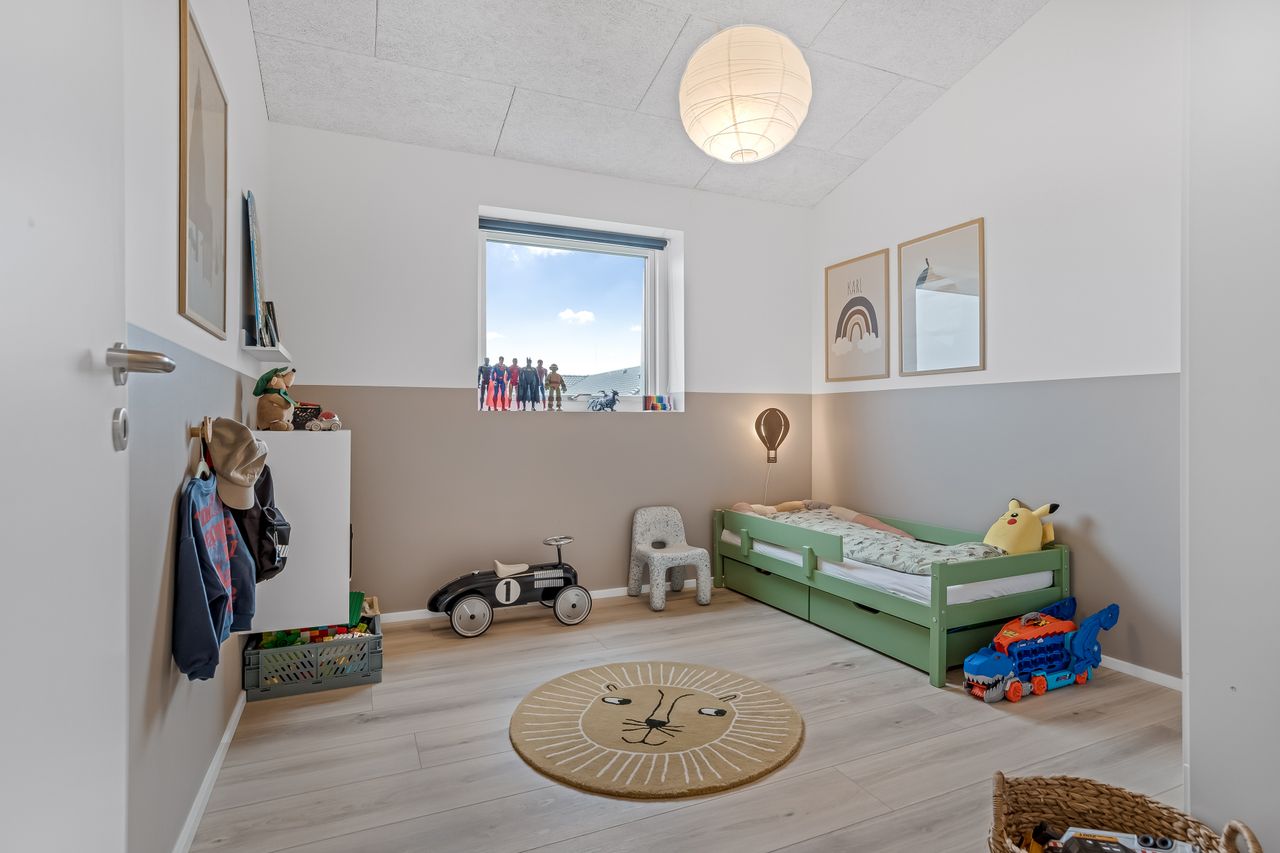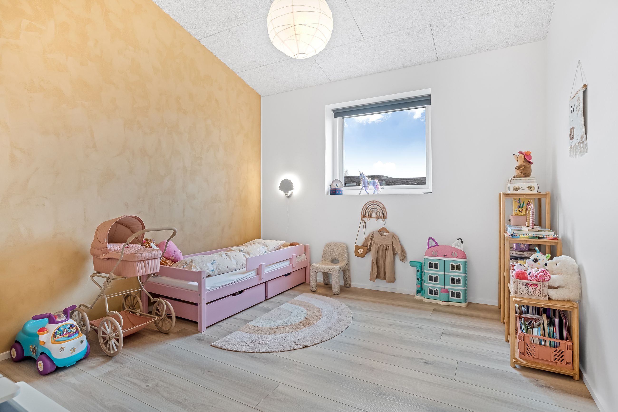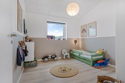 Værelsesafdelingen ligger i sammenhæng med entreens fordelingsgang og rummer 3 værelser gode og hyggelige værelser, rummeligt bryggers med egen udgang til have samt et flot badeværelse.