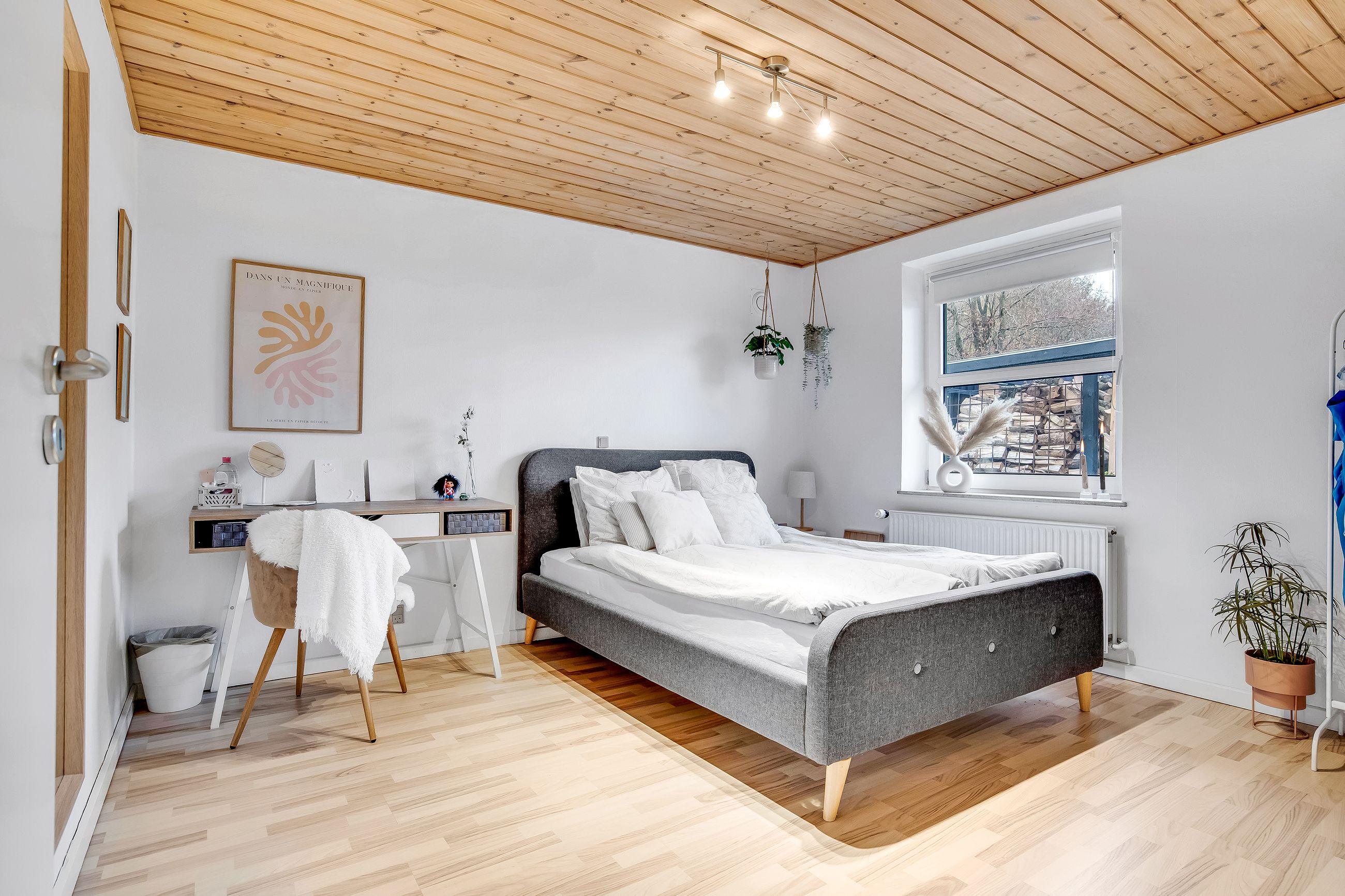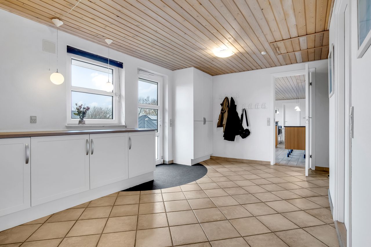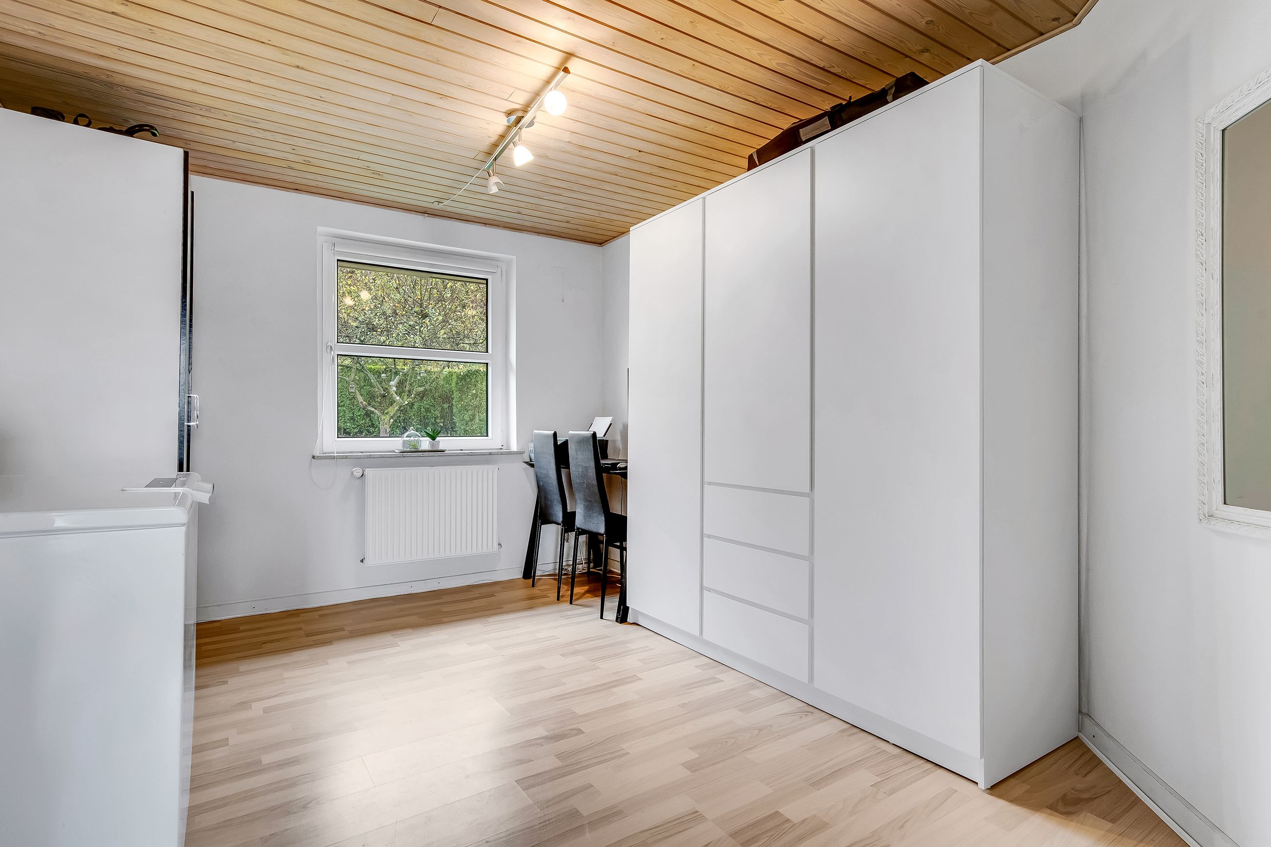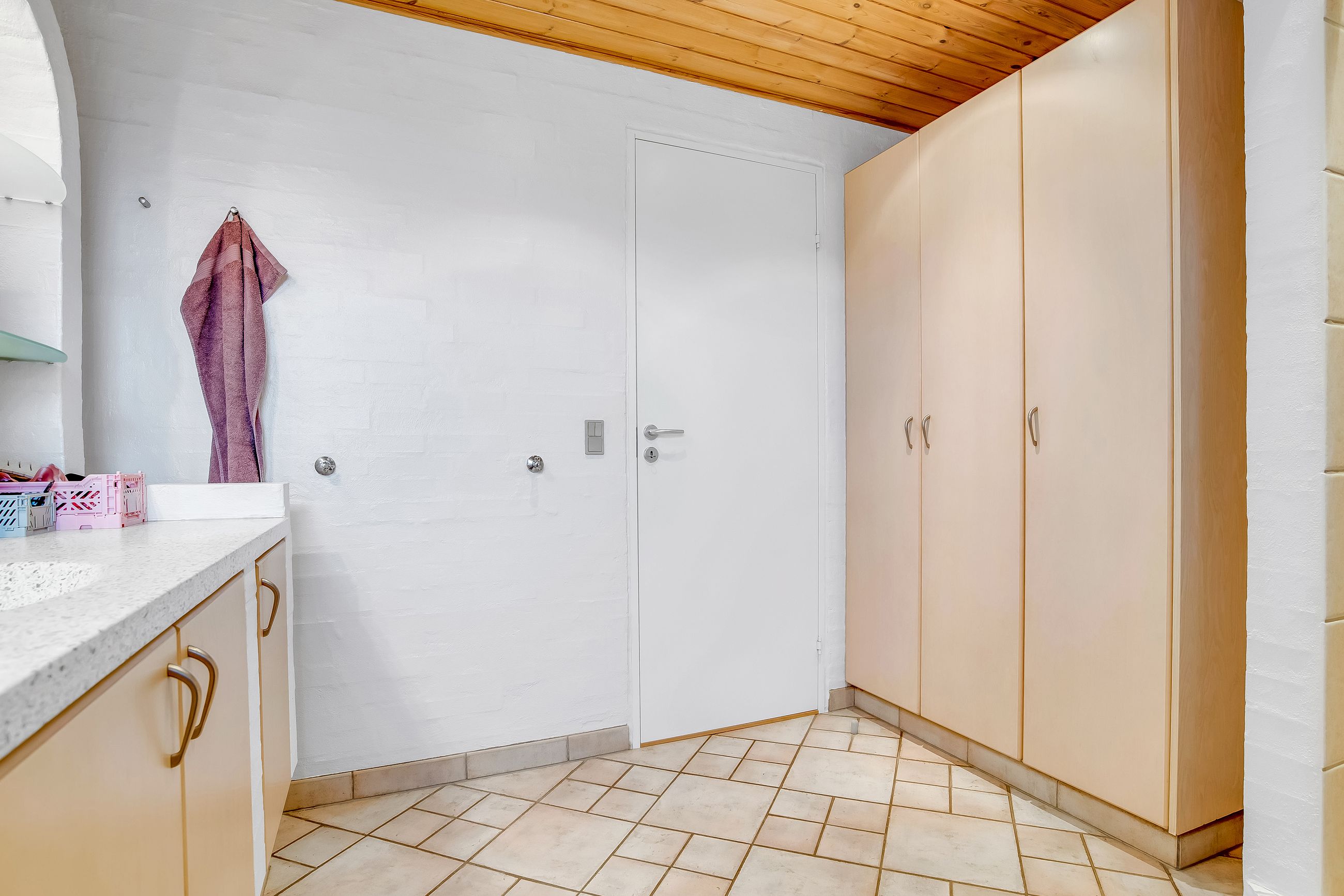 Huset byder velkommen i en stor entré, der er kombineret med et praktisk bryggers med vaskefaciliteter og god opbevaringsplads. I den vestlige ende af boligen fører en fordelingsgang til et badeværelse og fire rummelige værelser, hvoraf det ene har direkte udgang til haven – perfekt som børne- eller gæsteværelse.