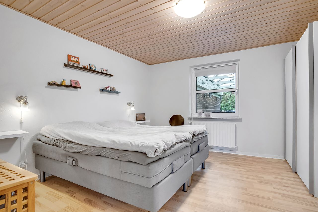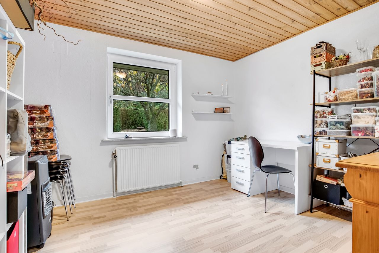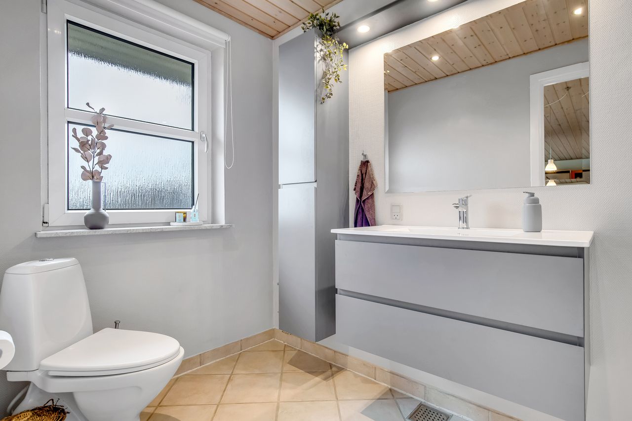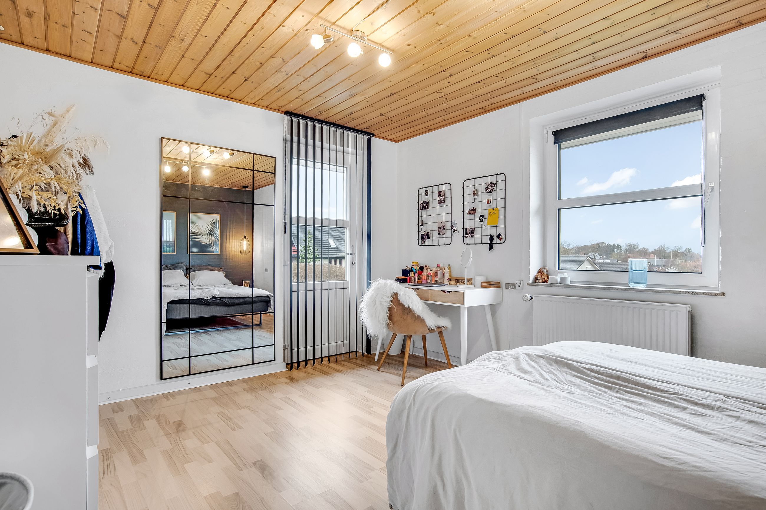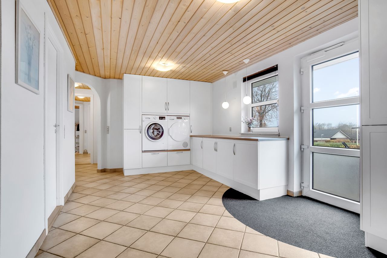 Huset byder velkommen i en stor entré, der er kombineret med et praktisk bryggers med vaskefaciliteter og god opbevaringsplads. I den vestlige ende af boligen fører en fordelingsgang til et badeværelse og fire rummelige værelser, hvoraf det ene har direkte udgang til haven – perfekt som børne- eller gæsteværelse.