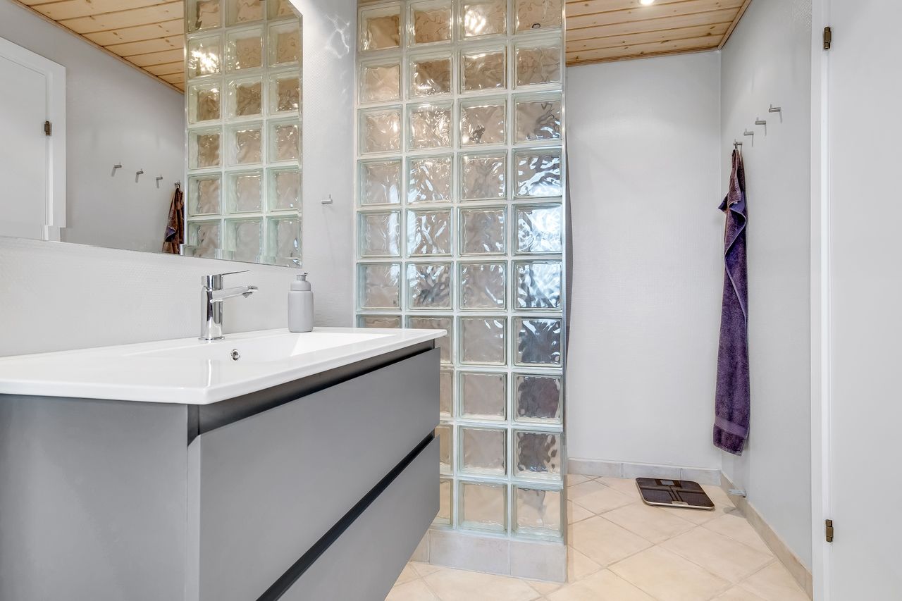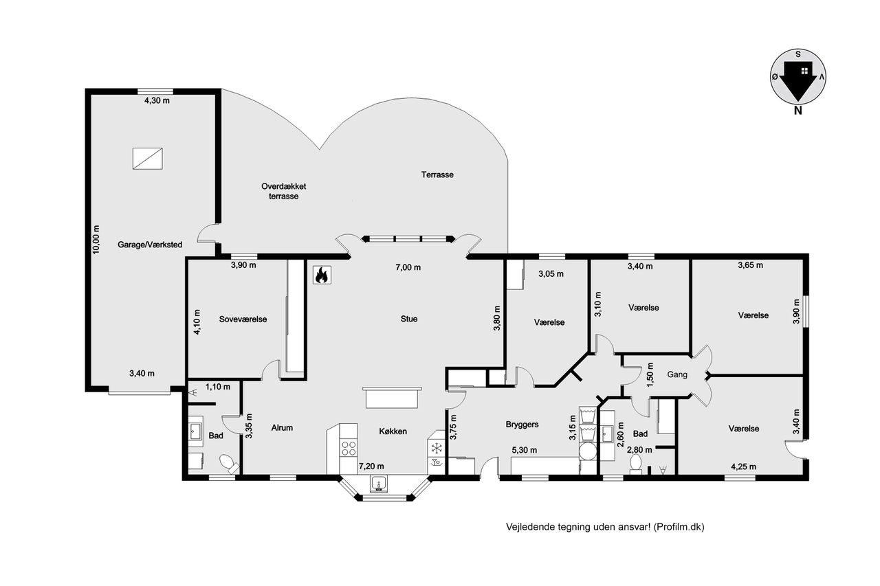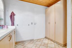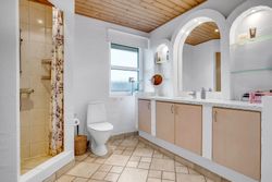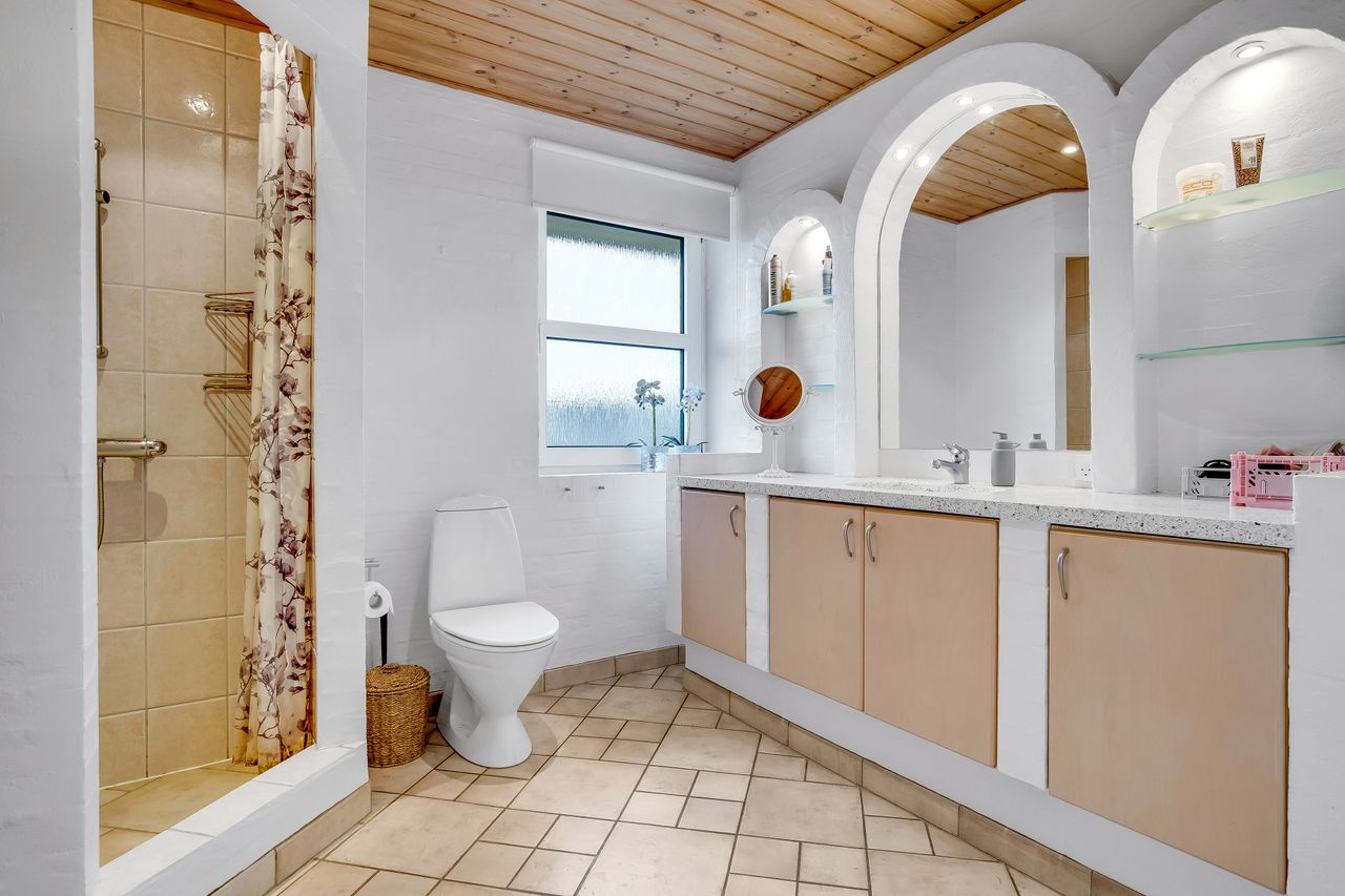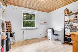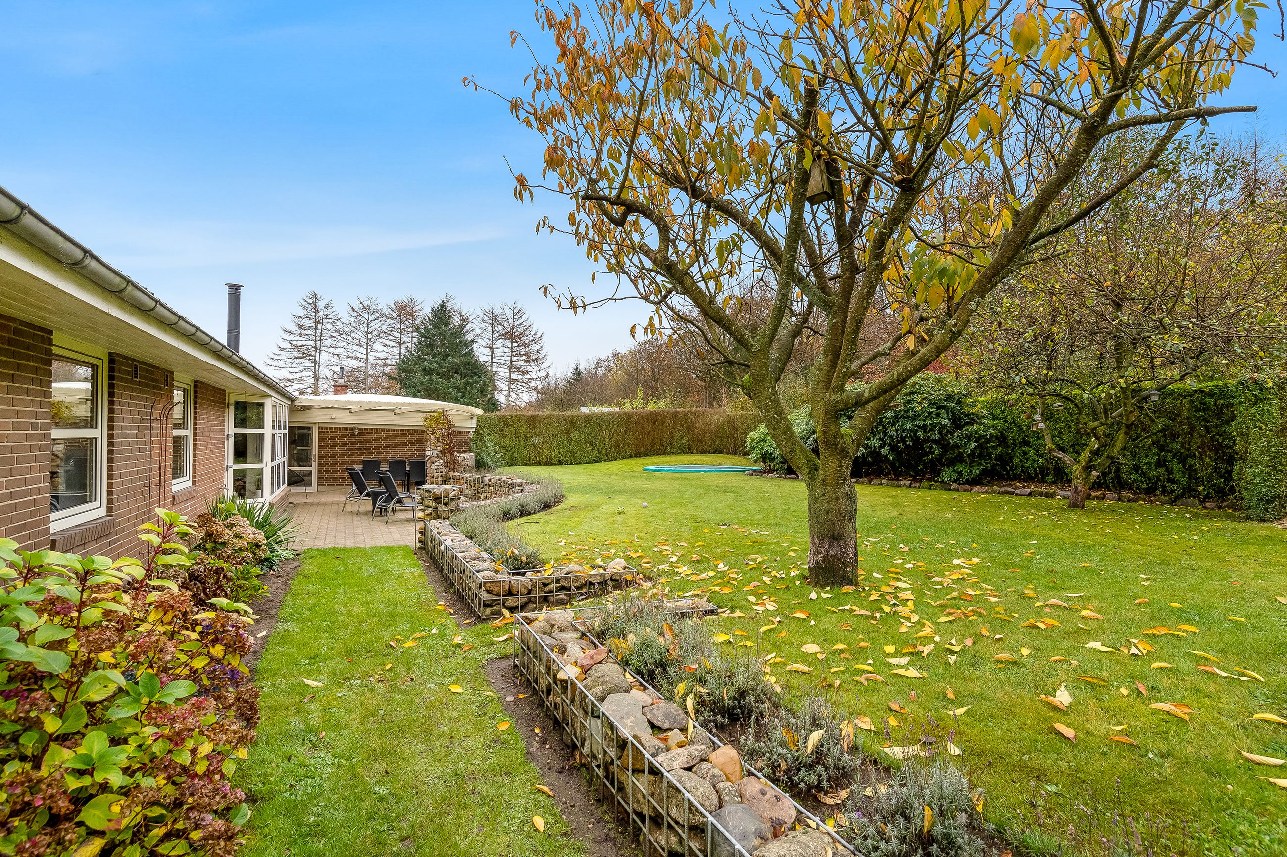 Huset byder velkommen i en stor entré, der er kombineret med et praktisk bryggers med vaskefaciliteter og god opbevaringsplads. I den vestlige ende af boligen fører en fordelingsgang til et badeværelse og fire rummelige værelser, hvoraf det ene har direkte udgang til haven – perfekt som børne- eller gæsteværelse.