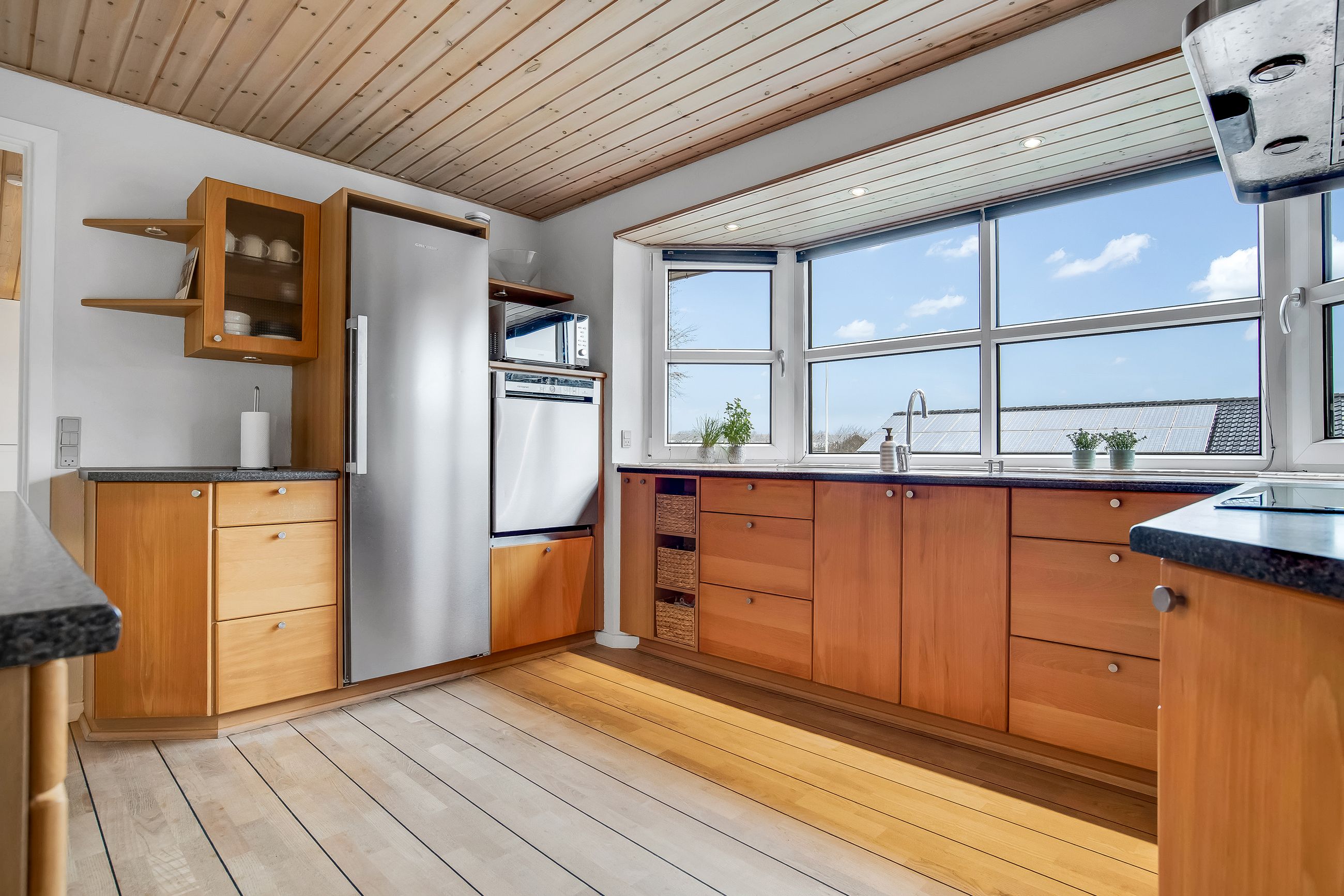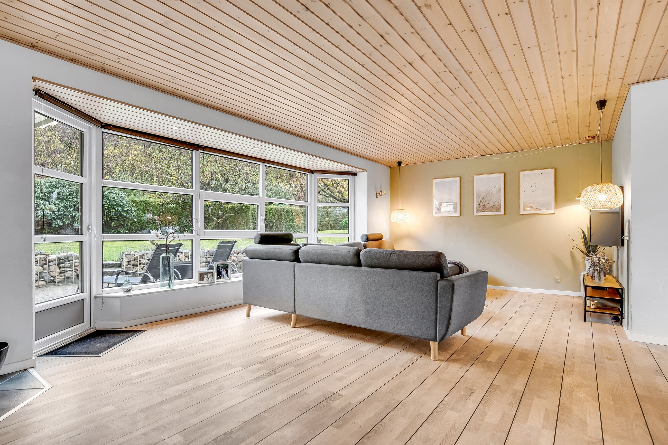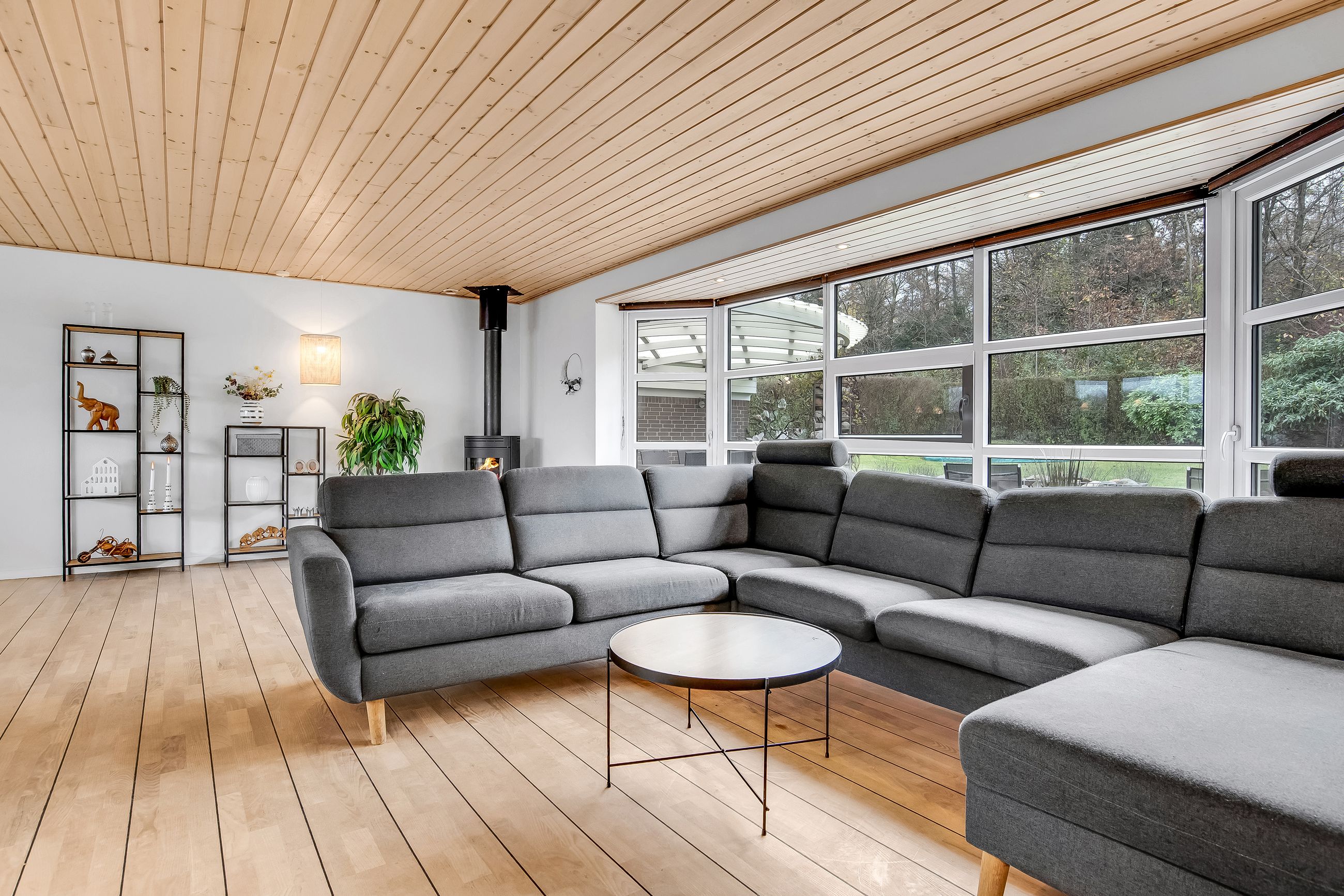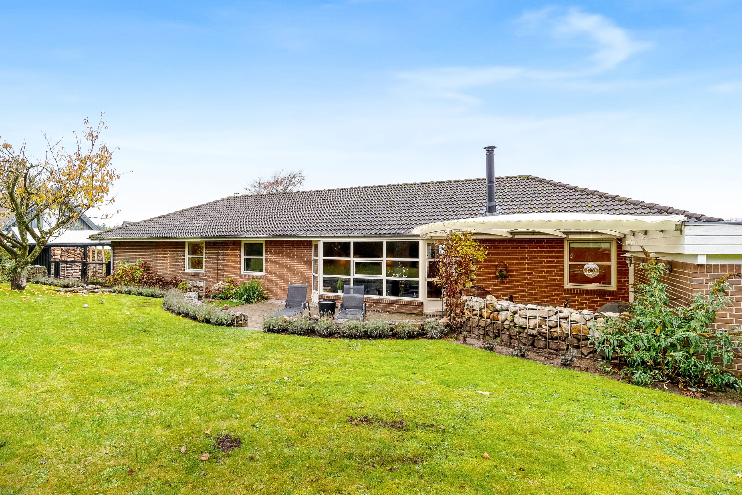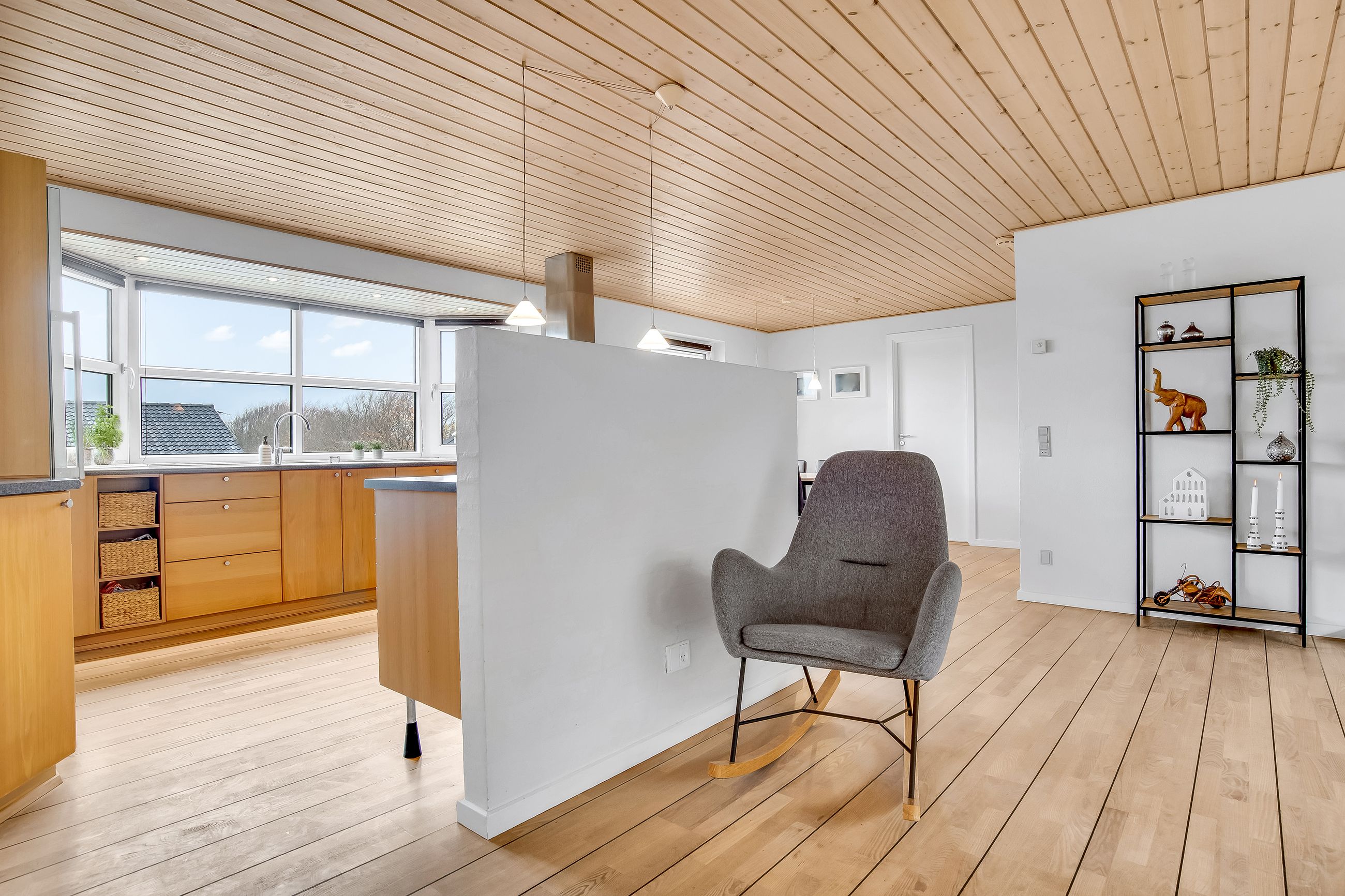 Husets hjerte er det lyse og indbydende køkken/alrum og stue, som smelter sammen i ét stort opholdsrum. Her strømmer dagslyset ind gennem vinduerne, mens den nyere, hyggelige brændeovn sætter stemningen. Fra stuen er der direkte adgang til en delvist overdækket terrasse, der forlænger ude- og indelivet. Haven er stor og ugeneret med god plads til leg og aktiviteter.