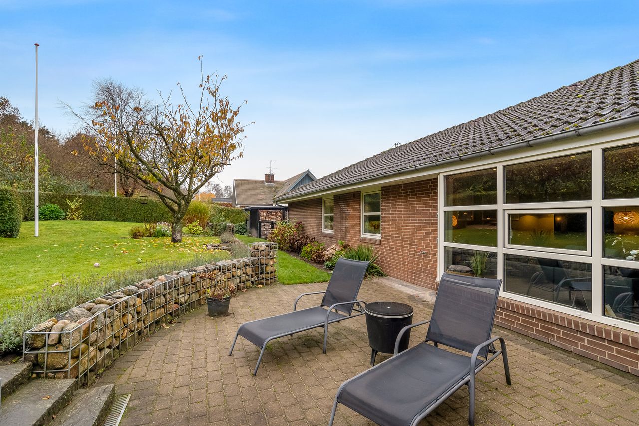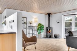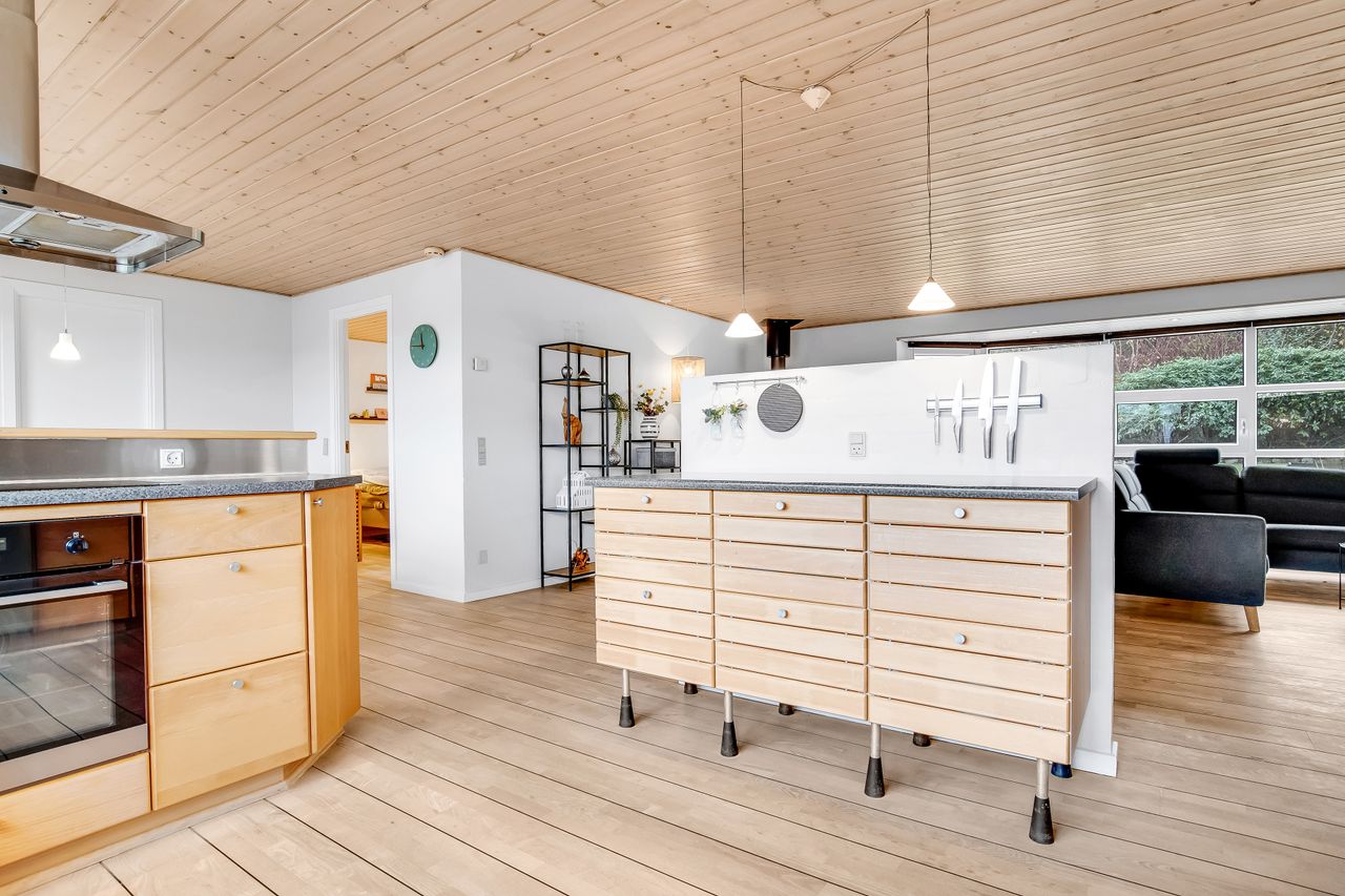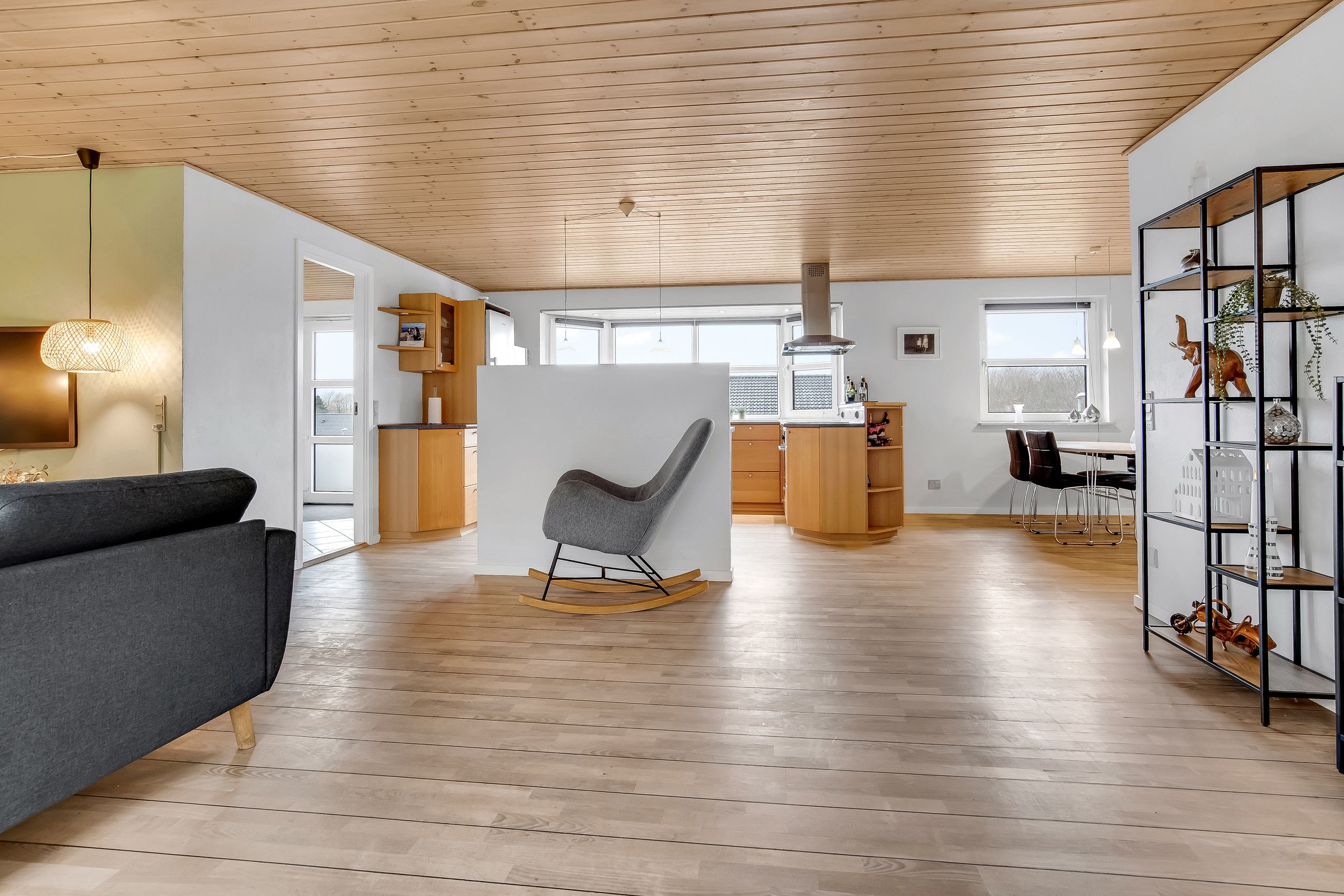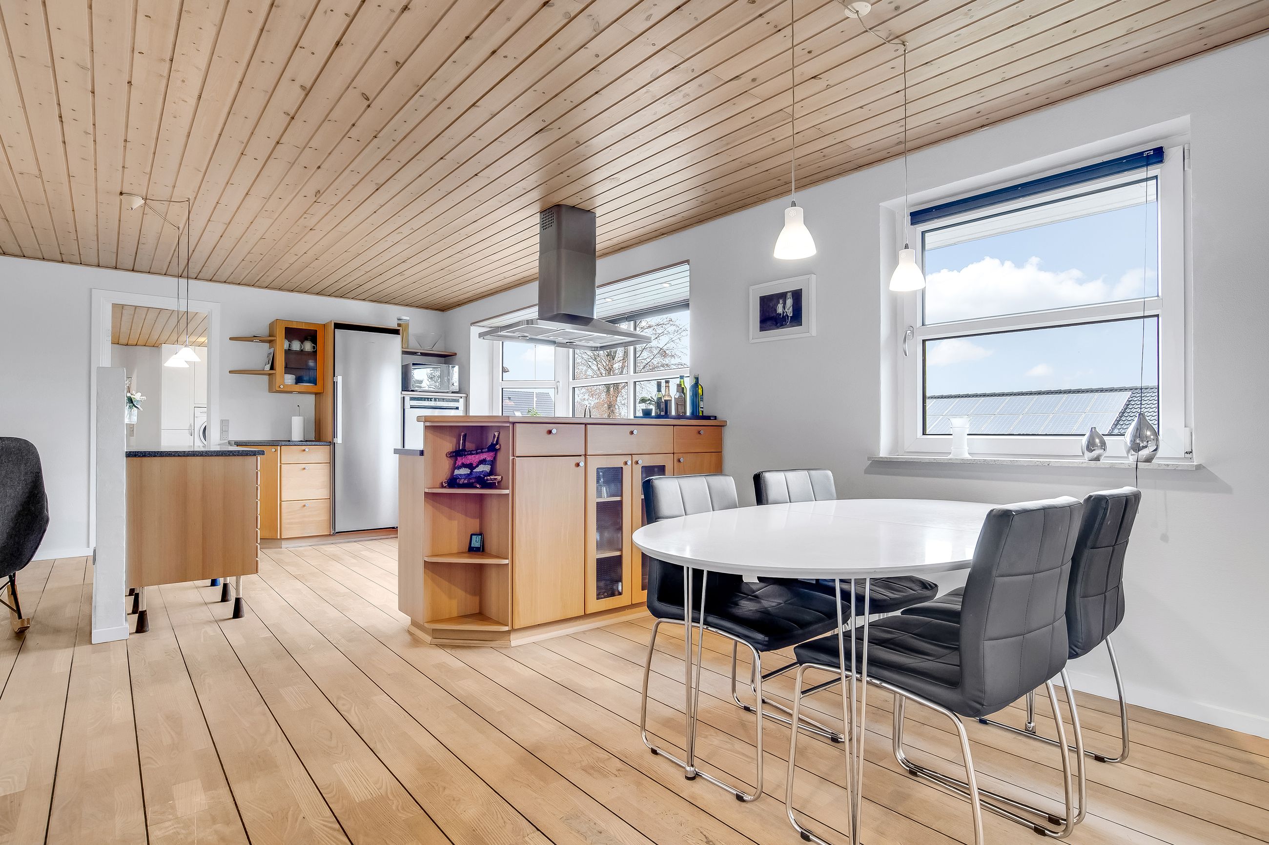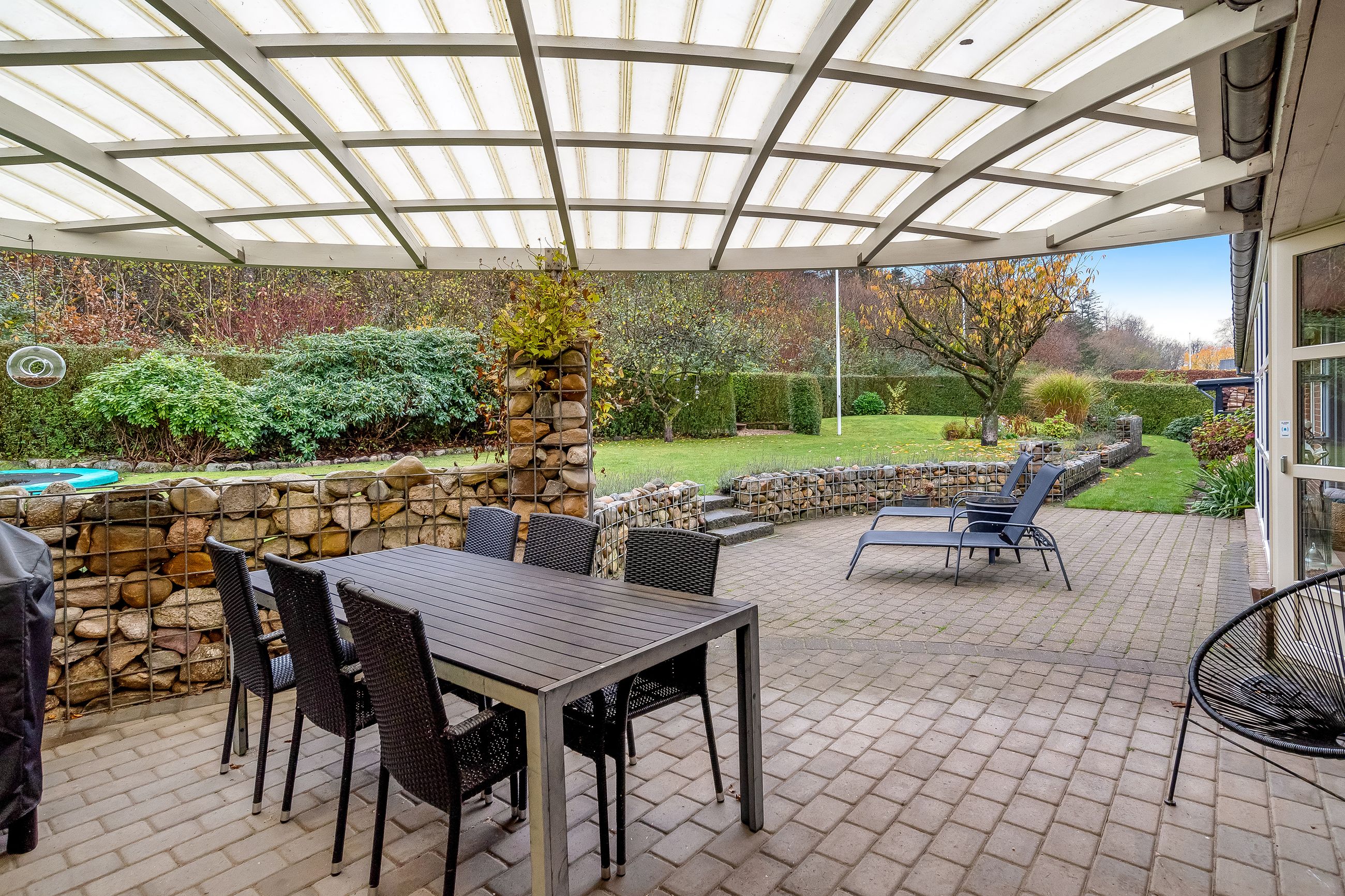 Husets hjerte er det lyse og indbydende køkken/alrum og stue, som smelter sammen i ét stort opholdsrum. Her strømmer dagslyset ind gennem vinduerne, mens den nyere, hyggelige brændeovn sætter stemningen. Fra stuen er der direkte adgang til en delvist overdækket terrasse, der forlænger ude- og indelivet. Haven er stor og ugeneret med god plads til leg og aktiviteter.