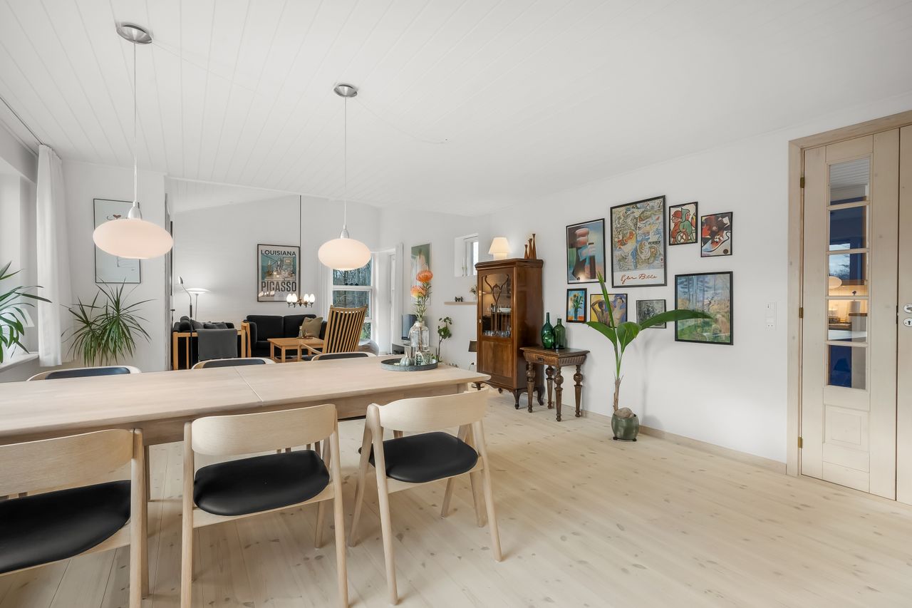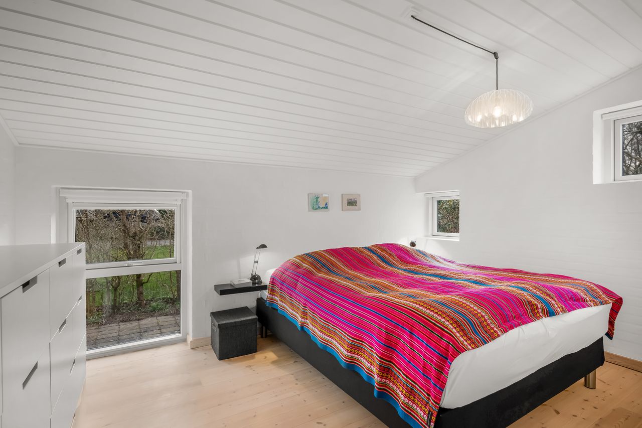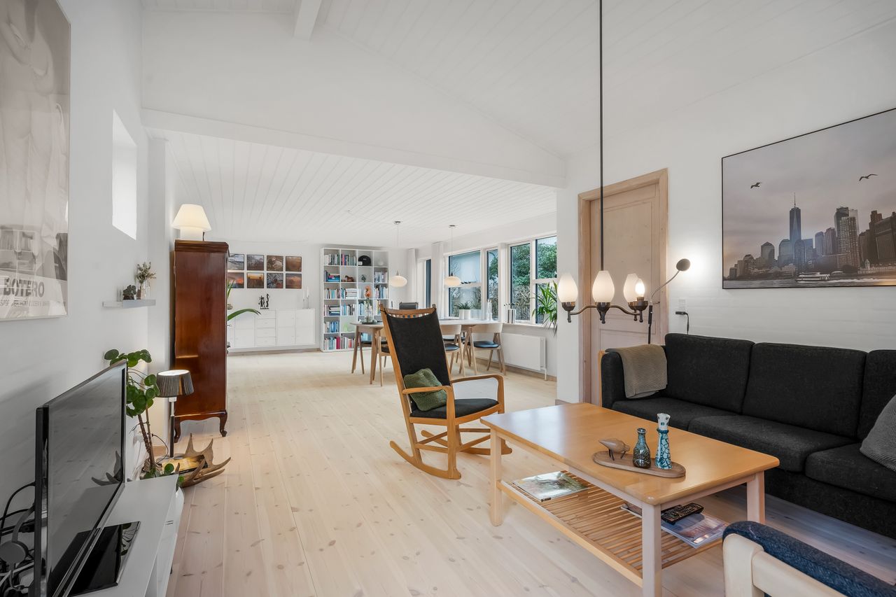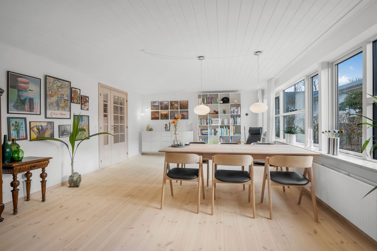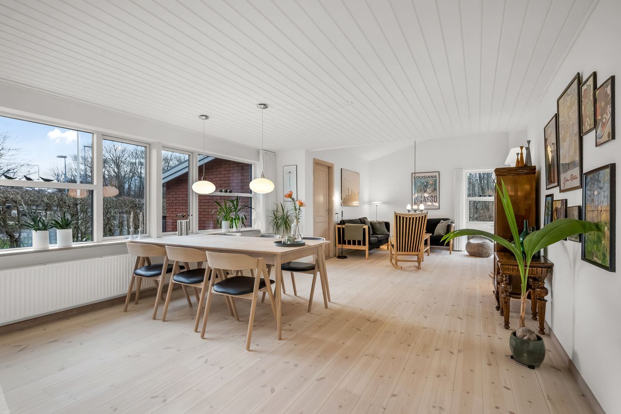 I alt 150 m2 bolig med rummelig entre, hvorfra der er adgang til 2 af husets i alt 4 regulære værelser. De 2 smagfulde badeværelser (heraf det ene med praktisk vaskesøjle) er holdt i samme stil med hvidt inventar og fine, cremefarvede klinker. Køkken med inventar holdt i en flot koboltblå farve, og så er der den skønneste spisekrog, hvor lyset bare strømmer ind. Fransk dør til stor lys opholdsstue med smukt fyrretræsgulv og detaljer som delvise lofter til kip fra husets ”fødsel”. En detalje, som ses flere steder i huset.