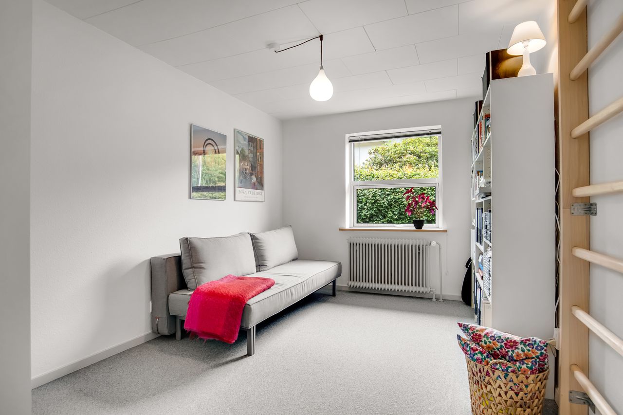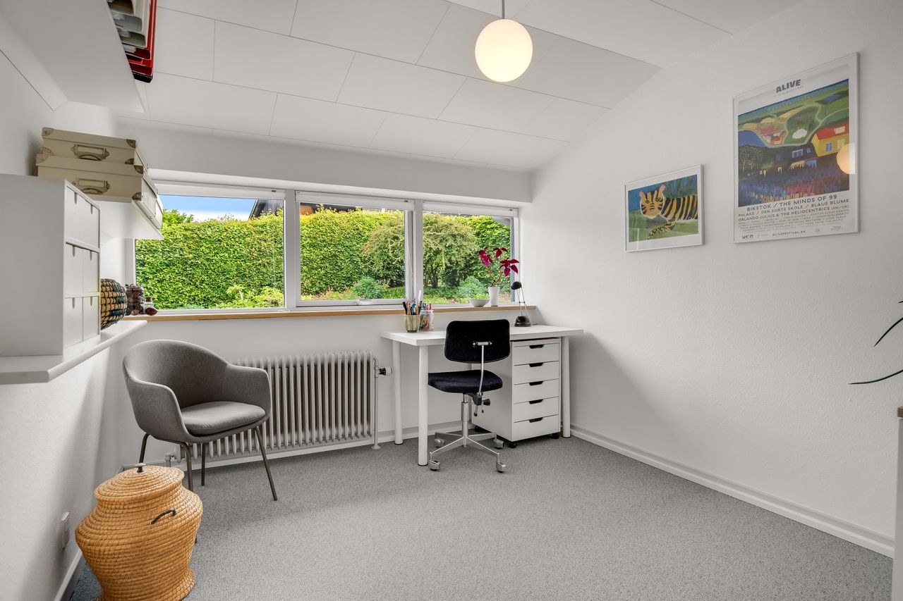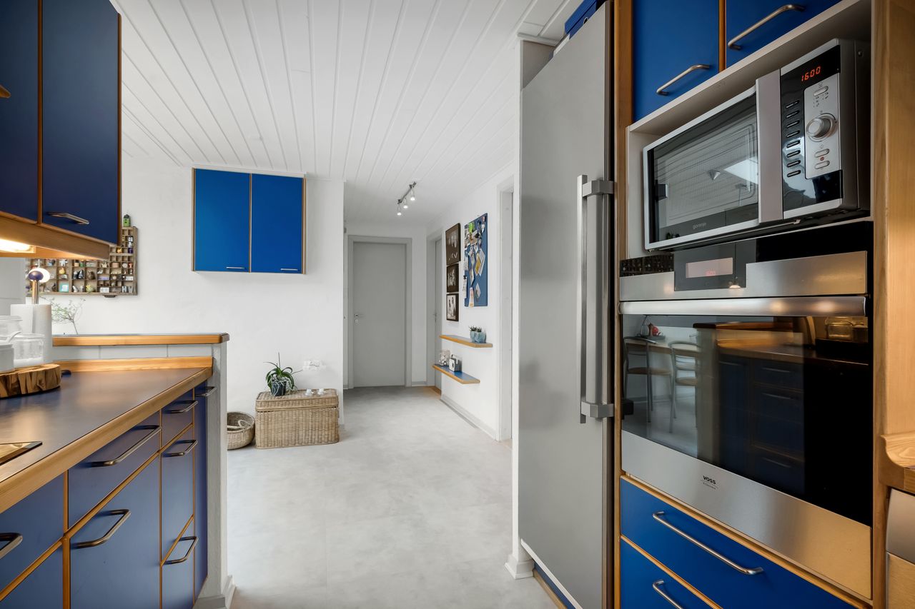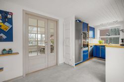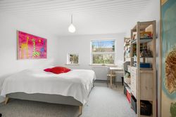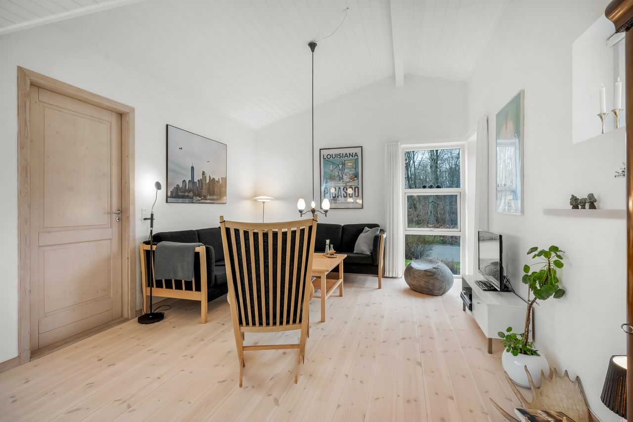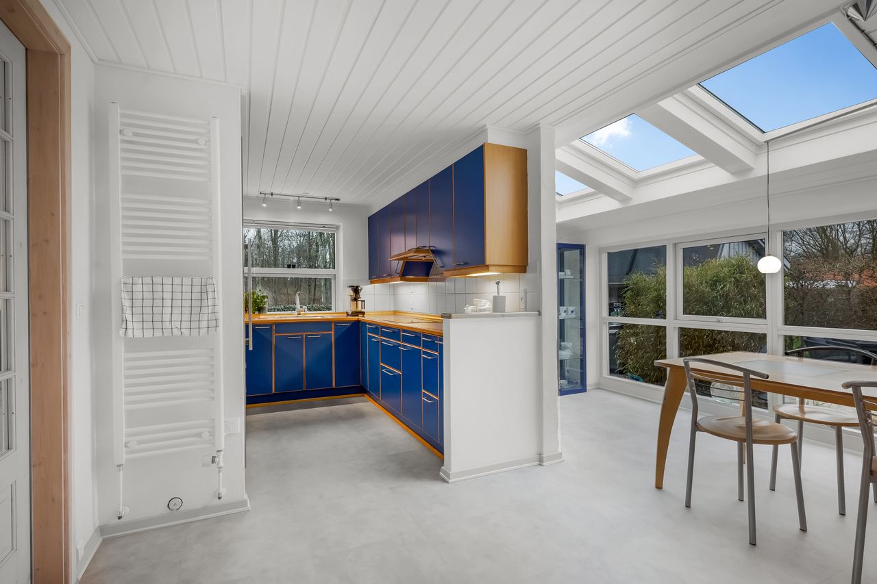 I alt 150 m2 bolig med rummelig entre, hvorfra der er adgang til 2 af husets i alt 4 regulære værelser. De 2 smagfulde badeværelser (heraf det ene med praktisk vaskesøjle) er holdt i samme stil med hvidt inventar og fine, cremefarvede klinker. Køkken med inventar holdt i en flot koboltblå farve, og så er der den skønneste spisekrog, hvor lyset bare strømmer ind. Fransk dør til stor lys opholdsstue med smukt fyrretræsgulv og detaljer som delvise lofter til kip fra husets ”fødsel”. En detalje, som ses flere steder i huset.