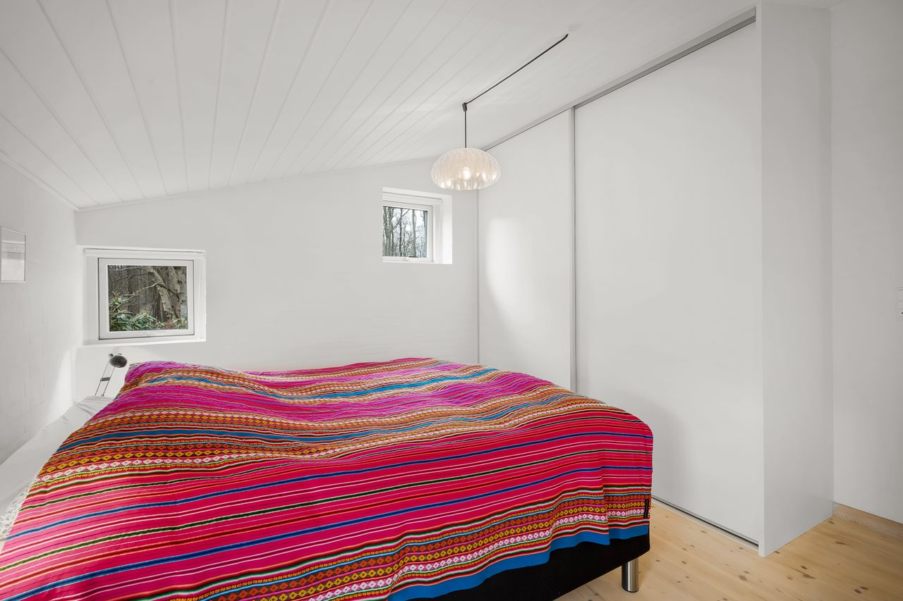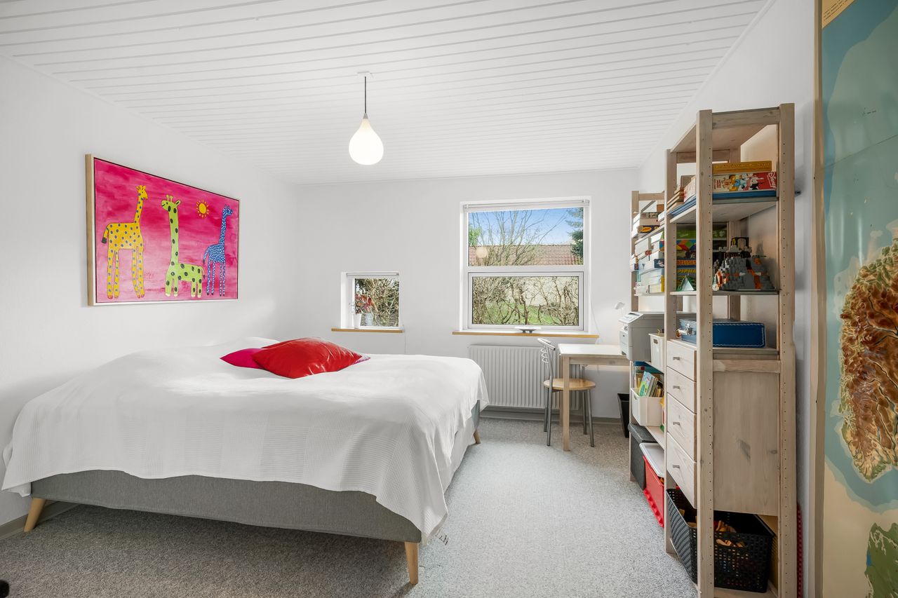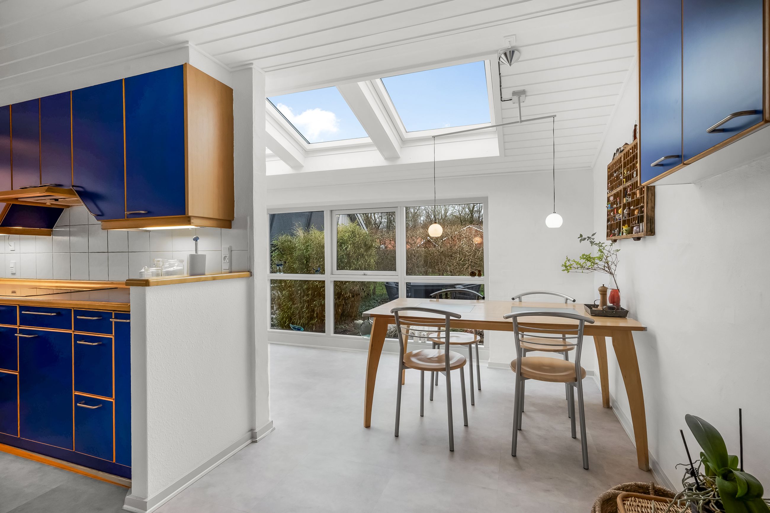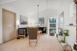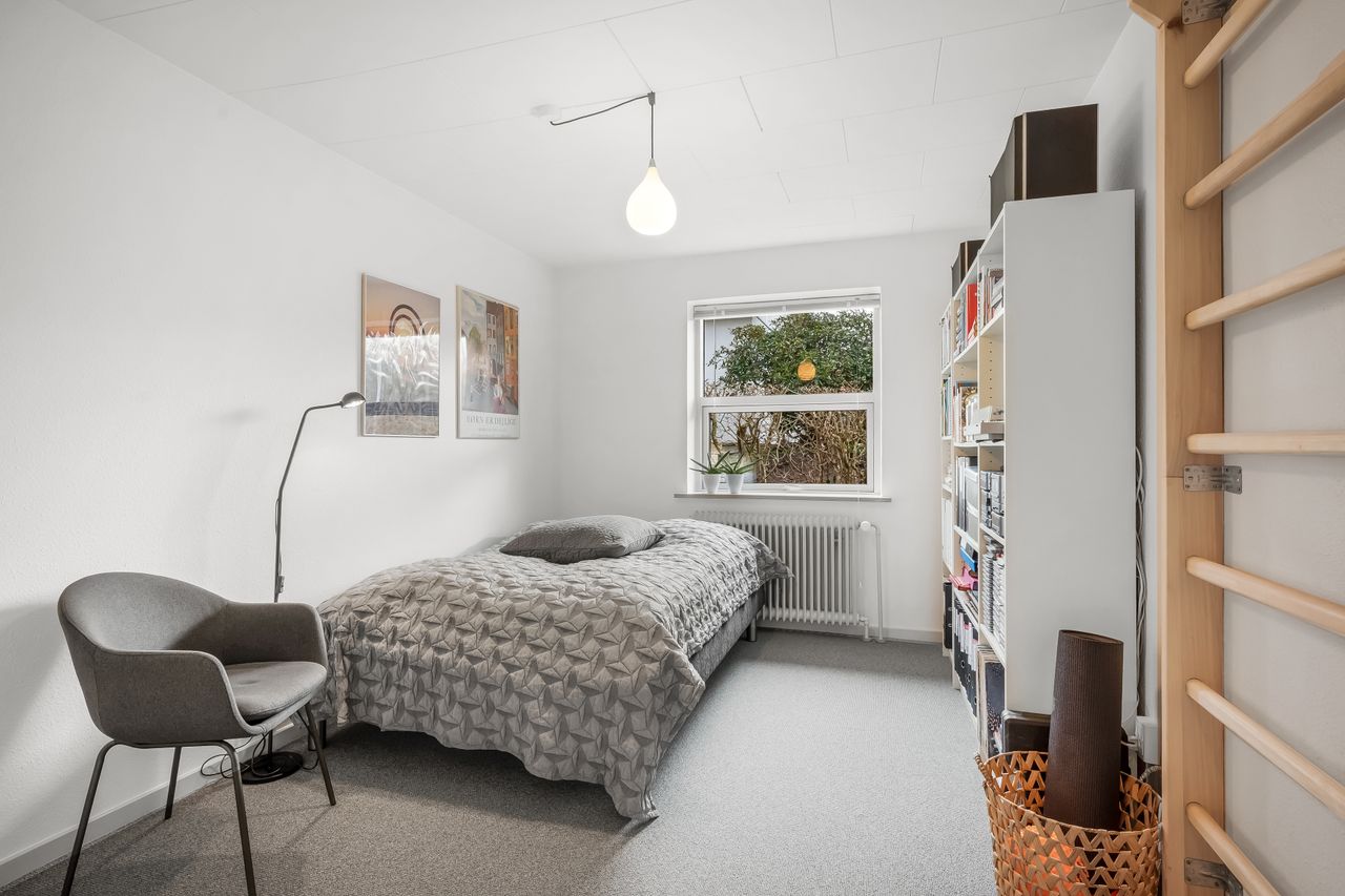 I alt 150 m2 bolig med rummelig entre, hvorfra der er adgang til 2 af husets i alt 4 regulære værelser. De 2 smagfulde badeværelser (heraf det ene med praktisk vaskesøjle) er holdt i samme stil med hvidt inventar og fine, cremefarvede klinker. Køkken med inventar holdt i en flot koboltblå farve, og så er der den skønneste spisekrog, hvor lyset bare strømmer ind. Fransk dør til stor lys opholdsstue med smukt fyrretræsgulv og detaljer som delvise lofter til kip fra husets ”fødsel”. En detalje, som ses flere steder i huset.