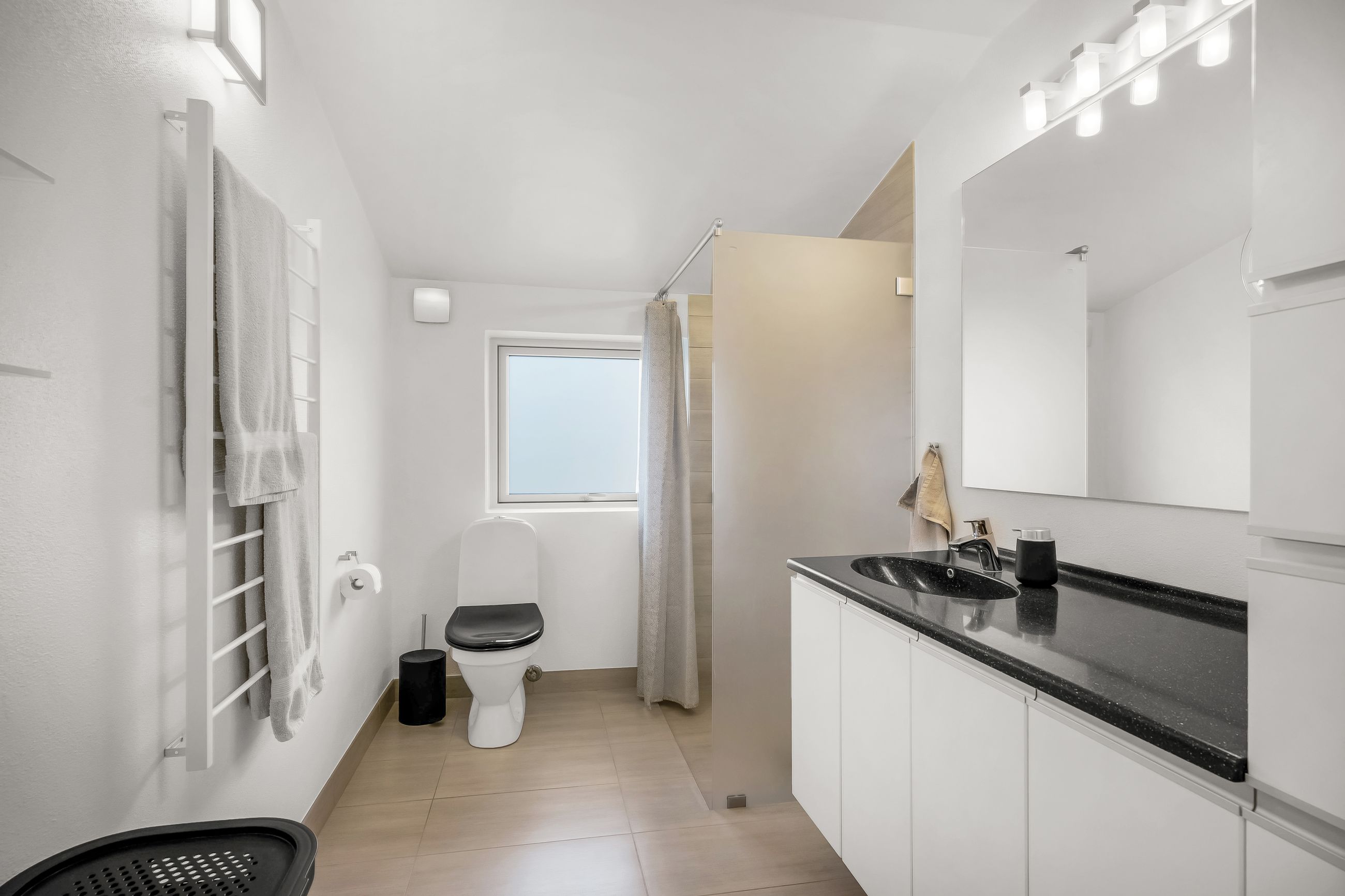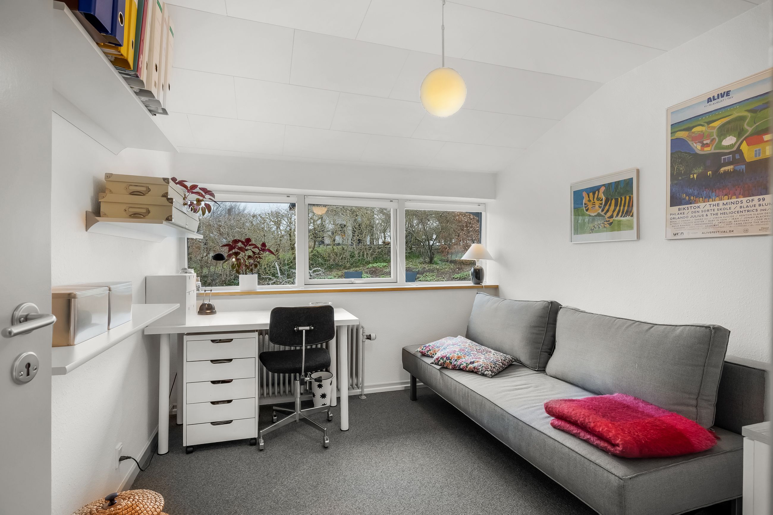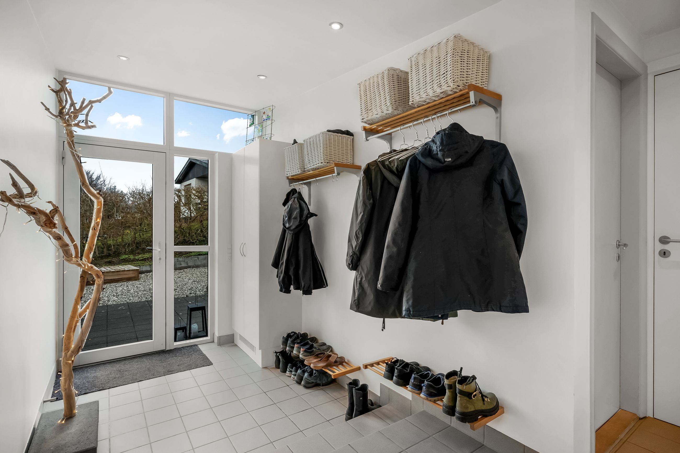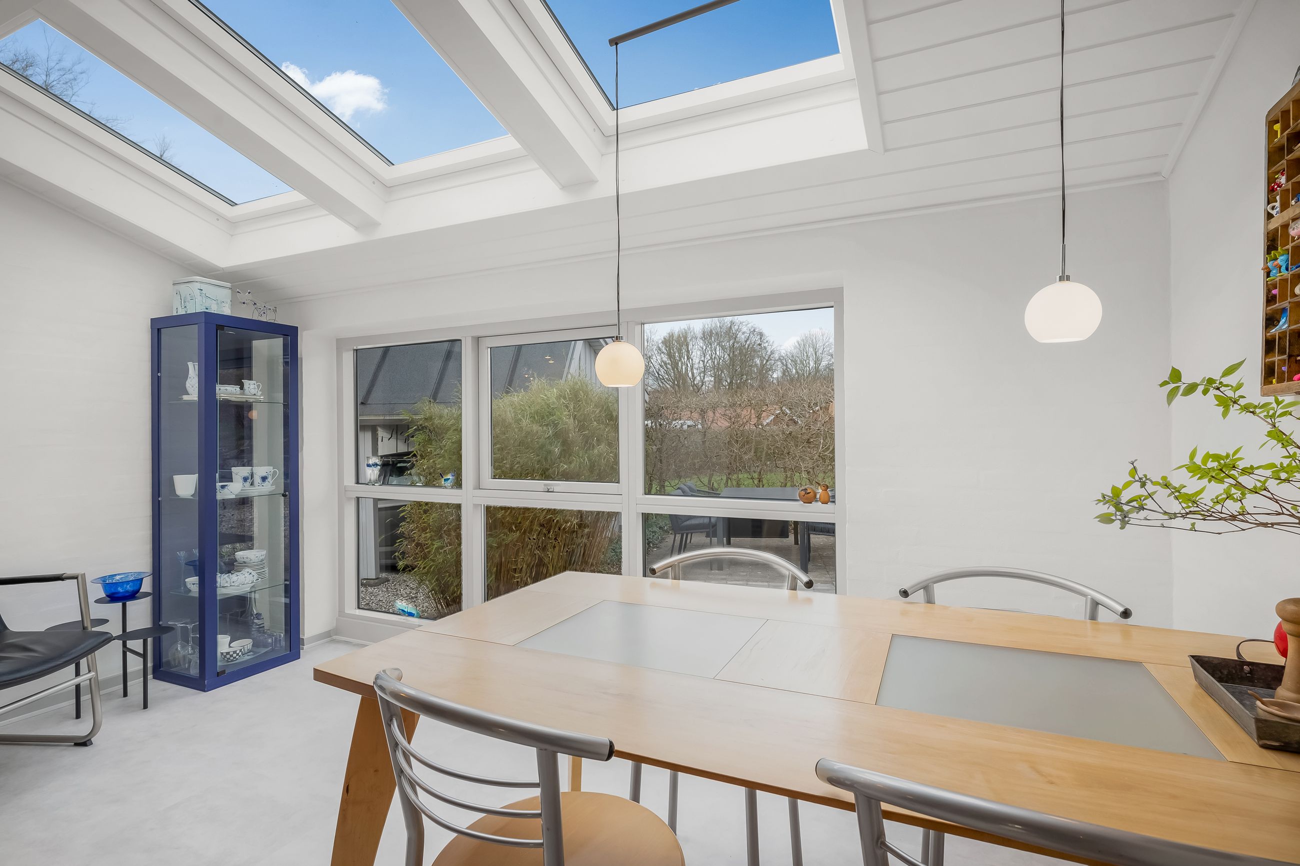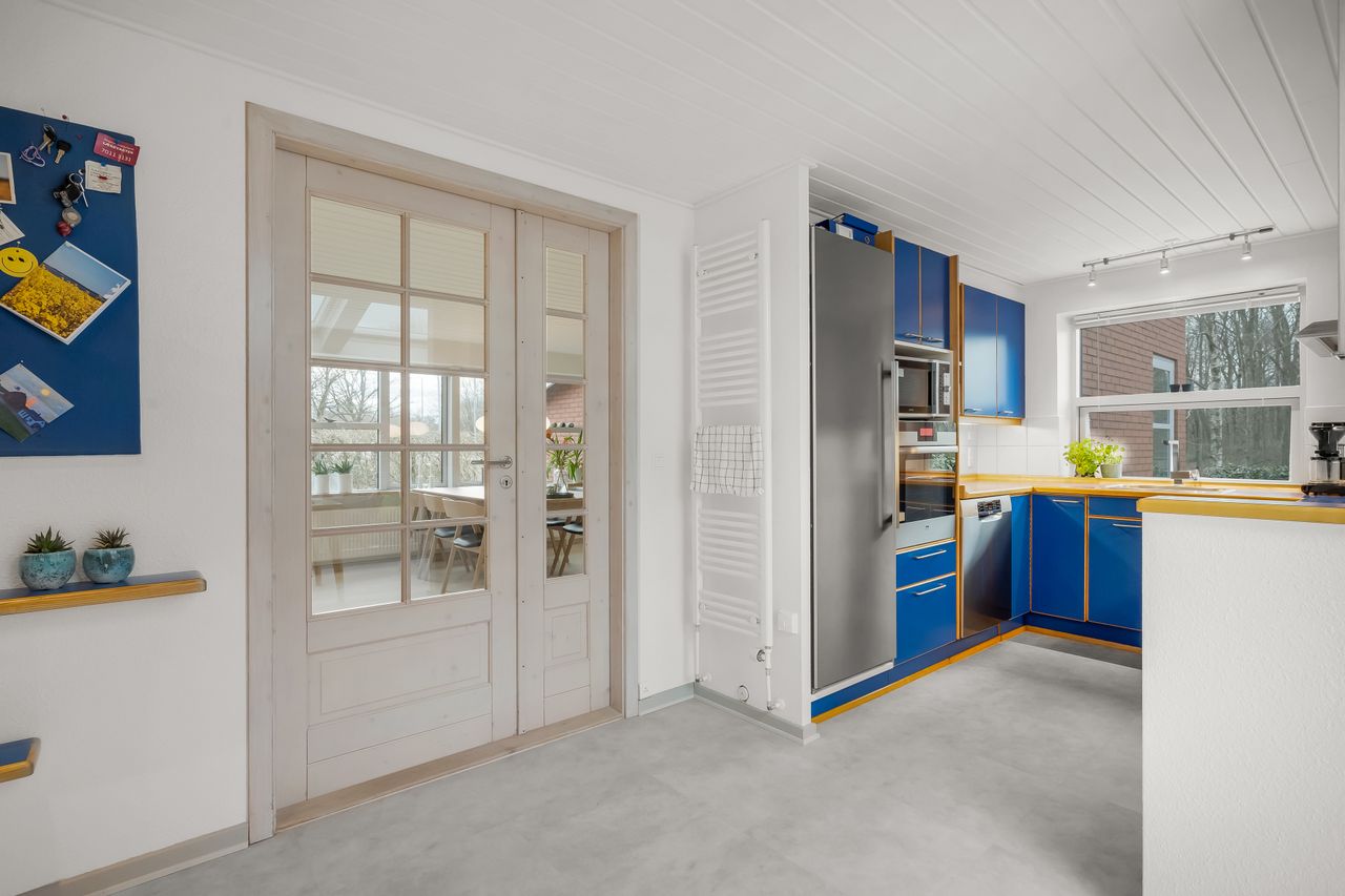 I alt 150 m2 bolig med rummelig entre, hvorfra der er adgang til 2 af husets i alt 4 regulære værelser. De 2 smagfulde badeværelser (heraf det ene med praktisk vaskesøjle) er holdt i samme stil med hvidt inventar og fine, cremefarvede klinker. Køkken med inventar holdt i en flot koboltblå farve, og så er der den skønneste spisekrog, hvor lyset bare strømmer ind. Fransk dør til stor lys opholdsstue med smukt fyrretræsgulv og detaljer som delvise lofter til kip fra husets ”fødsel”. En detalje, som ses flere steder i huset.