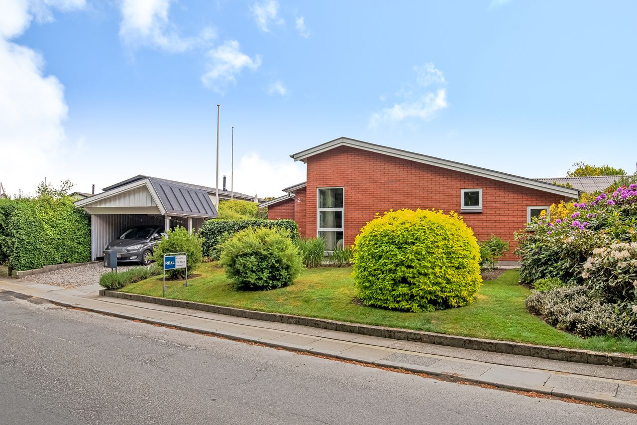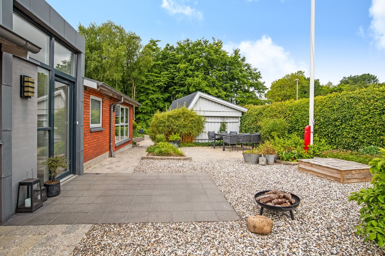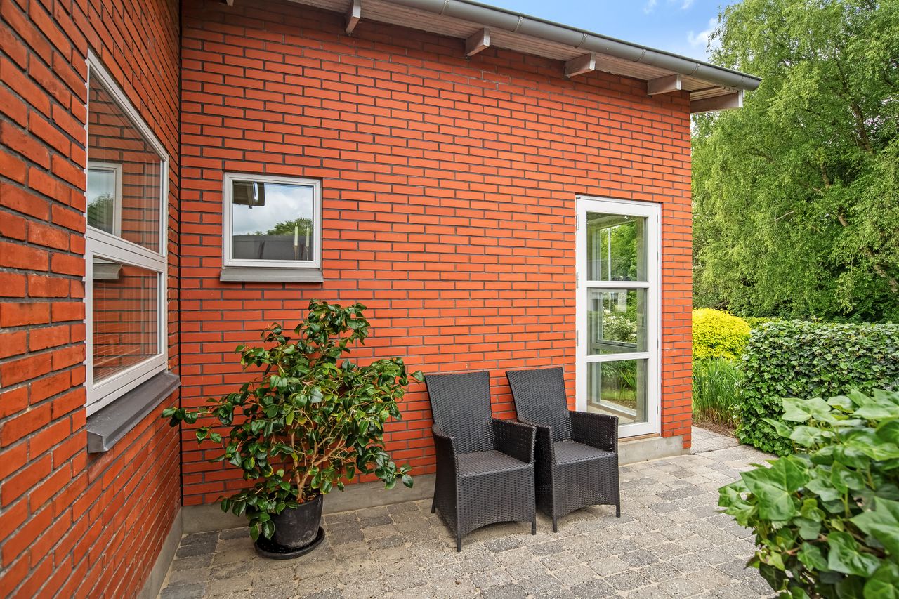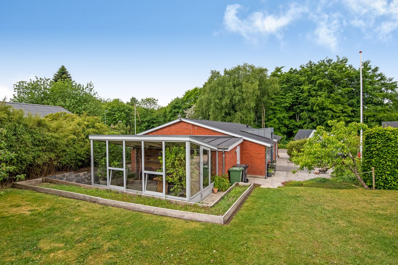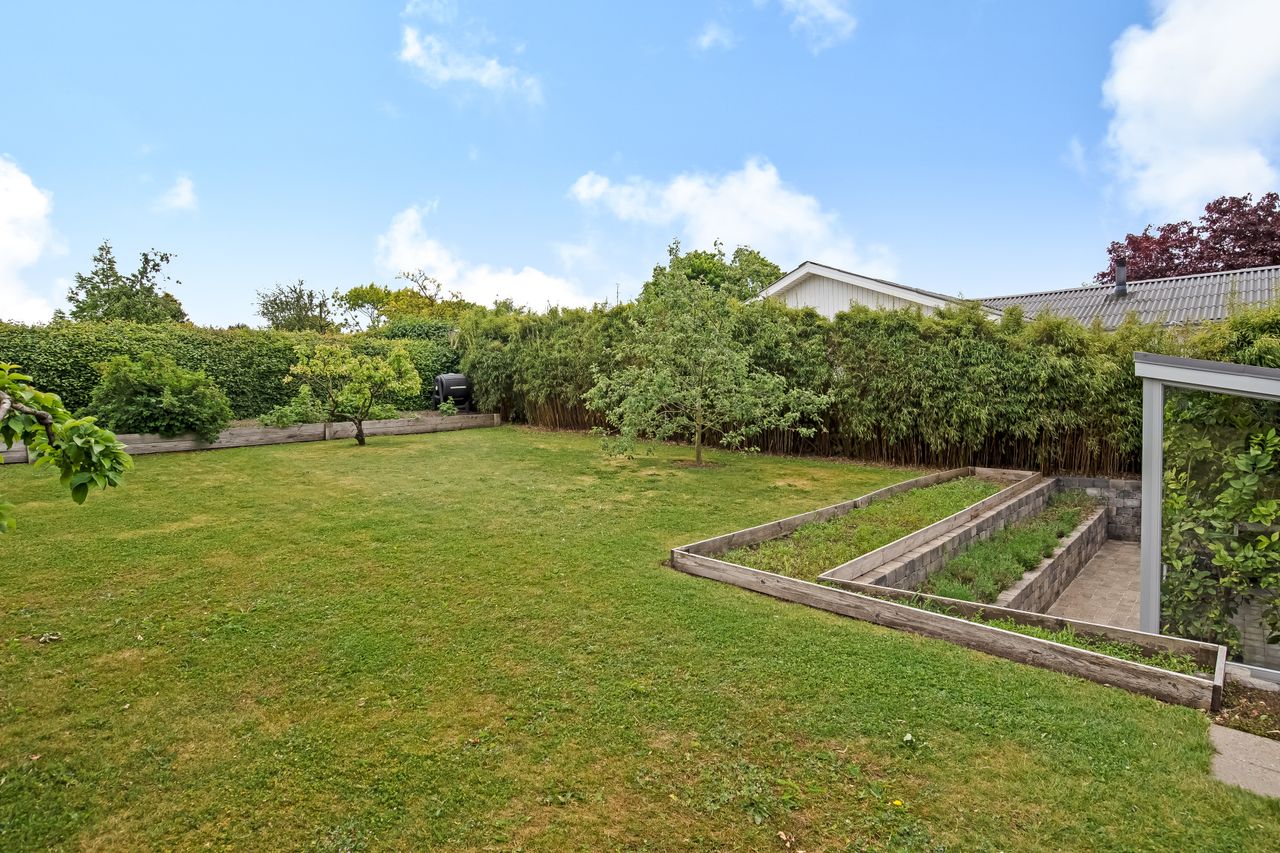 Stor lukket baghave med græsplæne og ved huset er der kombineret flisebelægning og grus som afgrænser flere dejlige uderum. Bl.a. i forbindelse med husets indgangsparti og en terrasse mod stik syd. Således kan I hele vejen rundt sidde ugeneret i både skygge og sol. Skulle det regne, kan I også trække i tørvejr i et orangeri, som er hyggeligt indrettet og desuden giver yderligere frit spil for jer med grønne fingre. Flot anlagt forhave med bl.a. rhodondendronbede, og så er der tilkørsel til den tilhørende 15 m2 carport.