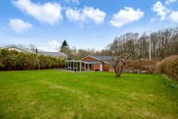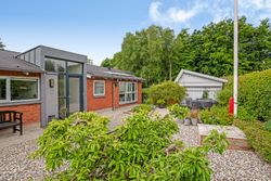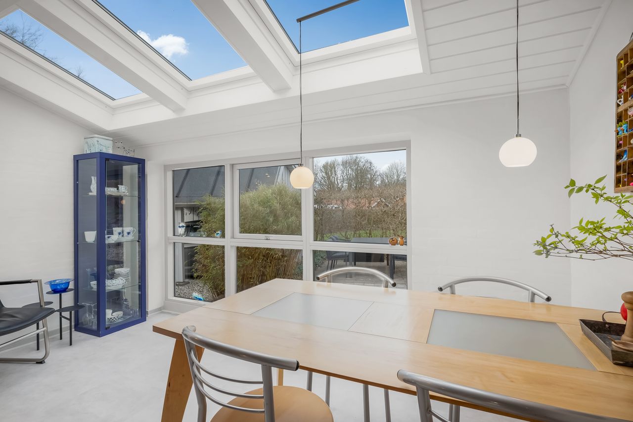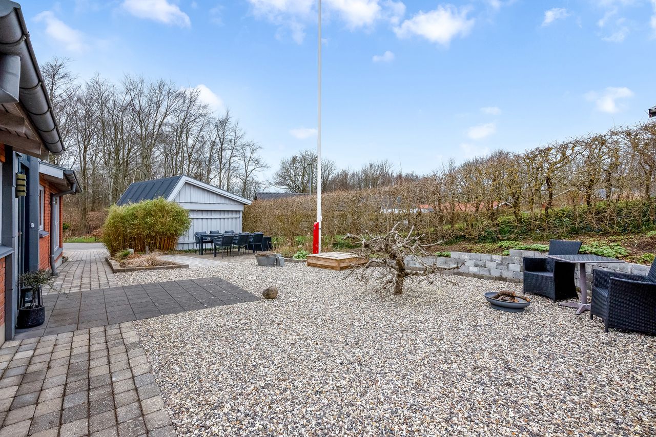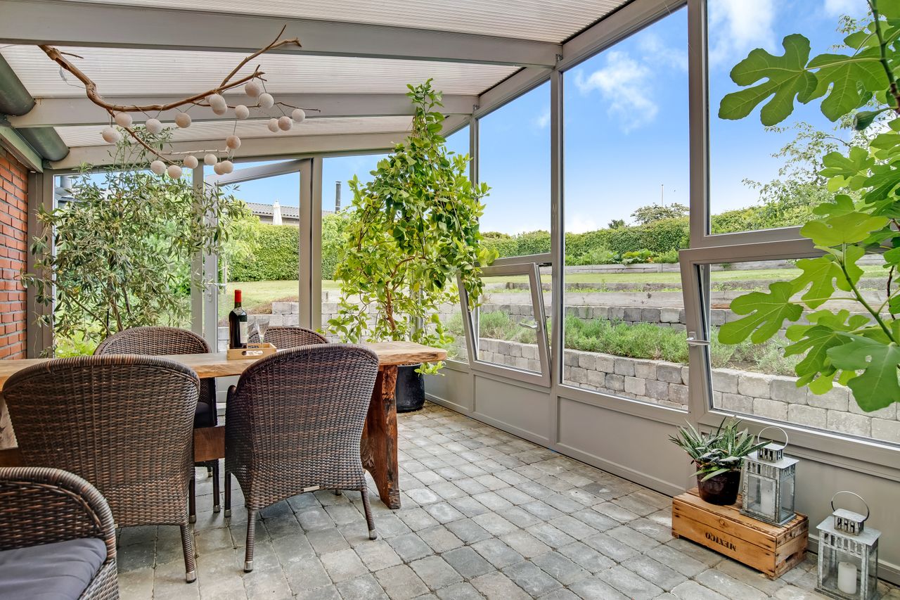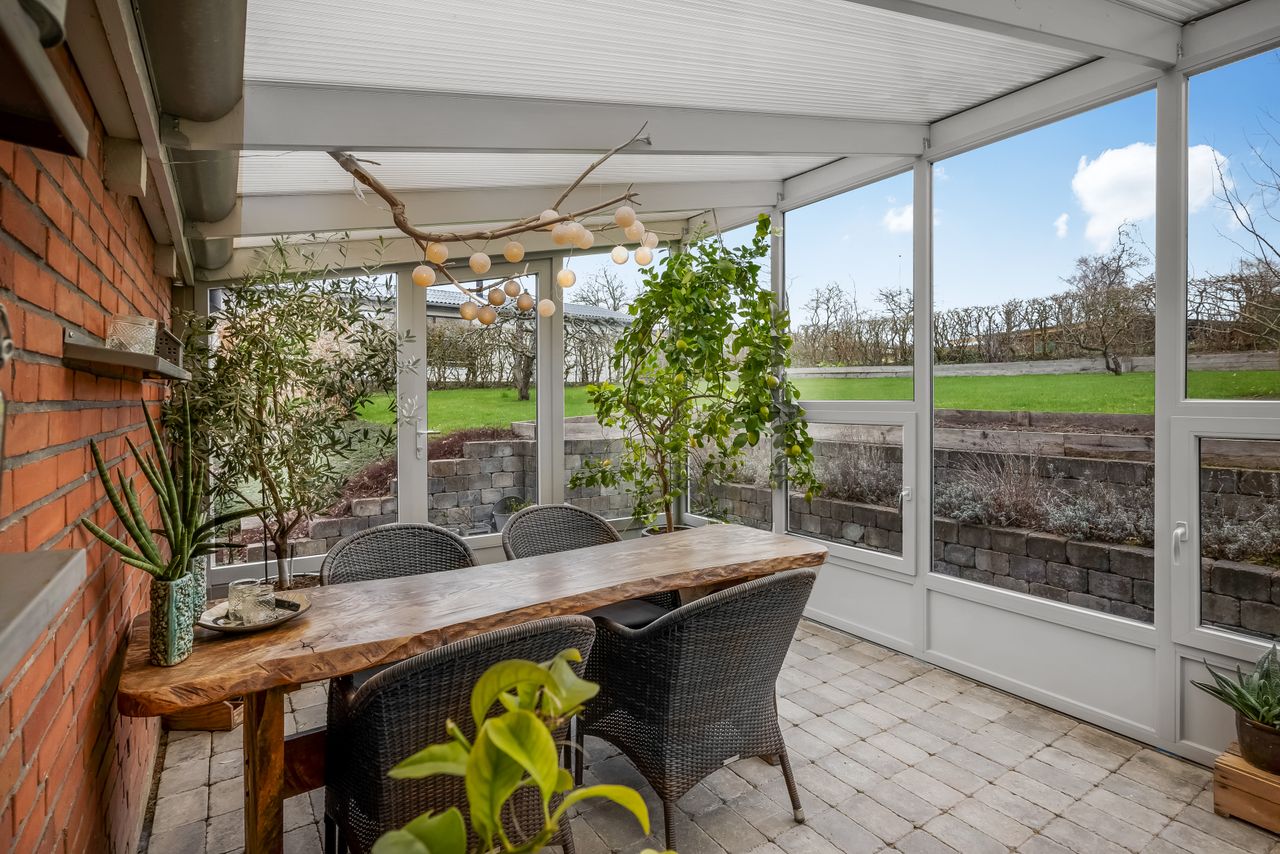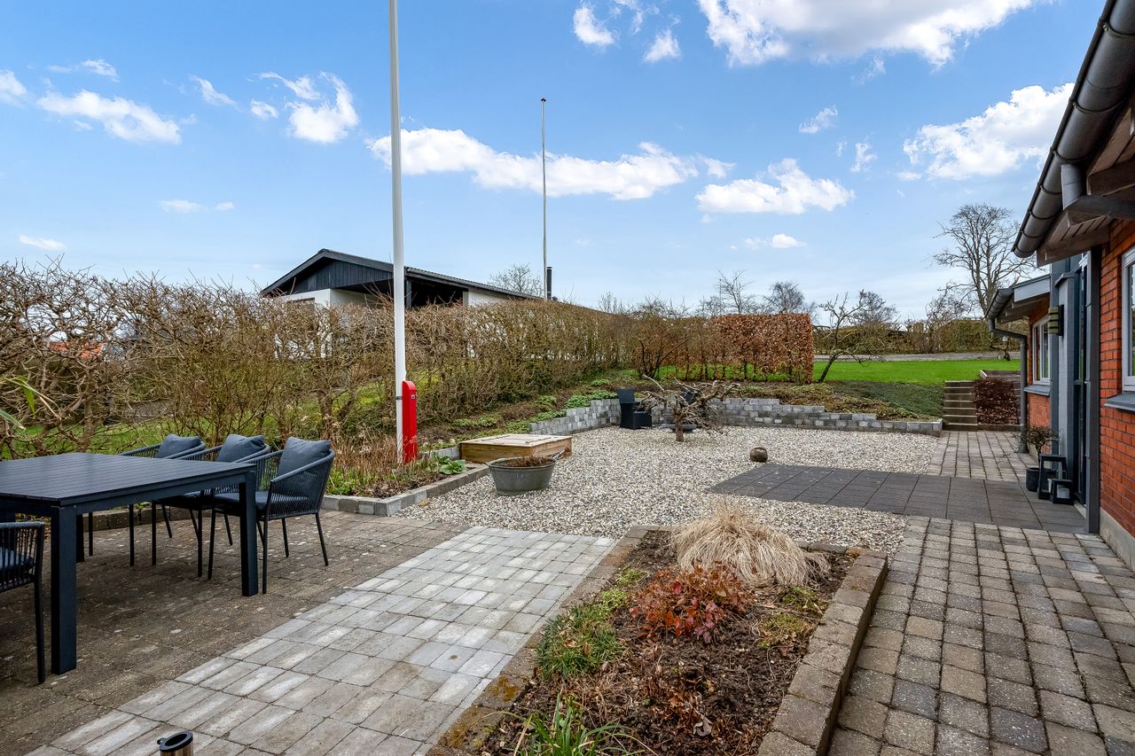 Stor lukket baghave med græsplæne og ved huset er der kombineret flisebelægning og grus som afgrænser flere dejlige uderum. Bl.a. i forbindelse med husets indgangsparti og en terrasse mod stik syd. Således kan I hele vejen rundt sidde ugeneret i både skygge og sol. Skulle det regne, kan I også trække i tørvejr i et orangeri, som er hyggeligt indrettet og desuden giver yderligere frit spil for jer med grønne fingre. Flot anlagt forhave med bl.a. rhodondendronbede, og så er der tilkørsel til den tilhørende 15 m2 carport.
