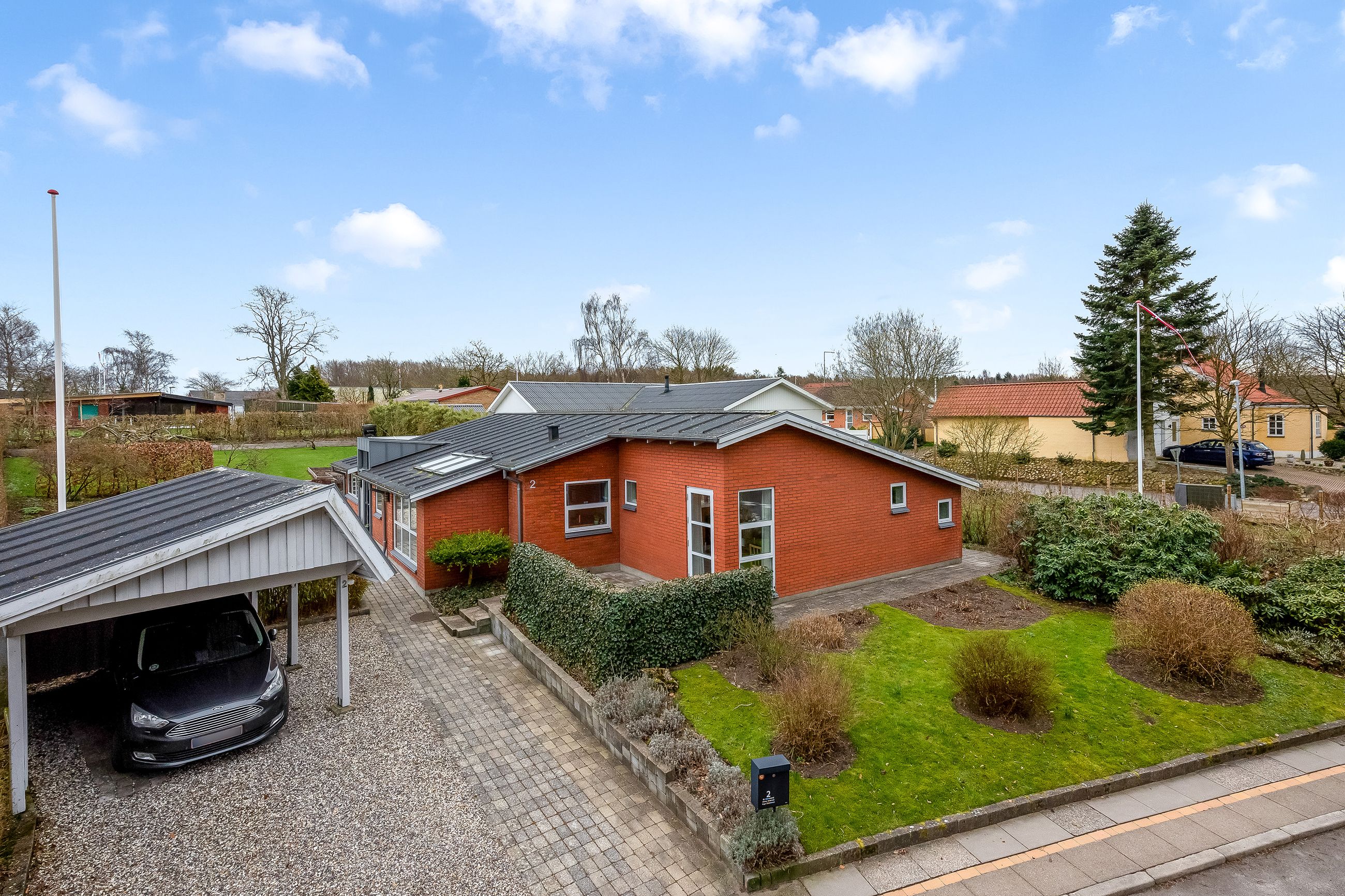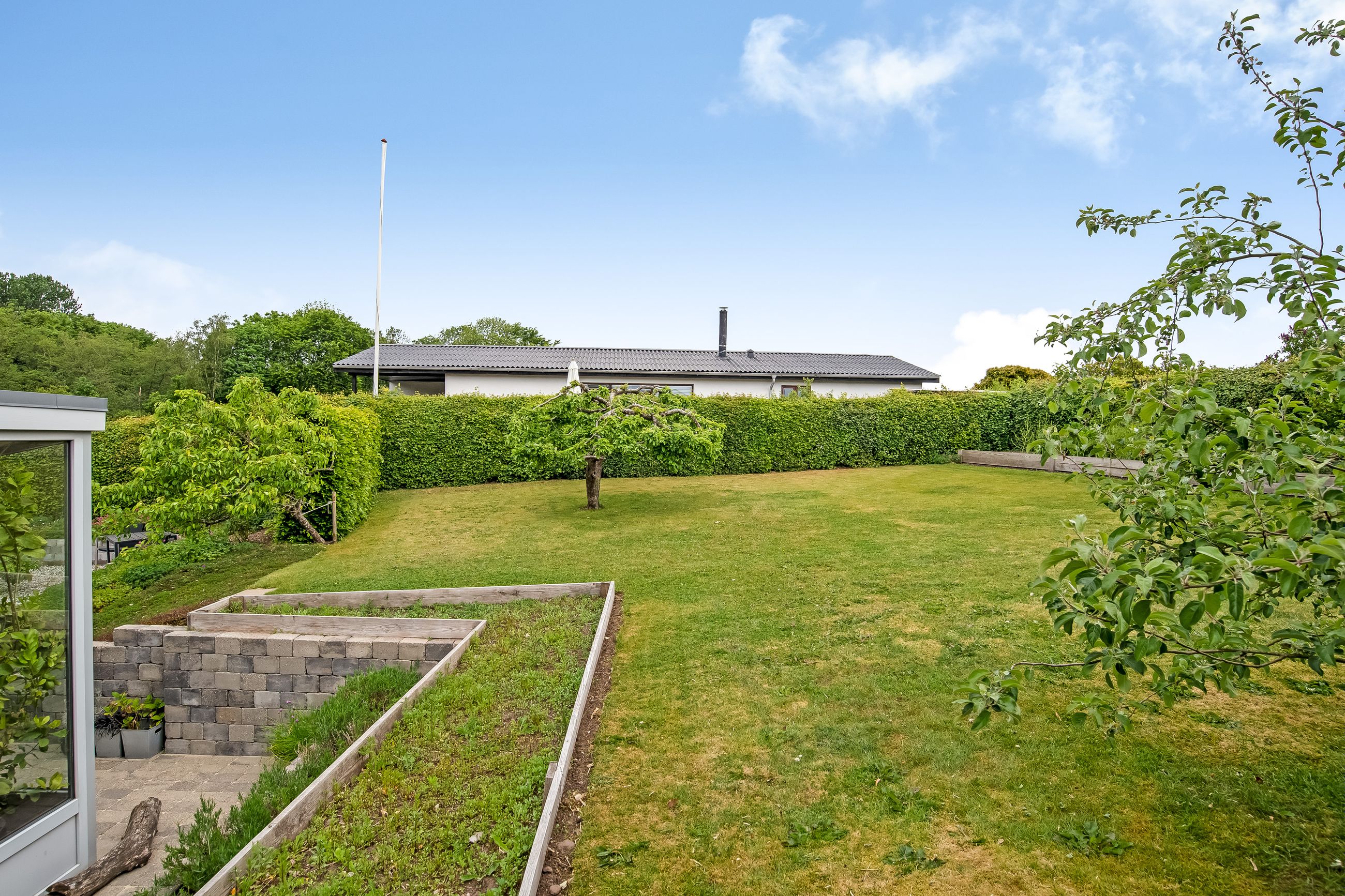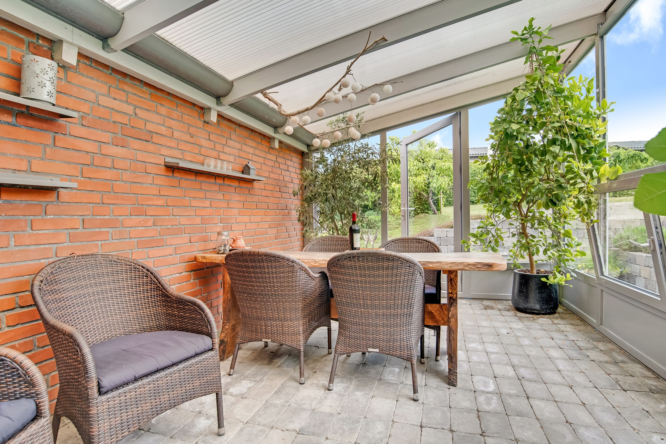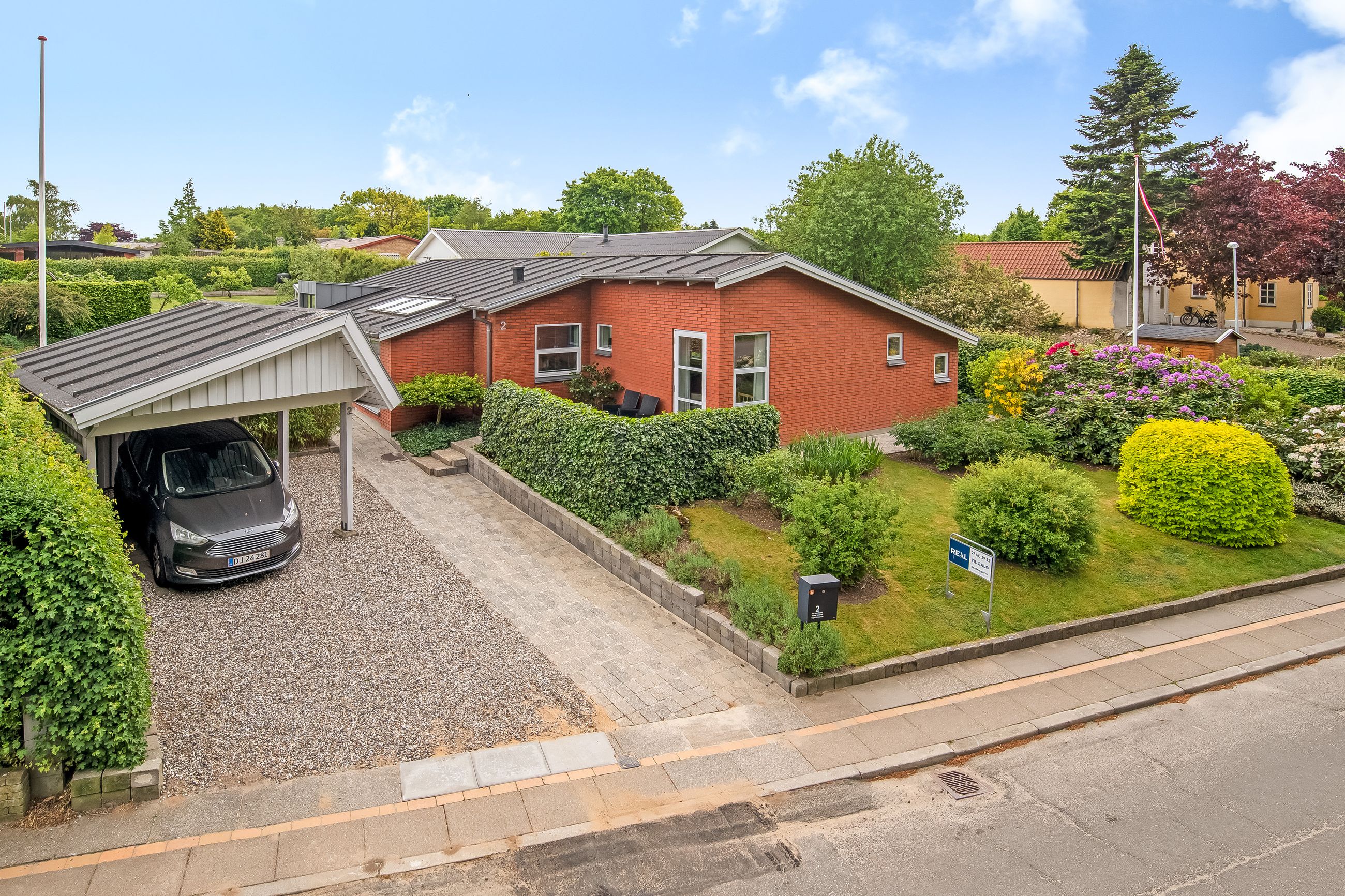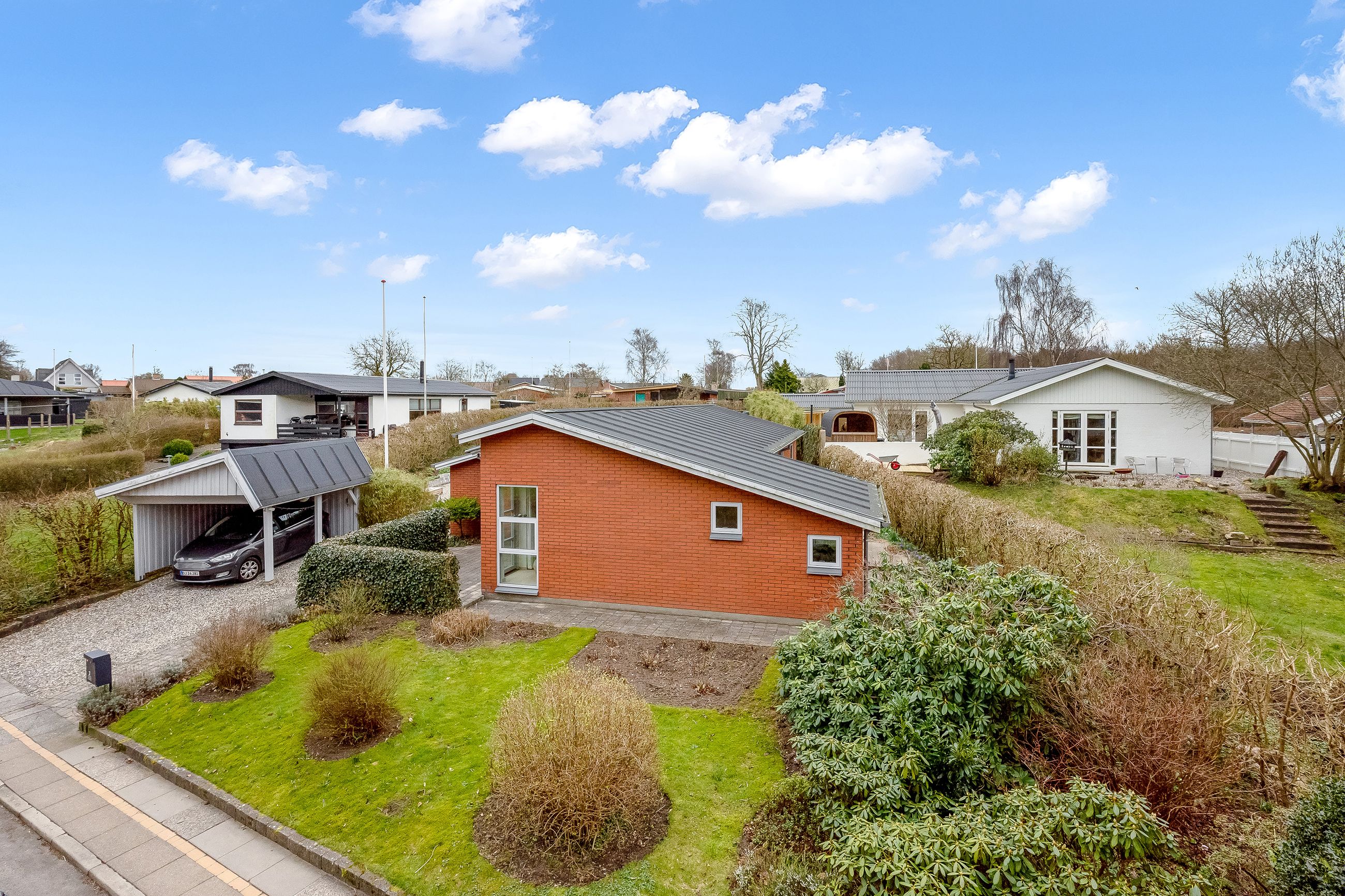 Stor lukket baghave med græsplæne og ved huset er der kombineret flisebelægning og grus som afgrænser flere dejlige uderum. Bl.a. i forbindelse med husets indgangsparti og en terrasse mod stik syd. Således kan I hele vejen rundt sidde ugeneret i både skygge og sol. Skulle det regne, kan I også trække i tørvejr i et orangeri, som er hyggeligt indrettet og desuden giver yderligere frit spil for jer med grønne fingre. Flot anlagt forhave med bl.a. rhodondendronbede, og så er der tilkørsel til den tilhørende 15 m2 carport.