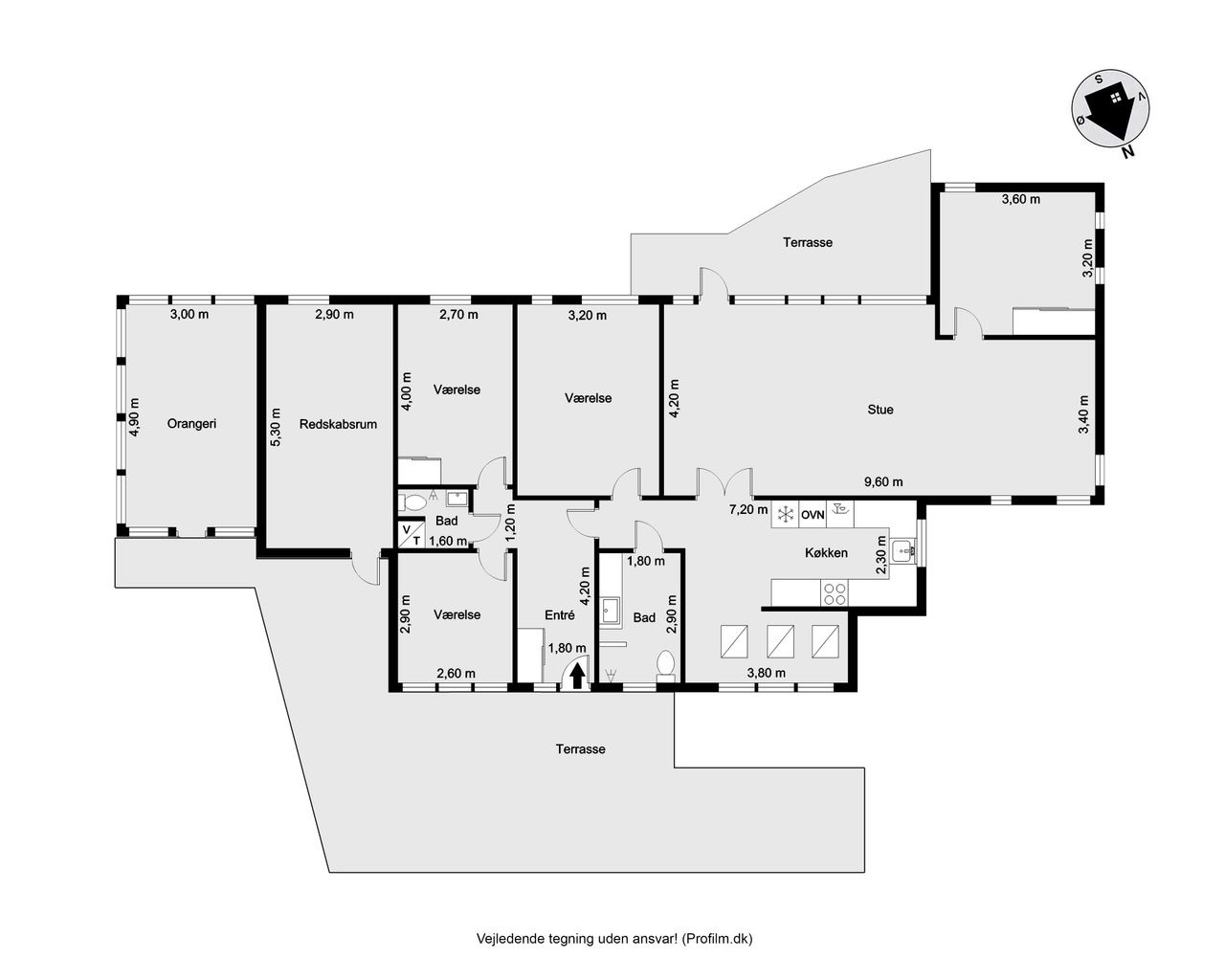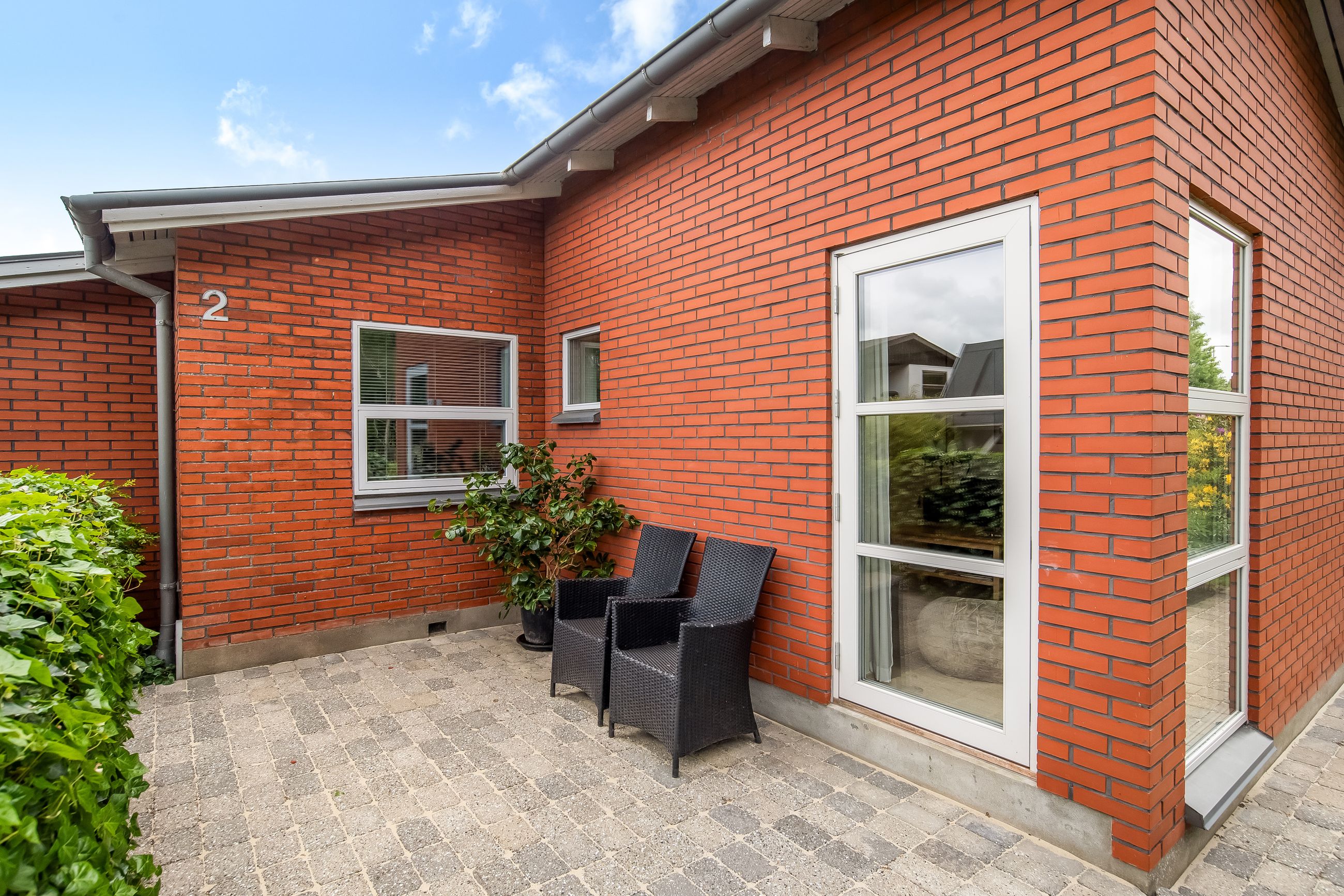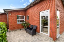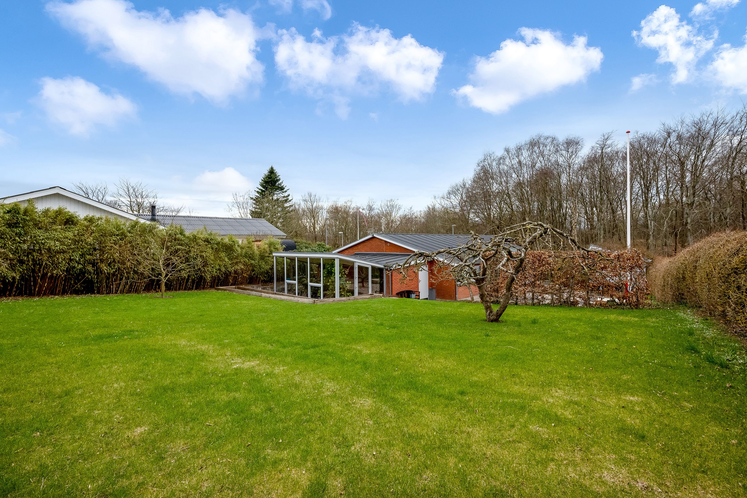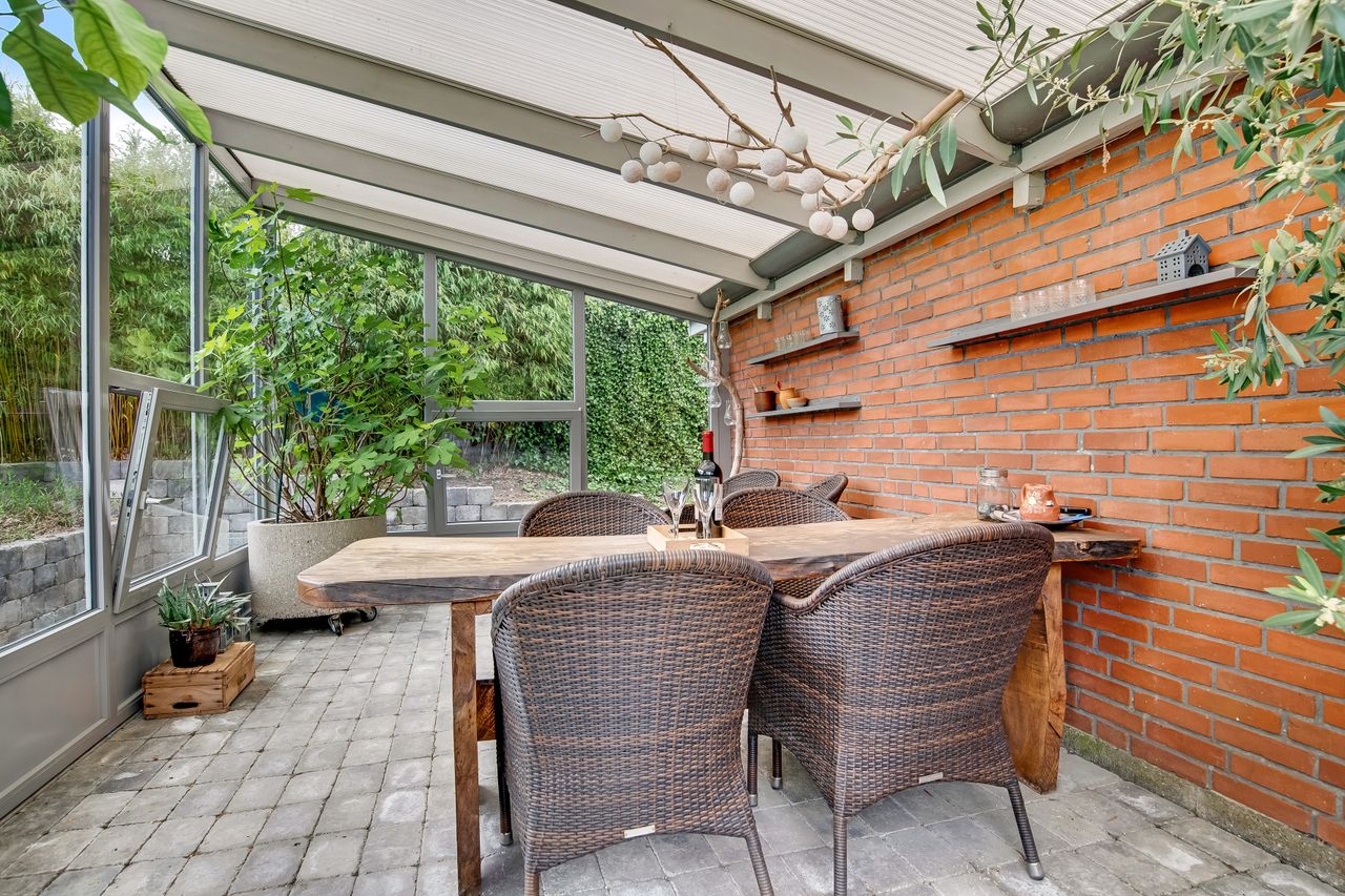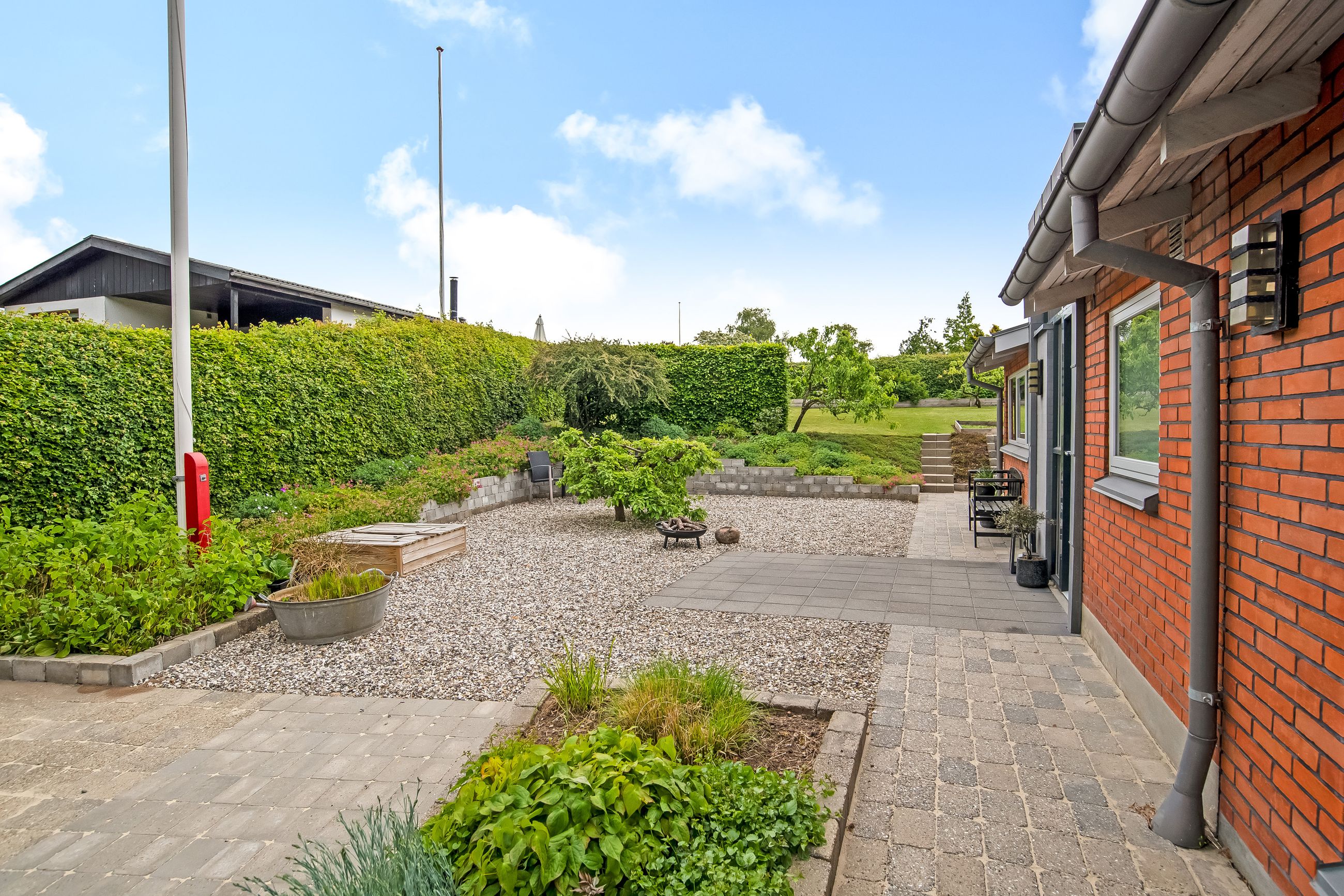 Stor lukket baghave med græsplæne og ved huset er der kombineret flisebelægning og grus som afgrænser flere dejlige uderum. Bl.a. i forbindelse med husets indgangsparti og en terrasse mod stik syd. Således kan I hele vejen rundt sidde ugeneret i både skygge og sol. Skulle det regne, kan I også trække i tørvejr i et orangeri, som er hyggeligt indrettet og desuden giver yderligere frit spil for jer med grønne fingre. Flot anlagt forhave med bl.a. rhodondendronbede, og så er der tilkørsel til den tilhørende 15 m2 carport.