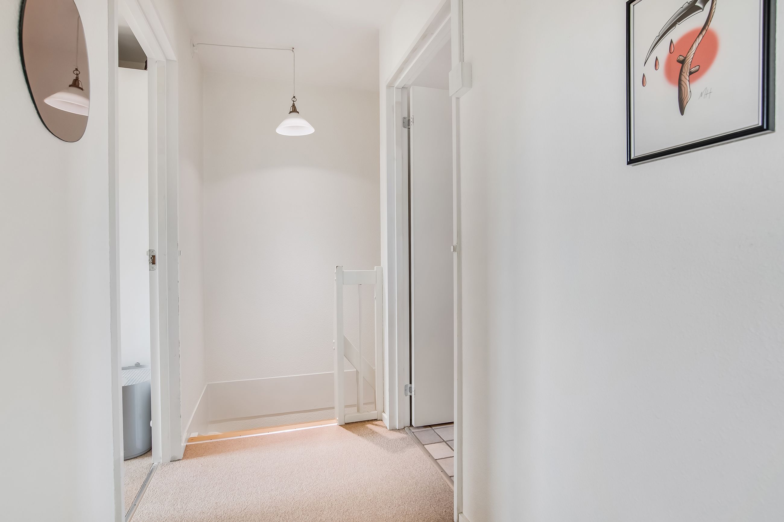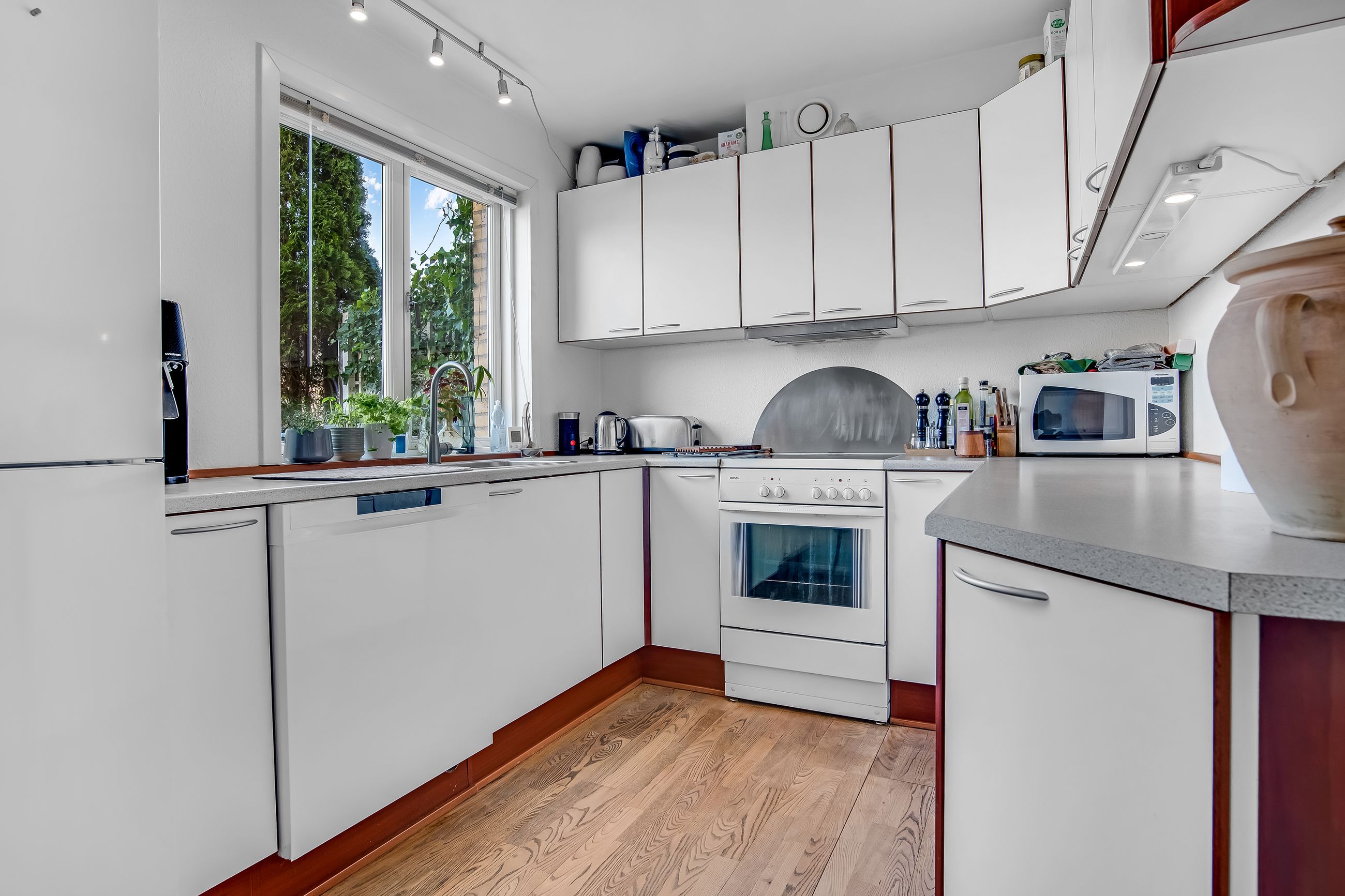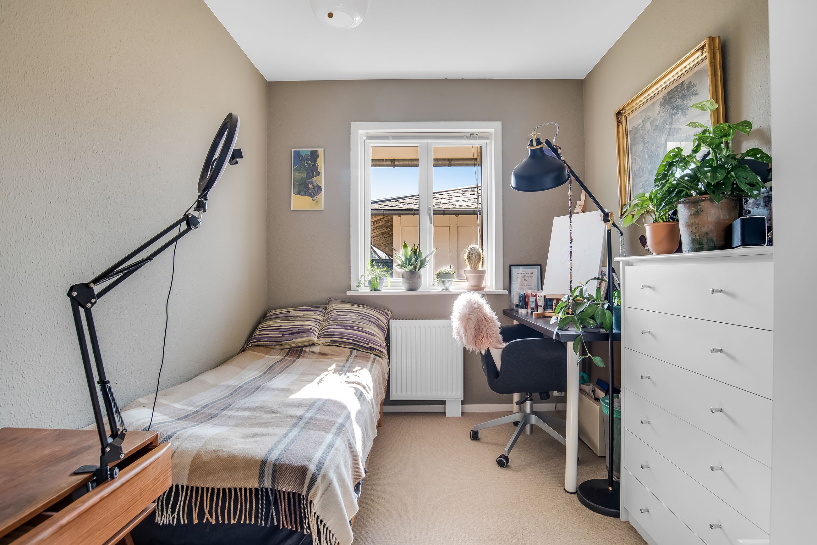 Boligen er indrettet med entre med pænt klinkegulv og trappe til 1. sal, tidløst køkken med lyst inventar, opholds-/spisestue med laminat plankegulv og udgang til ugeneret flisebelagt sydvendt terrasse. I sammenhæng med stuen er der desuden et mindre disponibelt rum til diverse opbevaring.- 1. sal: Fordelingsgang, badeværelse med bruseniche, gråt klinkegulv samt pænt lyst inventar og vaskefaciliteter , soveværelse med faste skabe og 2 værelser med faste skabe.