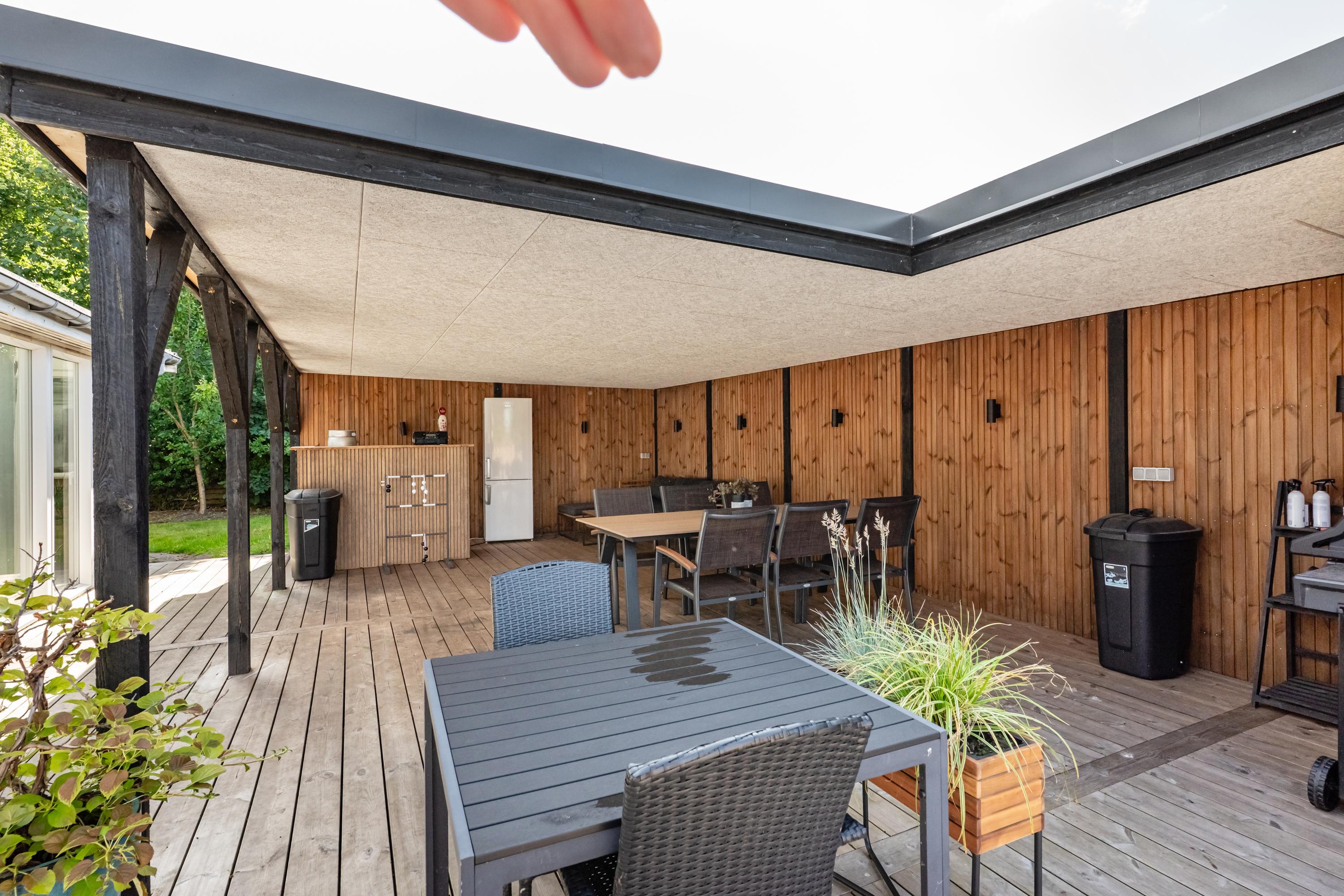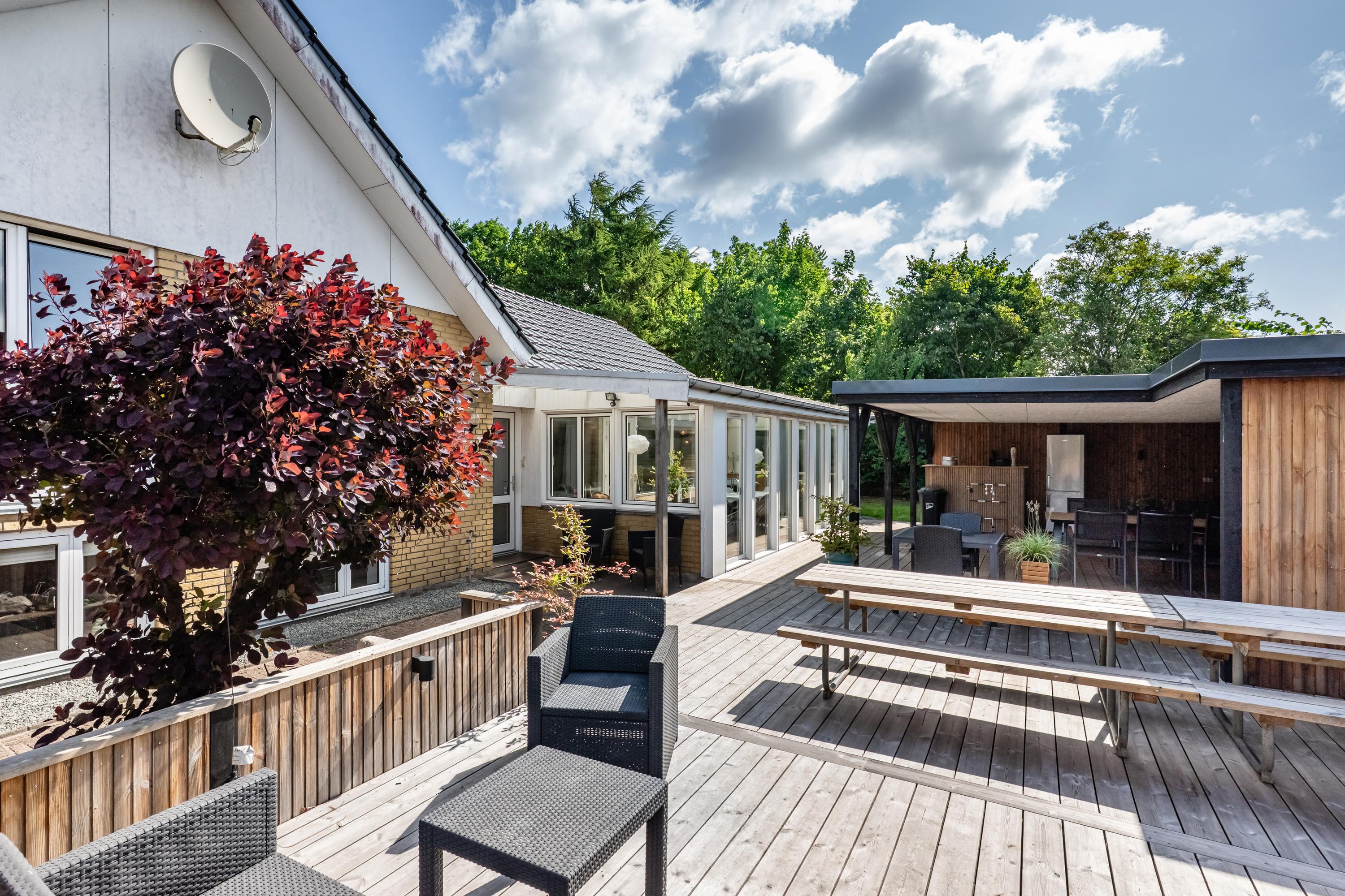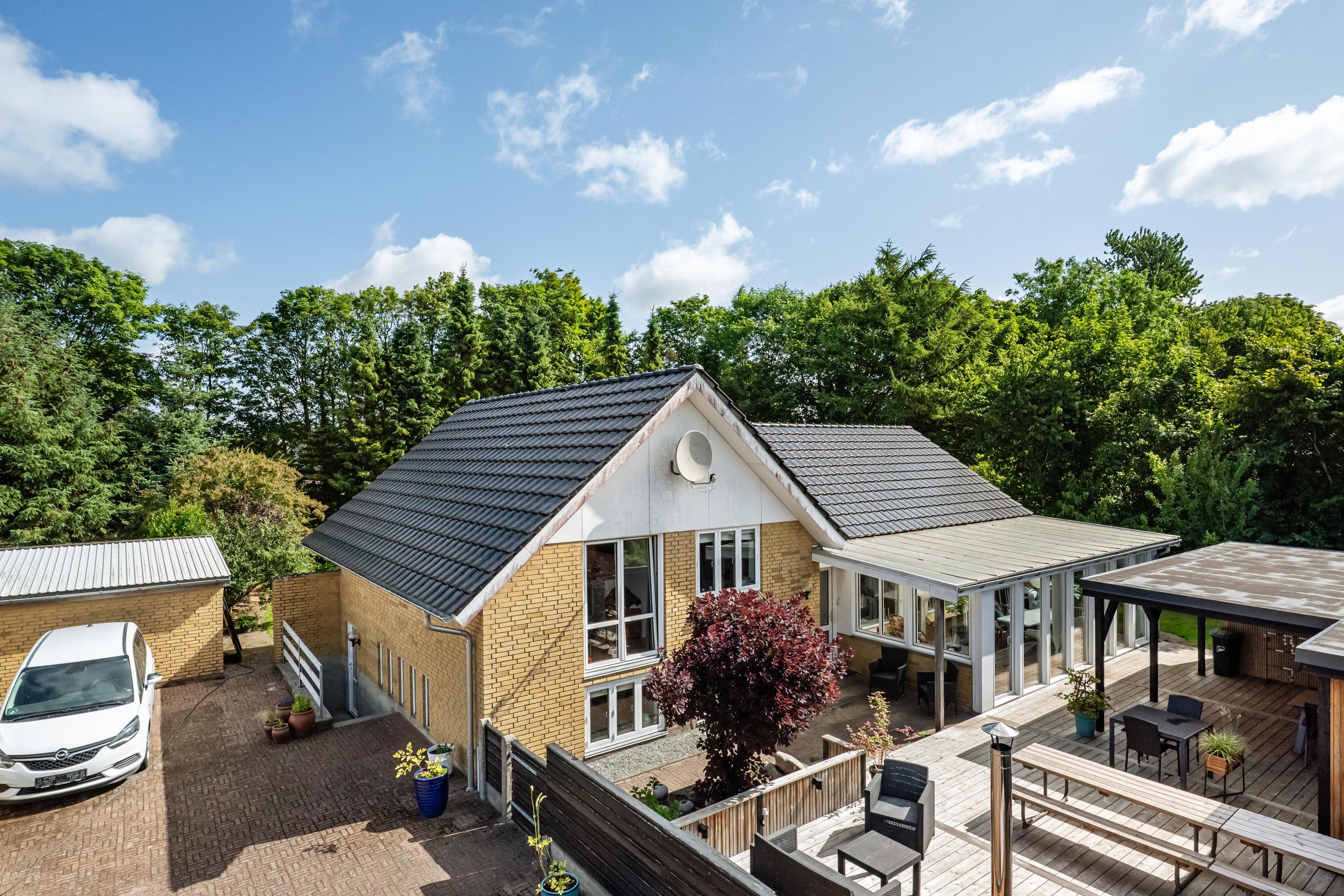 Spændnede villa med kæmpe garage-/erhvervsbygning og superlækkert terrassemiljø