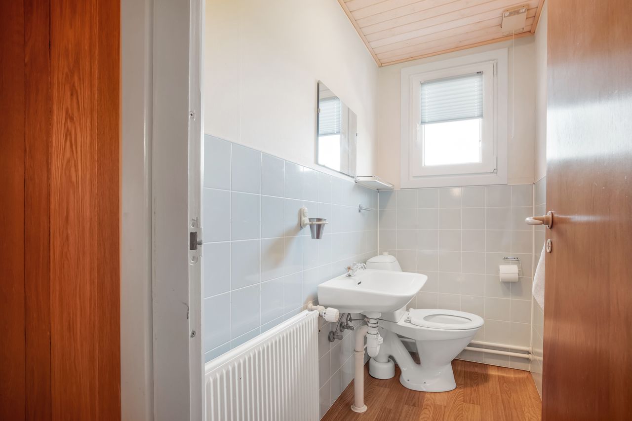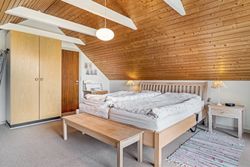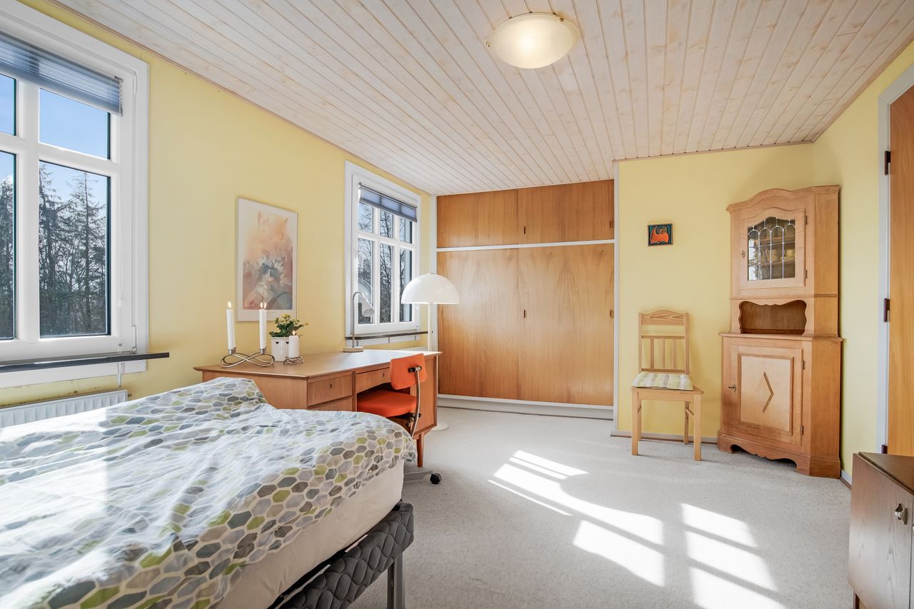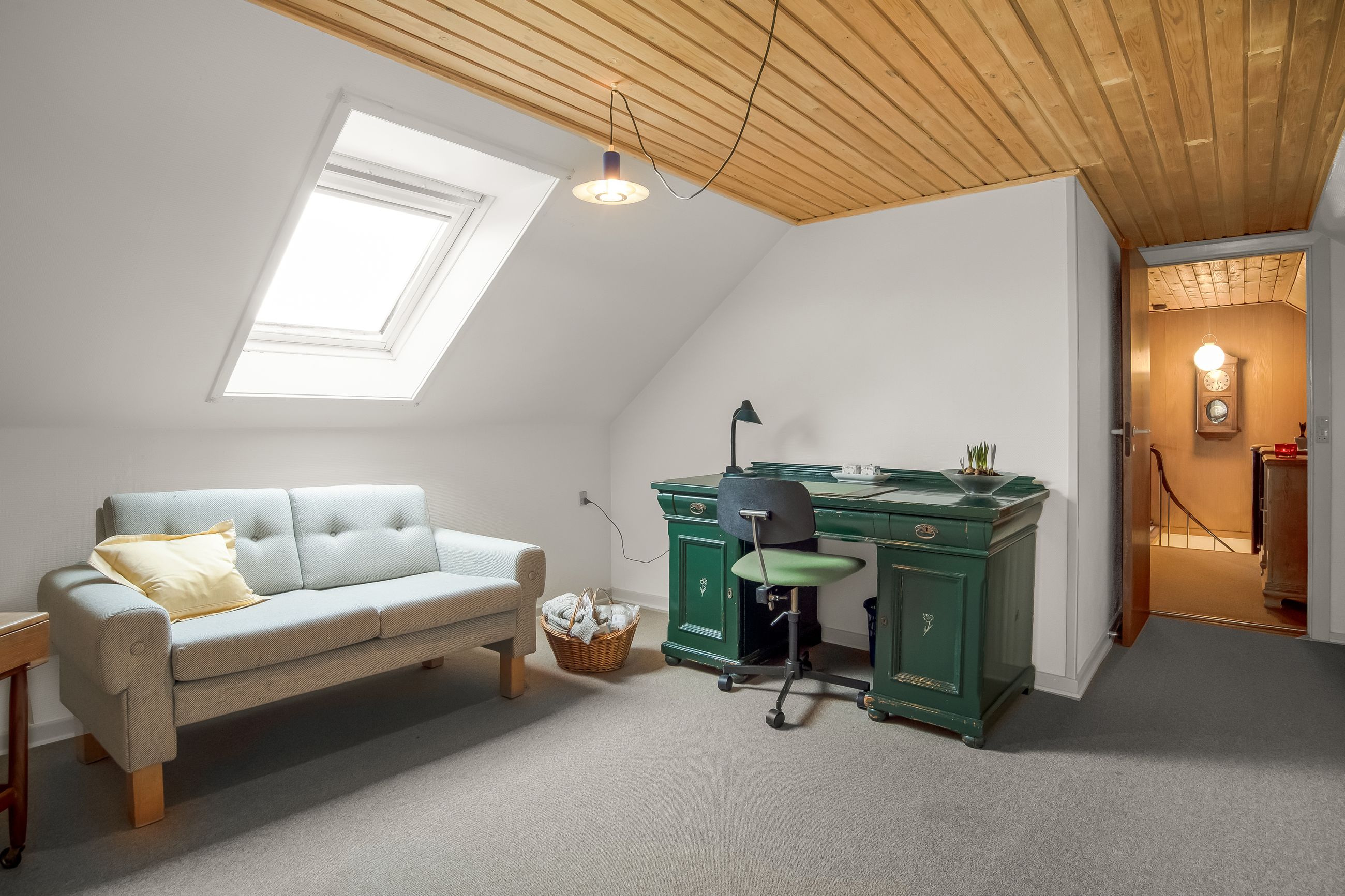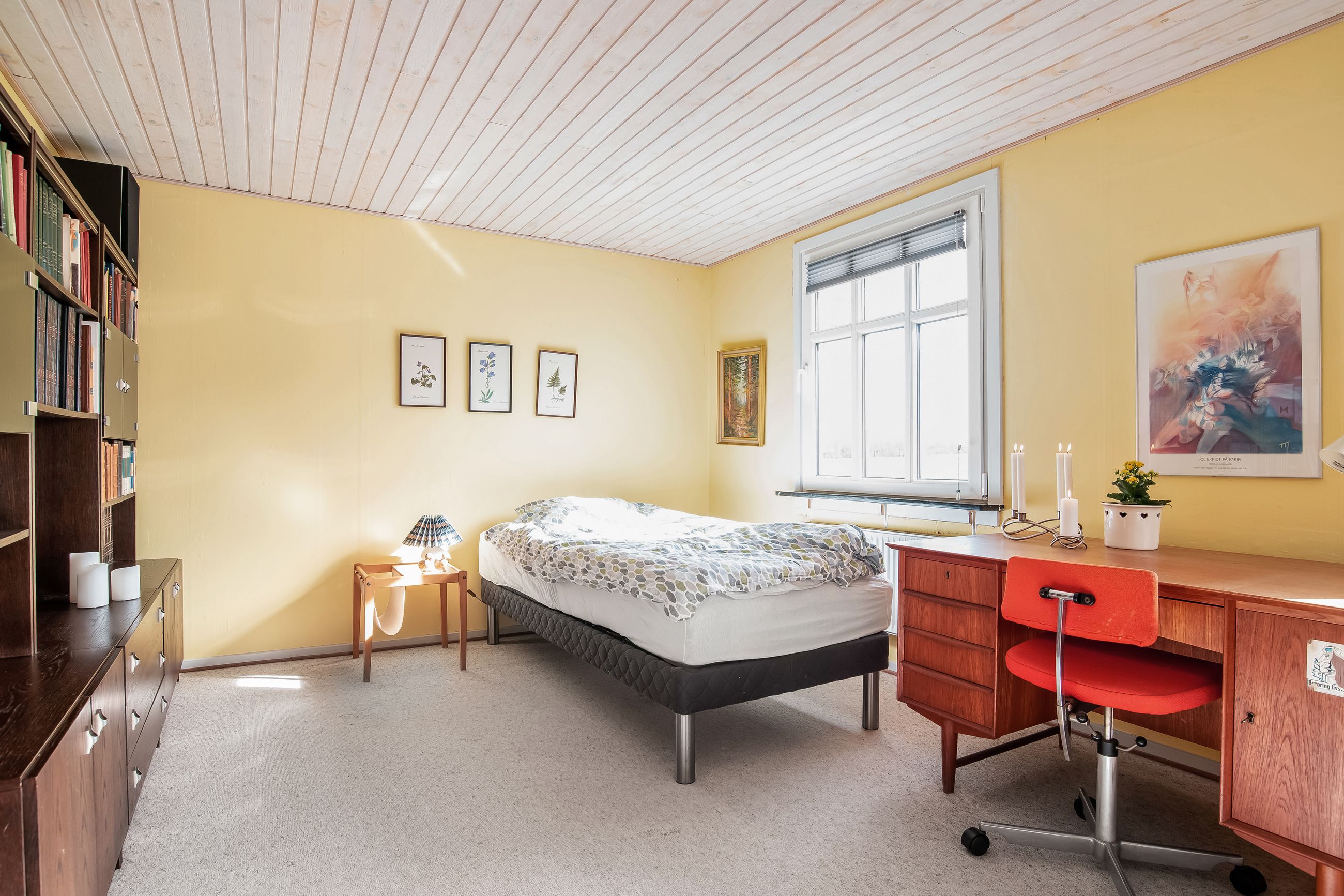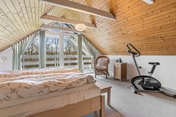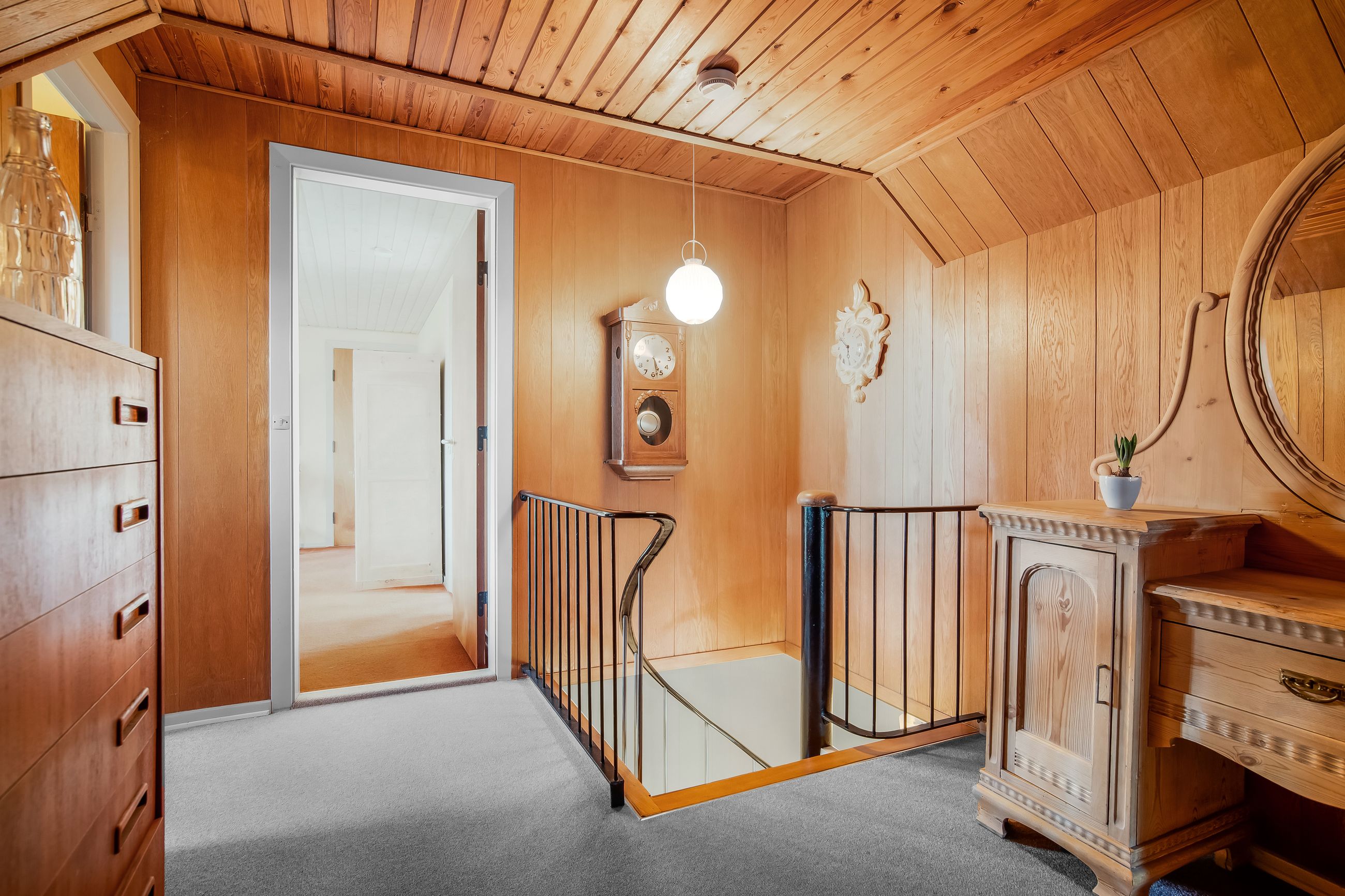 En spindeltrappe til første salen som byder på et repos, toilet, 2 værelser, loftsrum til opbevaring, et soveværelse med