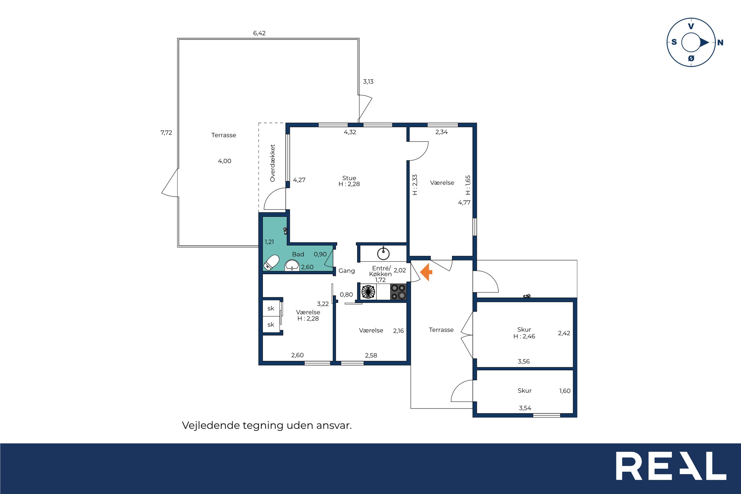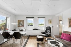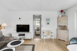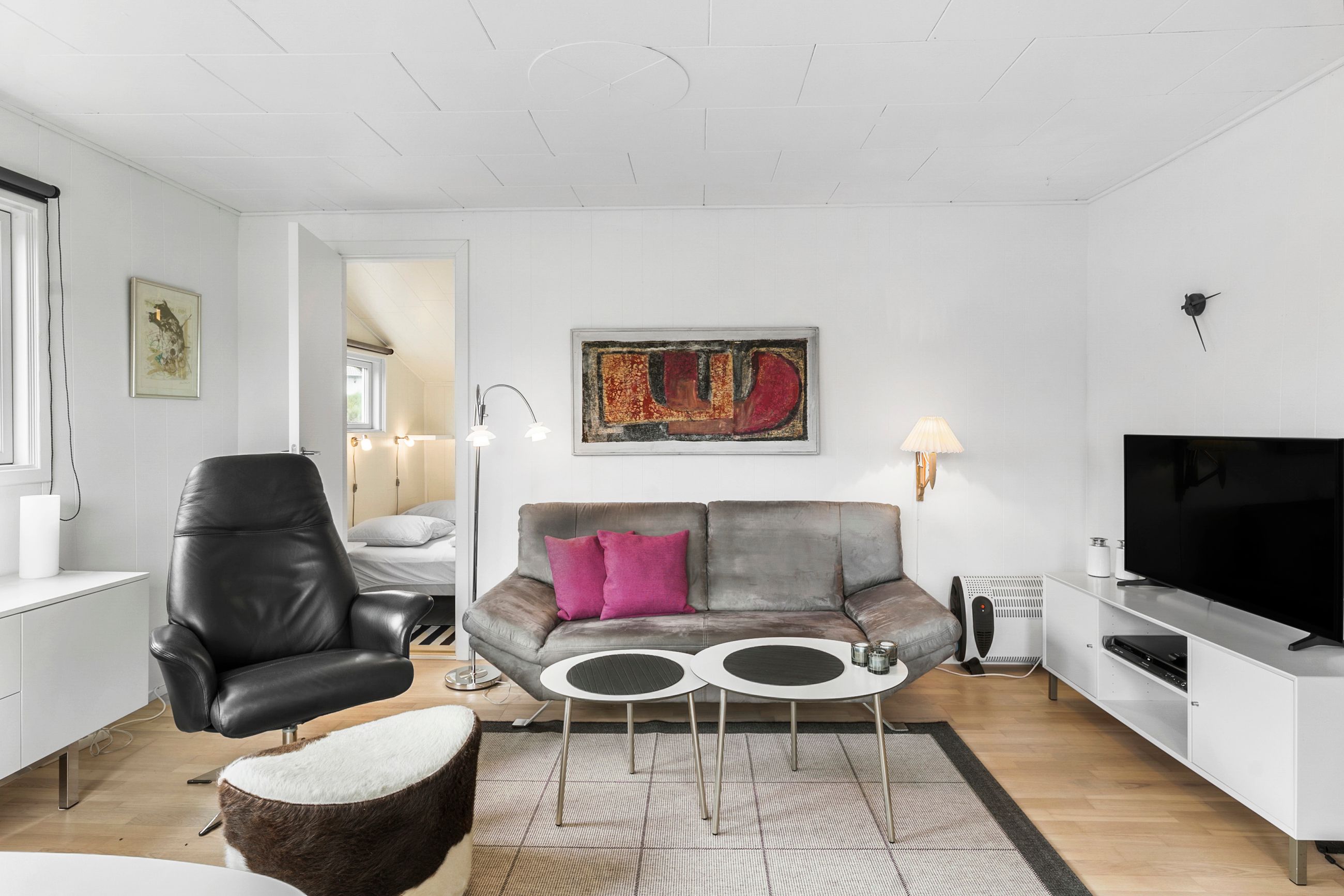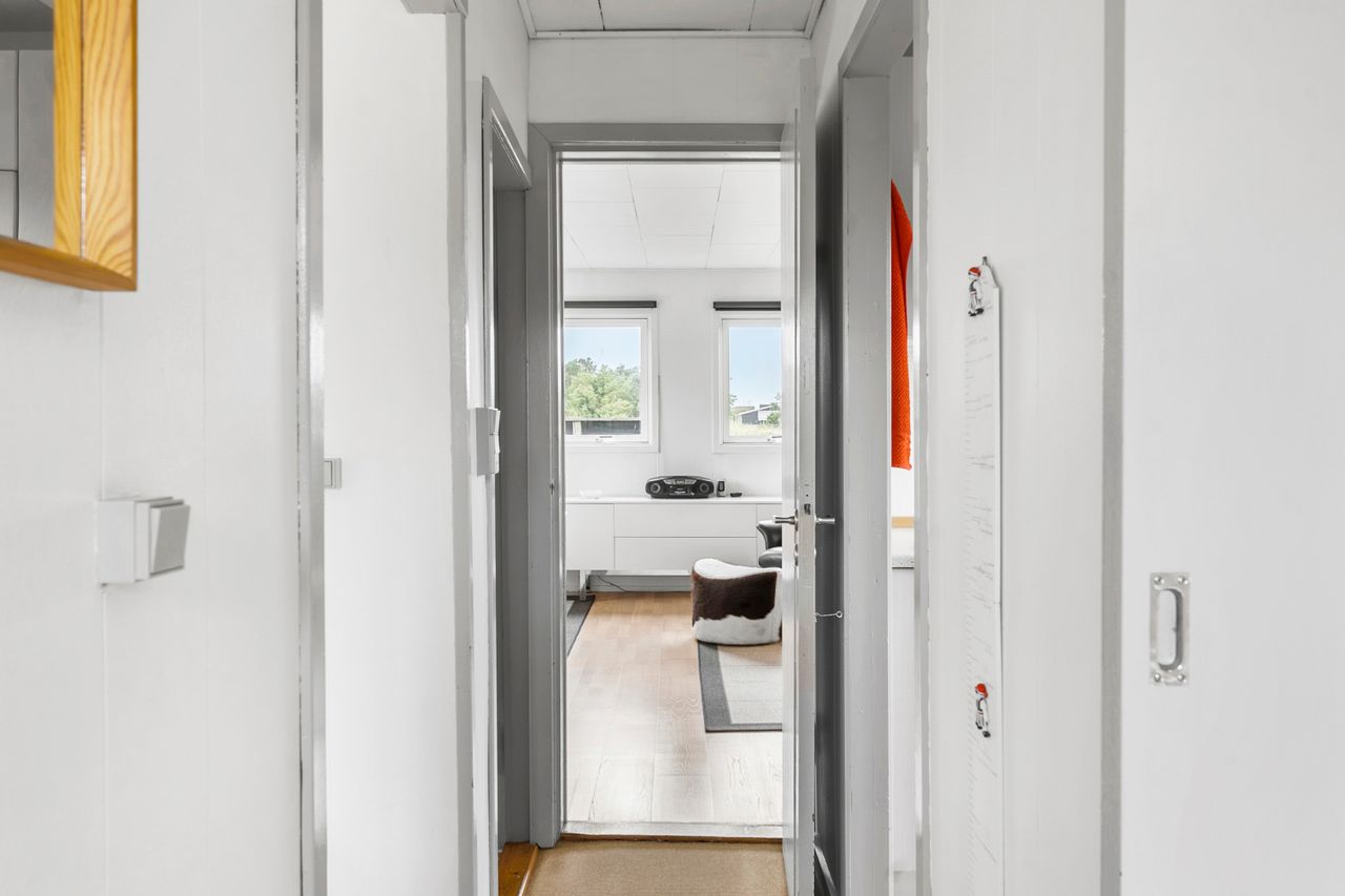 Indenfor mødes du af en velindrettet bolig, der byder på tre rummelige værelser – perfekt til både familie og gæster. Køkkenet er praktisk indrettet og ligger for sig selv, hvilket giver mulighed for at tilberede måltider uden forstyrrelser. Den tilstødende stue er lys og indbydende, og herfra er der direkte adgang til de fantastiske terrassearealer, hvor du kan slappe af og nyde de lange sommeraftener.