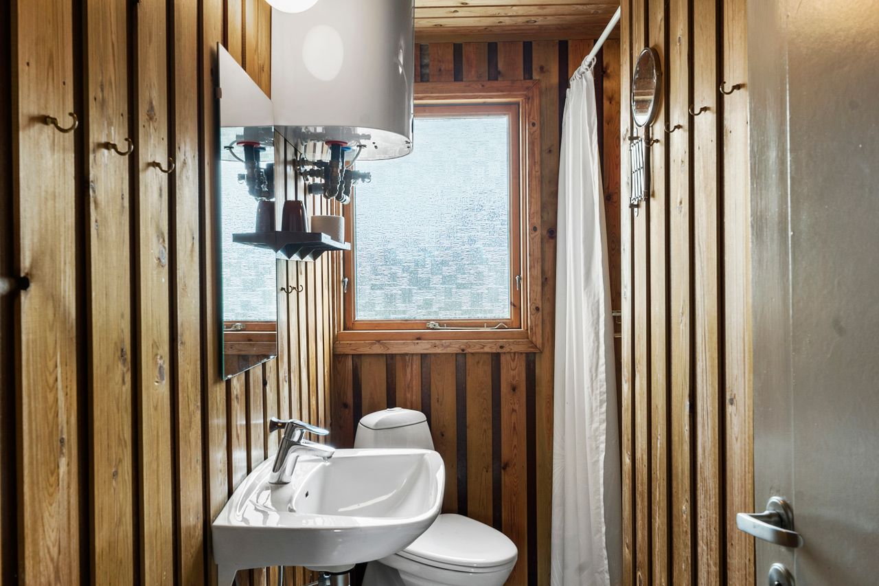 Badeværelset er lille, men yderst velfungerende, og opfylder alle de behov, du måtte have i et sommerhus.