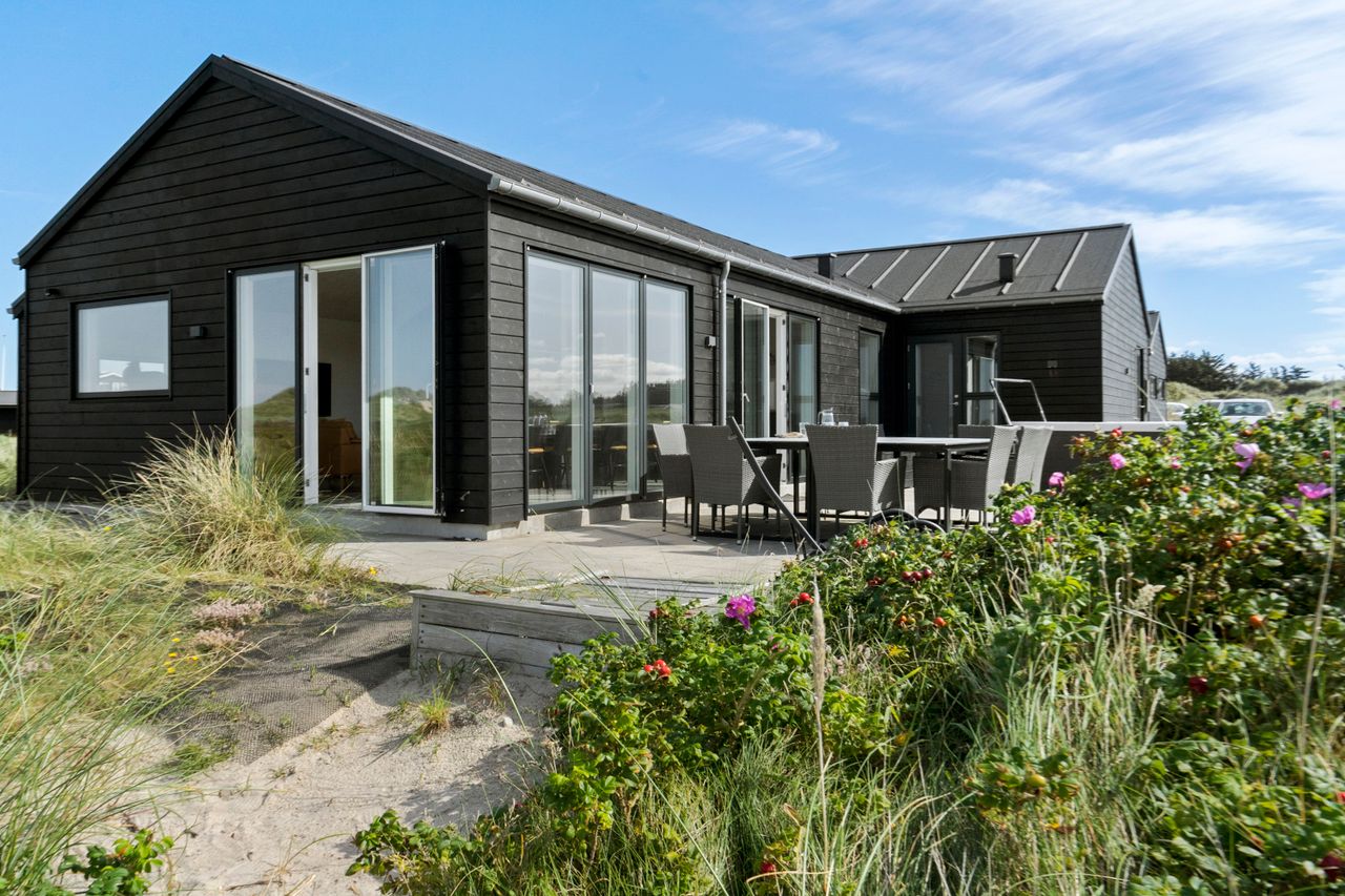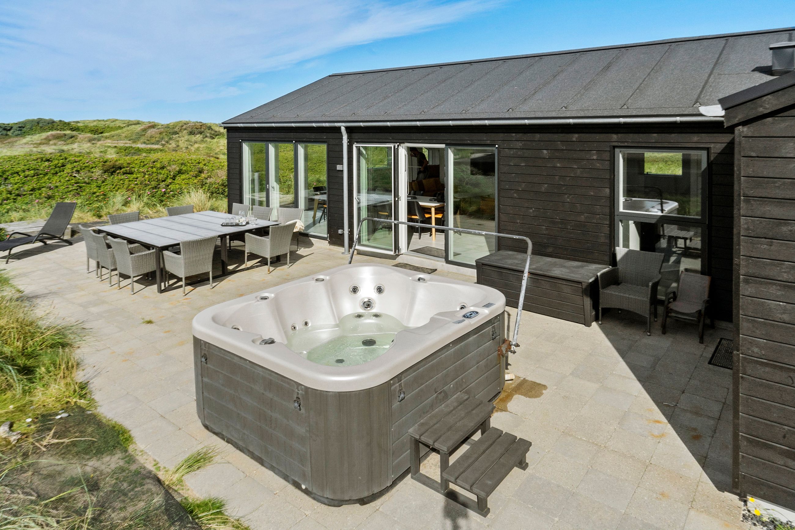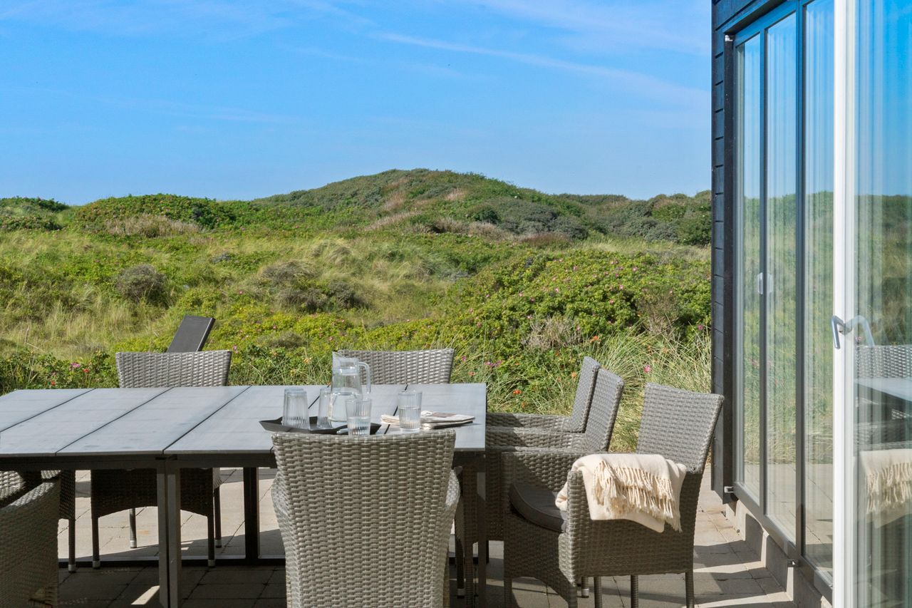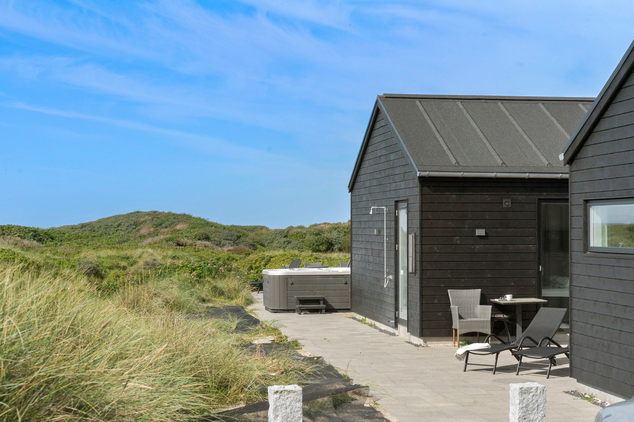 Sommerhuset er indrettet til perfektion med fokus på luksus og kvalitet. Den store, delvist lukkede terrasse er et fantastisk samlingspunkt, hvor I kan nyde solen i de komfortable havemøbler eller tilberede måltider på grillen i de lange sommeraftener. Et udendørs spabad på terrassen giver jer mulighed for at slappe af under åben himmel, omgivet af de naturskønne omgivelser. Der er desuden en praktisk udendørs bruser, så I kan skylle sandet af efter en tur på stranden.
