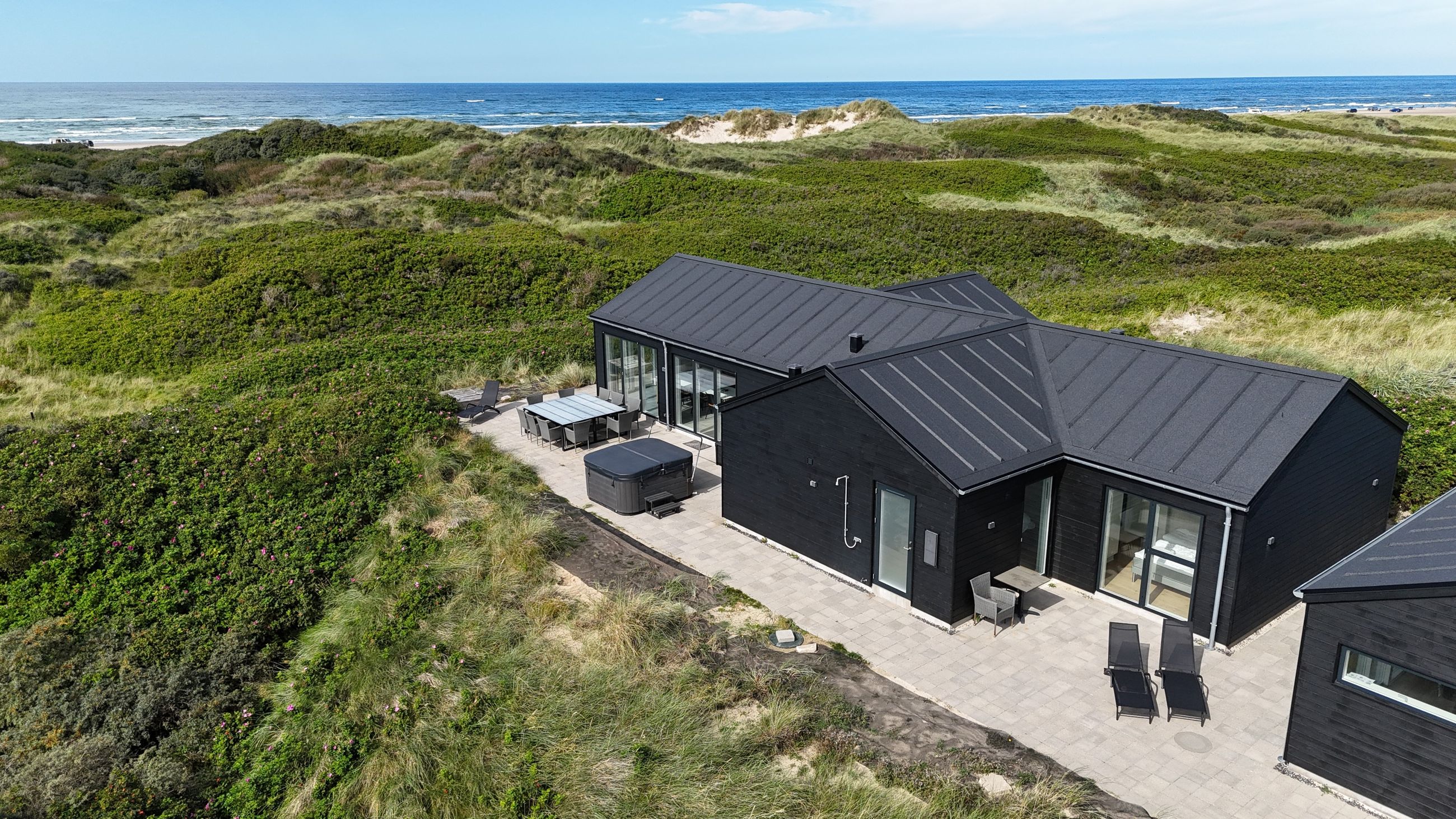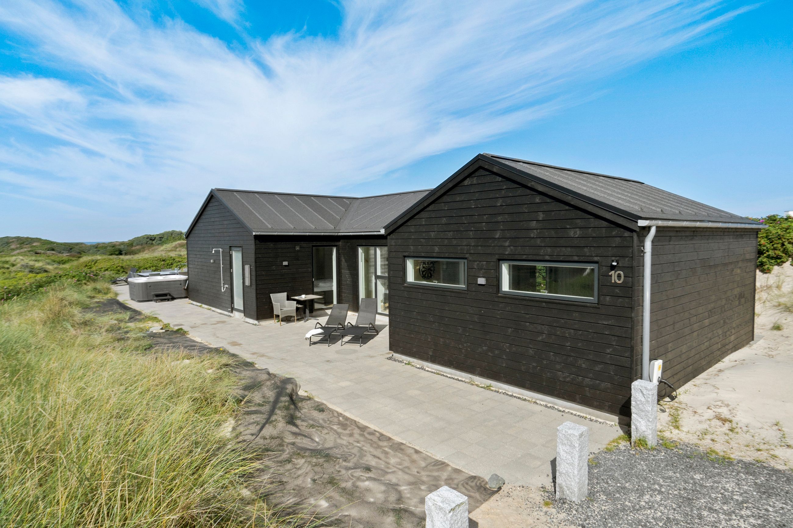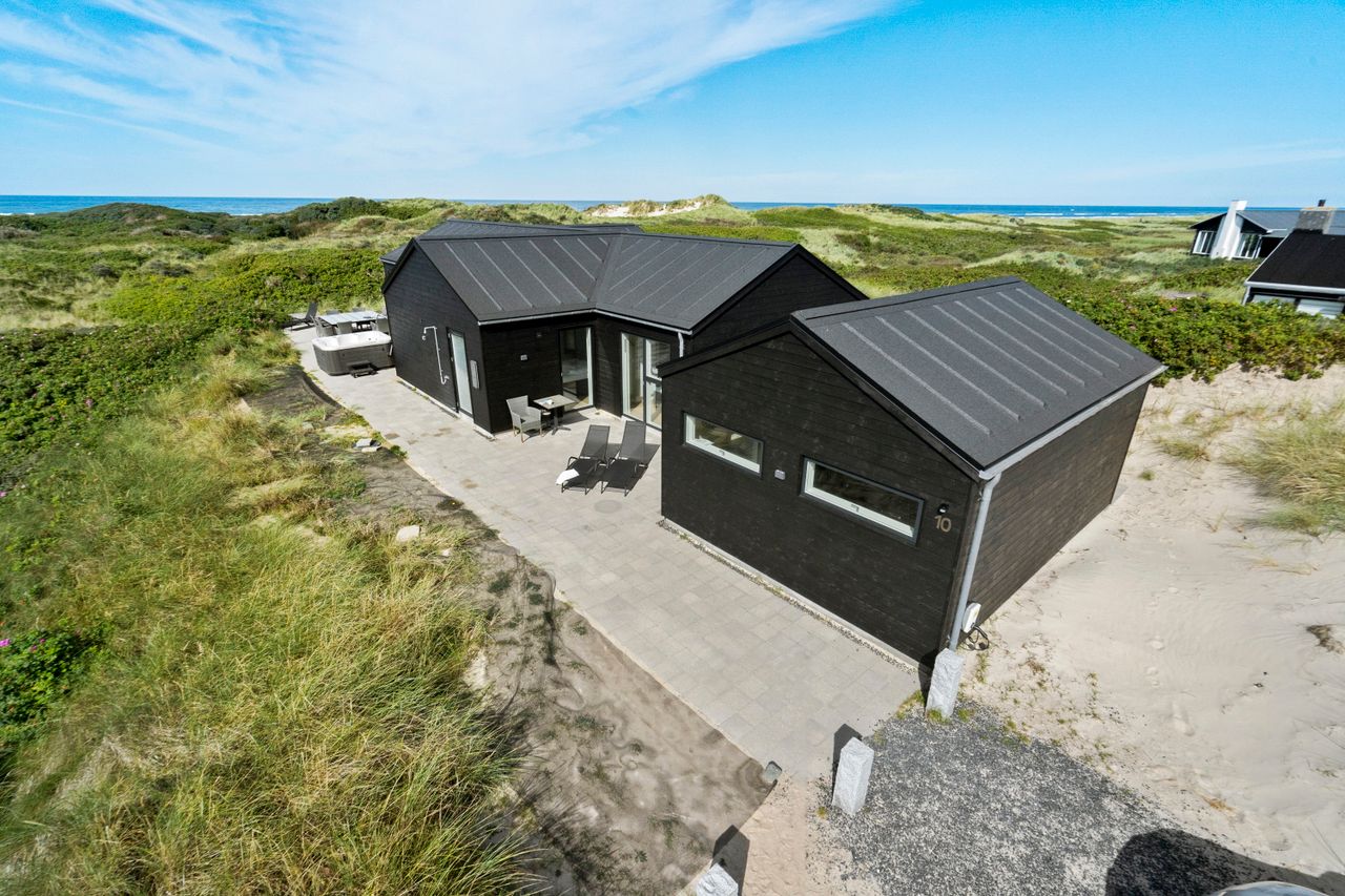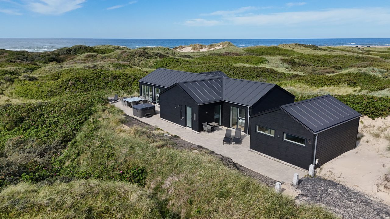 Sommerhuset er indrettet til perfektion med fokus på luksus og kvalitet. Den store, delvist lukkede terrasse er et fantastisk samlingspunkt, hvor I kan nyde solen i de komfortable havemøbler eller tilberede måltider på grillen i de lange sommeraftener. Et udendørs spabad på terrassen giver jer mulighed for at slappe af under åben himmel, omgivet af de naturskønne omgivelser. Der er desuden en praktisk udendørs bruser, så I kan skylle sandet af efter en tur på stranden.