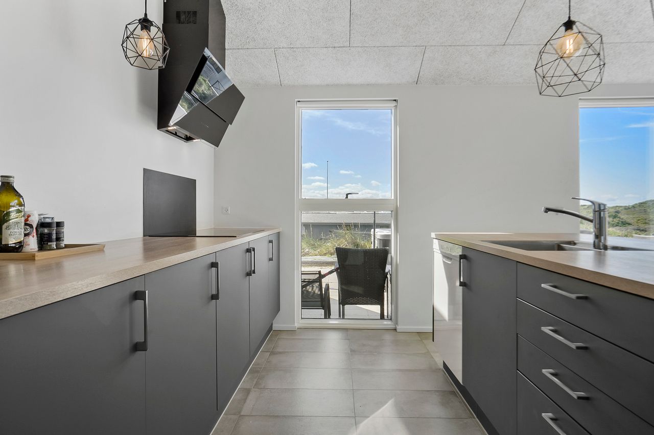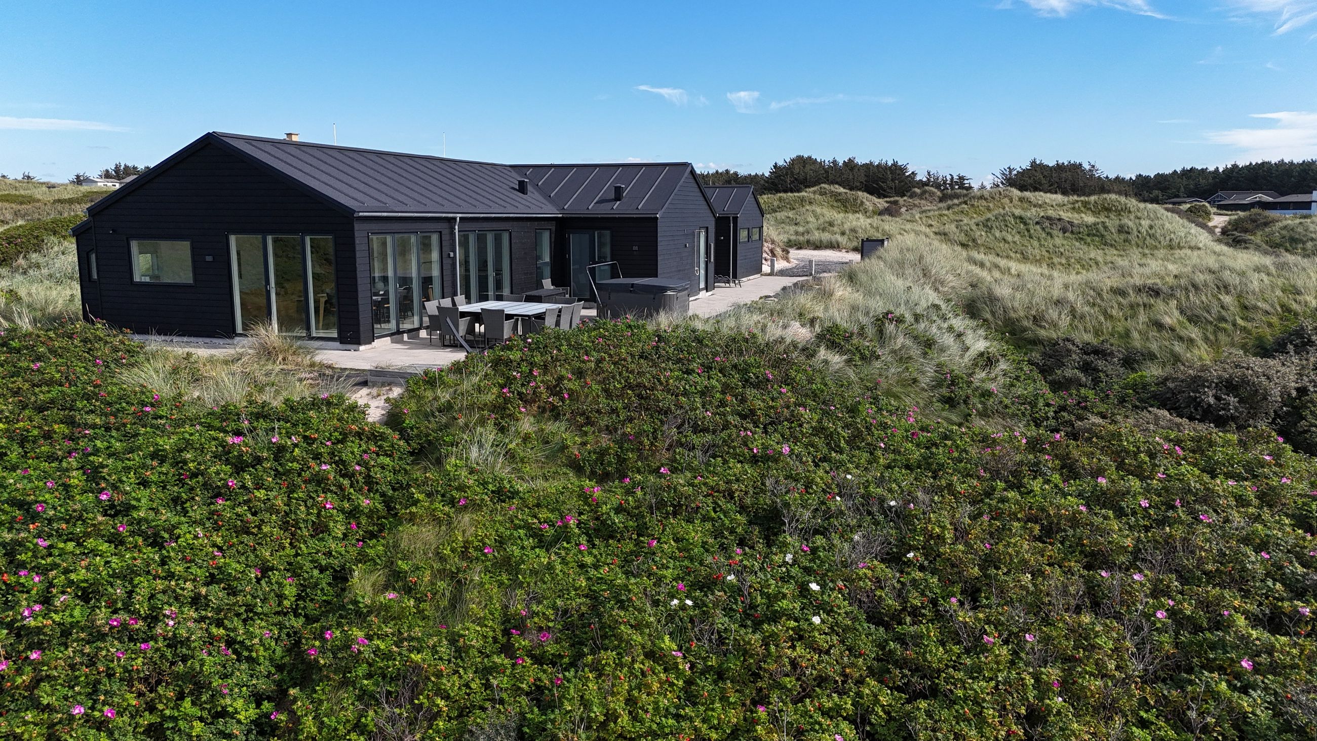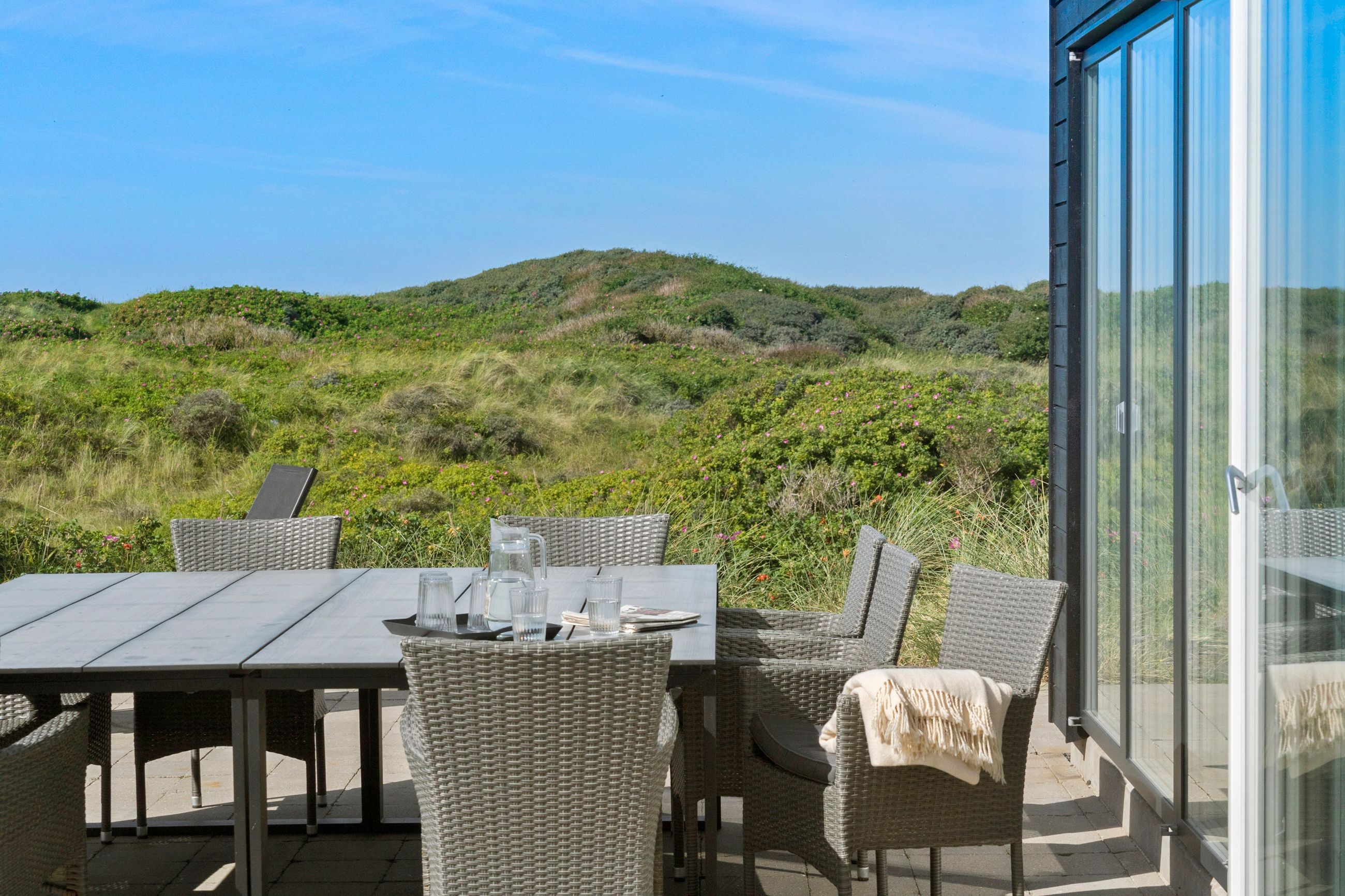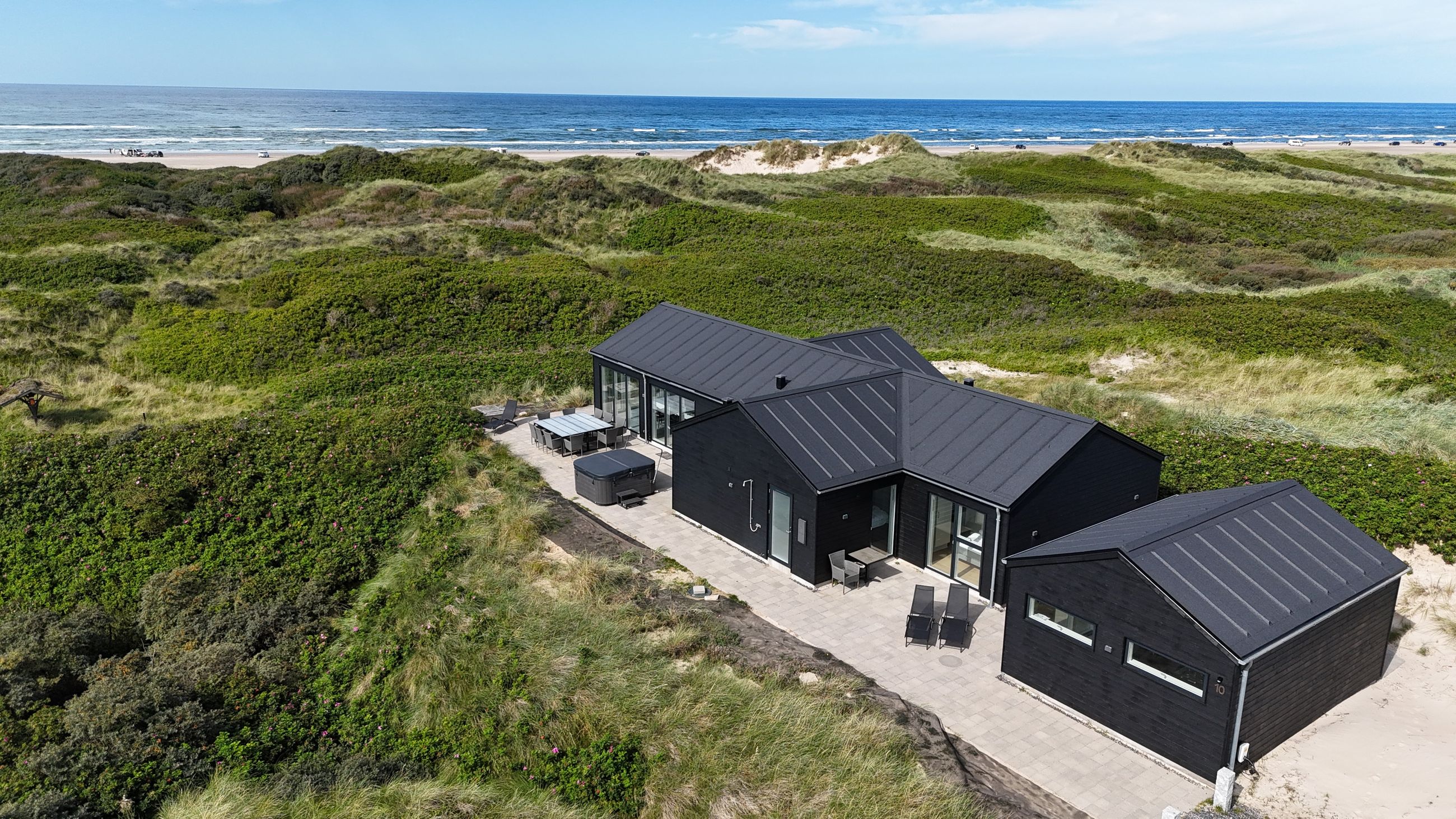 Sommerhuset er indrettet til perfektion med fokus på luksus og kvalitet. Den store, delvist lukkede terrasse er et fantastisk samlingspunkt, hvor I kan nyde solen i de komfortable havemøbler eller tilberede måltider på grillen i de lange sommeraftener. Et udendørs spabad på terrassen giver jer mulighed for at slappe af under åben himmel, omgivet af de naturskønne omgivelser. Der er desuden en praktisk udendørs bruser, så I kan skylle sandet af efter en tur på stranden.