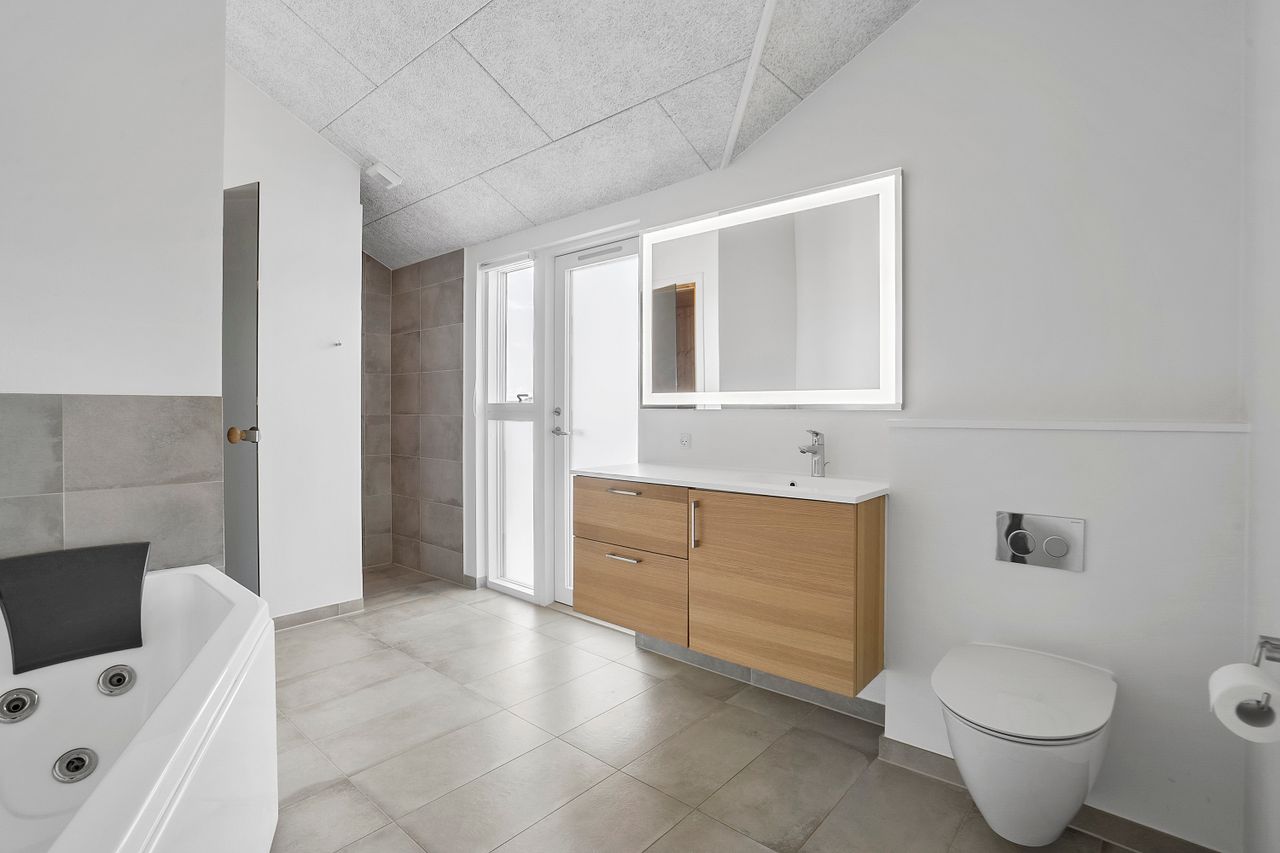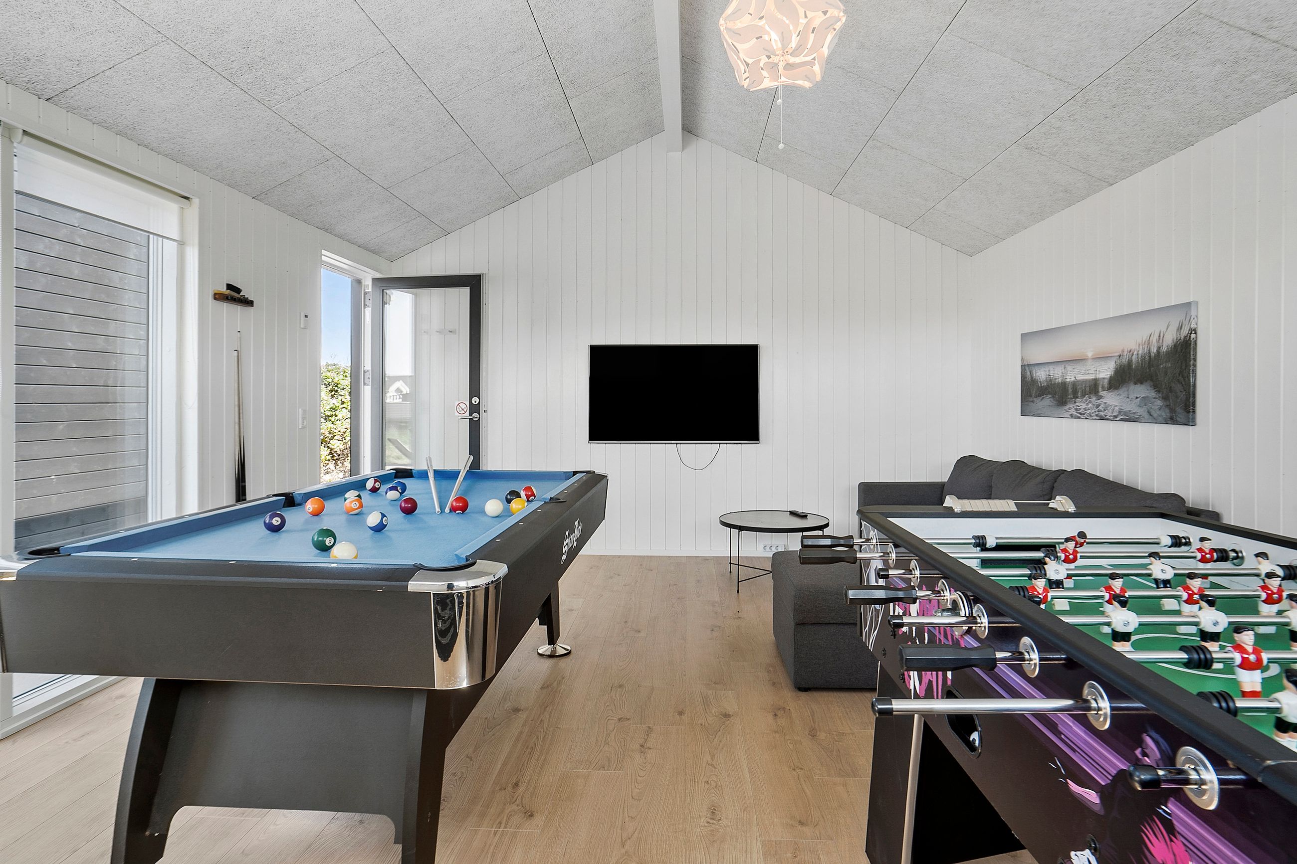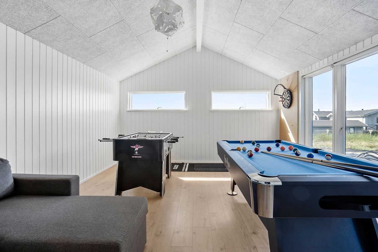 Et særligt højdepunkt er det 30 m2 store aktivitetsrum, der giver rig mulighed for underholdning med poolbord og dart. Her kan familien samles til sjove og hyggelige stunder i komfortable omgivelser med gulvvarme.