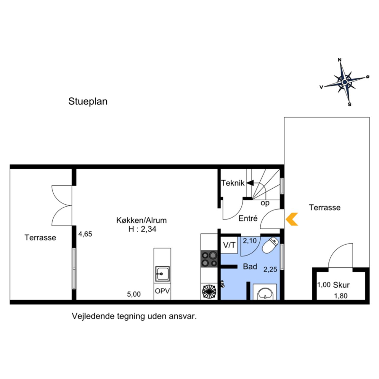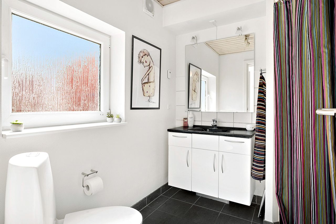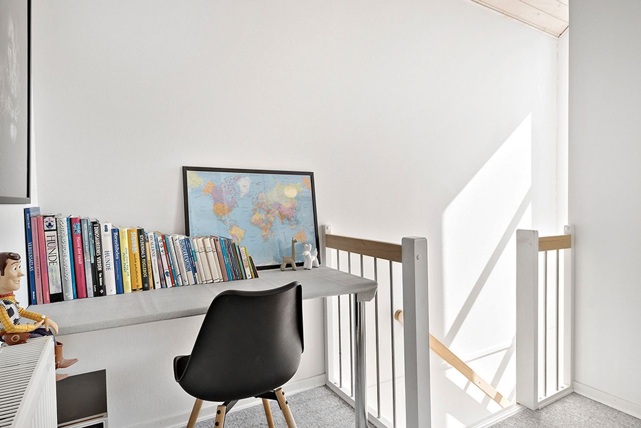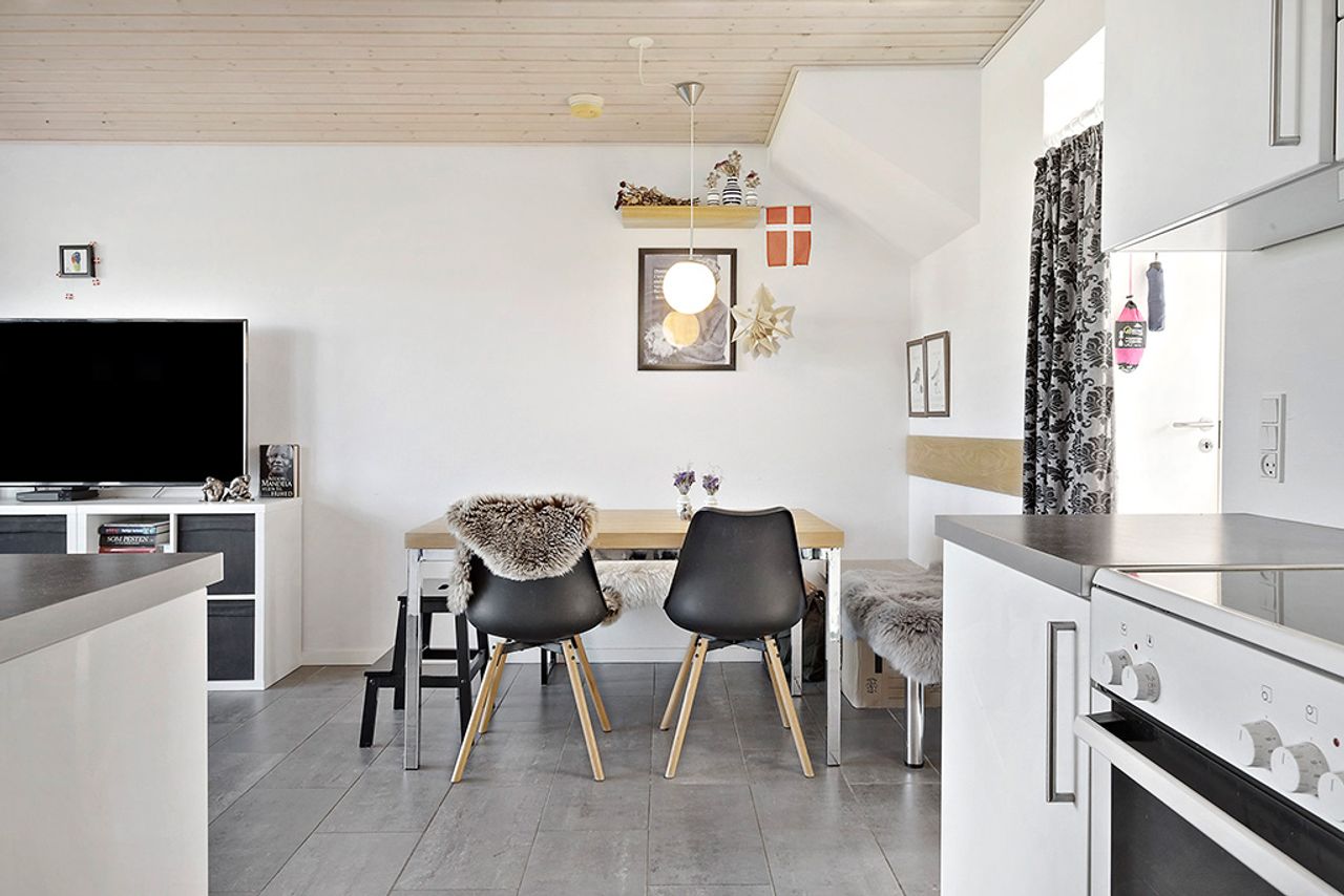 Boligen byder på parkering lige foran huset. Når du træder indenfor, mødes du af en indbydende entré med adgang til både førstesal, badeværelse og køkken-alrum. Badeværelset er rummeligt med separat bruseniche og har praktisk skabsplads med både vaskemaskine og tørretumbler. Det åbne køkken-alrum skaber en hyggelig atmosfære og fra stuen er der direkte udgang til en dejlig, aflukket terrasse samt en lille græsplæne.