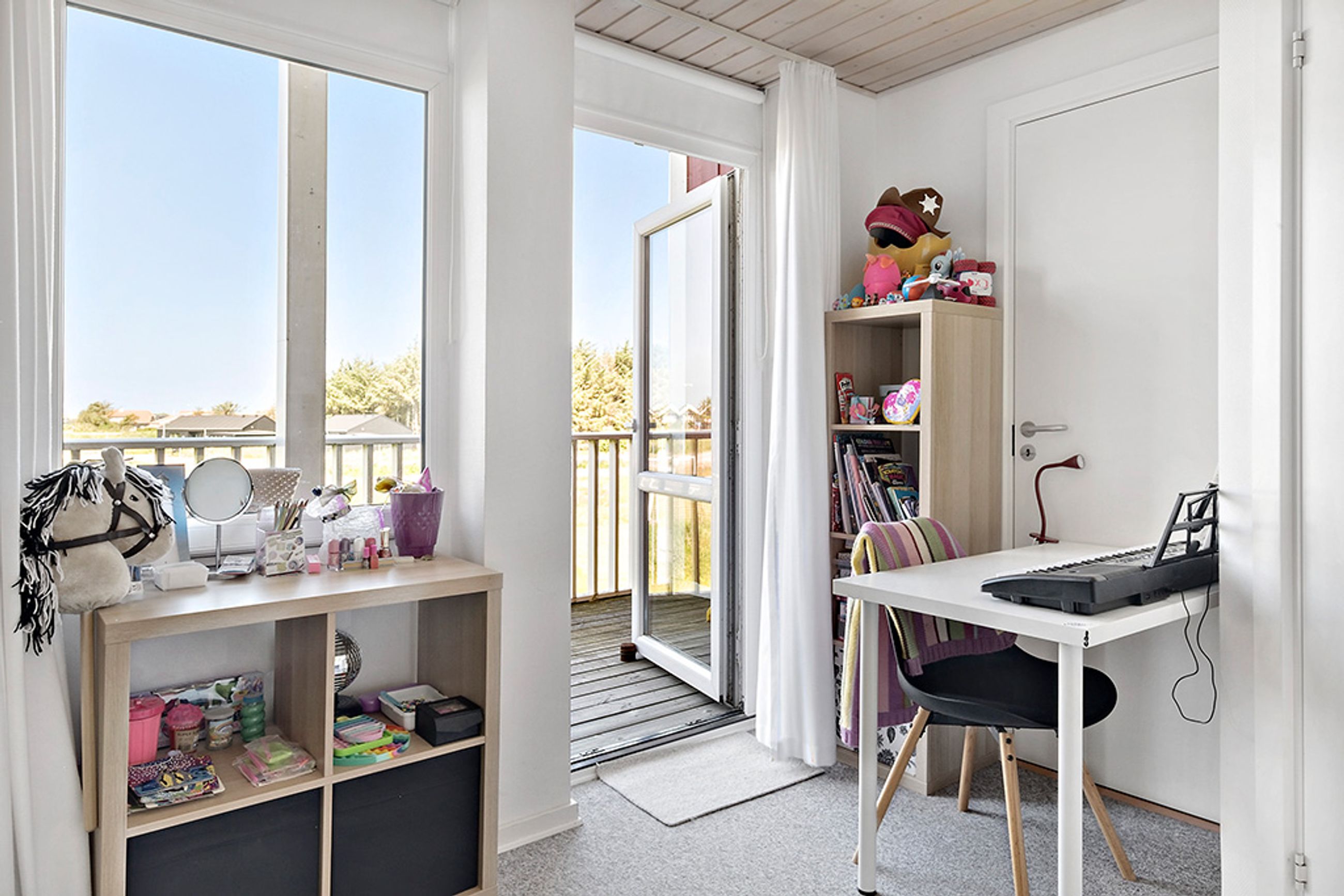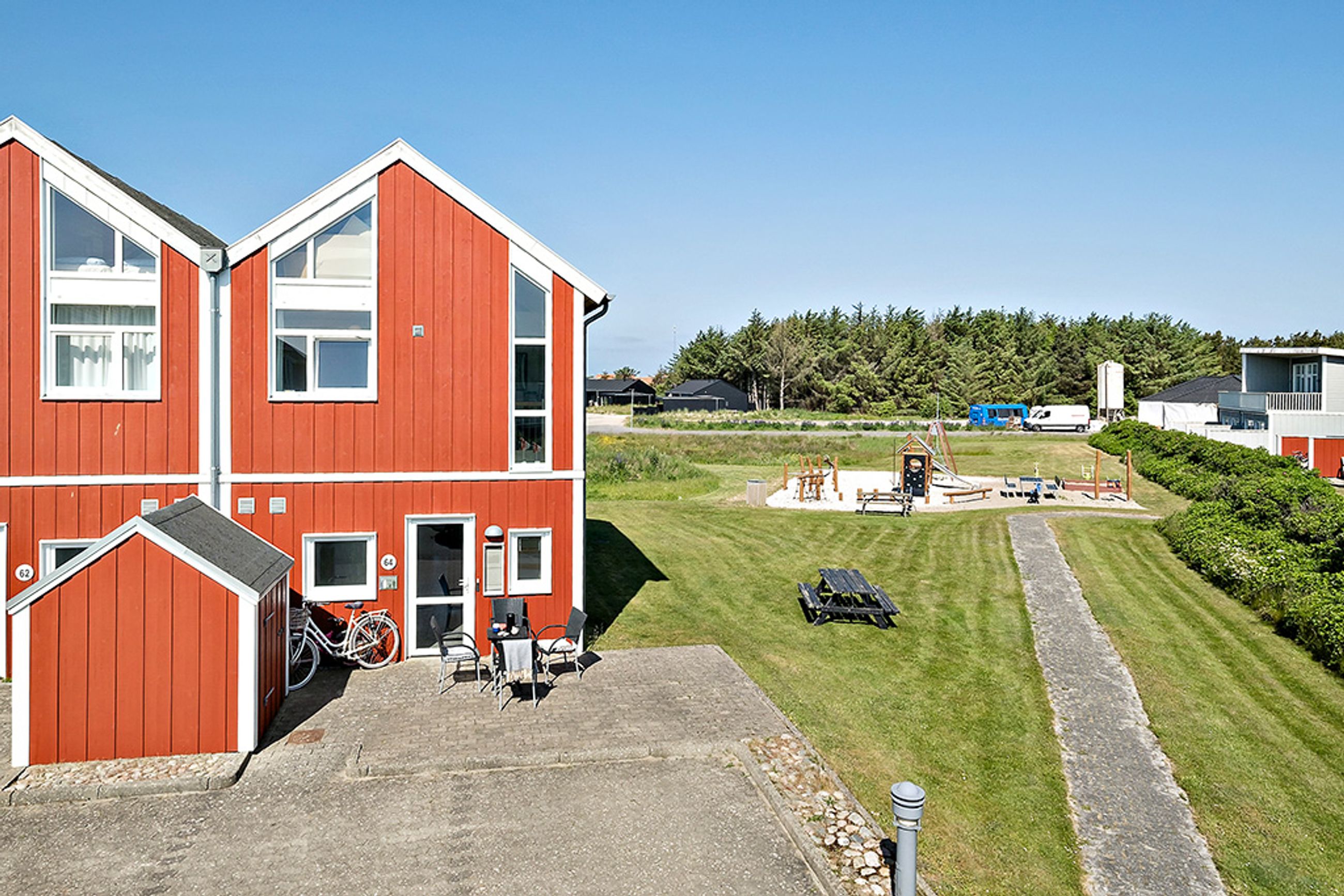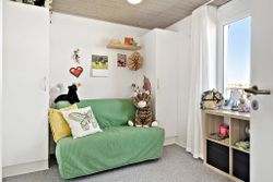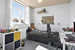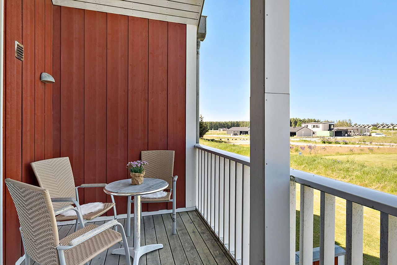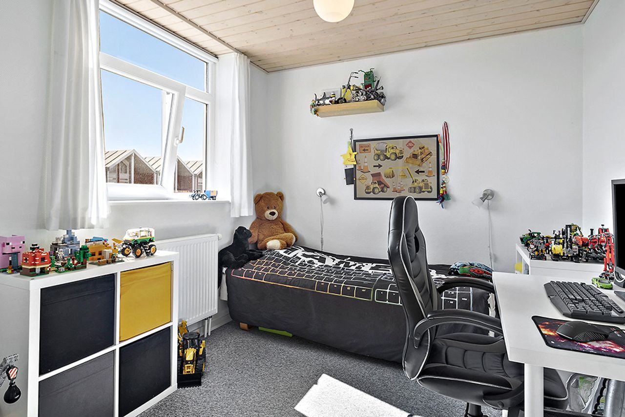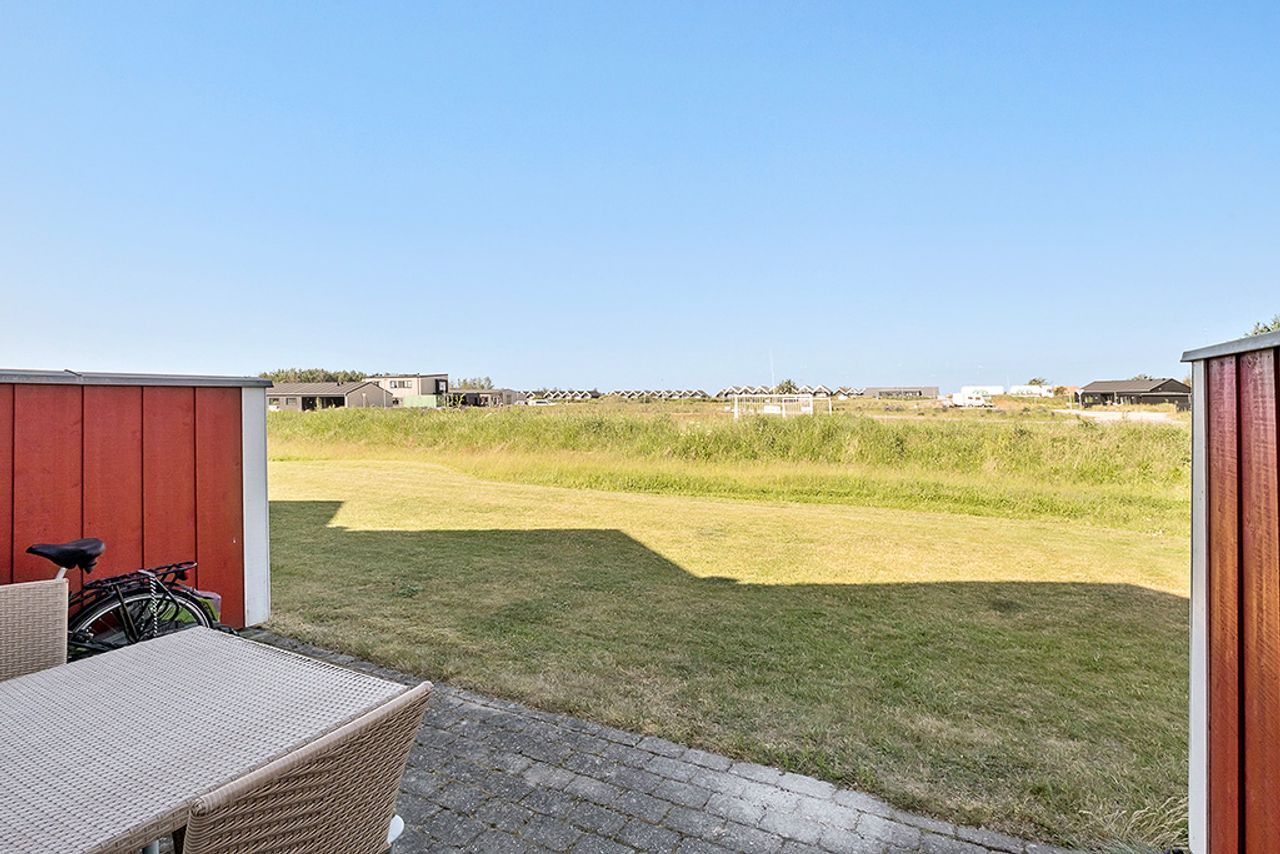 På førstesalen finder du to gode værelser og en stor hems. Det ene værelse har udsigt til golfbanen, mens det andet værelse har udgang til en skøn, overdækket terrasse. Udendørs er der også et praktisk skur.