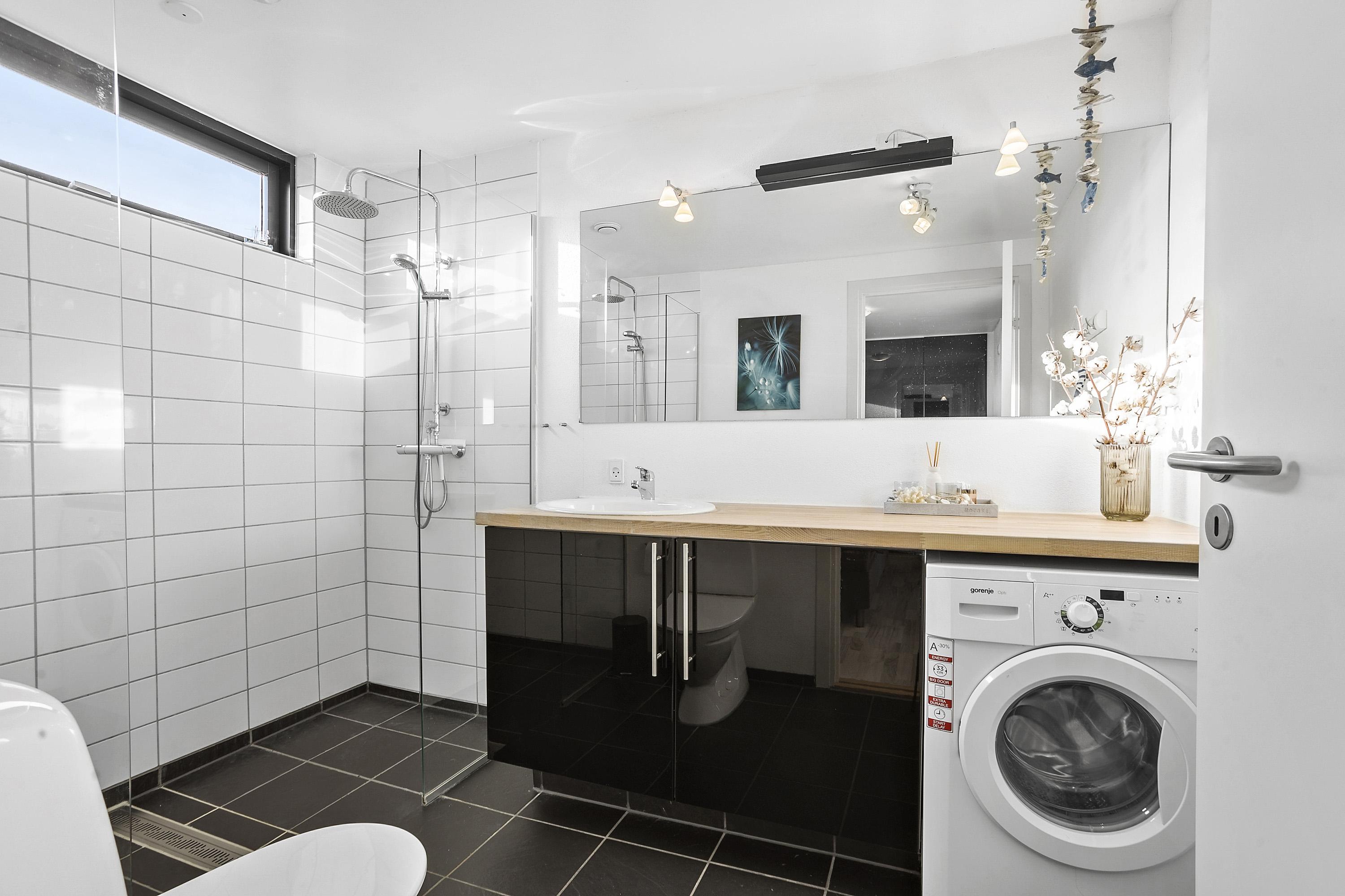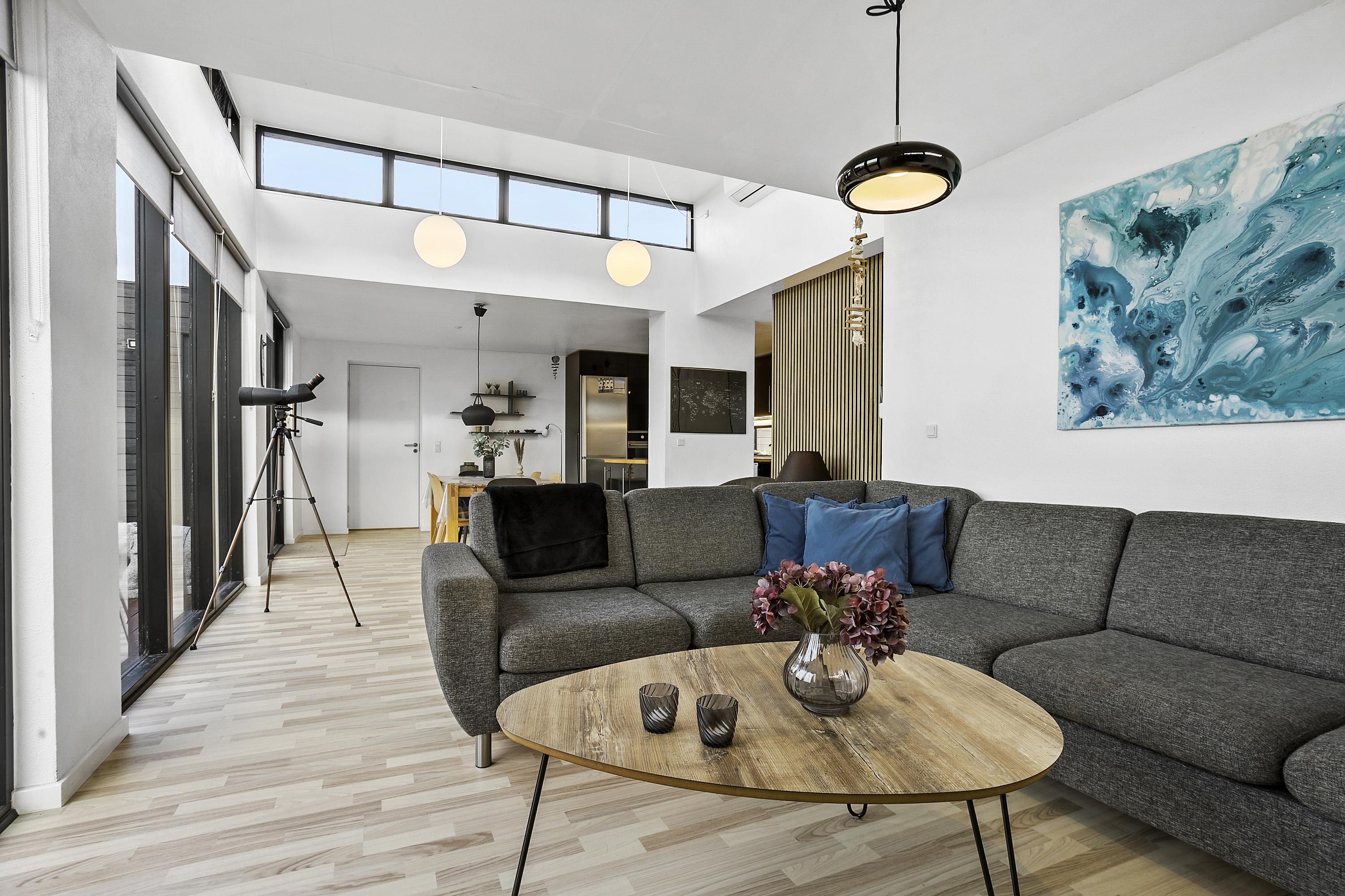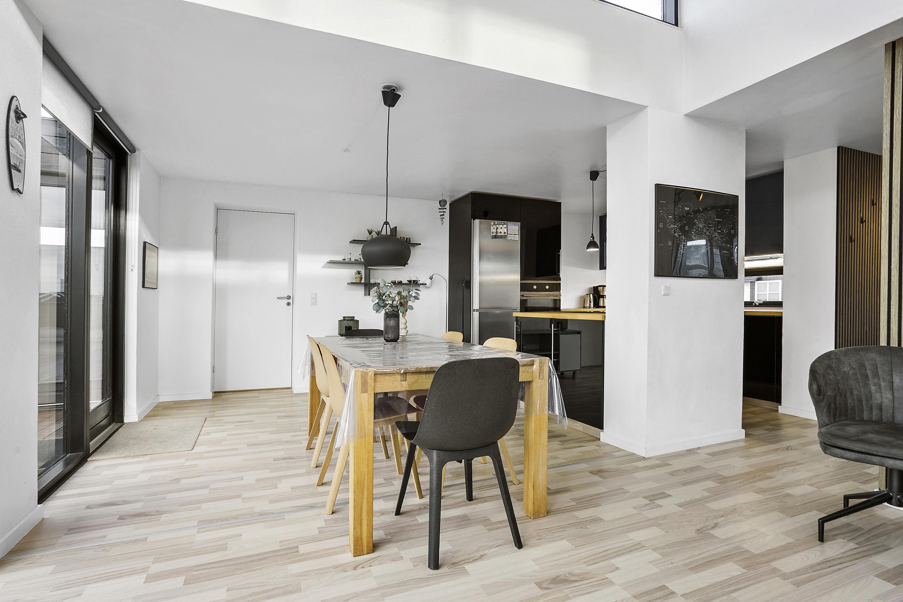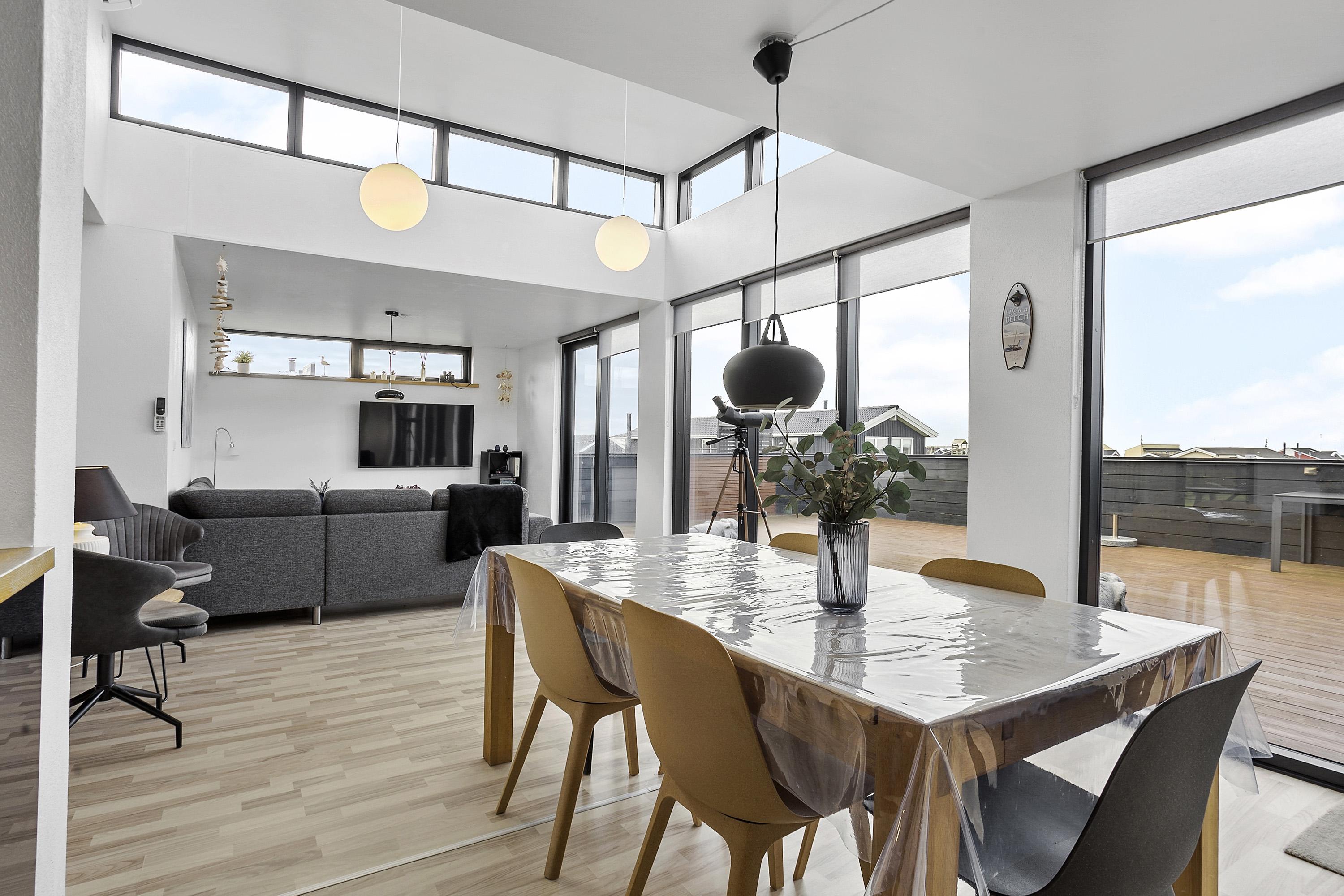 Huset imponerer med sin stilrene og moderne indretning, hvor lys og rummelighed er i fokus. Her finder du et stort og indbydende køkken-alrum med direkte