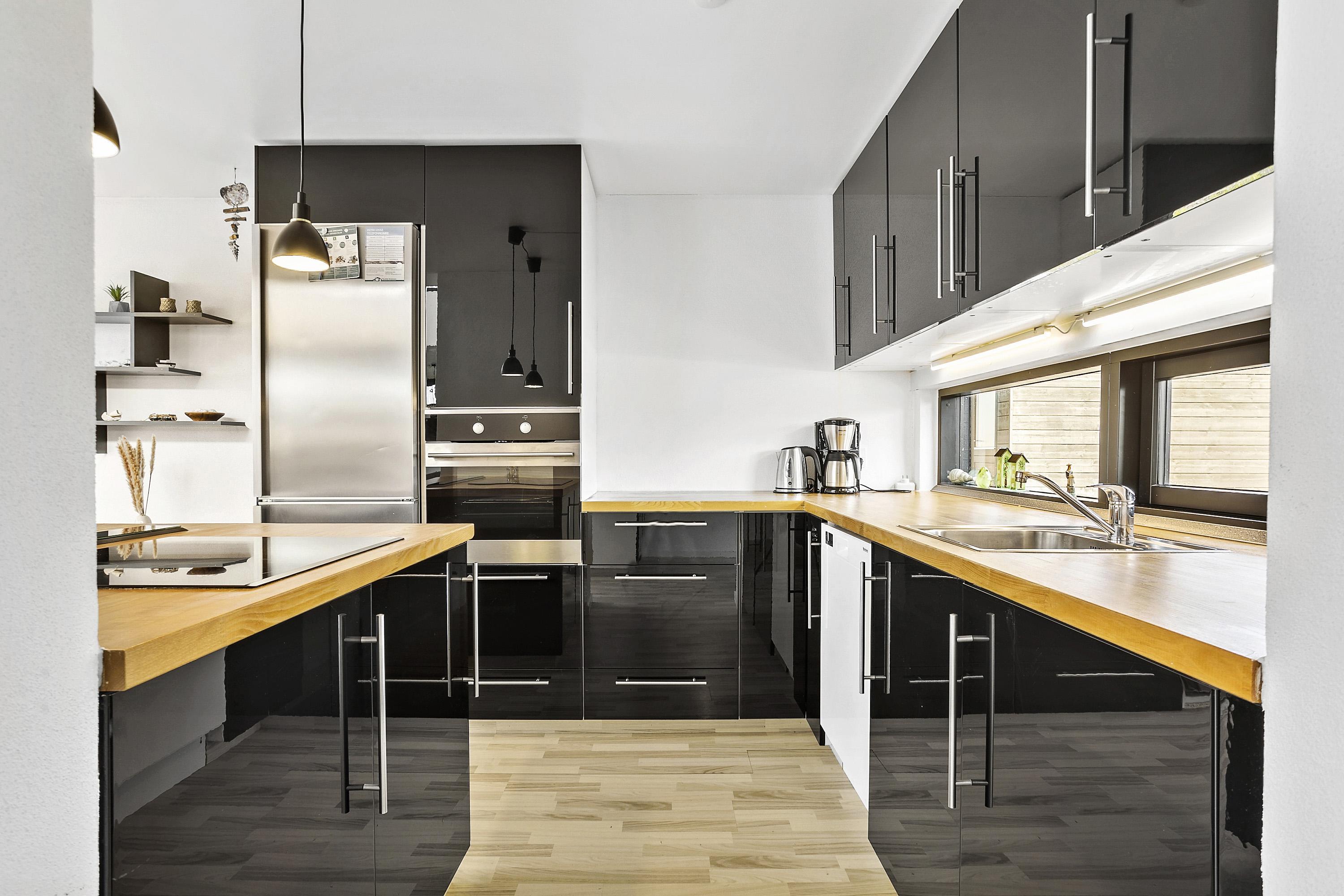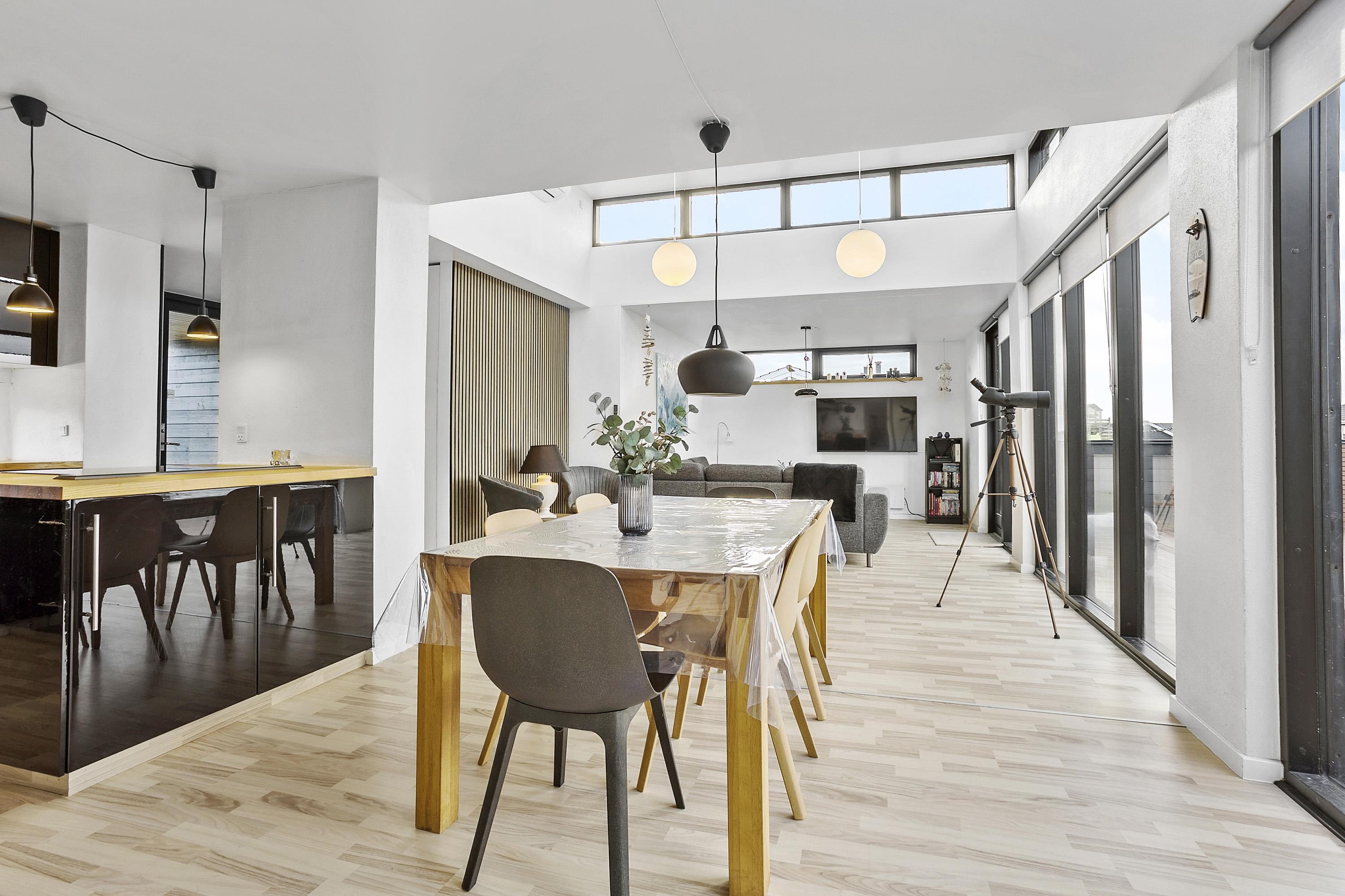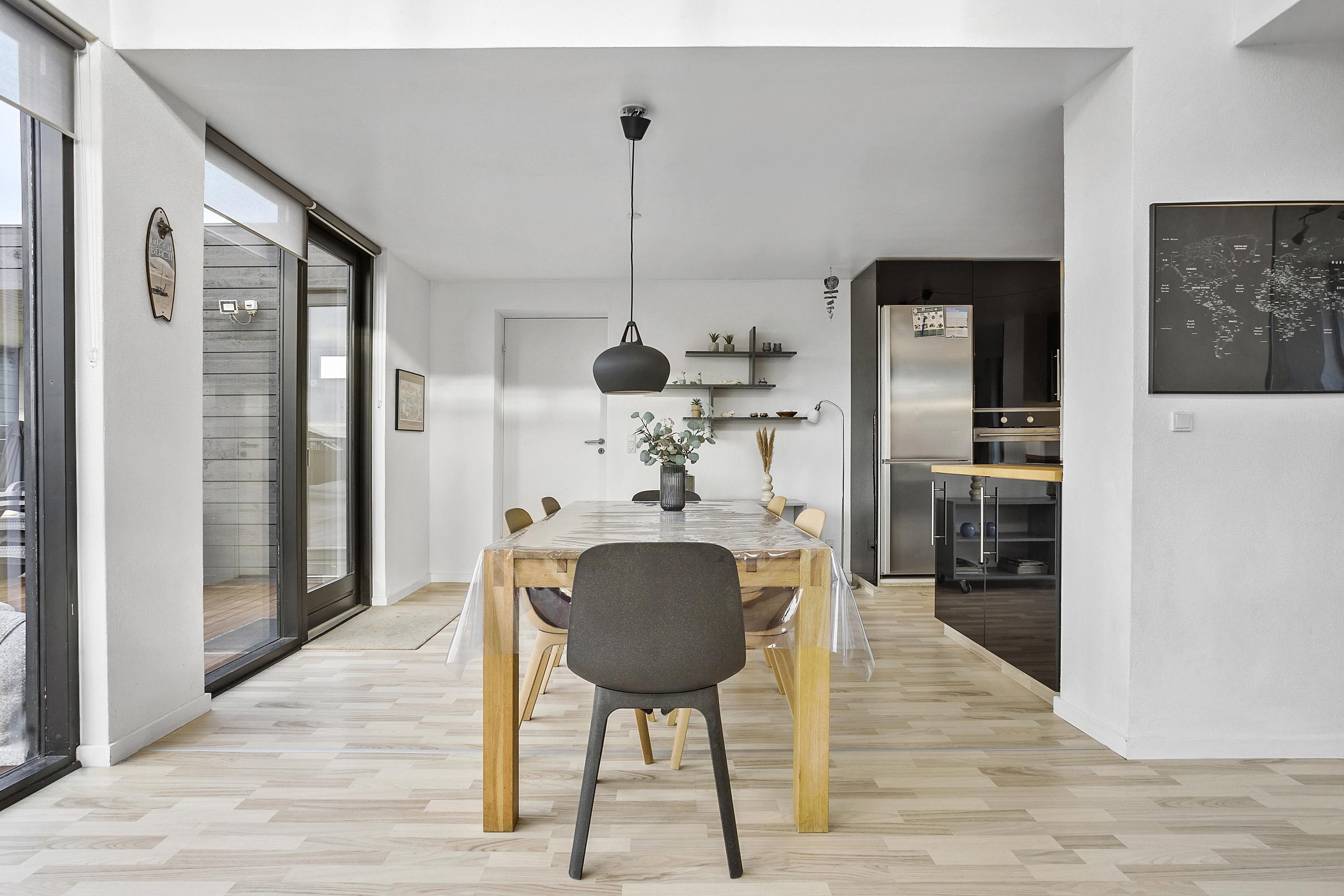Huset imponerer med sin stilrene og moderne indretning, hvor lys og rummelighed er i fokus. Her finder du et stort og indbydende køkken-alrum med direkte