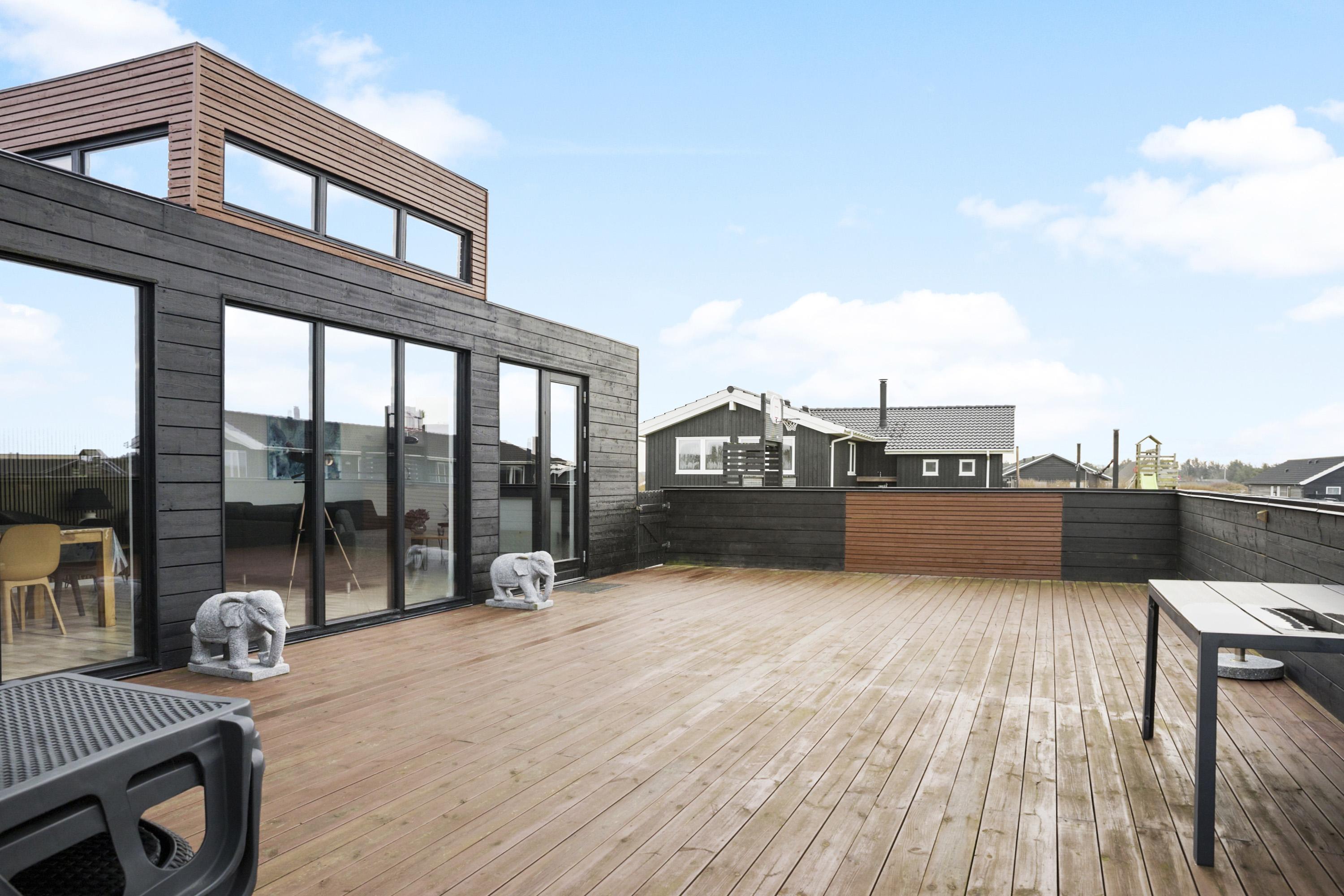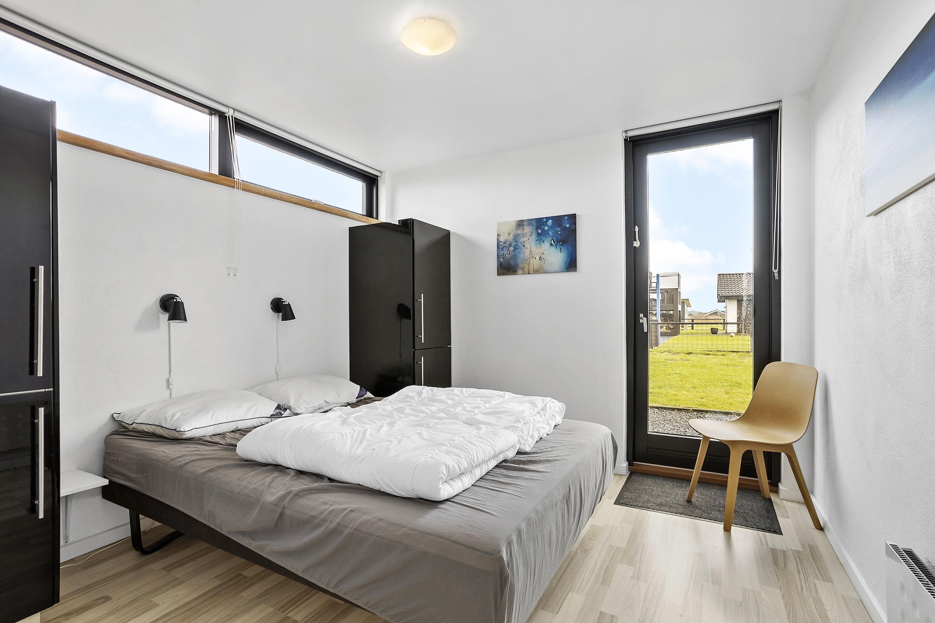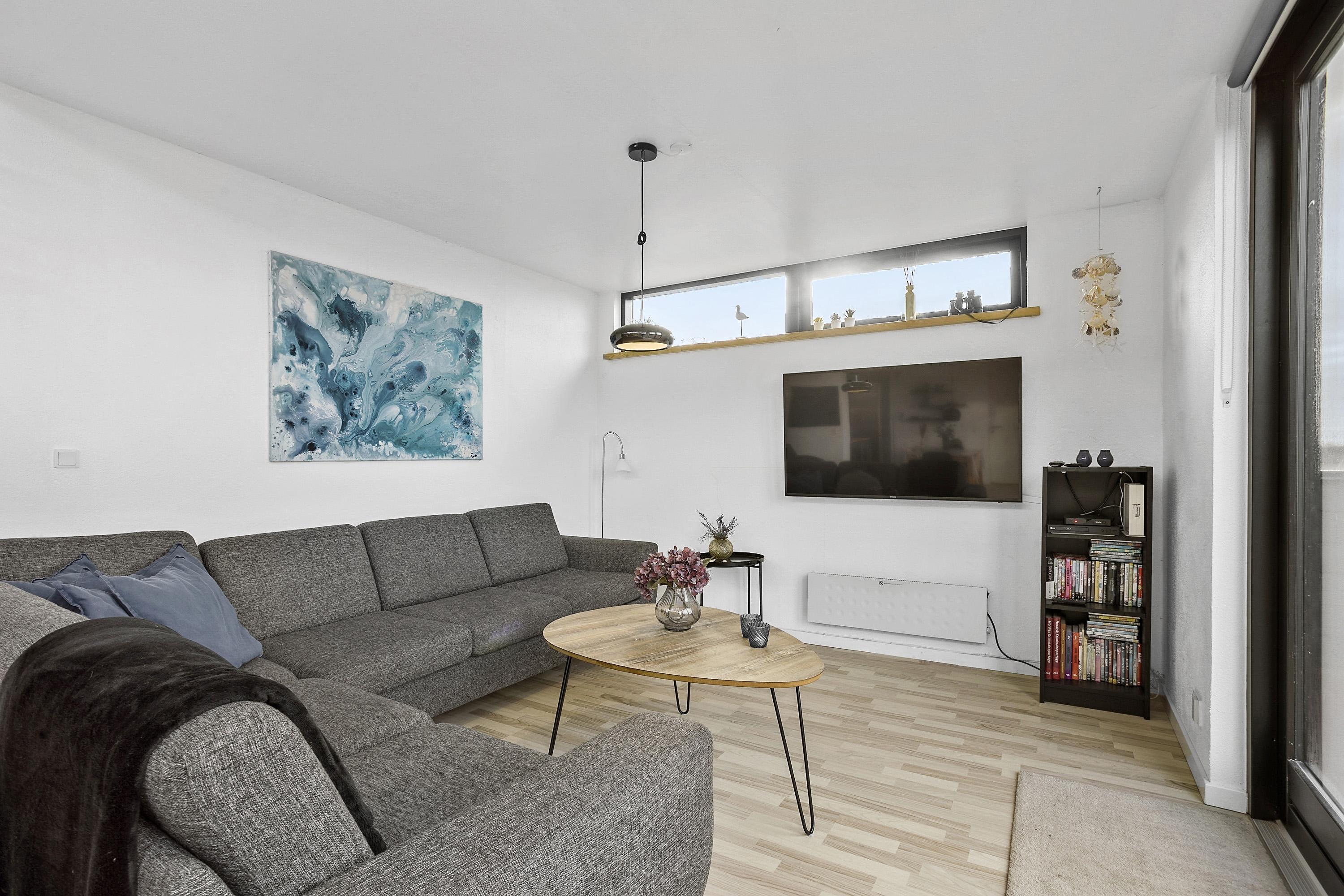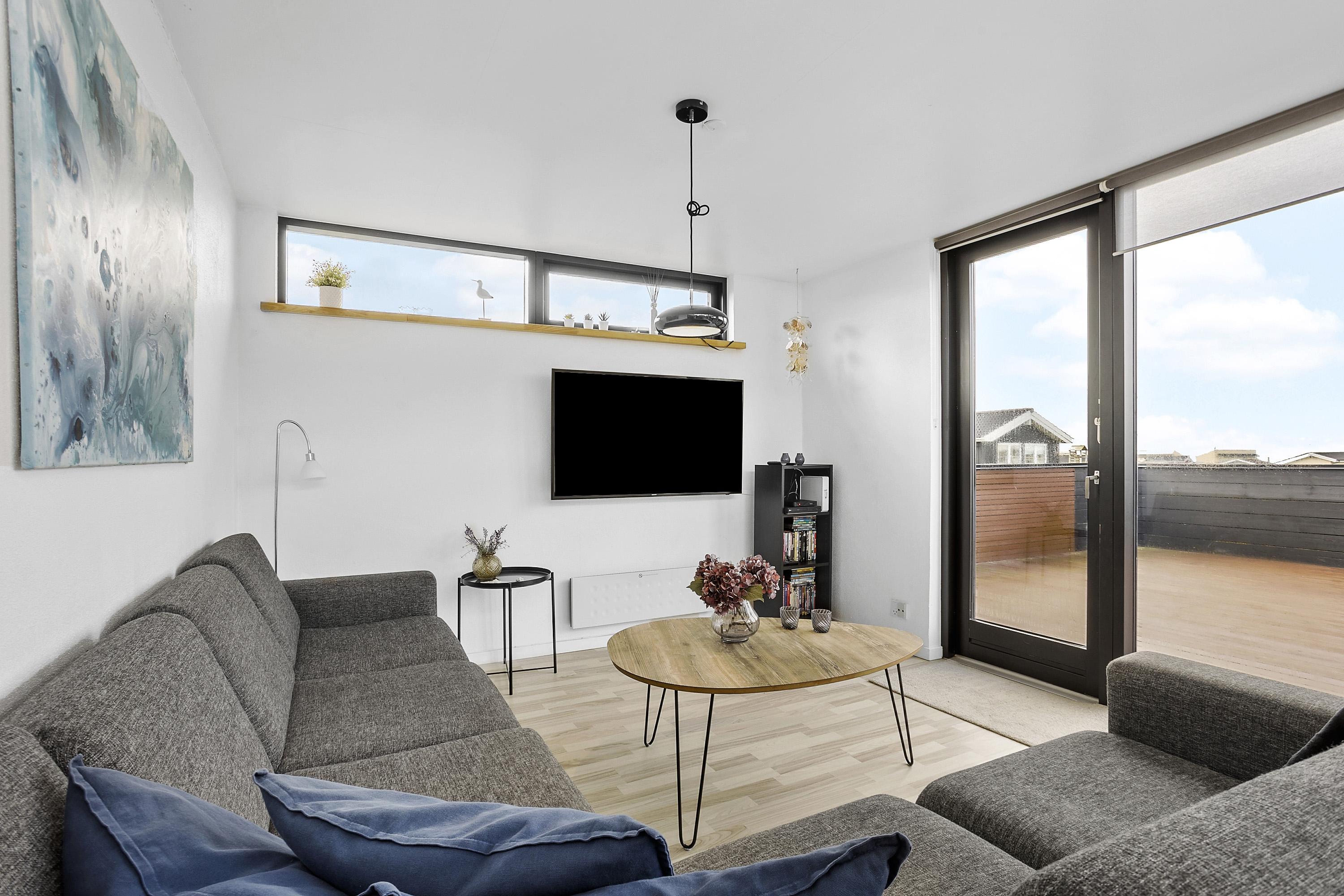 Huset imponerer med sin stilrene og moderne indretning, hvor lys og rummelighed er i fokus. Her finder du et stort og indbydende køkken-alrum med direkte